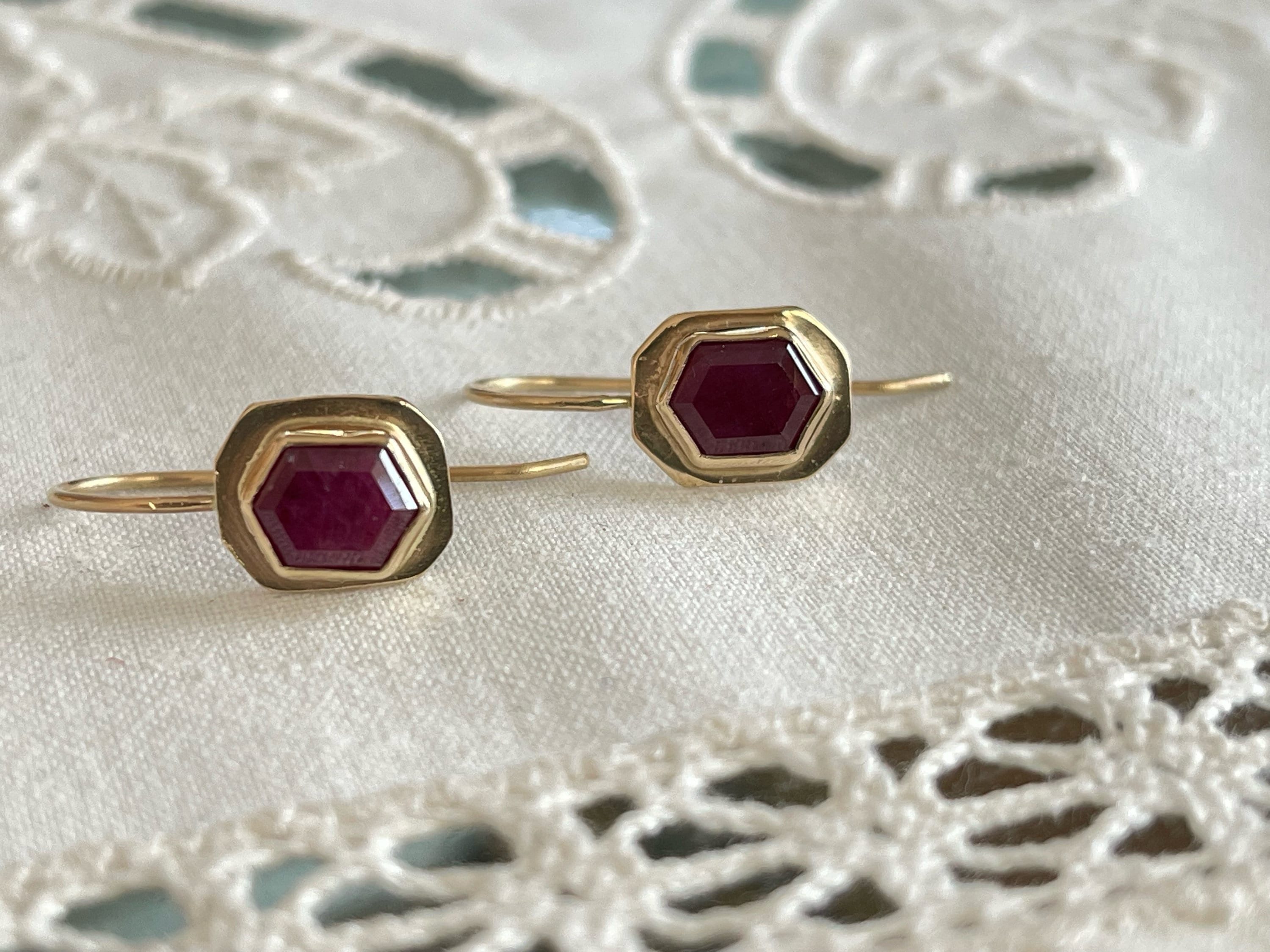 Luscious Liberian hexagon facted rubies are bezel mounted in 14k yellow gold (recycled) and sit on ear wires, reminiscent of Victorian era jewels. The stones were cut by Columbia Gem House and are designated as fair trade. The ear wires are about 19.3mm from the top of the wire to the bottom of the setting. The stones are hexagons and their mountings somewhat mirror their shape, in a more cushion form. I created these earrings completely by hand so there is some irregularity to their shape. The stones are opaque and show their crystal growth. They are 100% natural and are not treated.