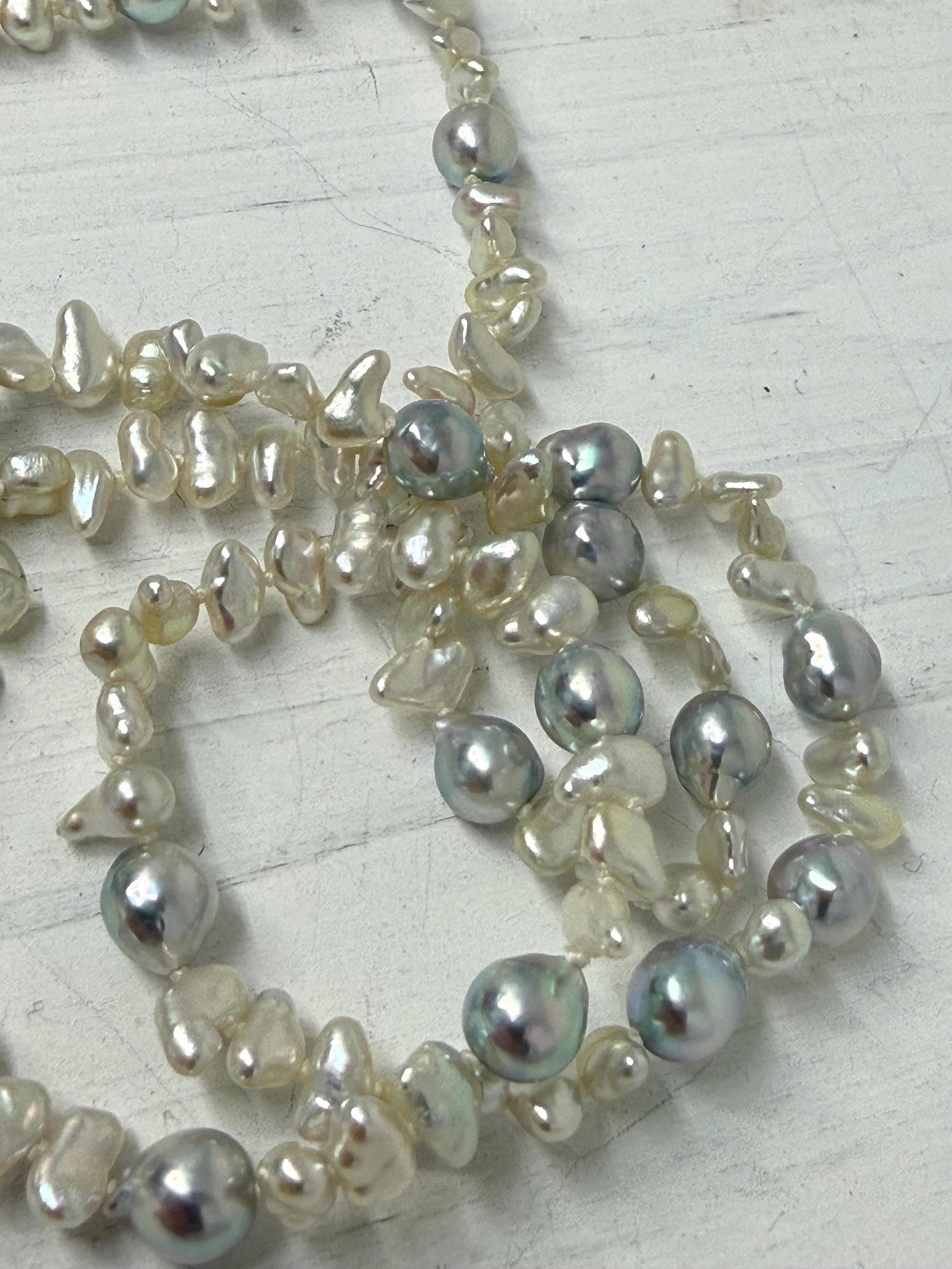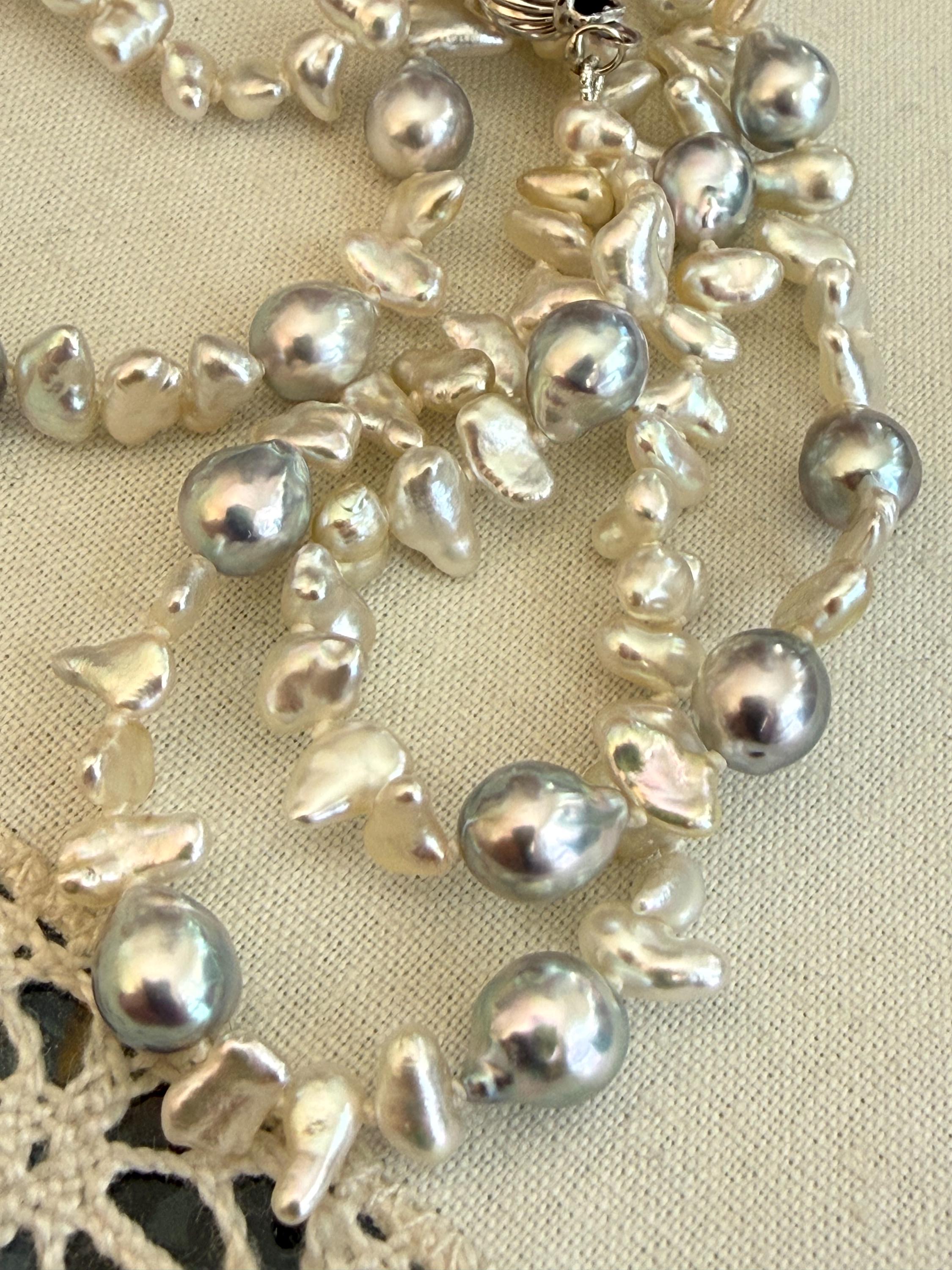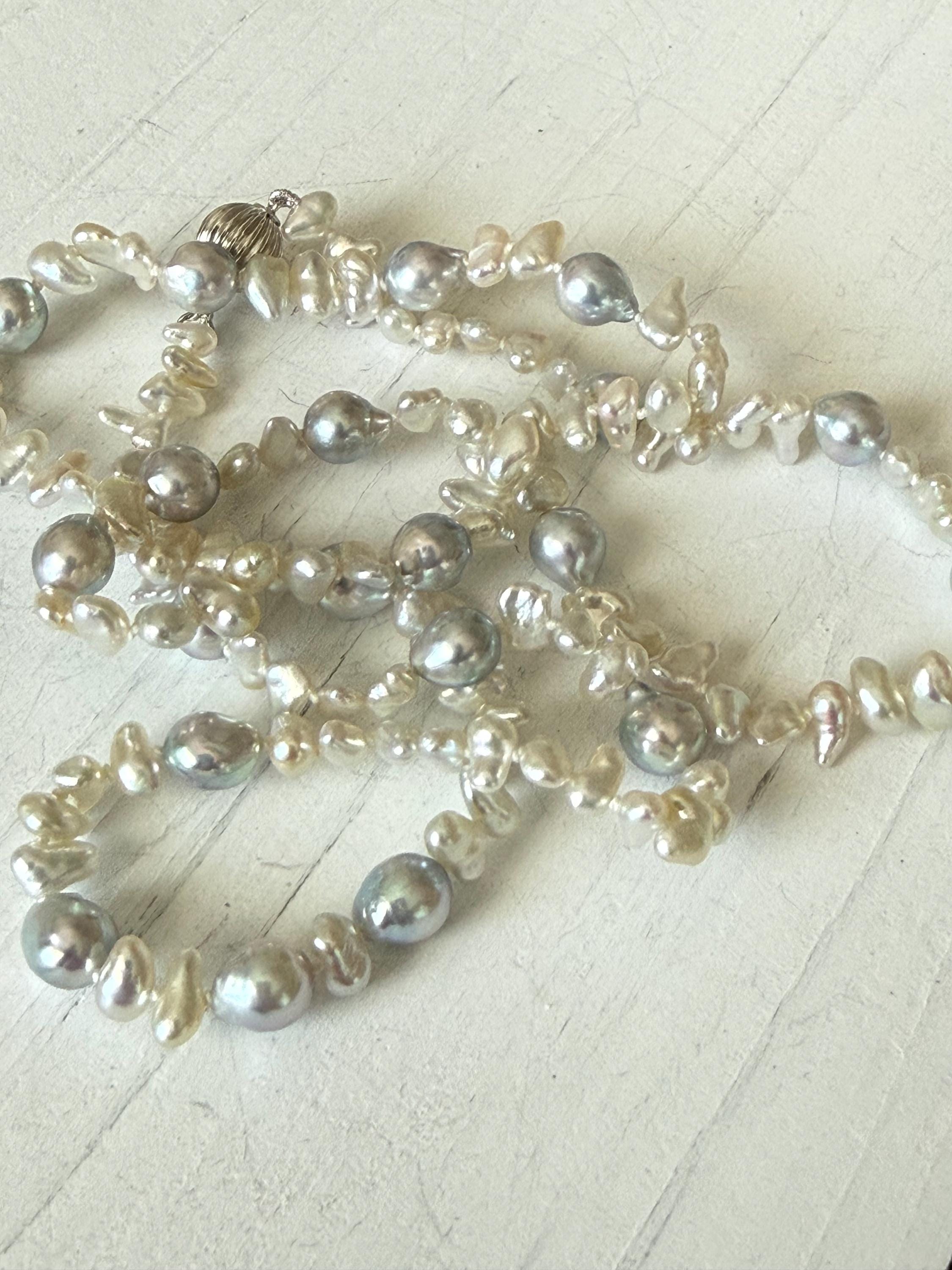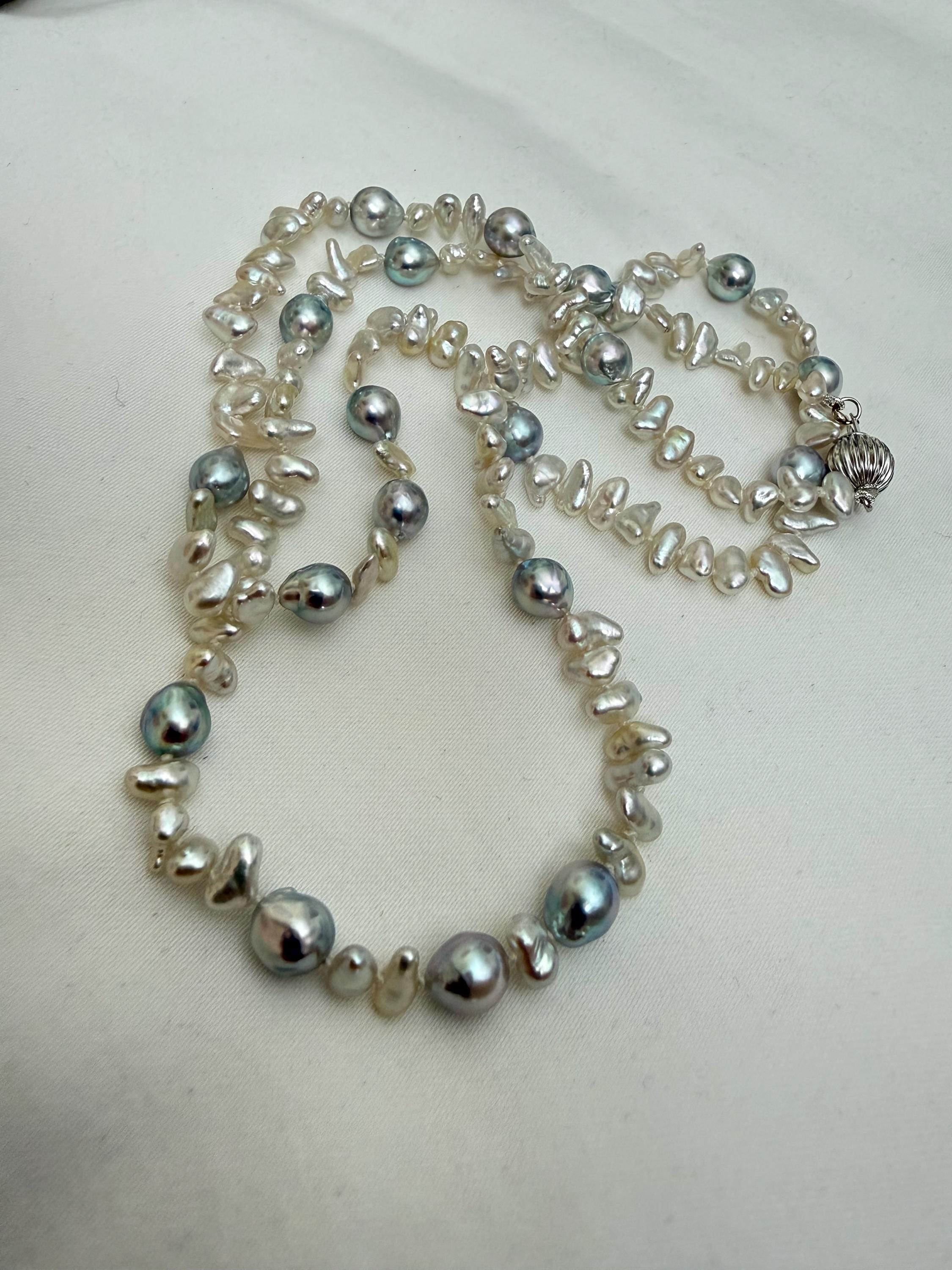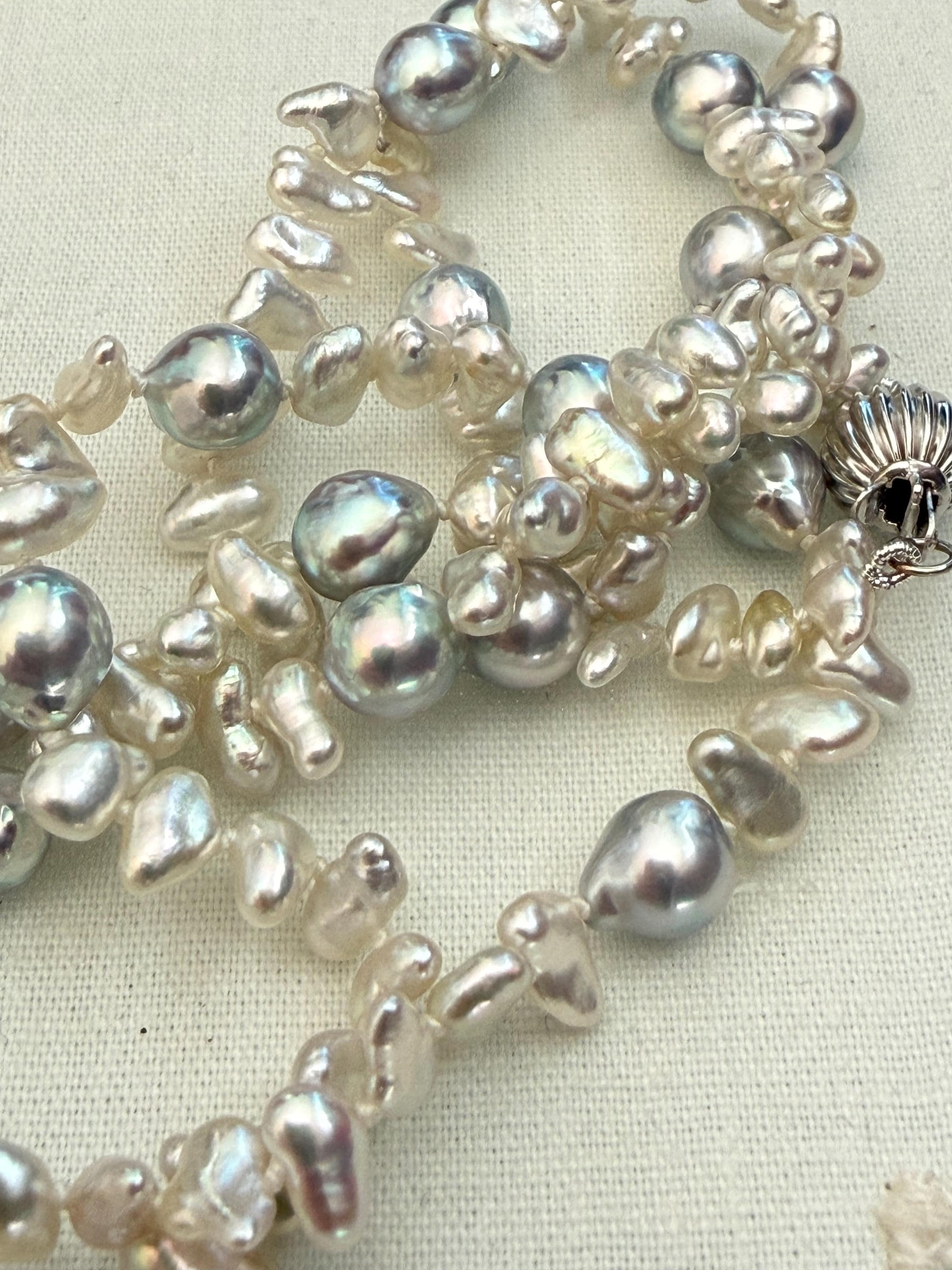 Super lustrous strand of Japanese akoya cultured keshi and baroque pearls. The overall length of this necklace is about 24 inches, end to end. It consists of 20 silvery blue baroque cultured pearls (about 6mm each) and 108 akoya keshi (about 4-6mm) cultured pearls. Each pearl is individually knotted onto the strand. The strand is finished with an 8mm 14k white gold fluted ball clasp. Keshi pearls are the byproduct of the pearl cultivation process. This strand is truly a one of a kind.