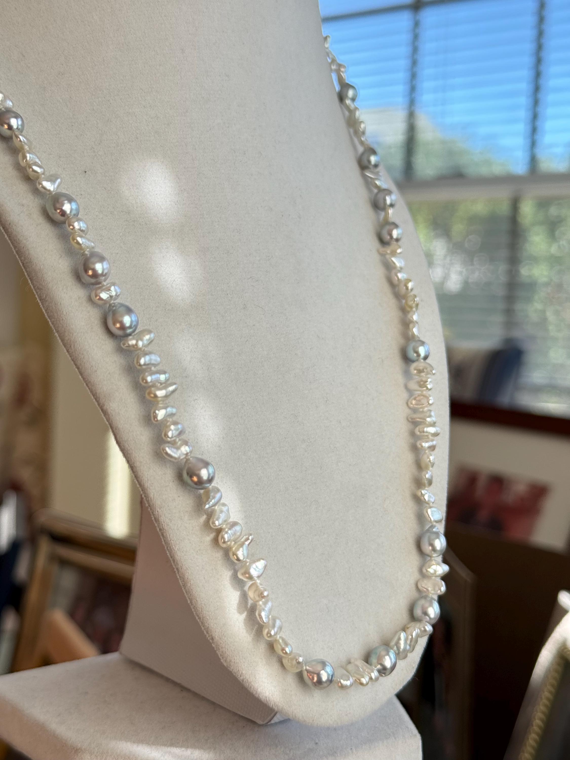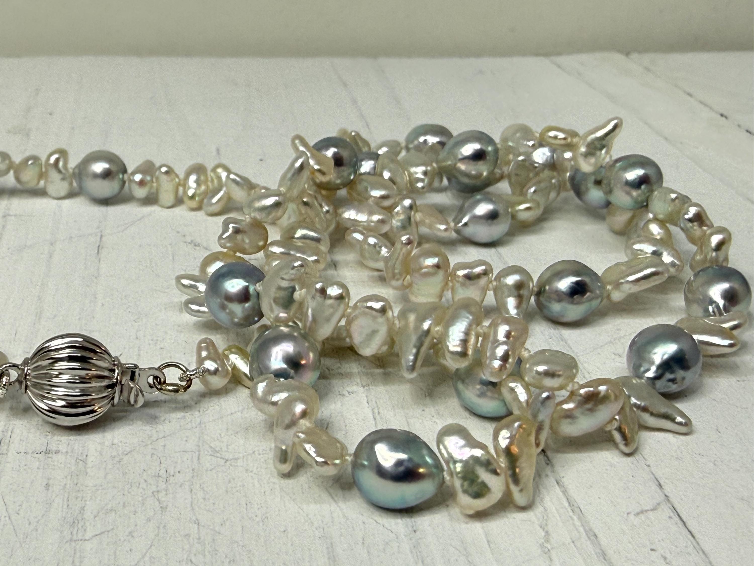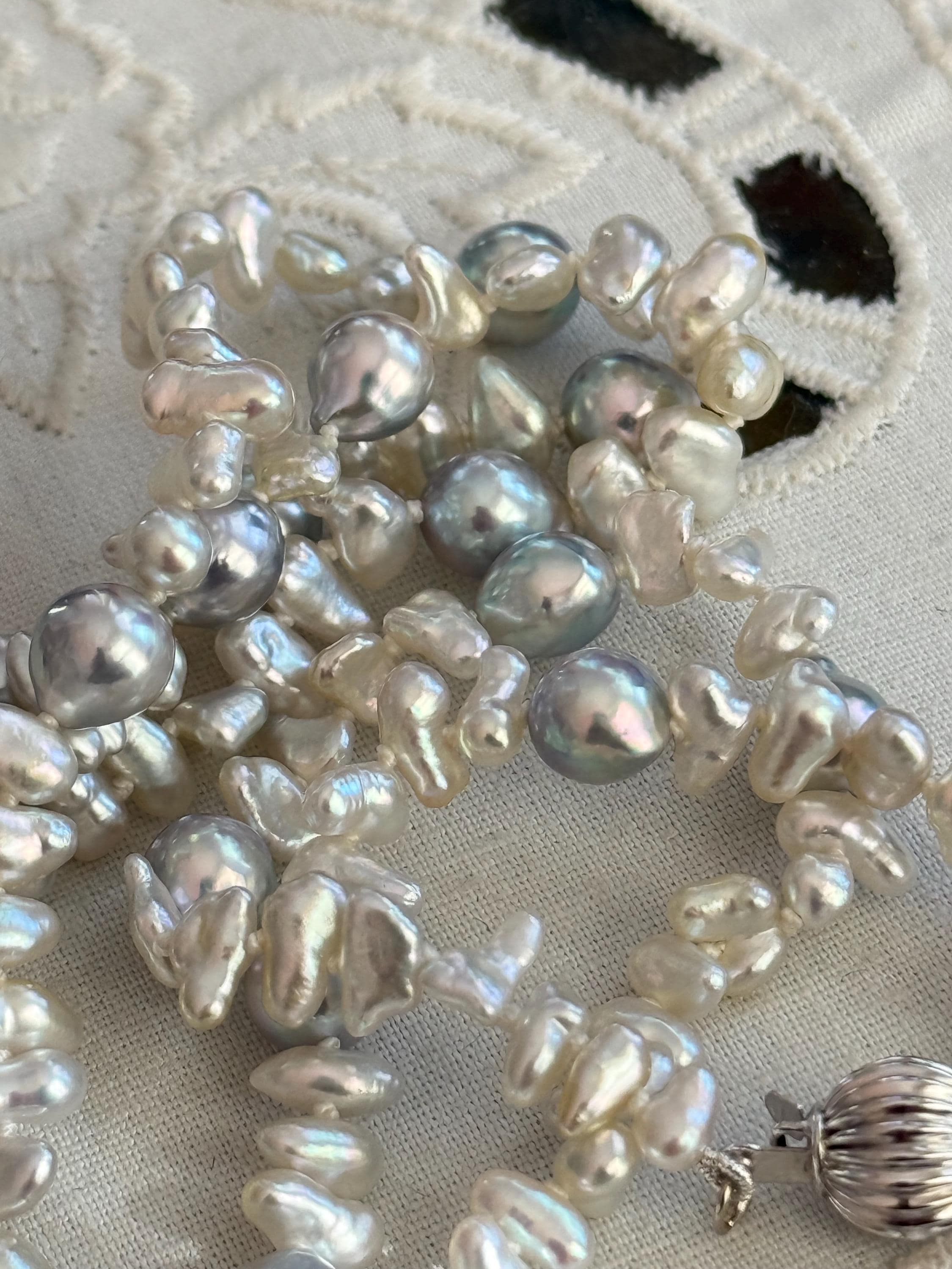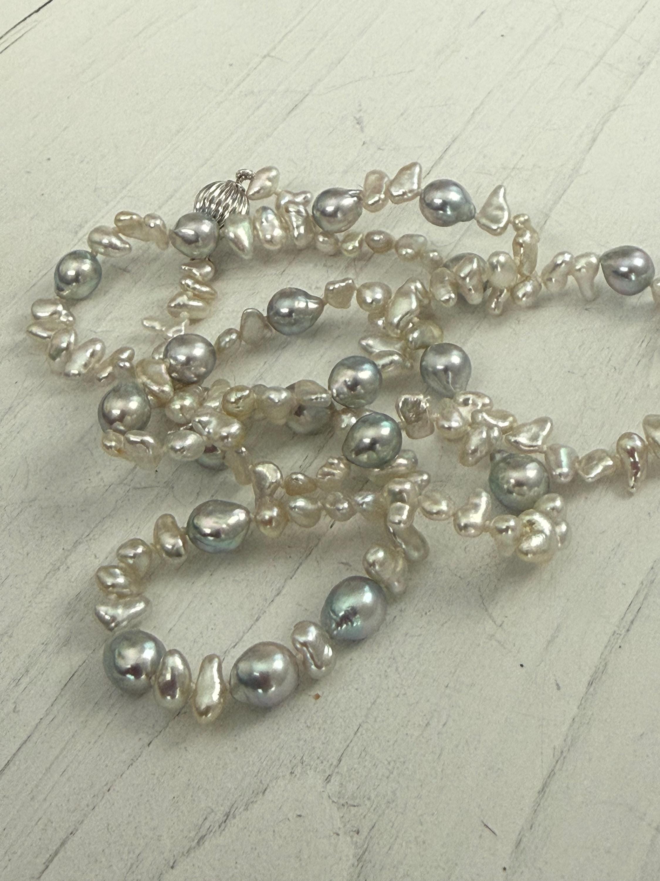 Super lustrous strand of Japanese akoya cultured keshi and baroque pearls. The overall length of this necklace is about 24 inches, end to end. It consists of 20 silvery blue baroque cultured pearls (about 6mm each) and 108 akoya keshi (about 4-6mm) cultured pearls. Each pearl is individually knotted onto the strand. The strand is finished with an 8mm 14k white gold fluted ball clasp. Keshi pearls are the byproduct of the pearl cultivation process. This strand is truly a one of a kind.