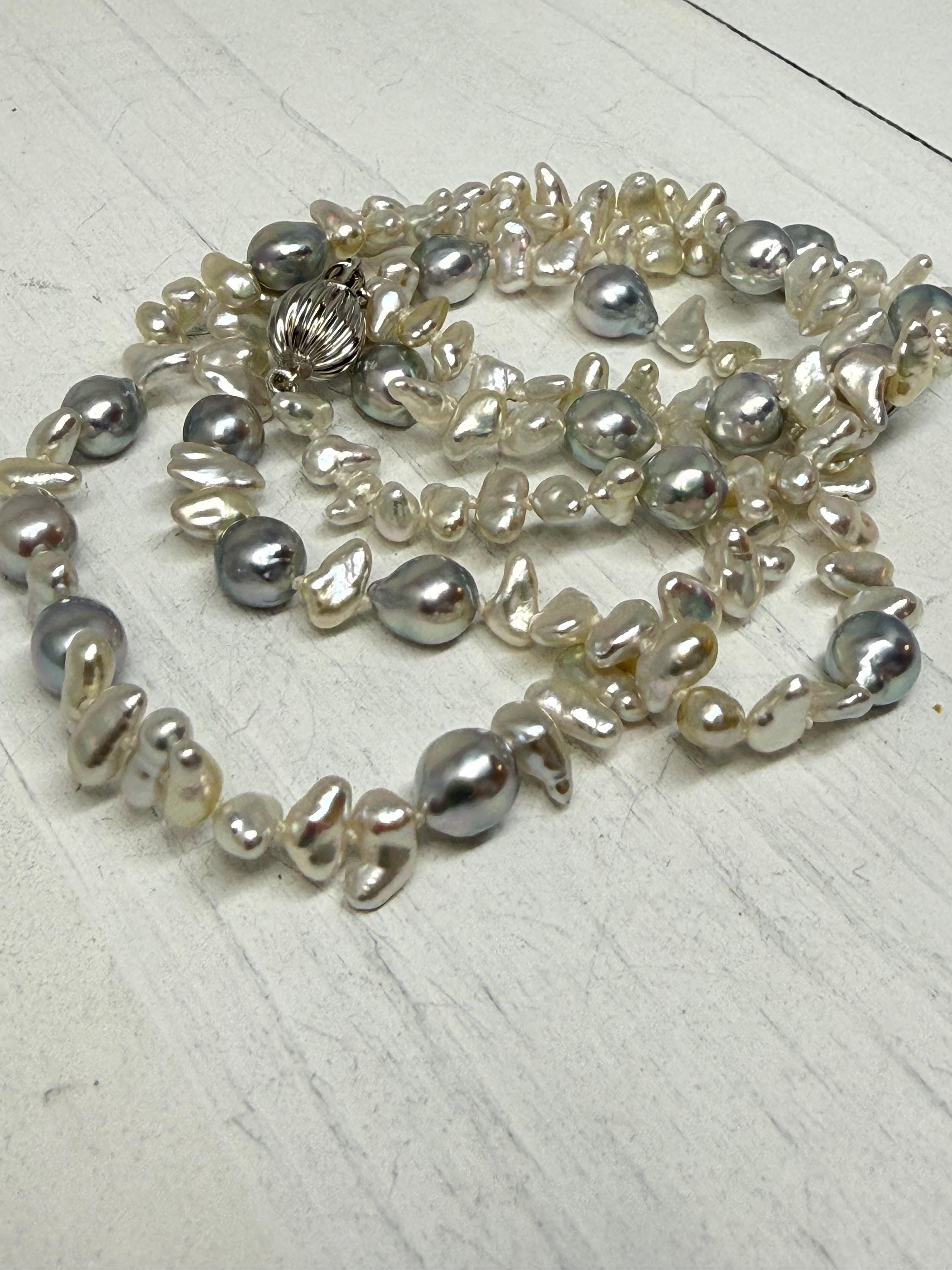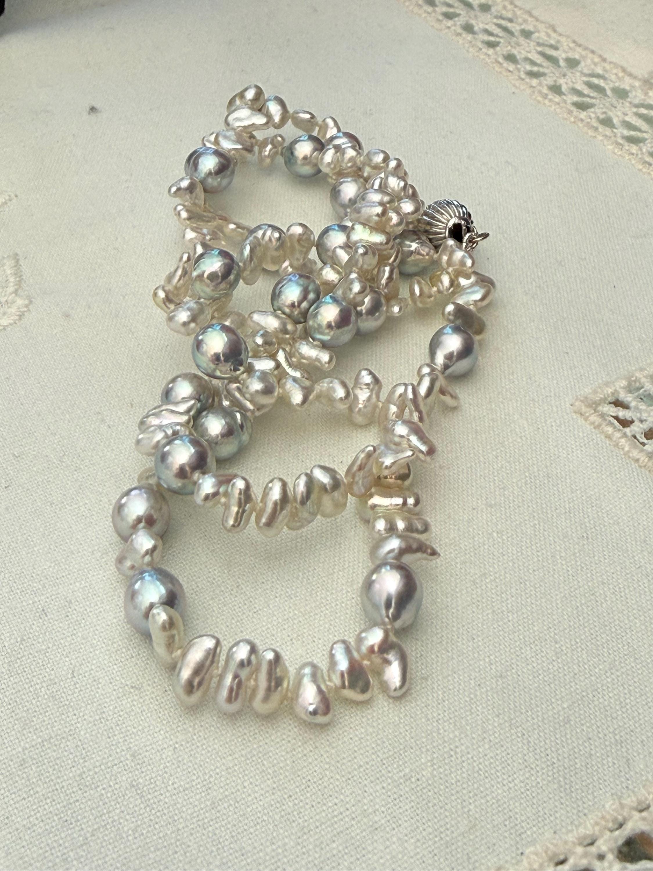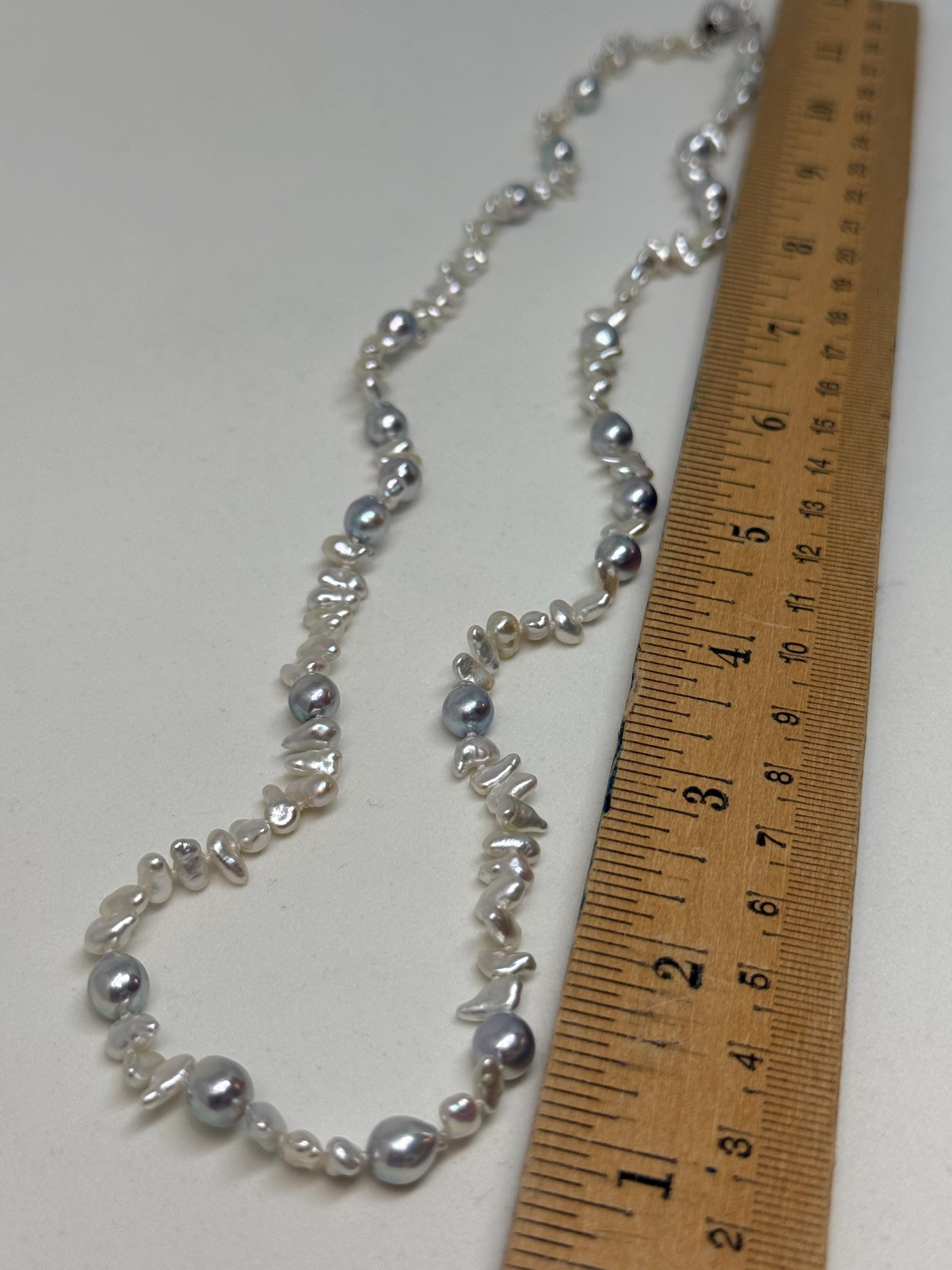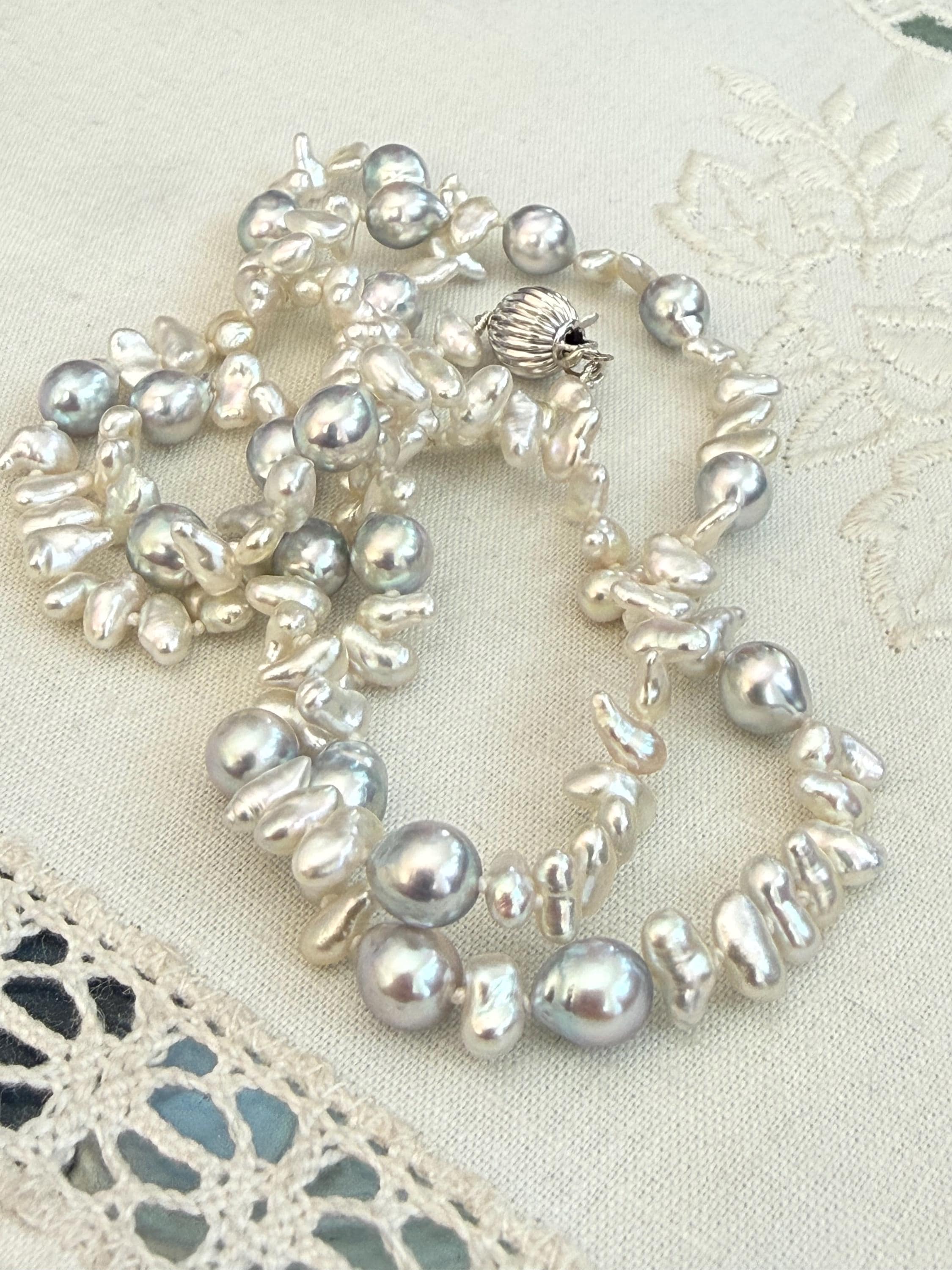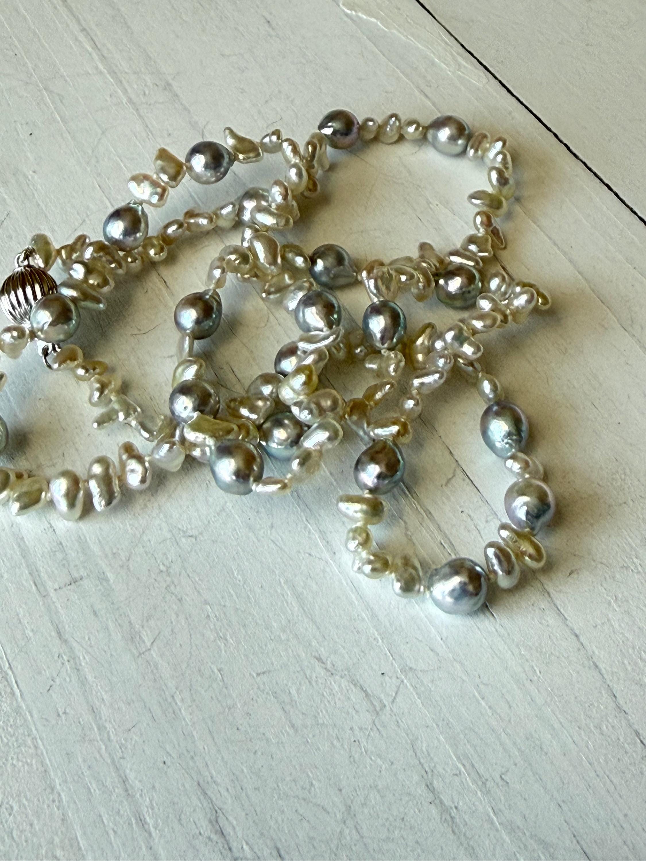 Super lustrous strand of Japanese akoya cultured keshi and baroque pearls. The overall length of this necklace is about 24 inches, end to end. It consists of 20 silvery blue baroque cultured pearls (about 6mm each) and 108 akoya keshi (about 4-6mm) cultured pearls. Each pearl is individually knotted onto the strand. The strand is finished with an 8mm 14k white gold fluted ball clasp. Keshi pearls are the byproduct of the pearl cultivation process. This strand is truly a one of a kind.