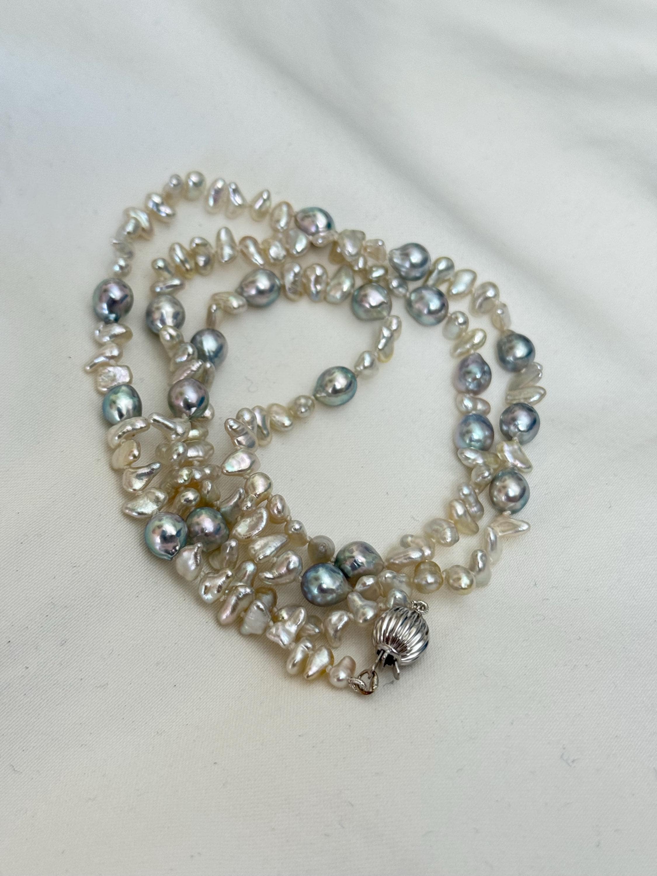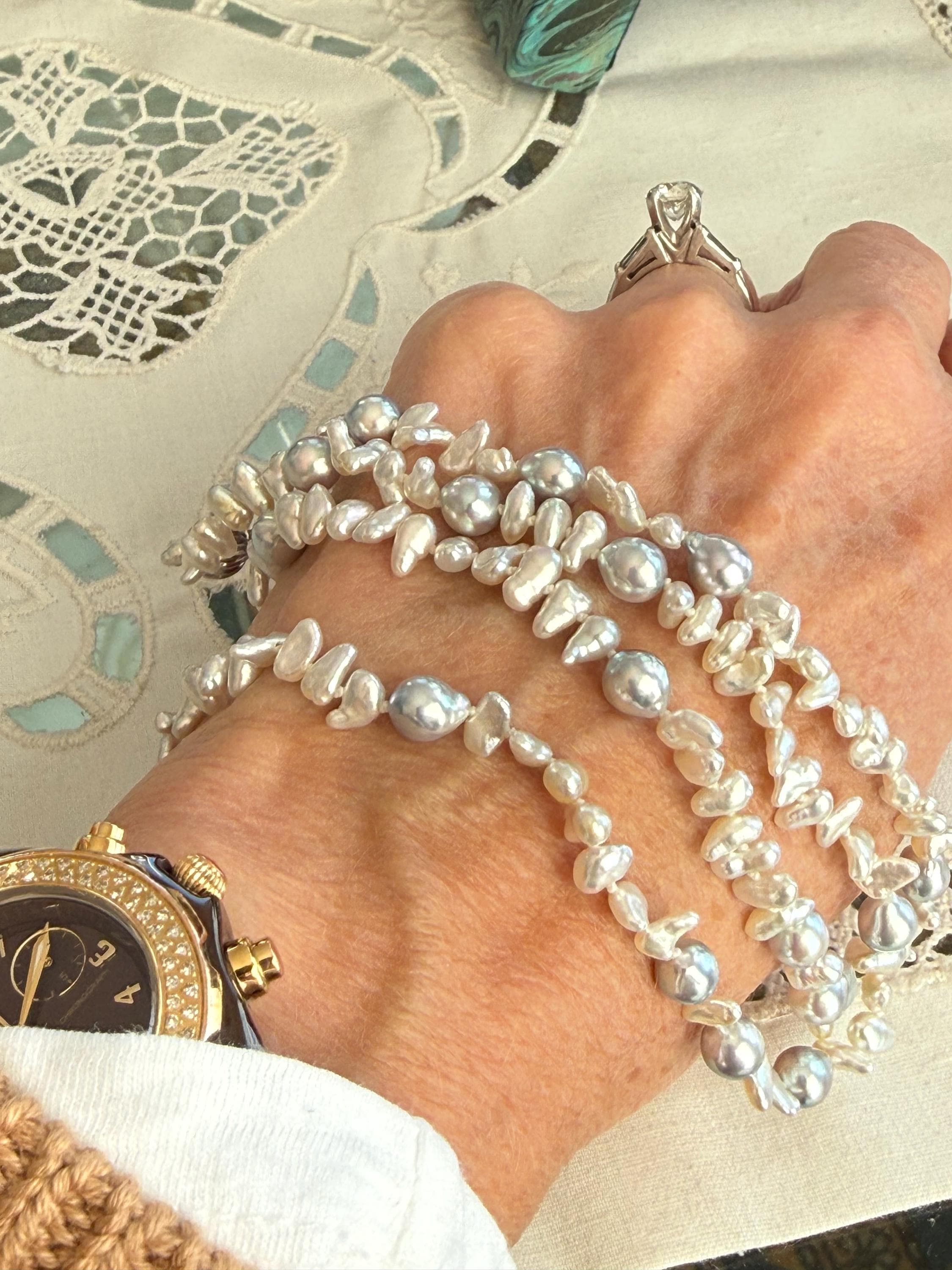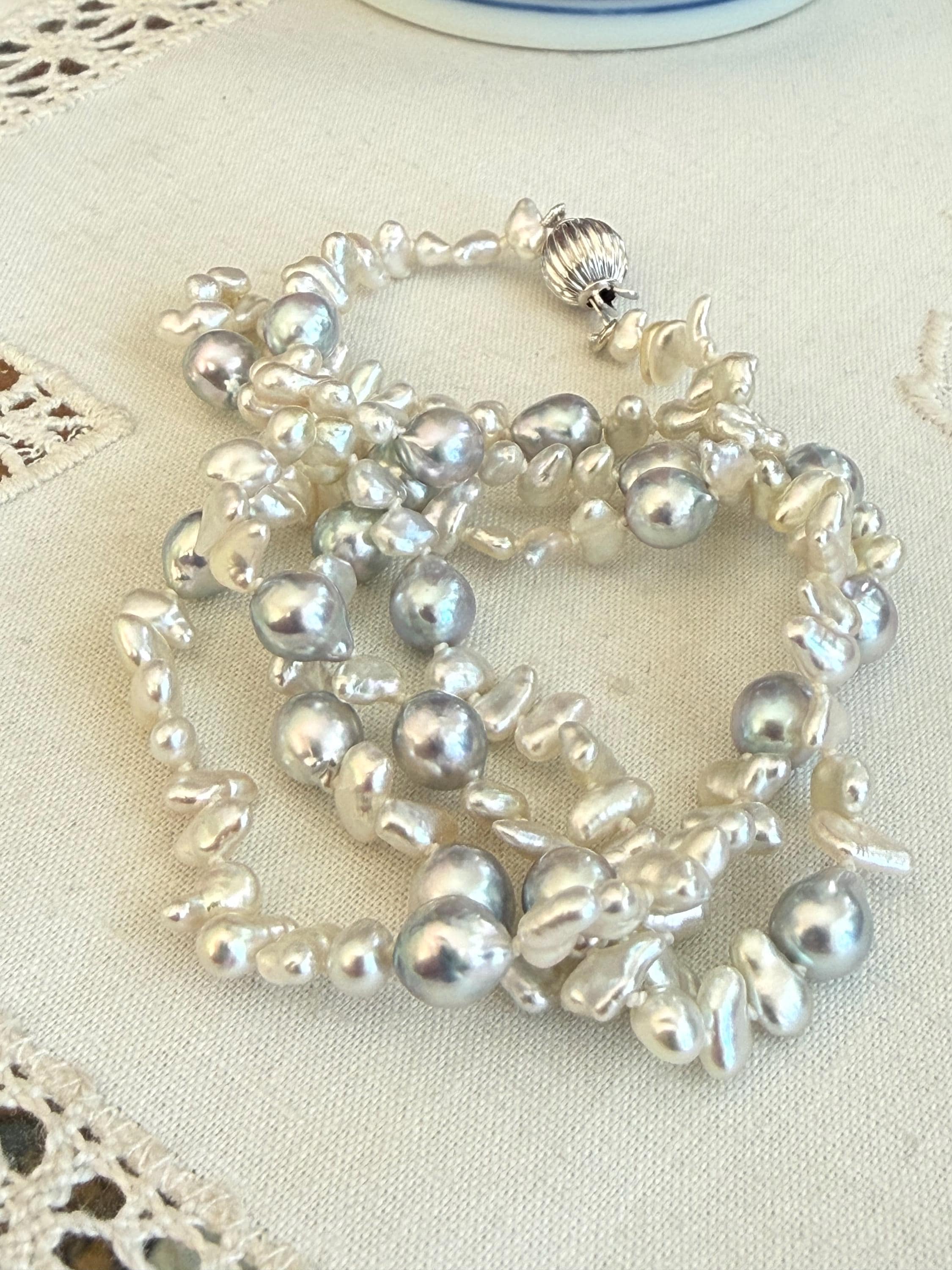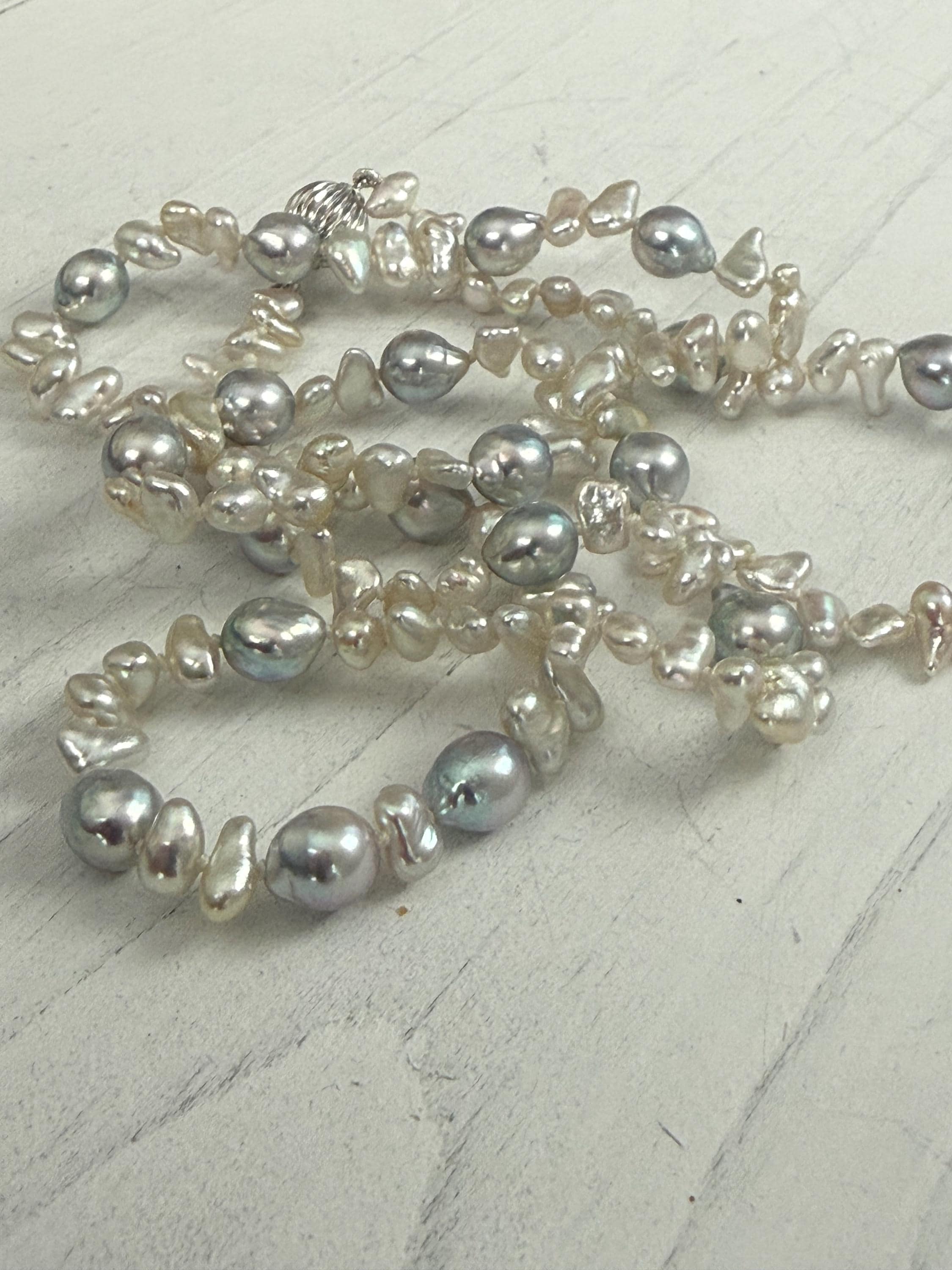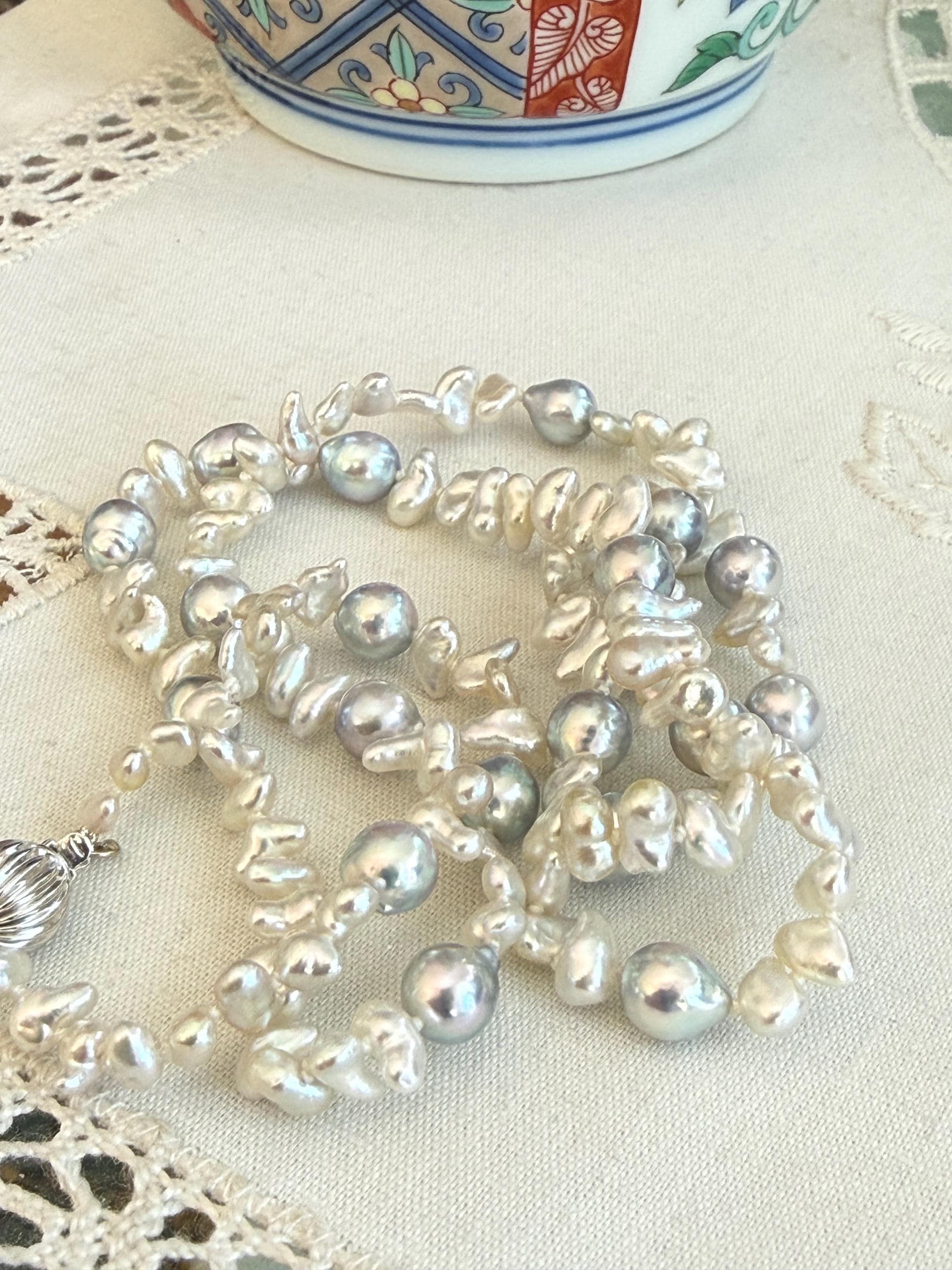 Super lustrous strand of Japanese akoya cultured keshi and baroque pearls. The overall length of this necklace is about 24 inches, end to end. It consists of 20 silvery blue baroque cultured pearls (about 6mm each) and 108 akoya keshi (about 4-6mm) cultured pearls. Each pearl is individually knotted onto the strand. The strand is finished with an 8mm 14k white gold fluted ball clasp. Keshi pearls are the byproduct of the pearl cultivation process. This strand is truly a one of a kind.