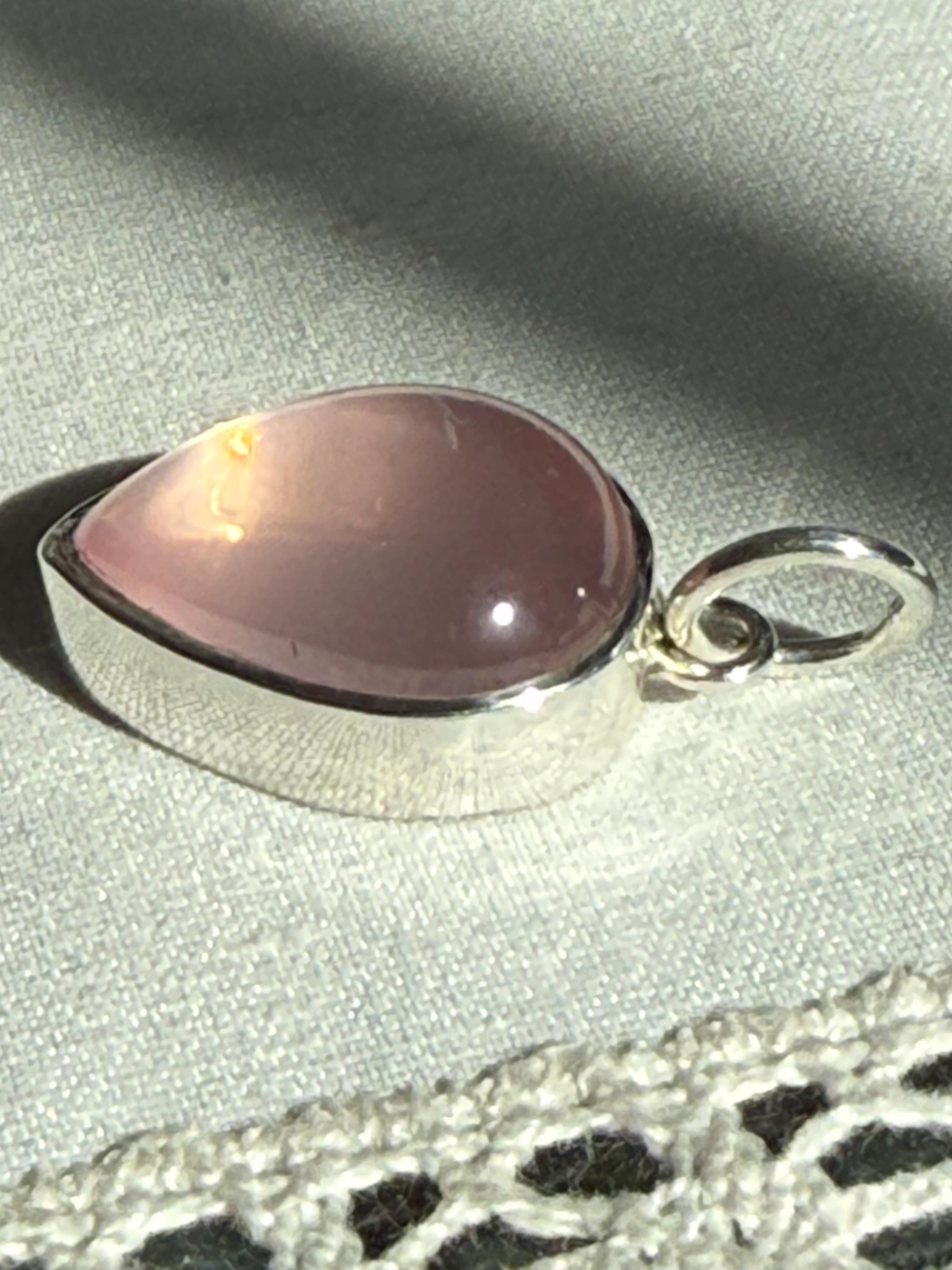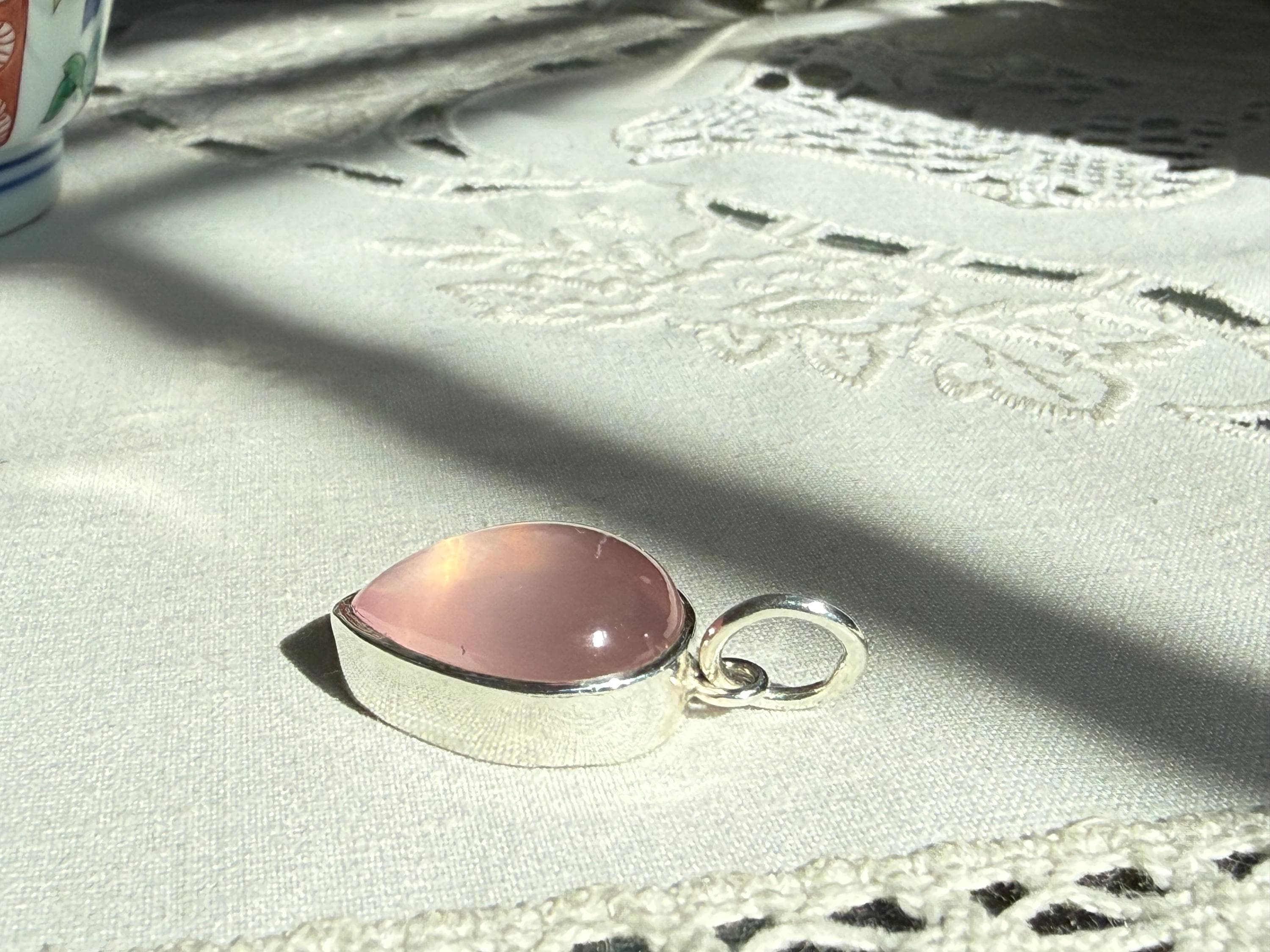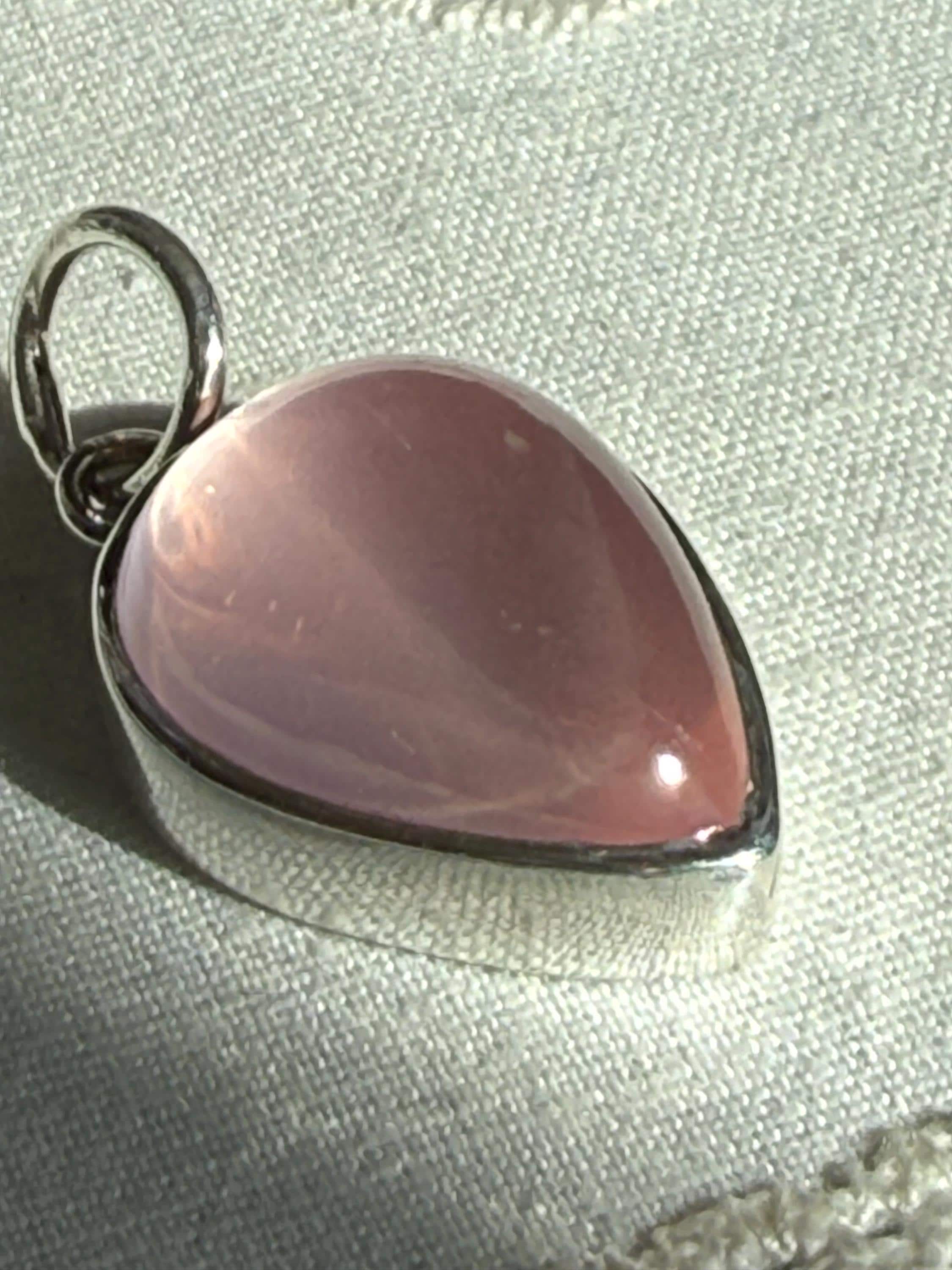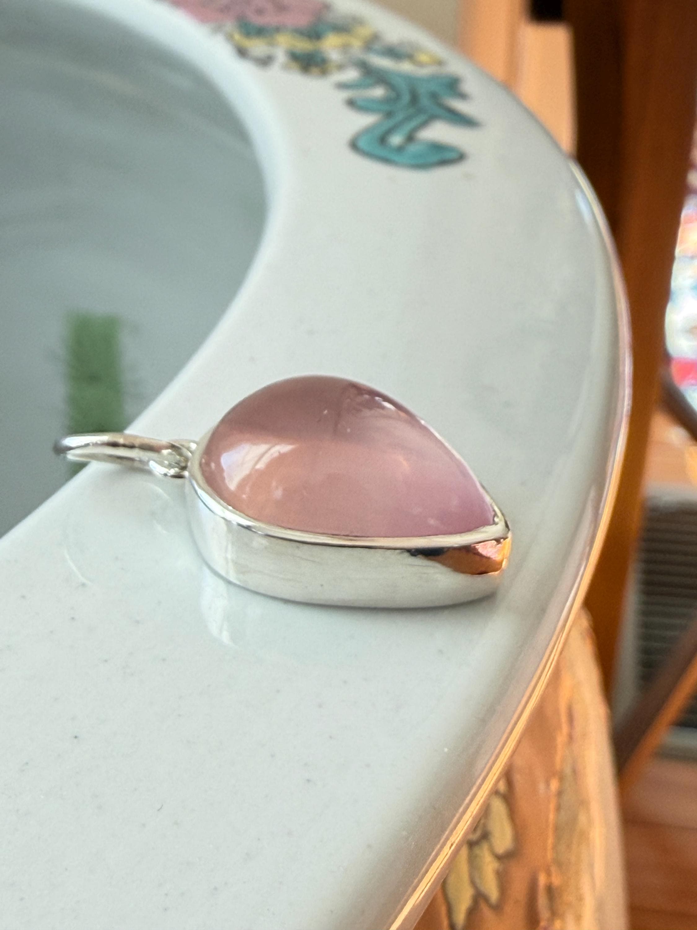 Ethereal beauty with a soft petal pink color combine to make this inverted tear drop rose quartz pendant seem to glow from within! Set point down, in a hand fabricated bezel mounting of fine silver, with a pendant bail of sterling silver, it measures about 31mm from top of the bail to the bottom of the pendant, and about 16.2mm across. The stone is cubby, at 17 cts and has a soft teardrop shape with a very high domed profile. The natural inclusions of the stone give it a glowing quality, when in direct sunlight create a 6 star ray (see the video!) This piece of rose quartz makes a beautiful statement pendant. This listing is for the pendant only and does not include a chain; if you would like to add it to a Funky Link, I have several listed that would work, or I can custom make one in a length of your choice (again, the chain is a separate purchase). The last 4 photos show this pendant with other pieces sold separately.