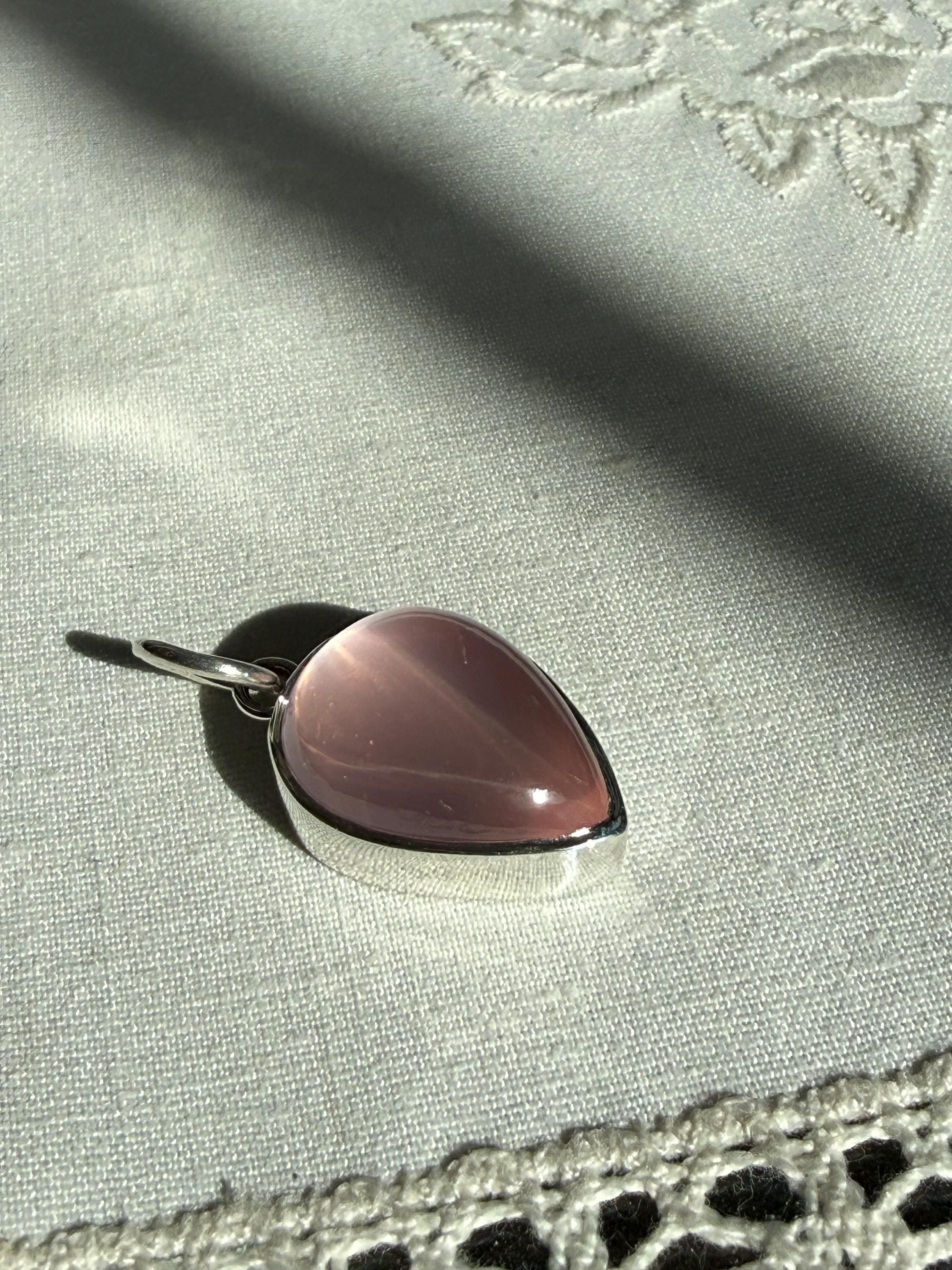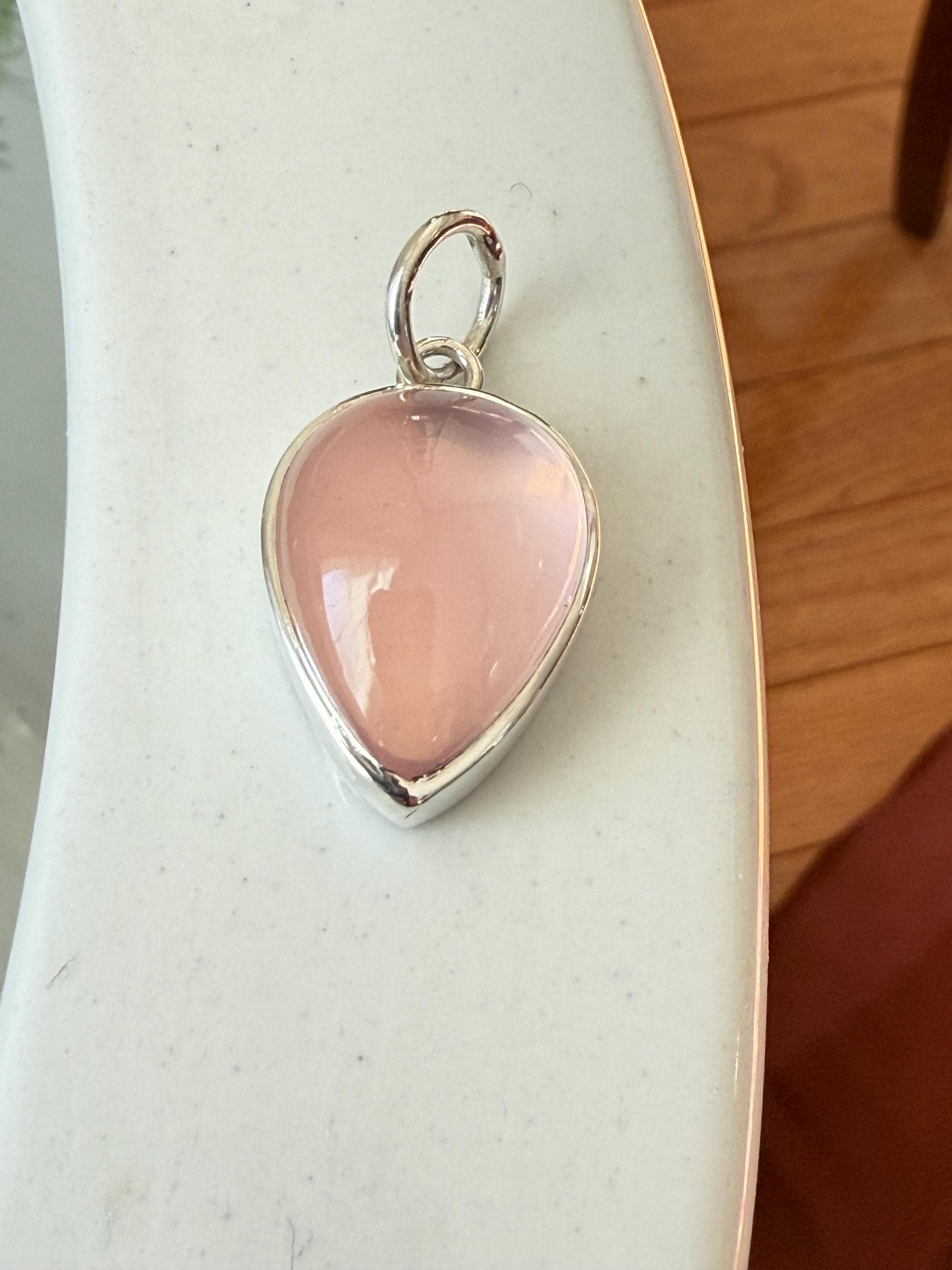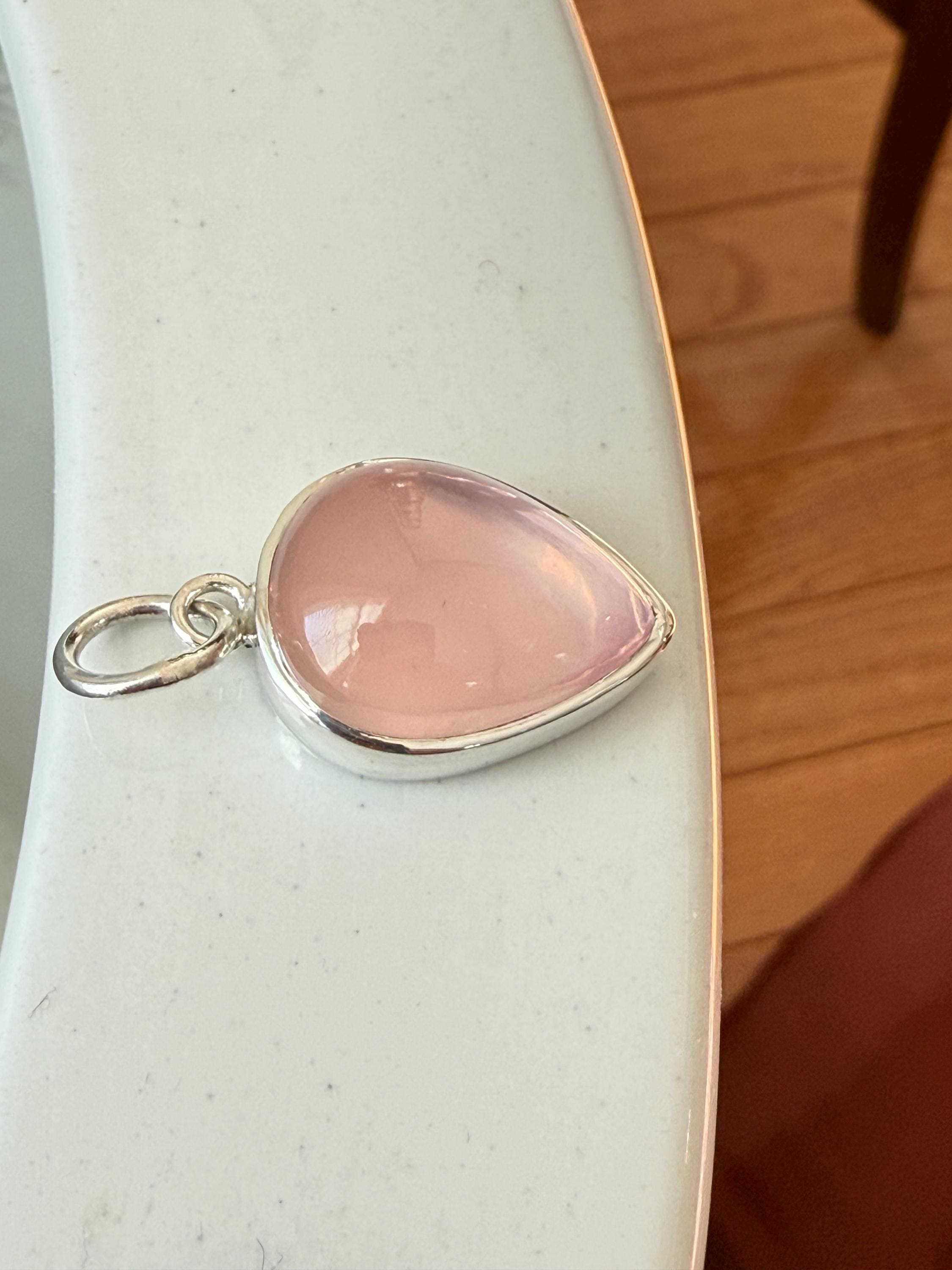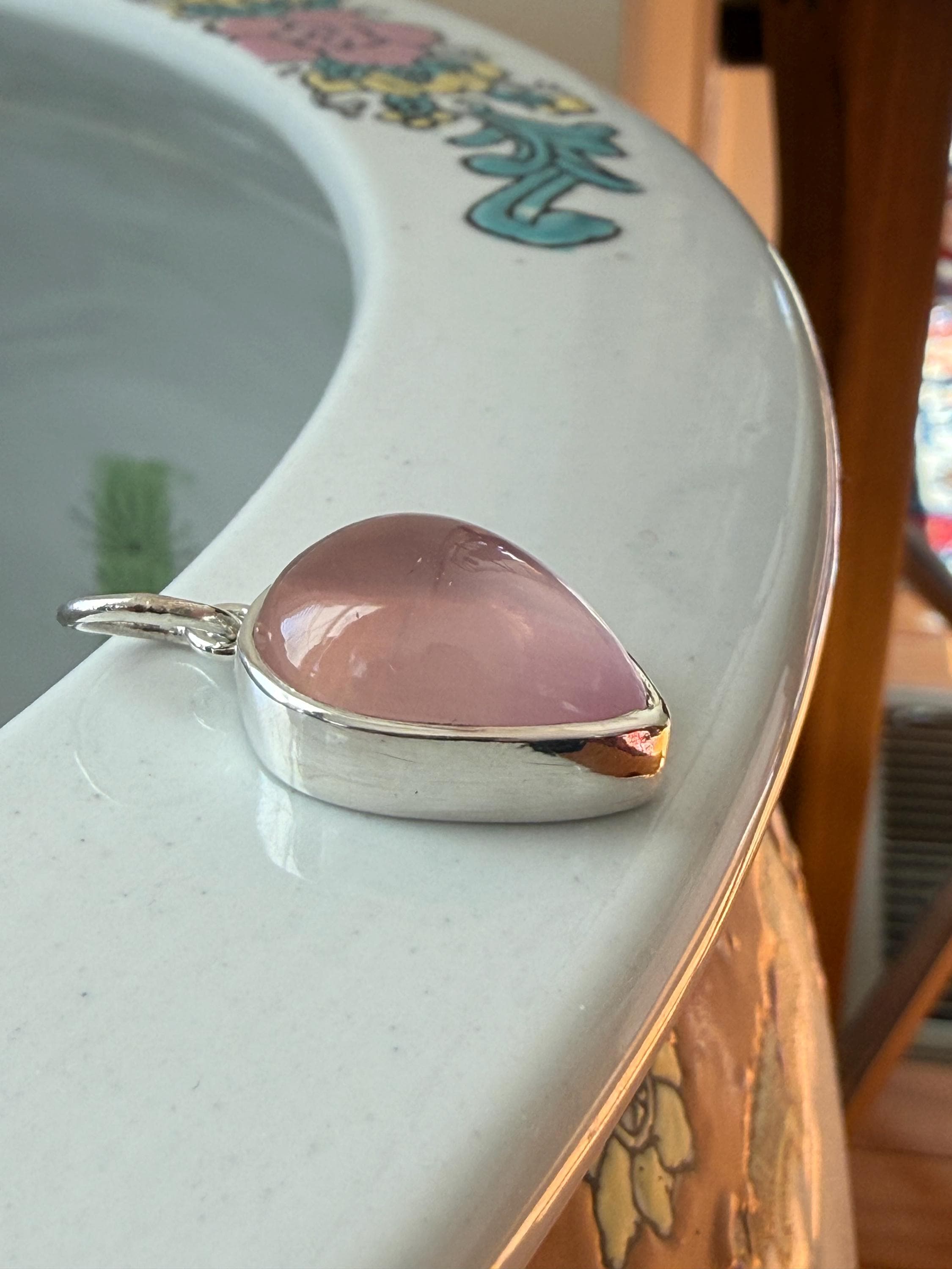 Ethereal beauty with a soft petal pink color combine to make this inverted tear drop rose quartz pendant seem to glow from within! Set point down, in a hand fabricated bezel mounting of fine silver, with a pendant bail of sterling silver, it measures about 31mm from top of the bail to the bottom of the pendant, and about 16.2mm across. The stone is cubby, at 17 cts and has a soft teardrop shape with a very high domed profile. The natural inclusions of the stone give it a glowing quality, when in direct sunlight create a 6 star ray (see the video!) This piece of rose quartz makes a beautiful statement pendant. This listing is for the pendant only and does not include a chain; if you would like to add it to a Funky Link, I have several listed that would work, or I can custom make one in a length of your choice (again, the chain is a separate purchase). The last 4 photos show this pendant with other pieces sold separately.