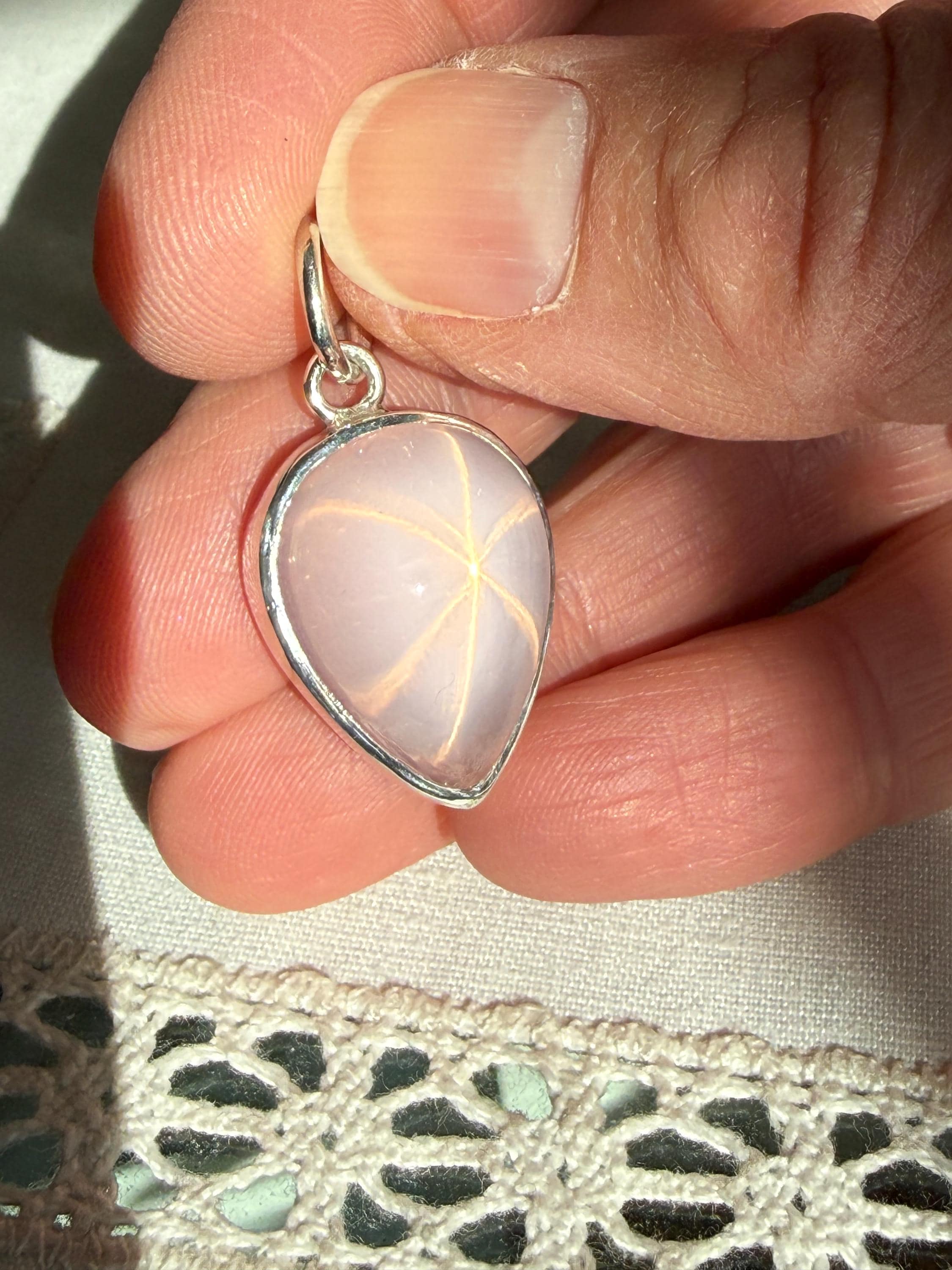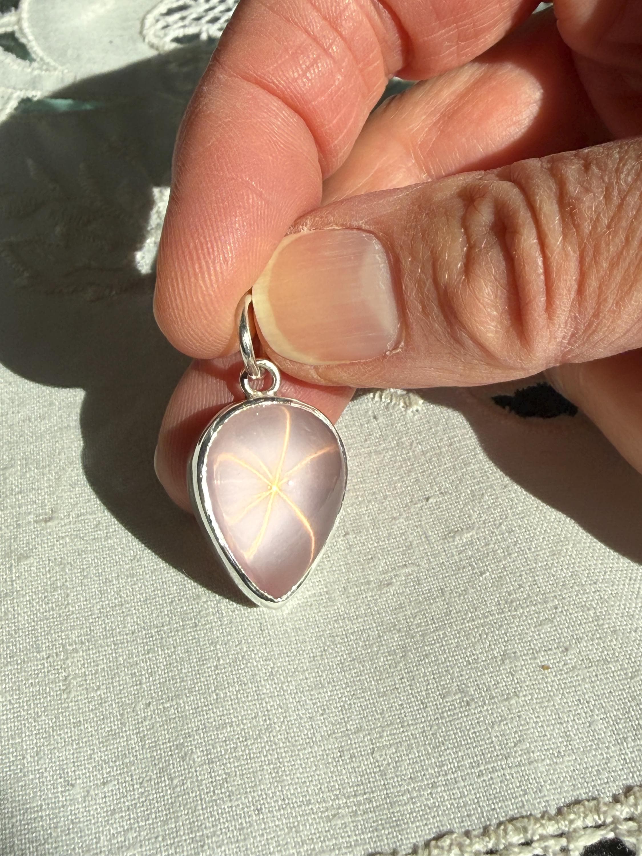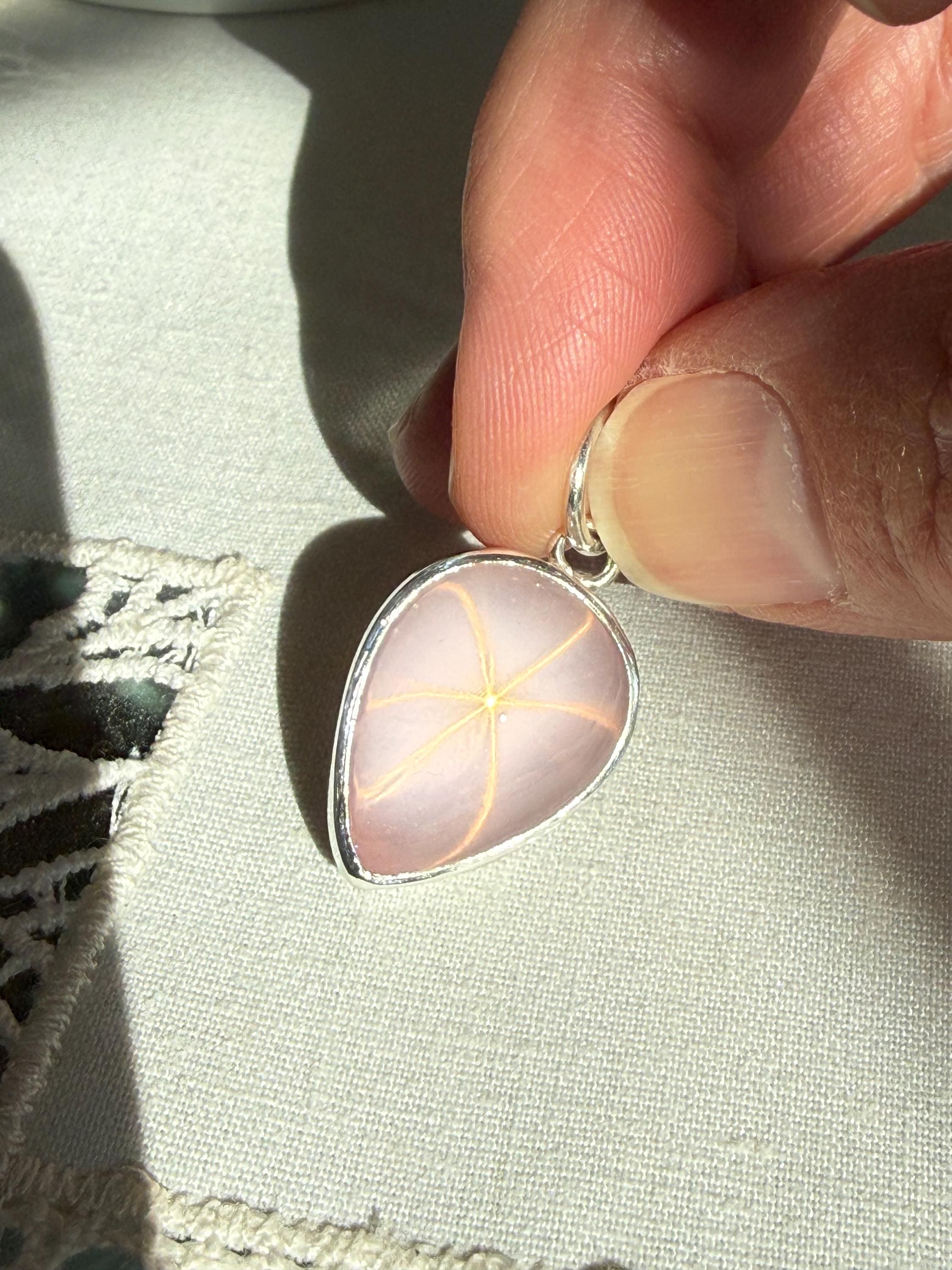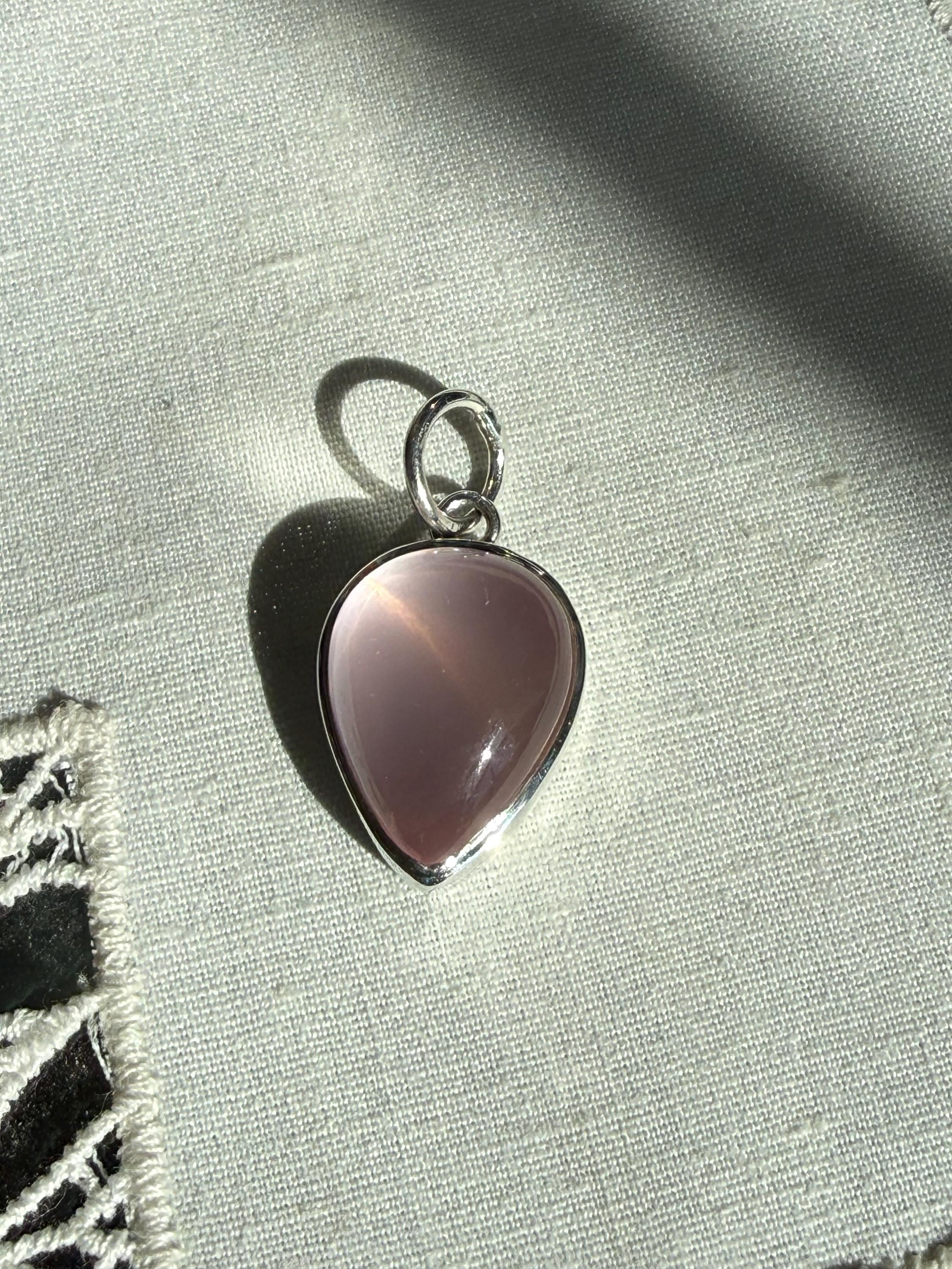 Ethereal beauty with a soft petal pink color combine to make this inverted tear drop rose quartz pendant seem to glow from within! Set point down, in a hand fabricated bezel mounting of fine silver, with a pendant bail of sterling silver, it measures about 31mm from top of the bail to the bottom of the pendant, and about 16.2mm across. The stone is cubby, at 17 cts and has a soft teardrop shape with a very high domed profile. The natural inclusions of the stone give it a glowing quality, when in direct sunlight create a 6 star ray (see the video!) This piece of rose quartz makes a beautiful statement pendant. This listing is for the pendant only and does not include a chain; if you would like to add it to a Funky Link, I have several listed that would work, or I can custom make one in a length of your choice (again, the chain is a separate purchase). The last 4 photos show this pendant with other pieces sold separately.