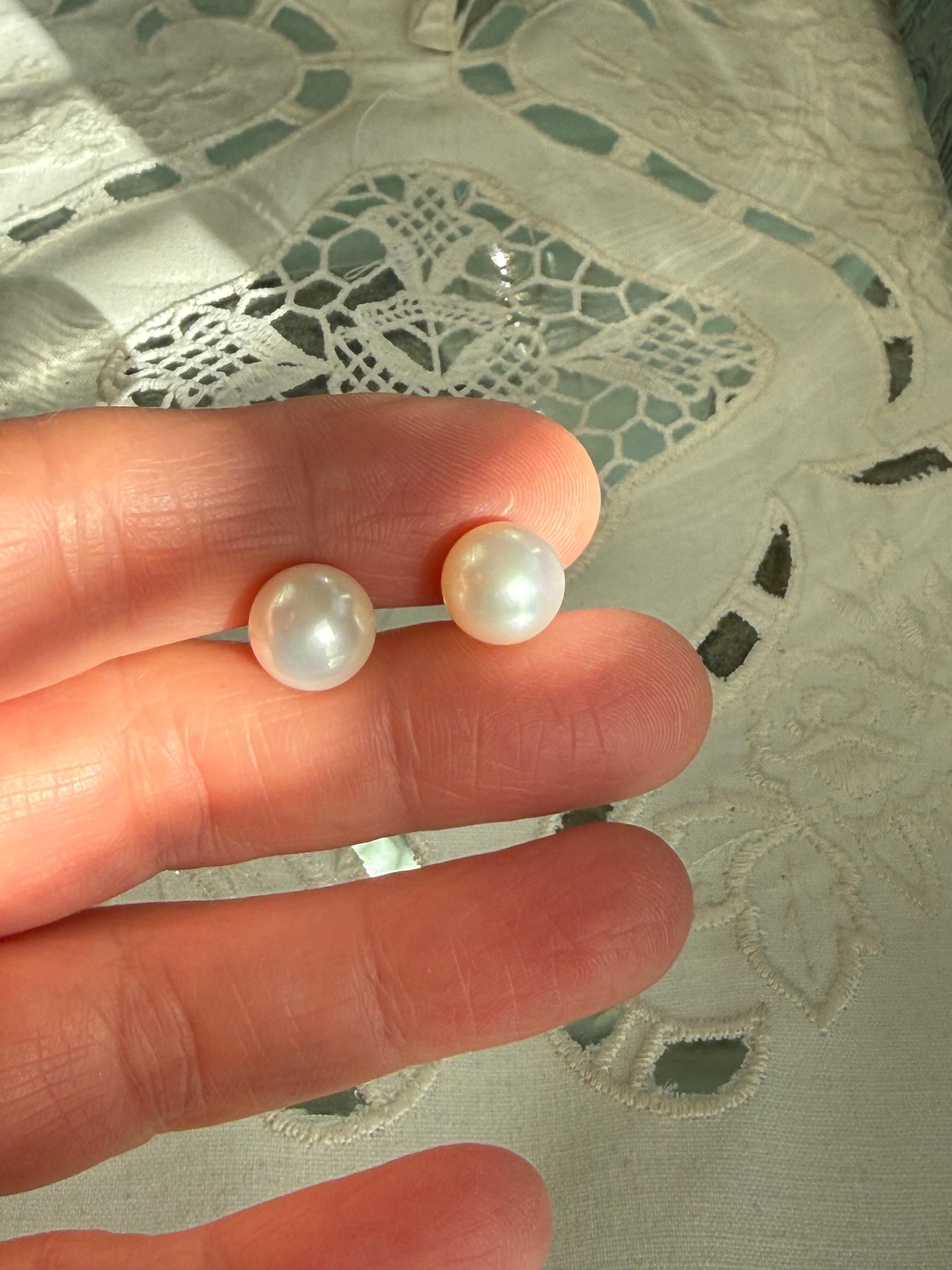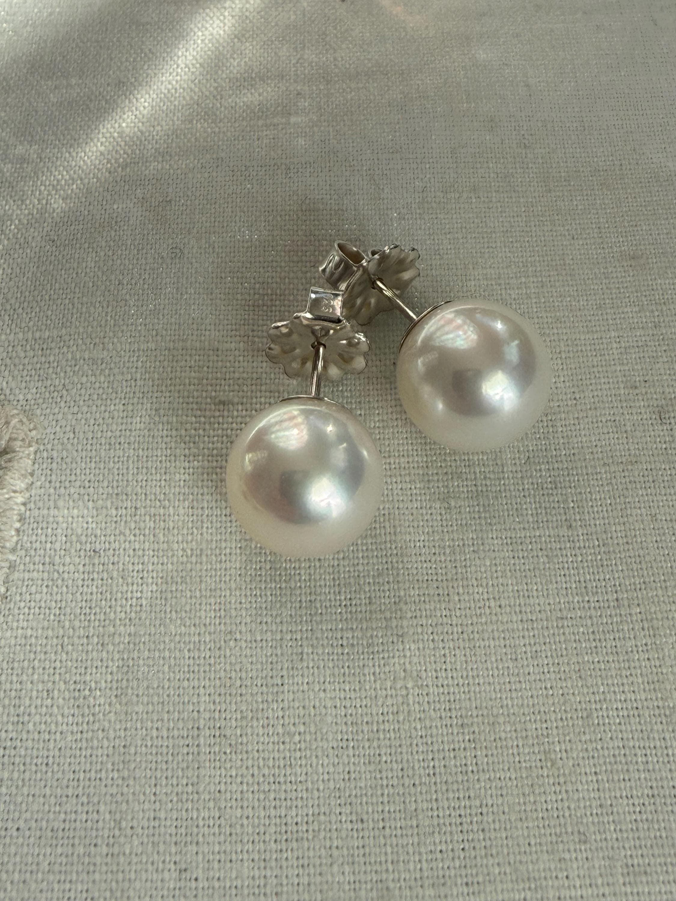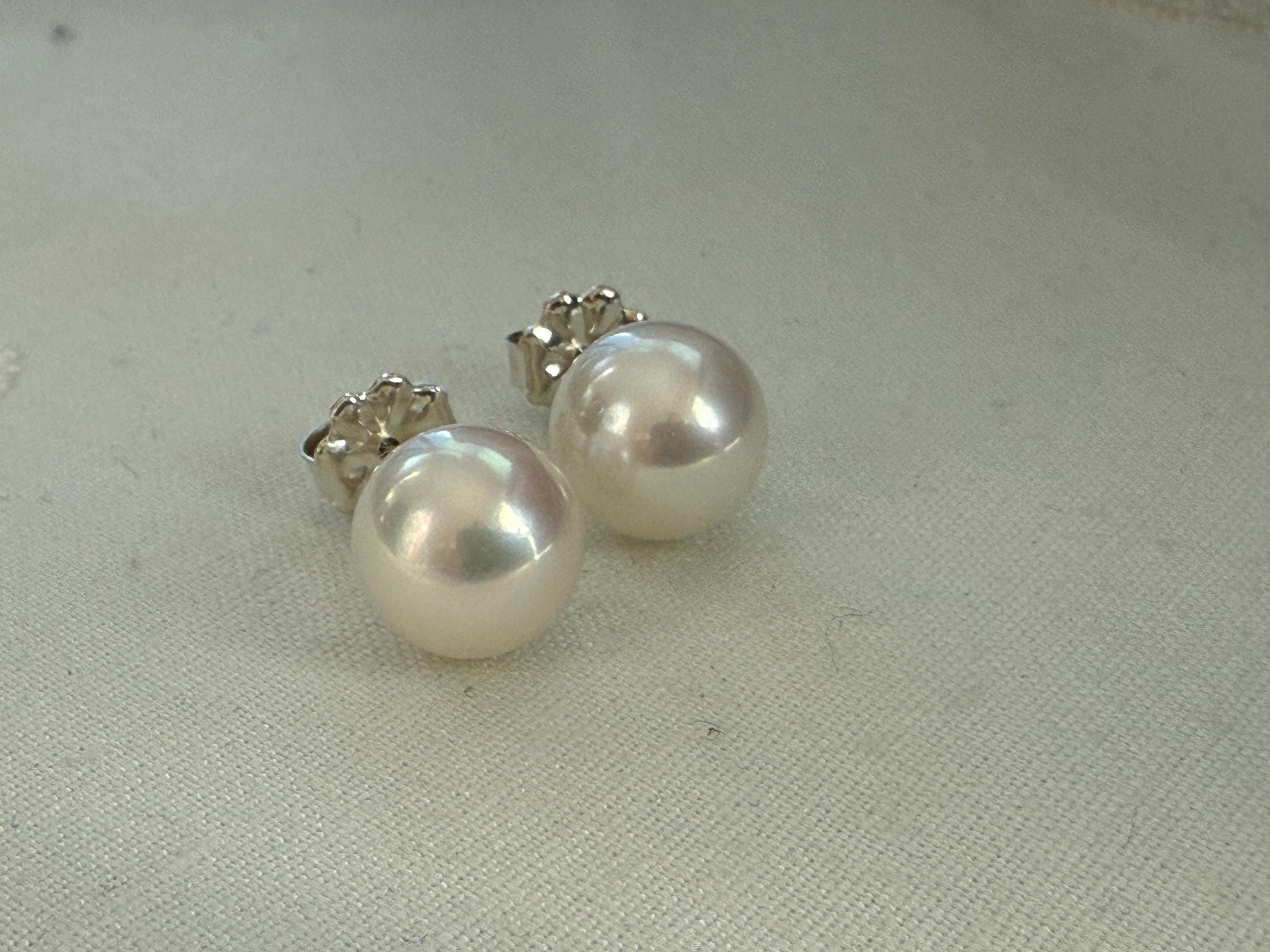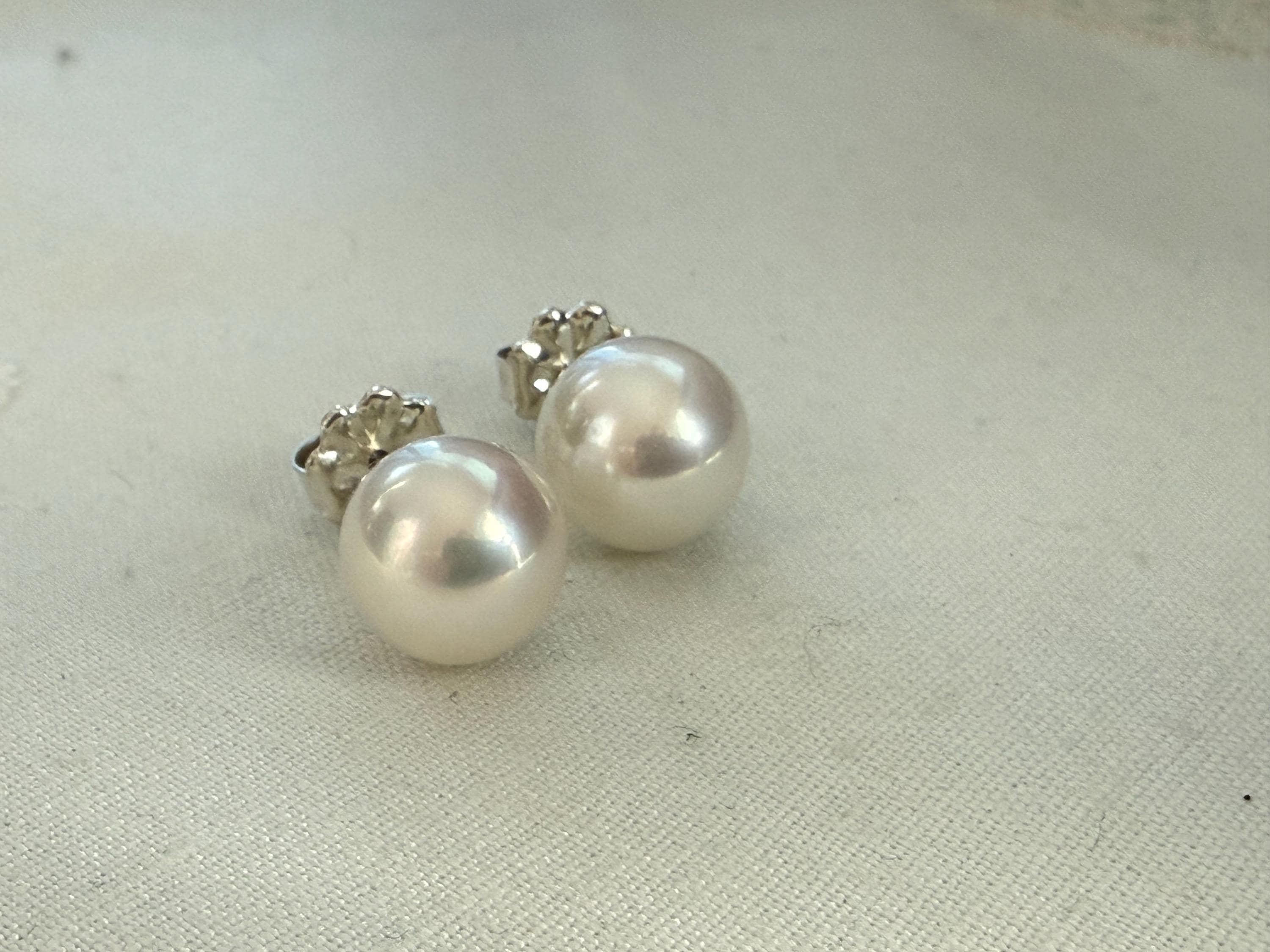 Simple, elegant, and so easy to wear! Cultured freshwater pearl studs are a classic for a reason: they simply go with everything! This gorgeous pair of round 10/10.2 mm white freshwater cultured pearl earrings are mounted in sterling silver with large butterfly backs. The pearls have a creamy white color with very sharp luster and minimal blemishing (hidden under the post). Their size is perfect for those who prefer a simple everyday earring. These are for pierced ears only.