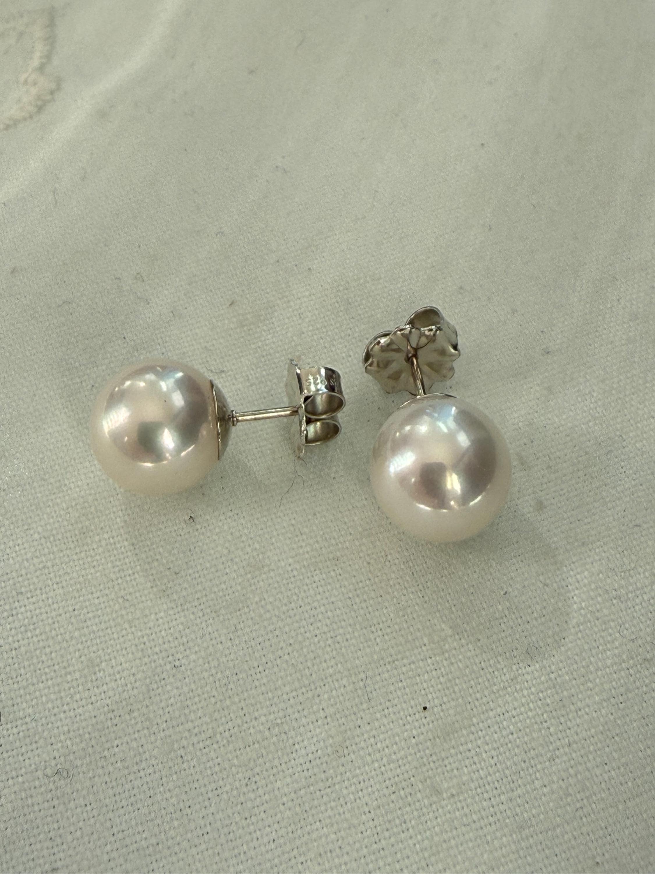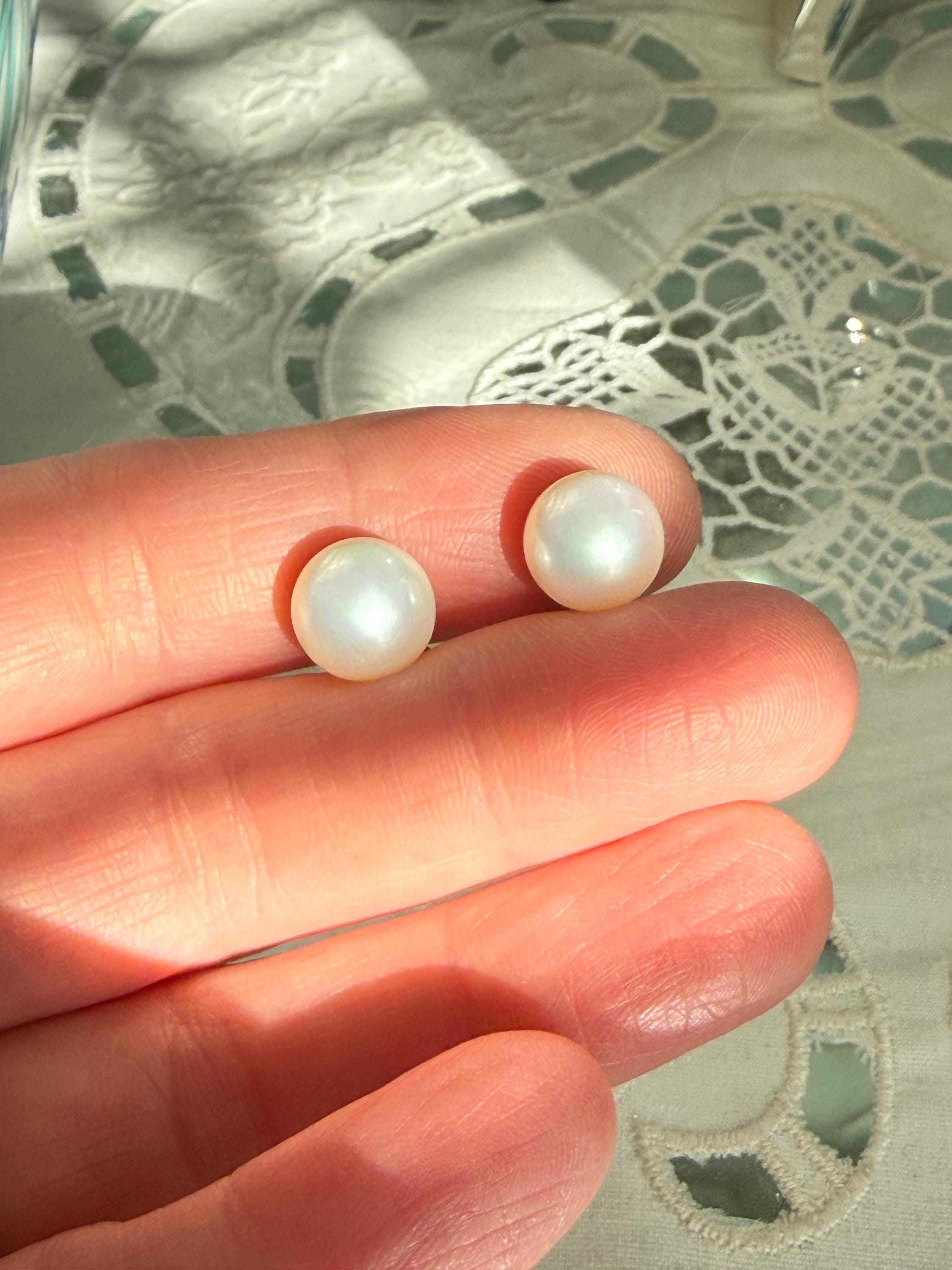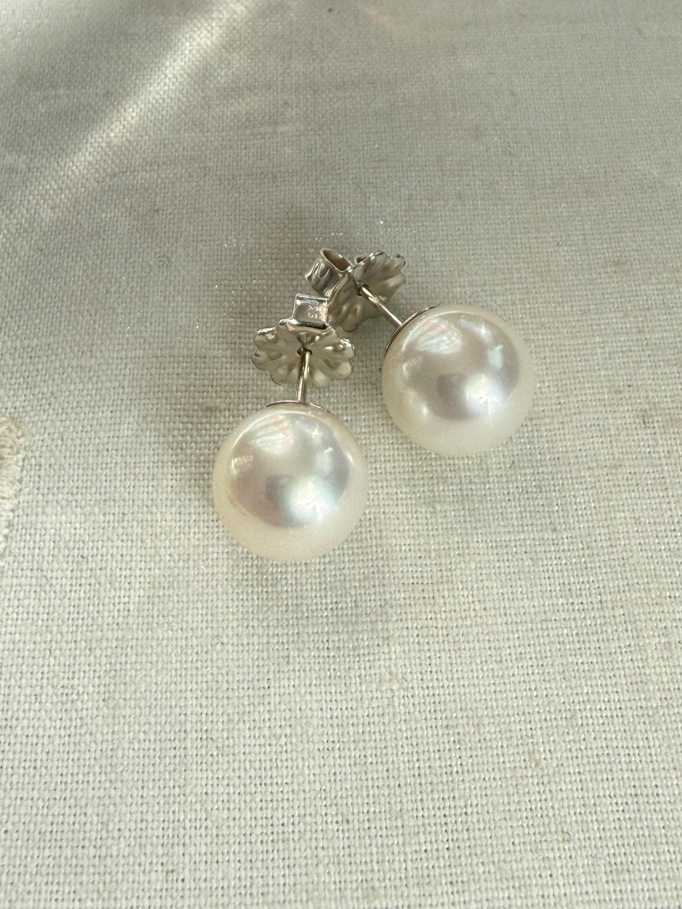 Simple, elegant, and so easy to wear! Cultured freshwater pearl studs are a classic for a reason: they simply go with everything! This gorgeous pair of round 10/10.2 mm white freshwater cultured pearl earrings are mounted in sterling silver with large butterfly backs. The pearls have a creamy white color with very sharp luster and minimal blemishing (hidden under the post). Their size is perfect for those who prefer a simple everyday earring. These are for pierced ears only.