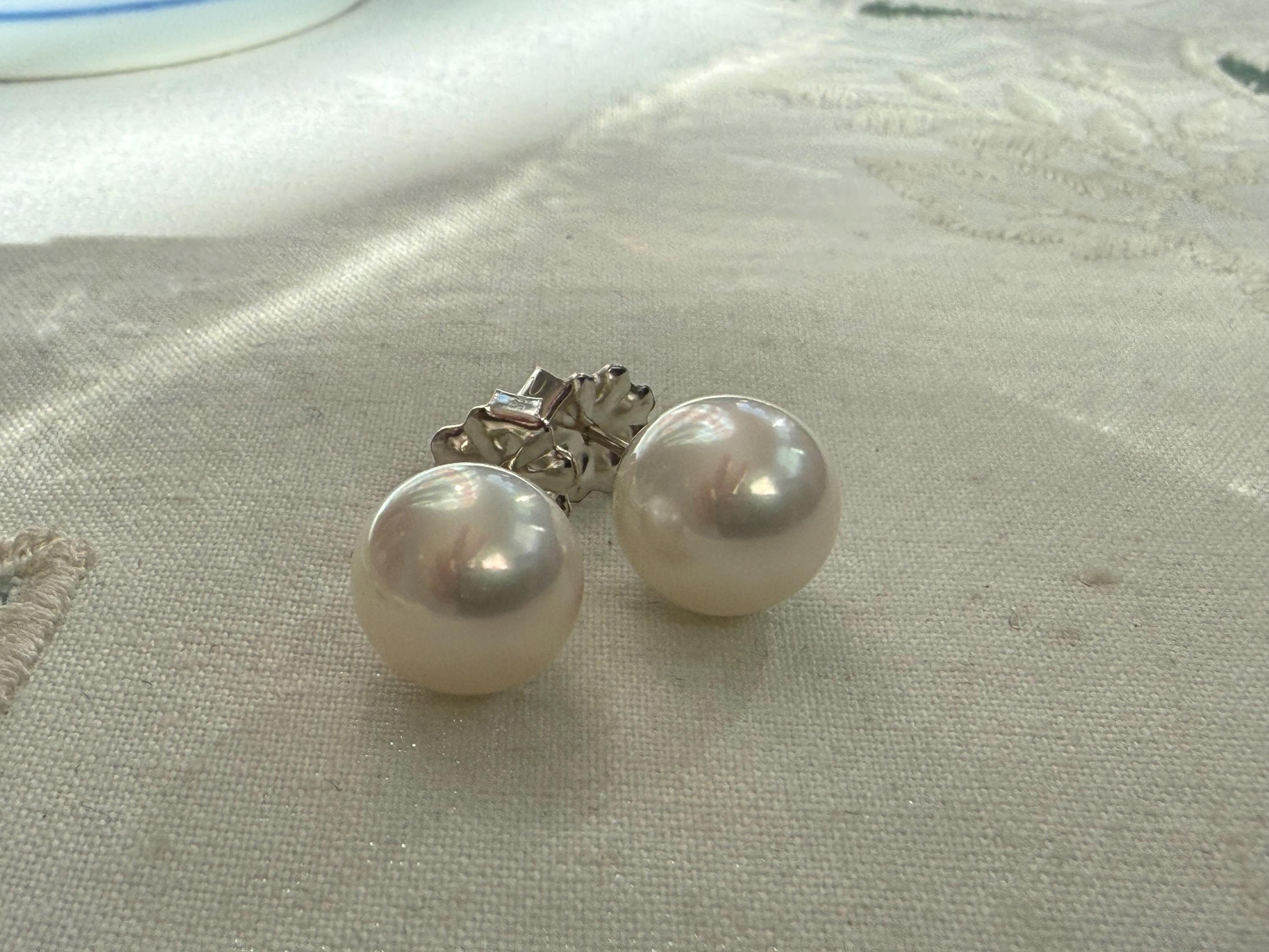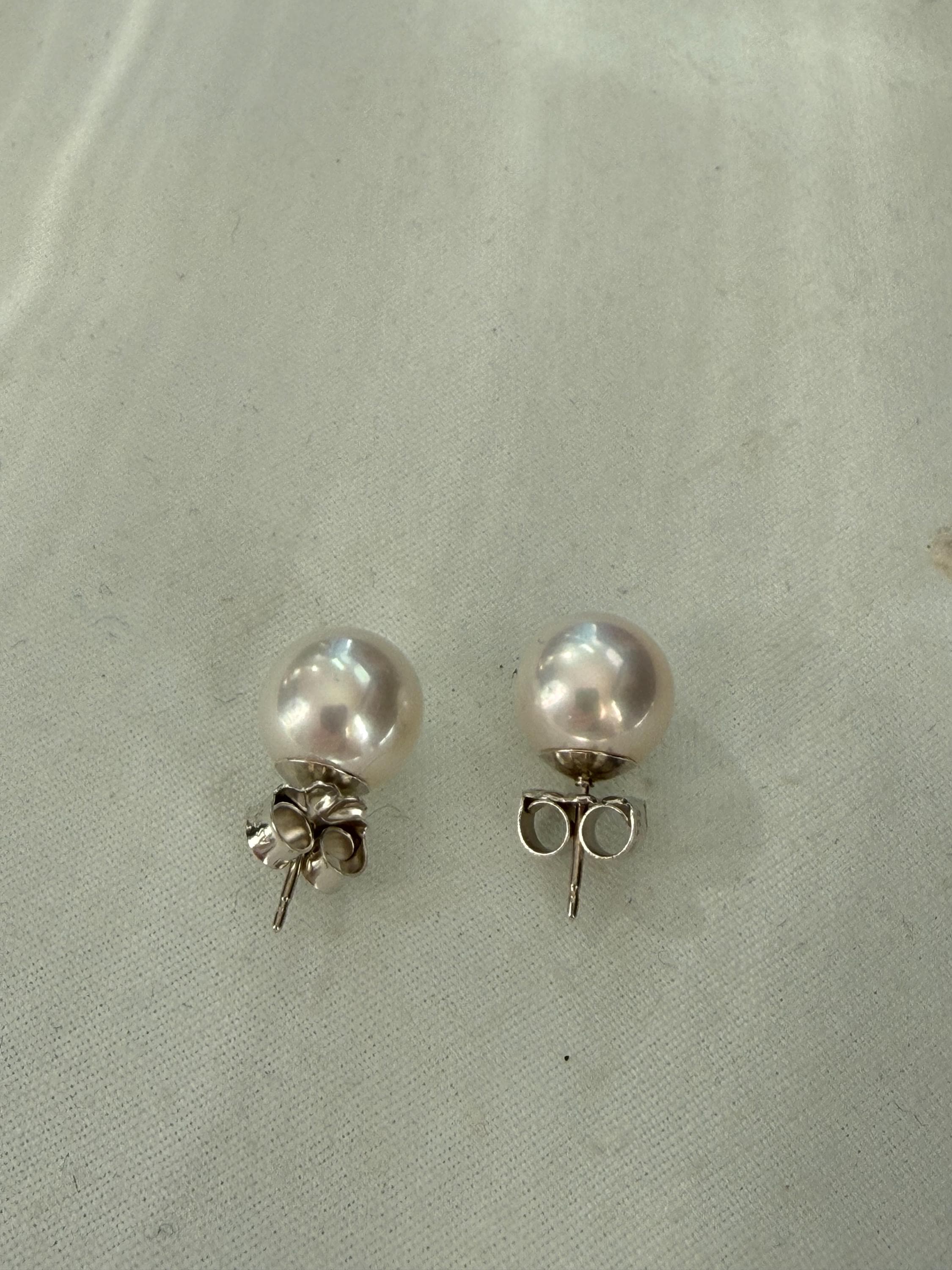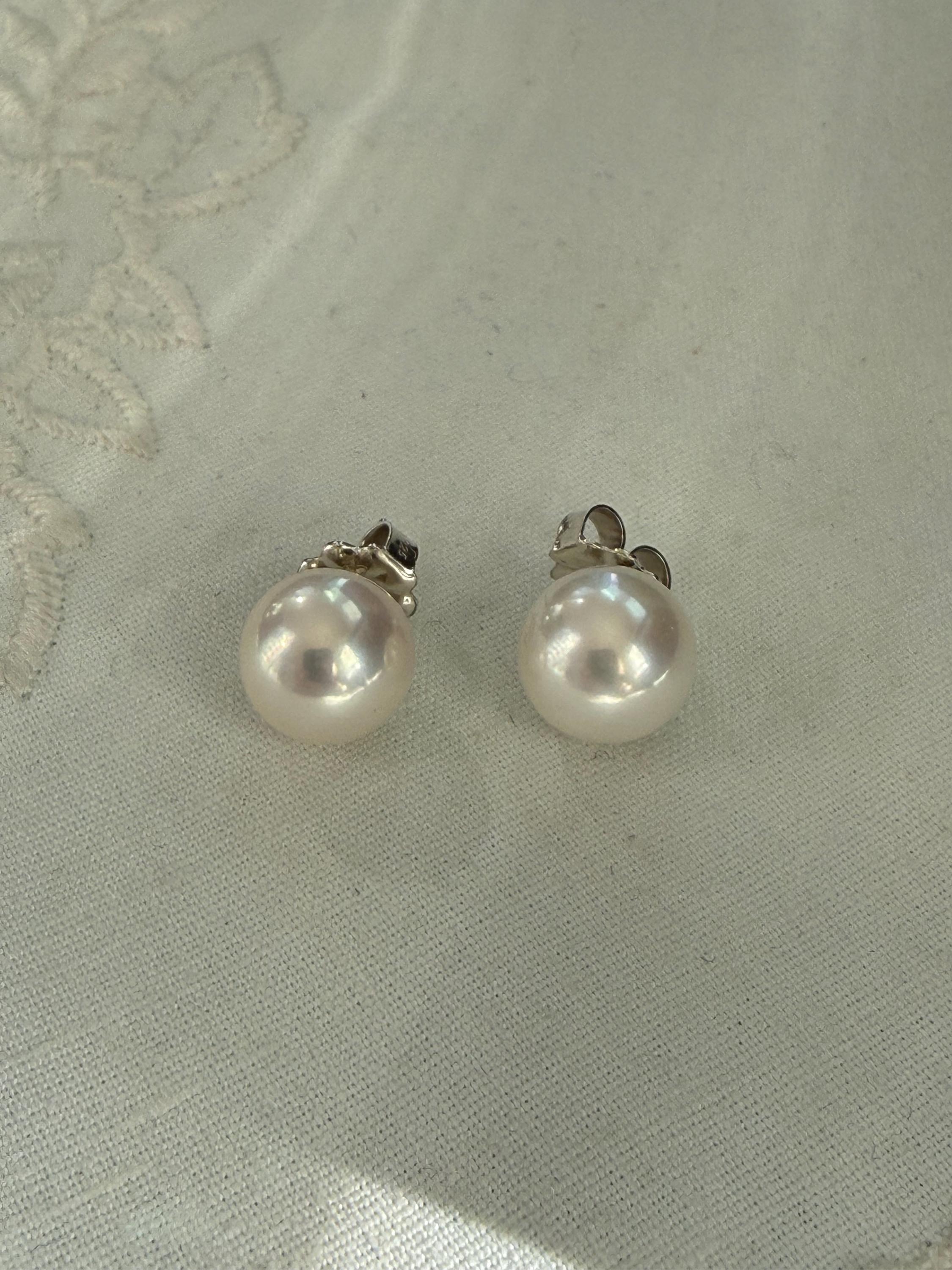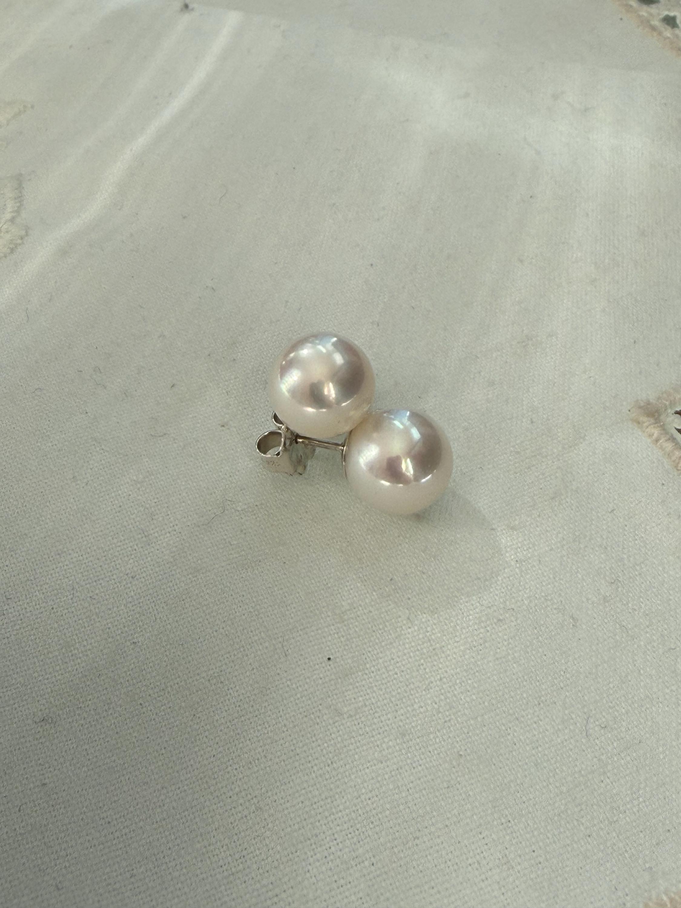 Simple, elegant, and so easy to wear! Cultured freshwater pearl studs are a classic for a reason: they simply go with everything! This gorgeous pair of round 10/10.2 mm white freshwater cultured pearl earrings are mounted in sterling silver with large butterfly backs. The pearls have a creamy white color with very sharp luster and minimal blemishing (hidden under the post). Their size is perfect for those who prefer a simple everyday earring. These are for pierced ears only.