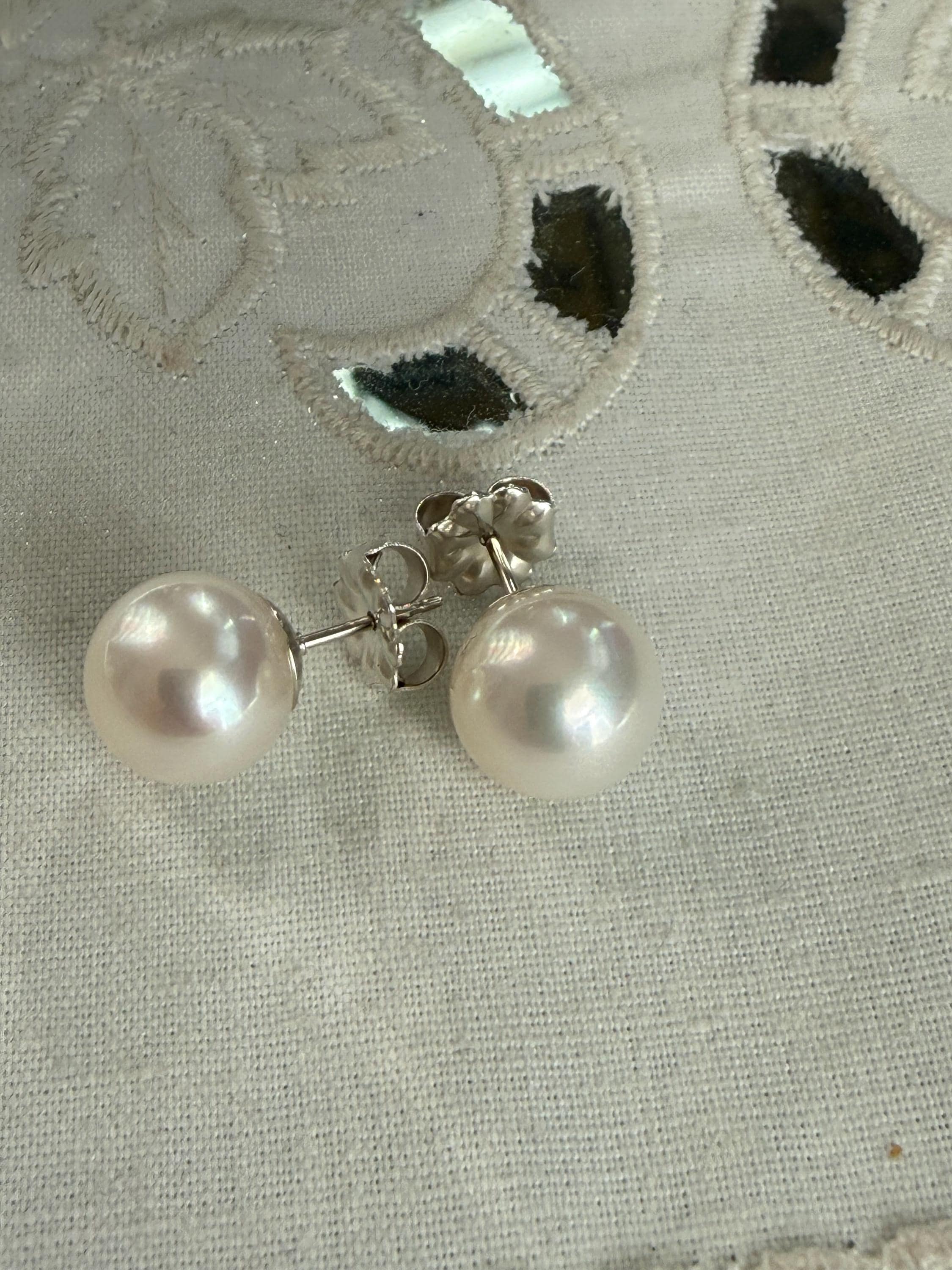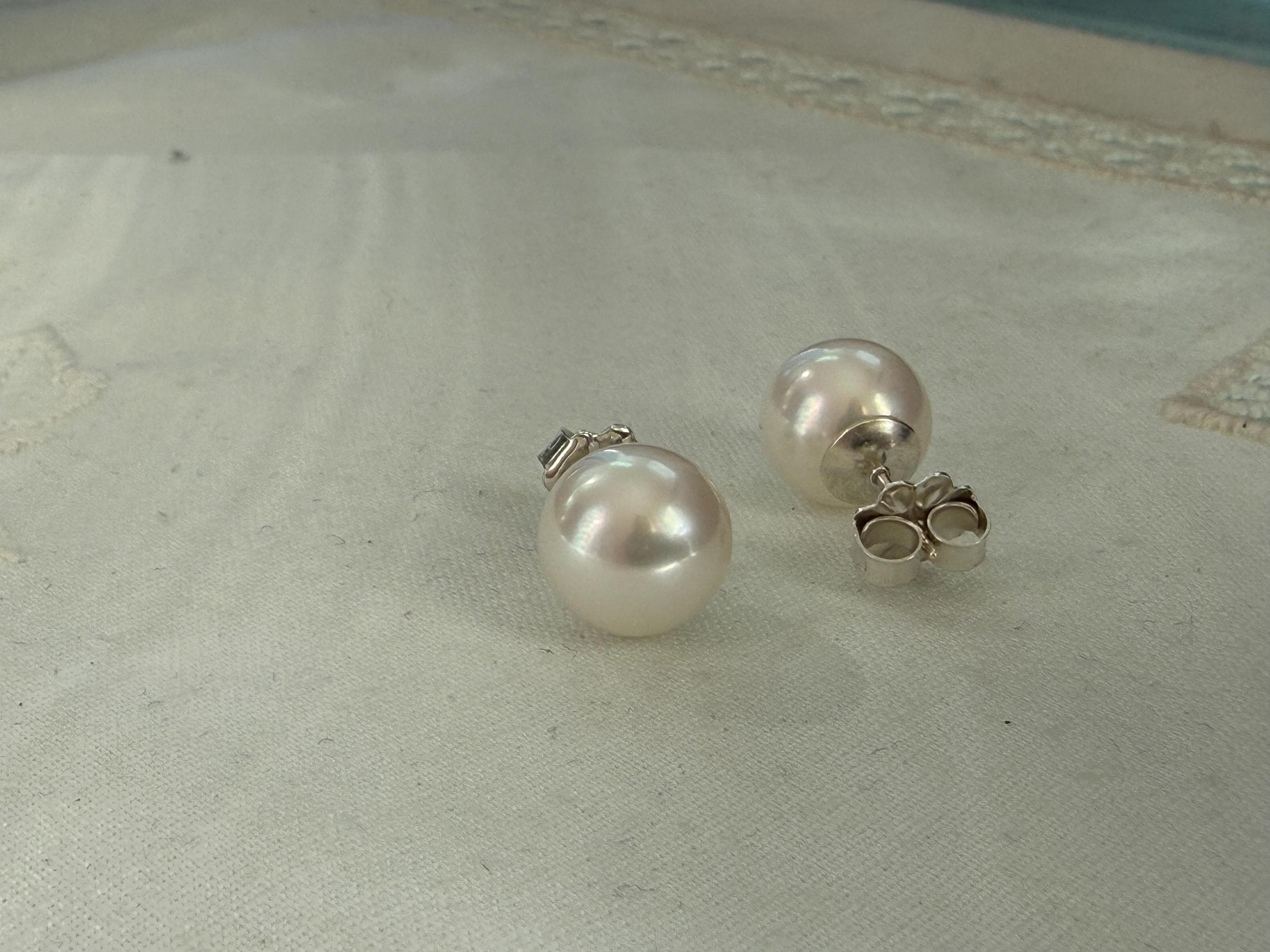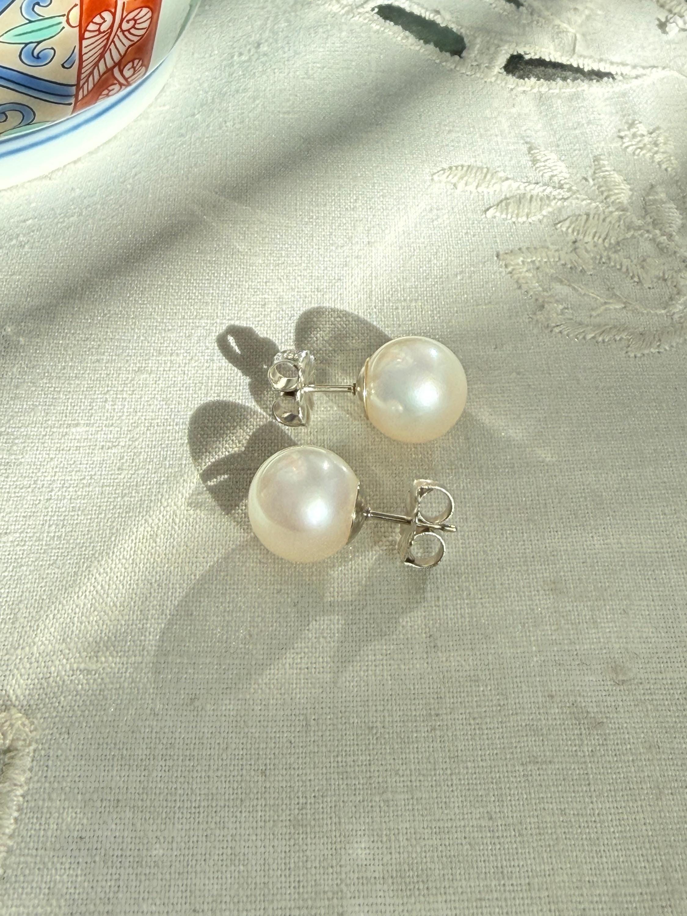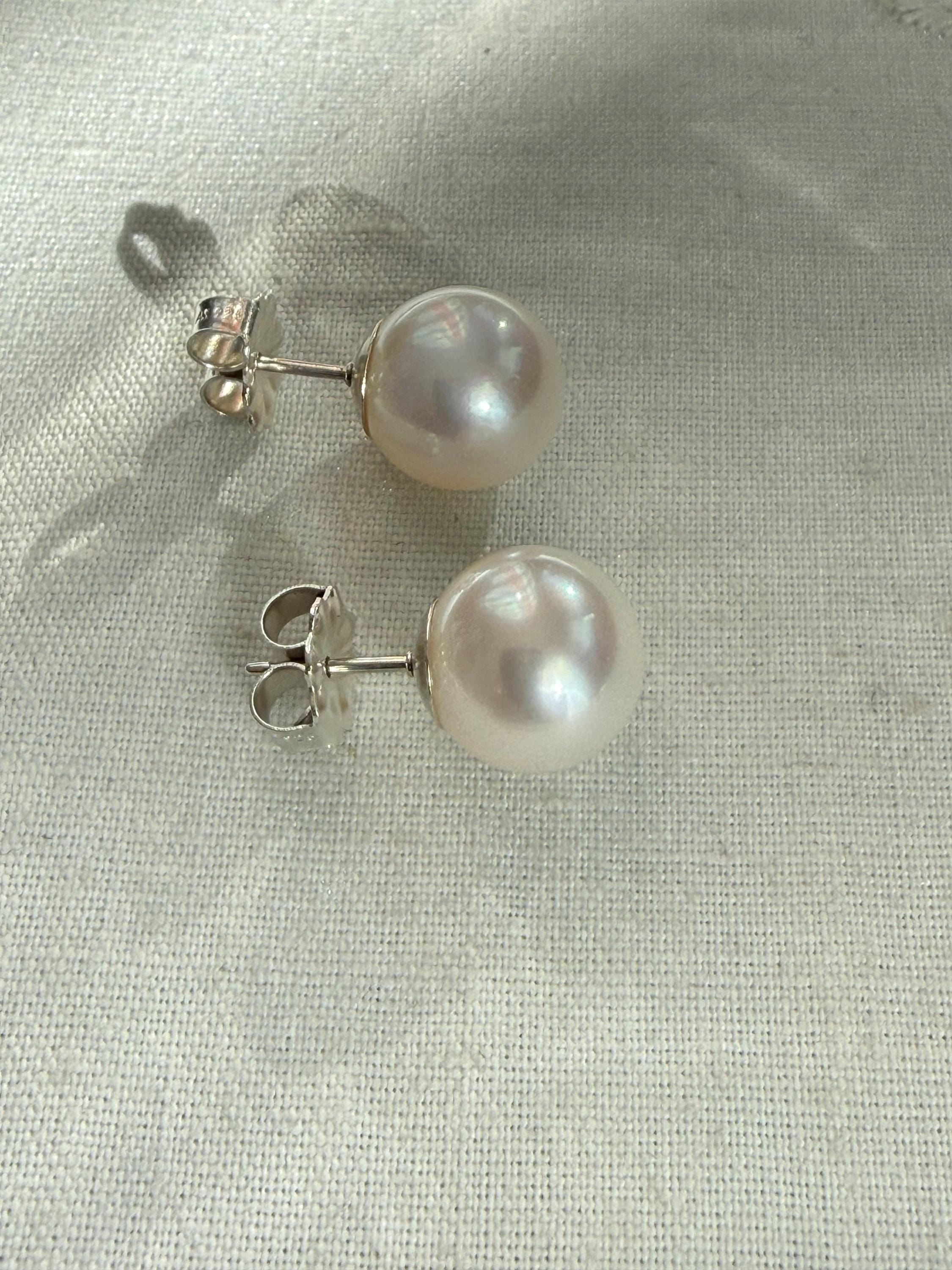 Simple, elegant, and so easy to wear! Cultured freshwater pearl studs are a classic for a reason: they simply go with everything! This gorgeous pair of round 10.2/10.3mm white freshwater cultured pearl earrings are mounted in sterling silver with large butterfly backs. The pearls have a creamy white color with very sharp luster and minimal blemishing (hidden under the post). Their size is perfect for those who prefer a simple everyday earring. These are for pierced ears only.