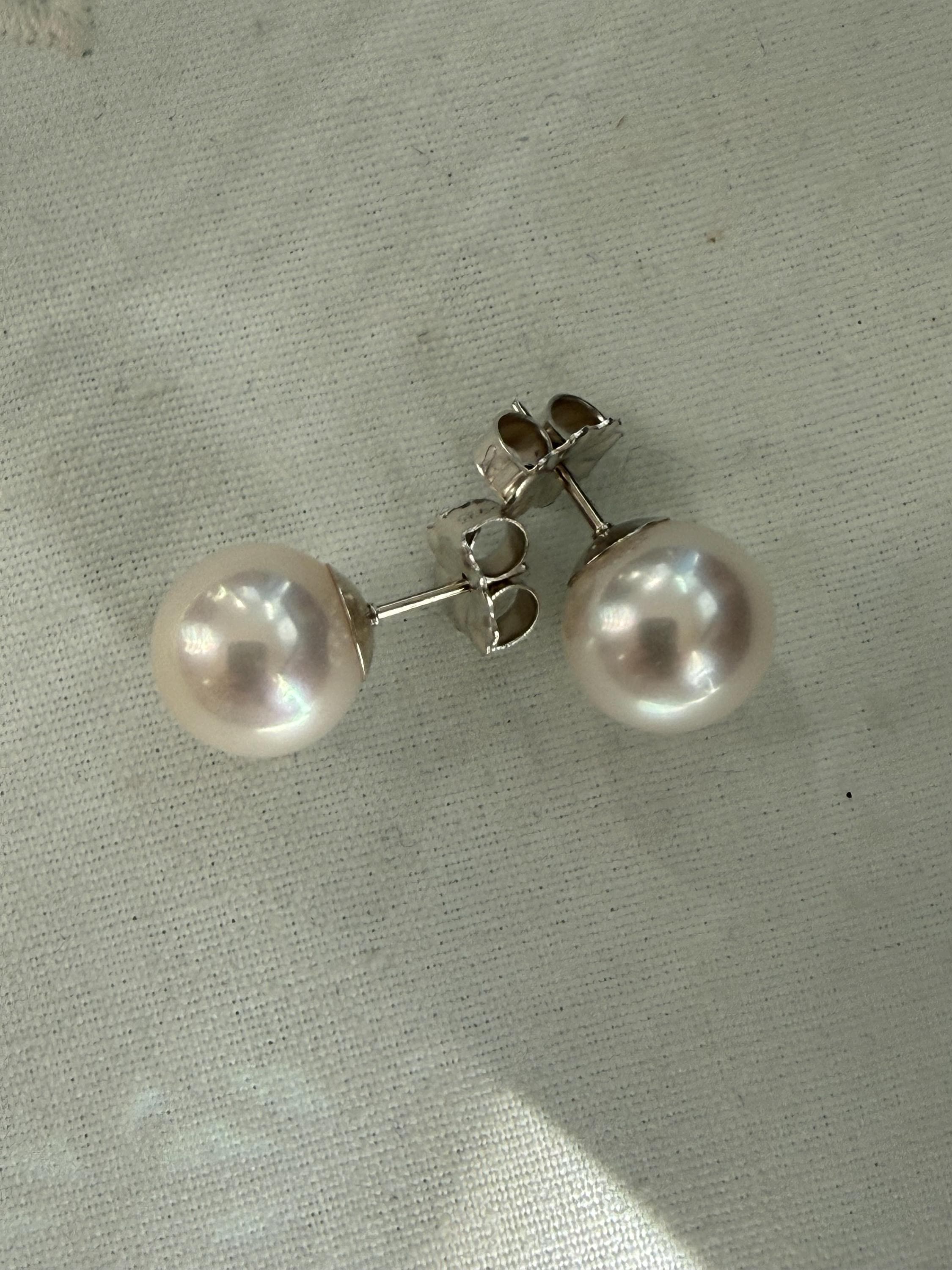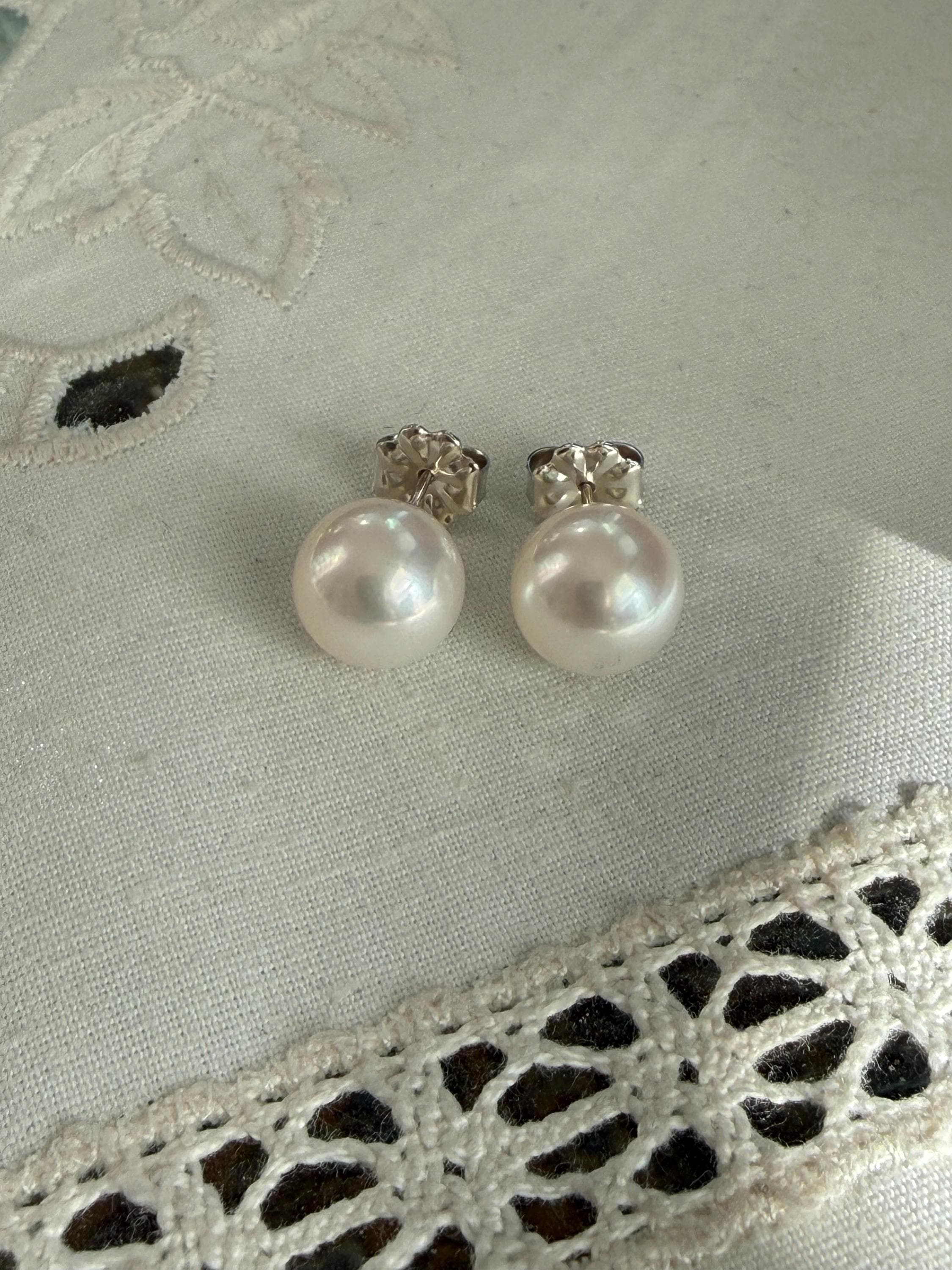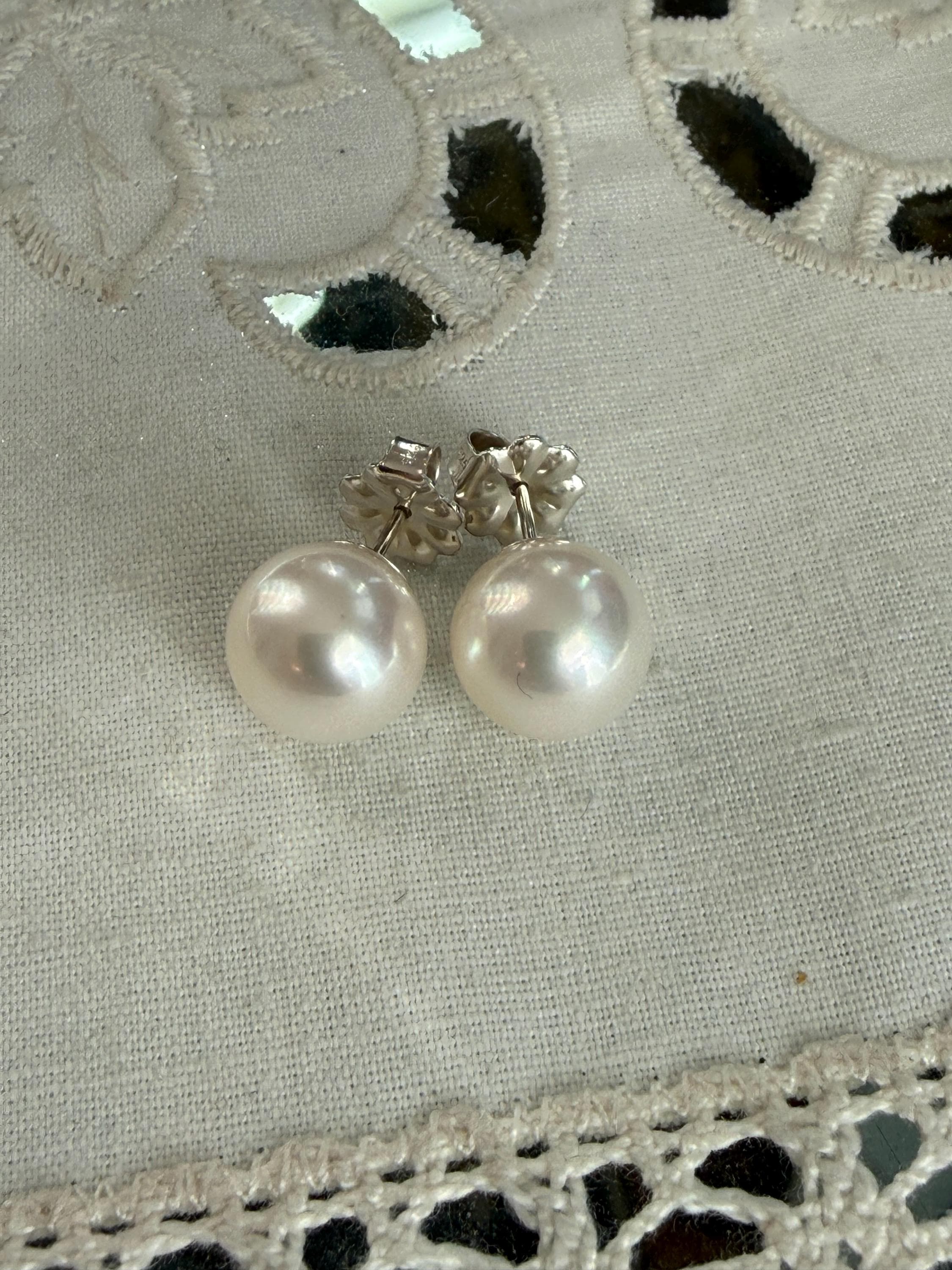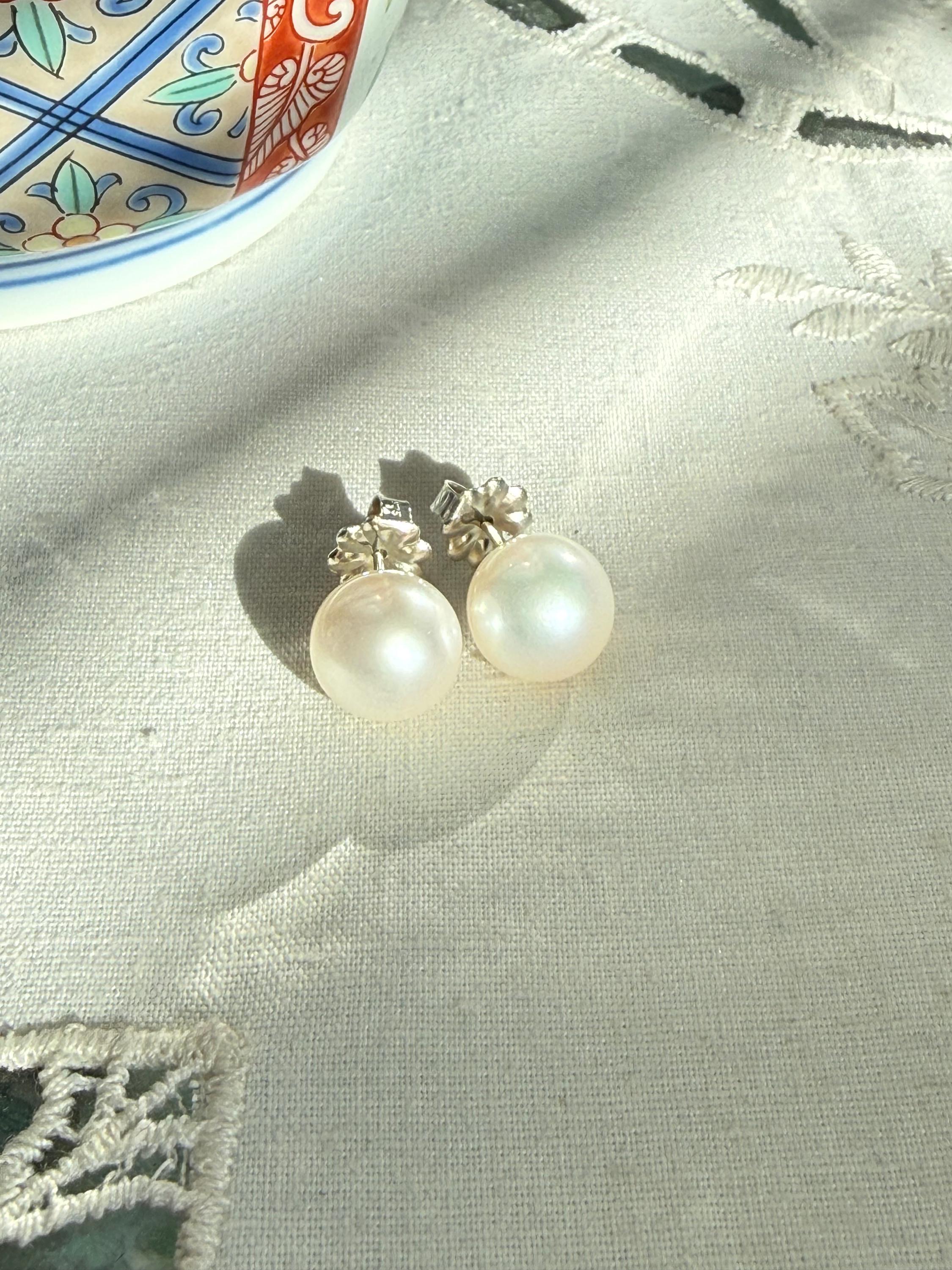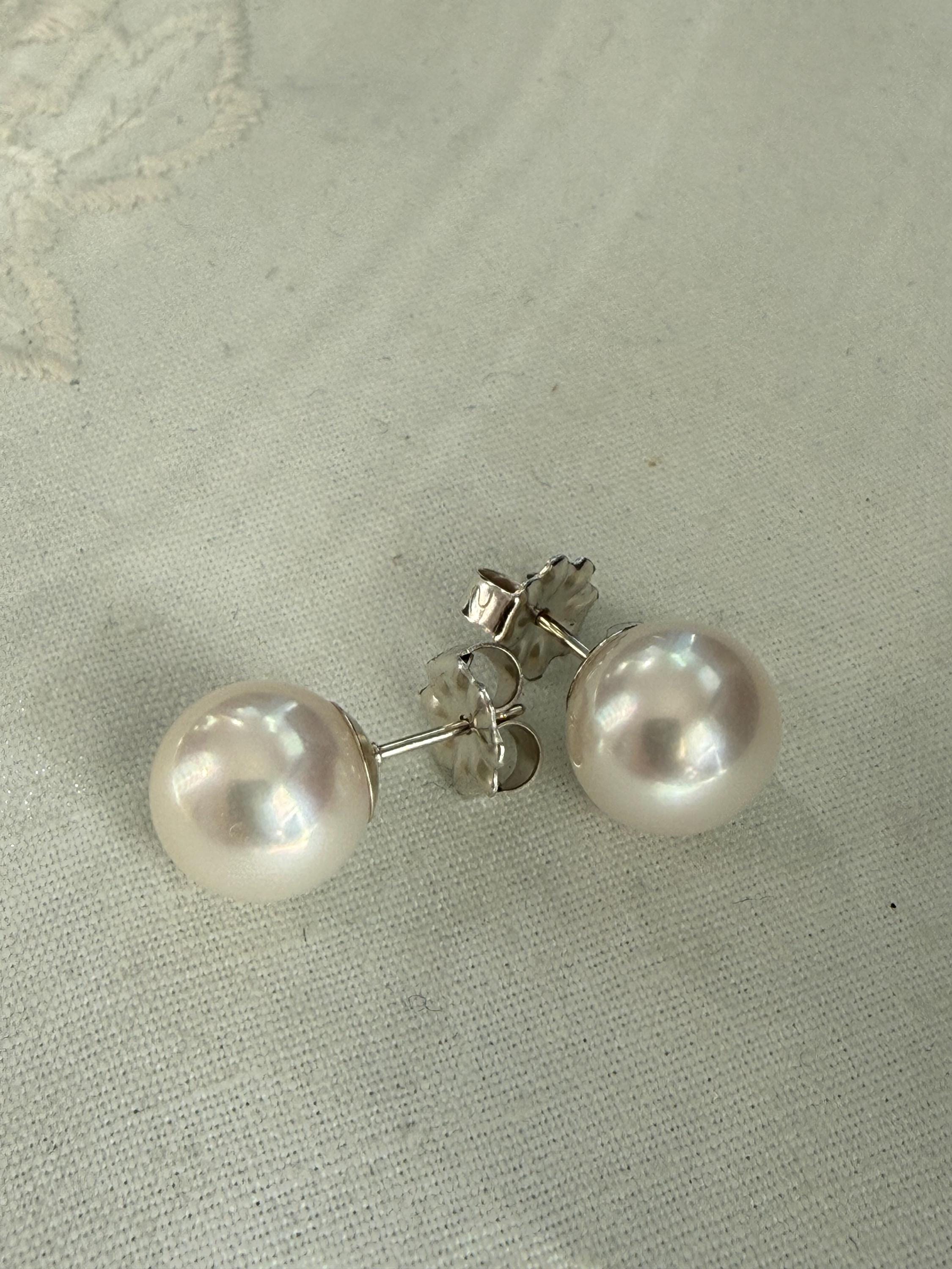 Simple, elegant, and so easy to wear! Cultured freshwater pearl studs are a classic for a reason: they simply go with everything! This gorgeous pair of round 10.2/10.3mm white freshwater cultured pearl earrings are mounted in sterling silver with large butterfly backs. The pearls have a creamy white color with very sharp luster and minimal blemishing (hidden under the post). Their size is perfect for those who prefer a simple everyday earring. These are for pierced ears only.