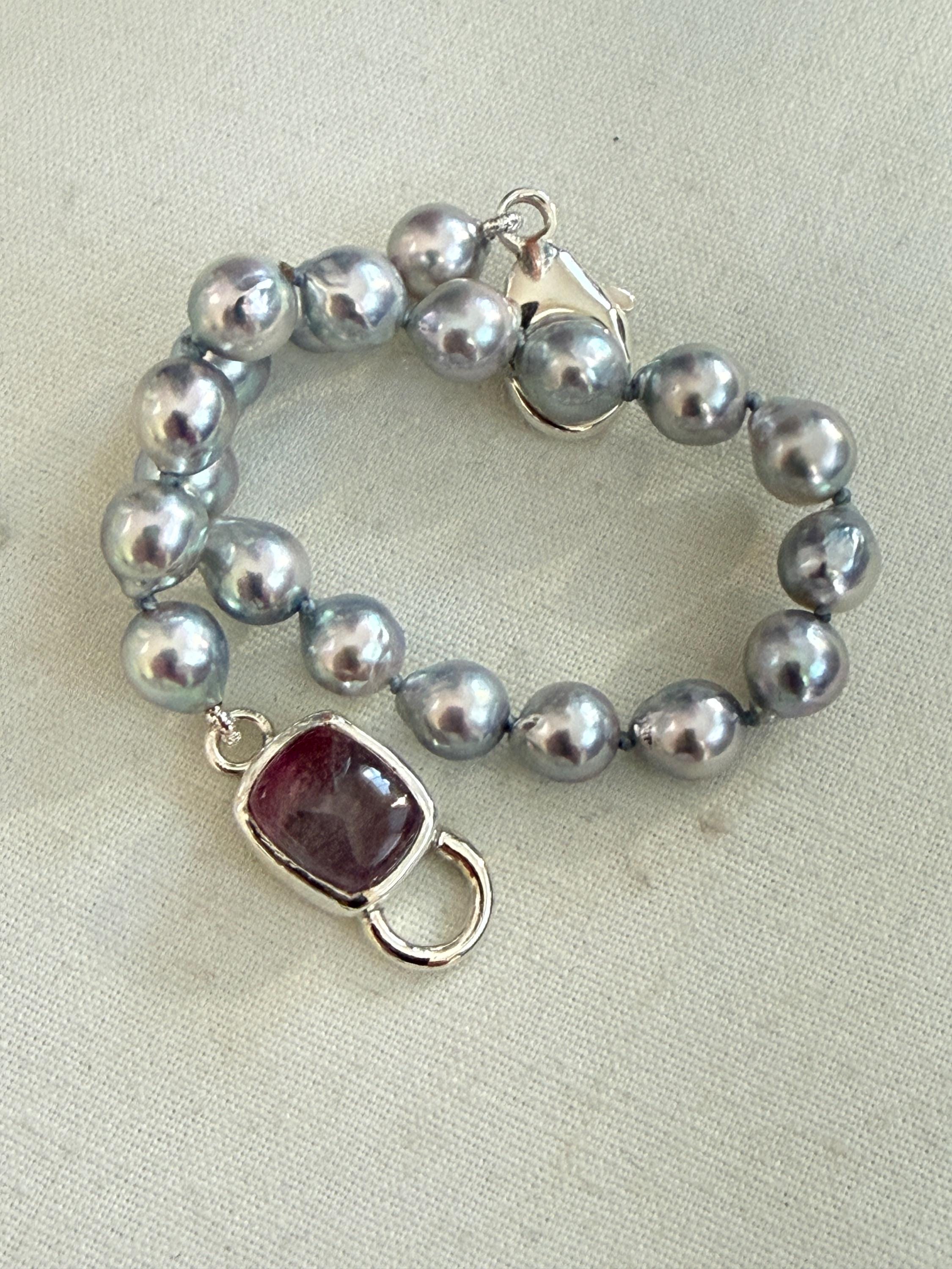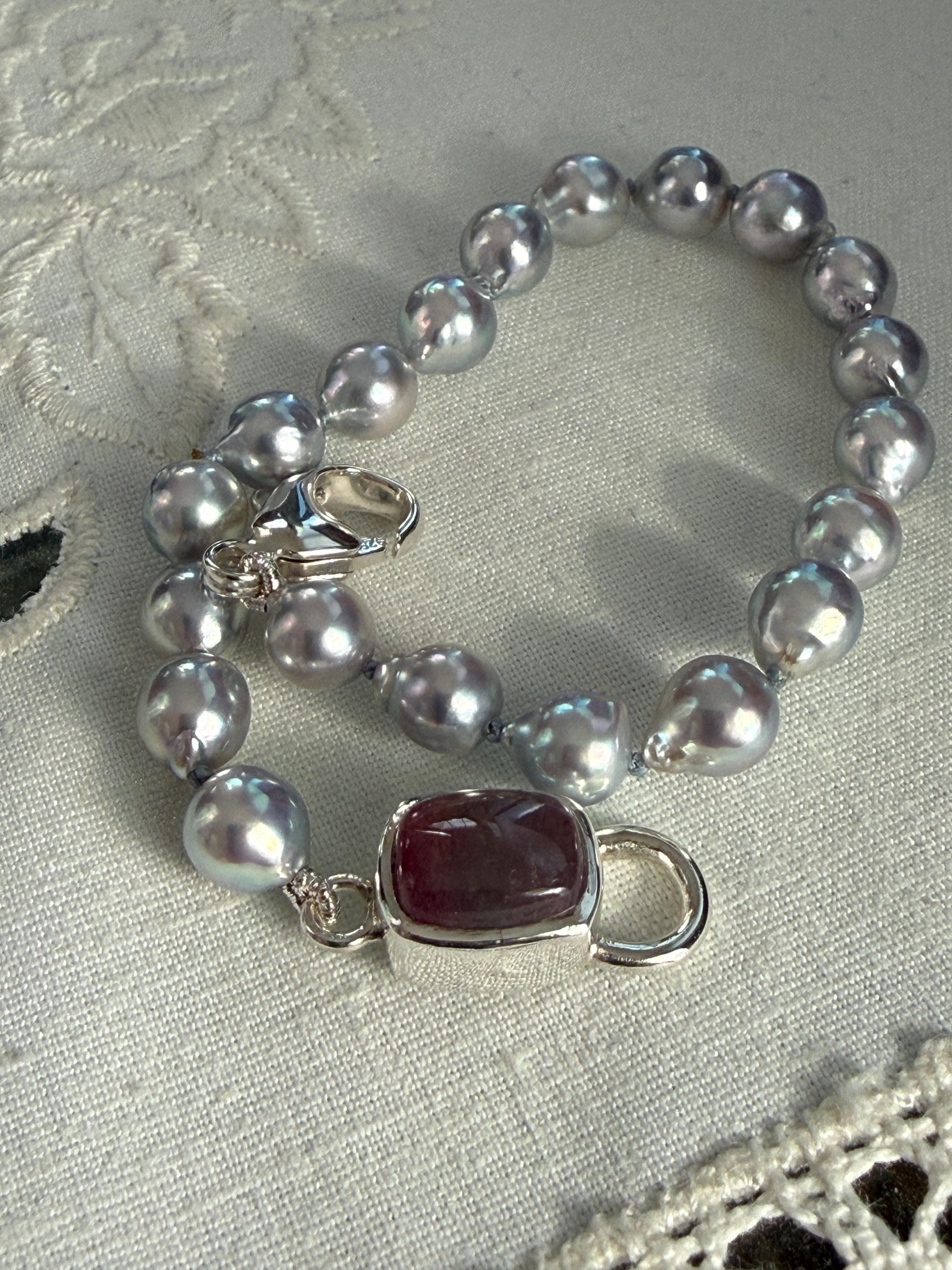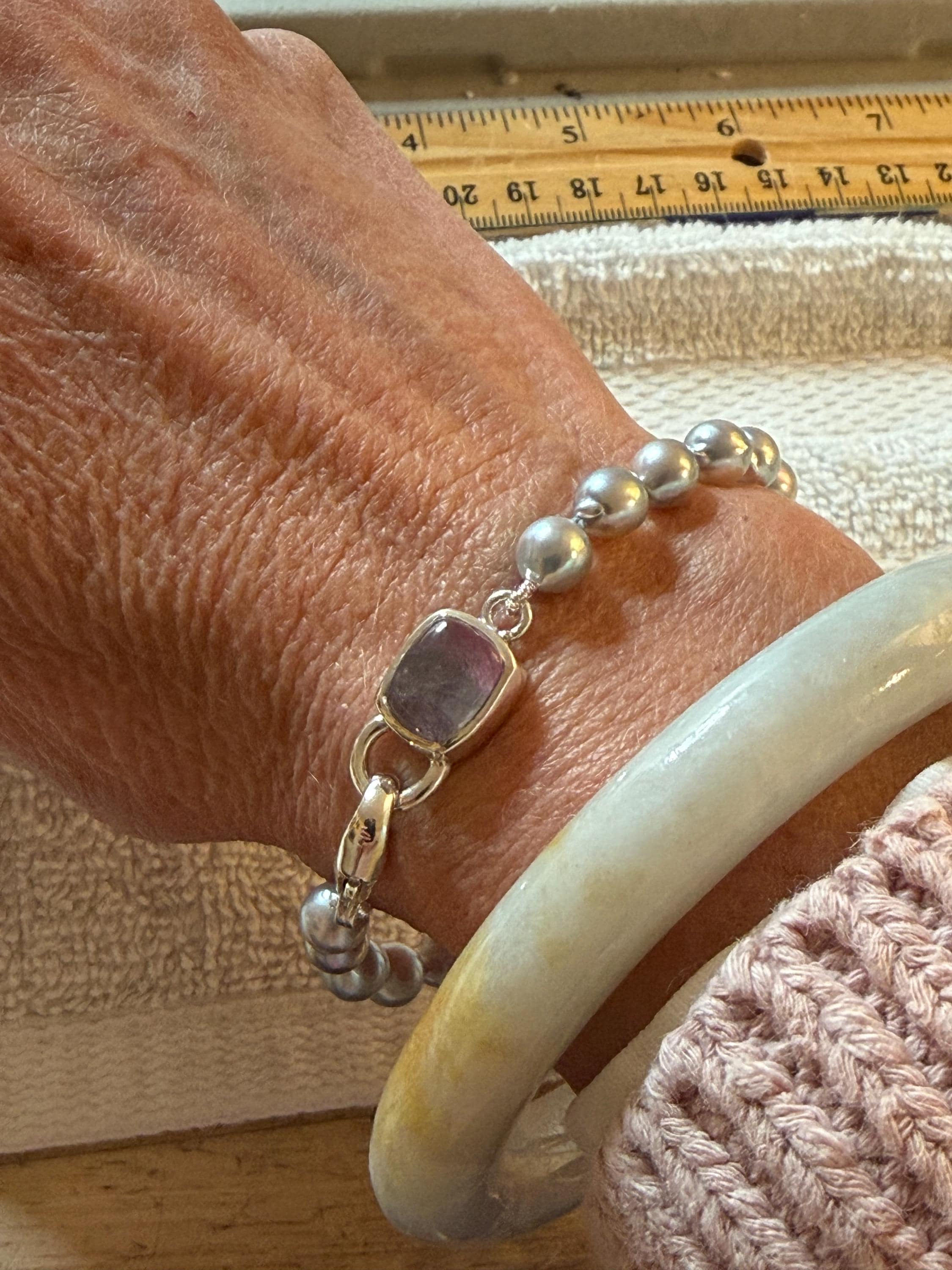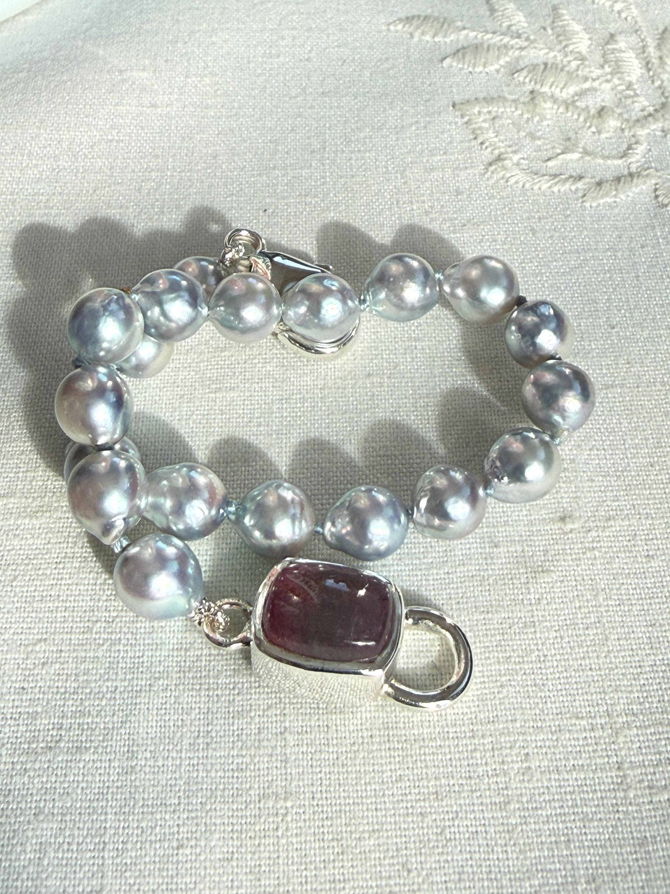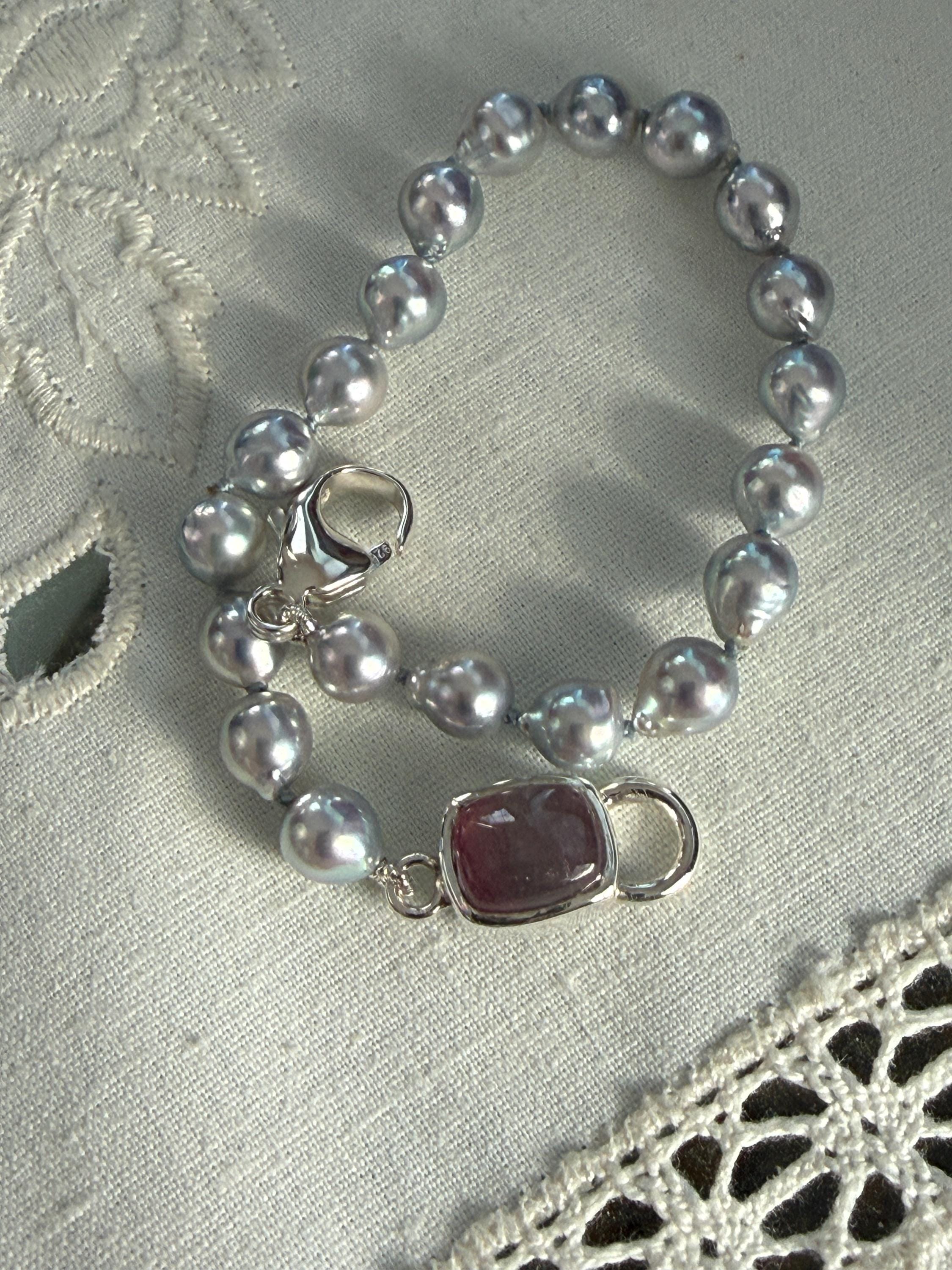 This is a bracelet for collectors! I have just this one Japanese baroque silvery blue akoya cultured pearl bracelet with amazing rose overtones and sharp luster that coordinate beautifully with the cushion shaped bi-color tourmaline cabochon. The pearls measure about 6mm and they have irregular shapes, with somewhat rippled surfaces and very very minor blemishing. The strand is a pastel silvery blue with strong pink overtones. The strand measures about 7.25 inches long and the pearls are fairly uniform in size throughout the strand. The cultured pearls are not dyed. I've set them with a stunning bezel set cabochon blue and pink bi-color tourmaline (stone is 10mmx8mm) at the lobster clasp set. There are visible inclusions in the stone, however, they do not take away from the overall beauty of this piece. I made this setting completely by hand, to fit this stone, truly making this a one of a kind bracelet. This is the actual bracelet you will receive. This bracelet measures about 7.25 inches and should fit a small/smaller-medium sized wrist. If you need more length, can make this a little bit longer for an additional fee (please reach out prior to purchasing for a price quote).