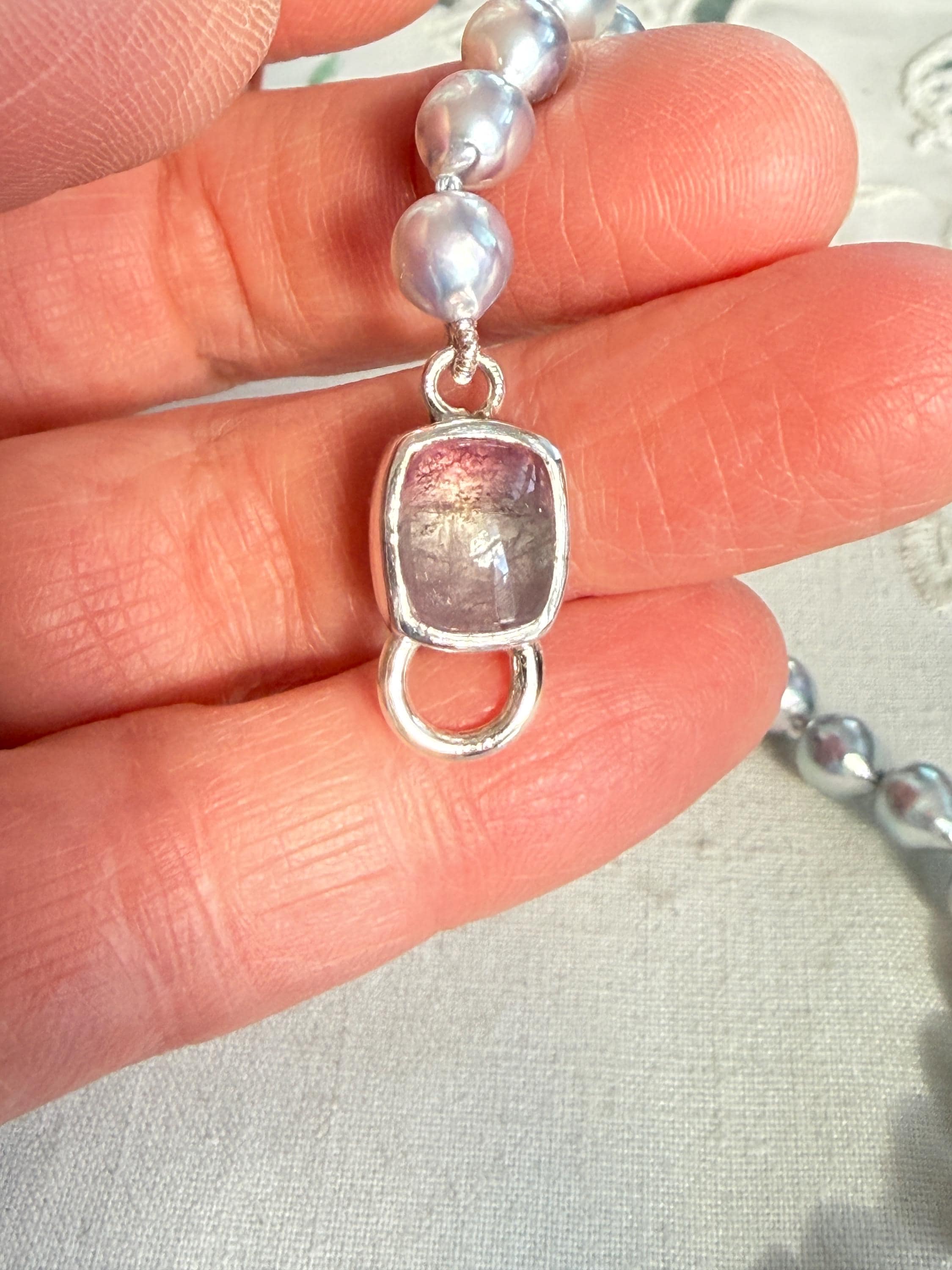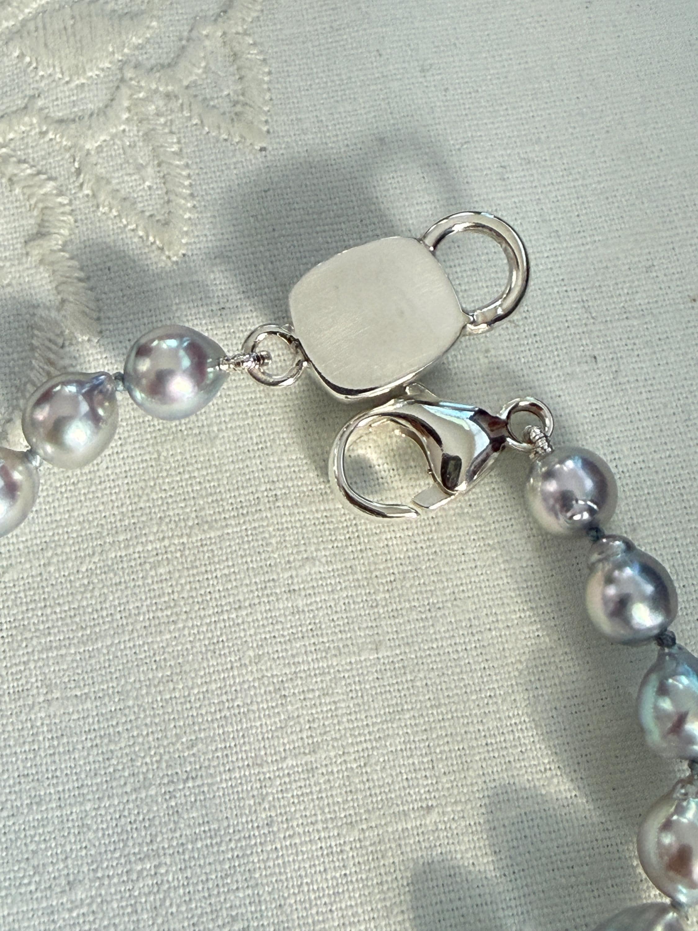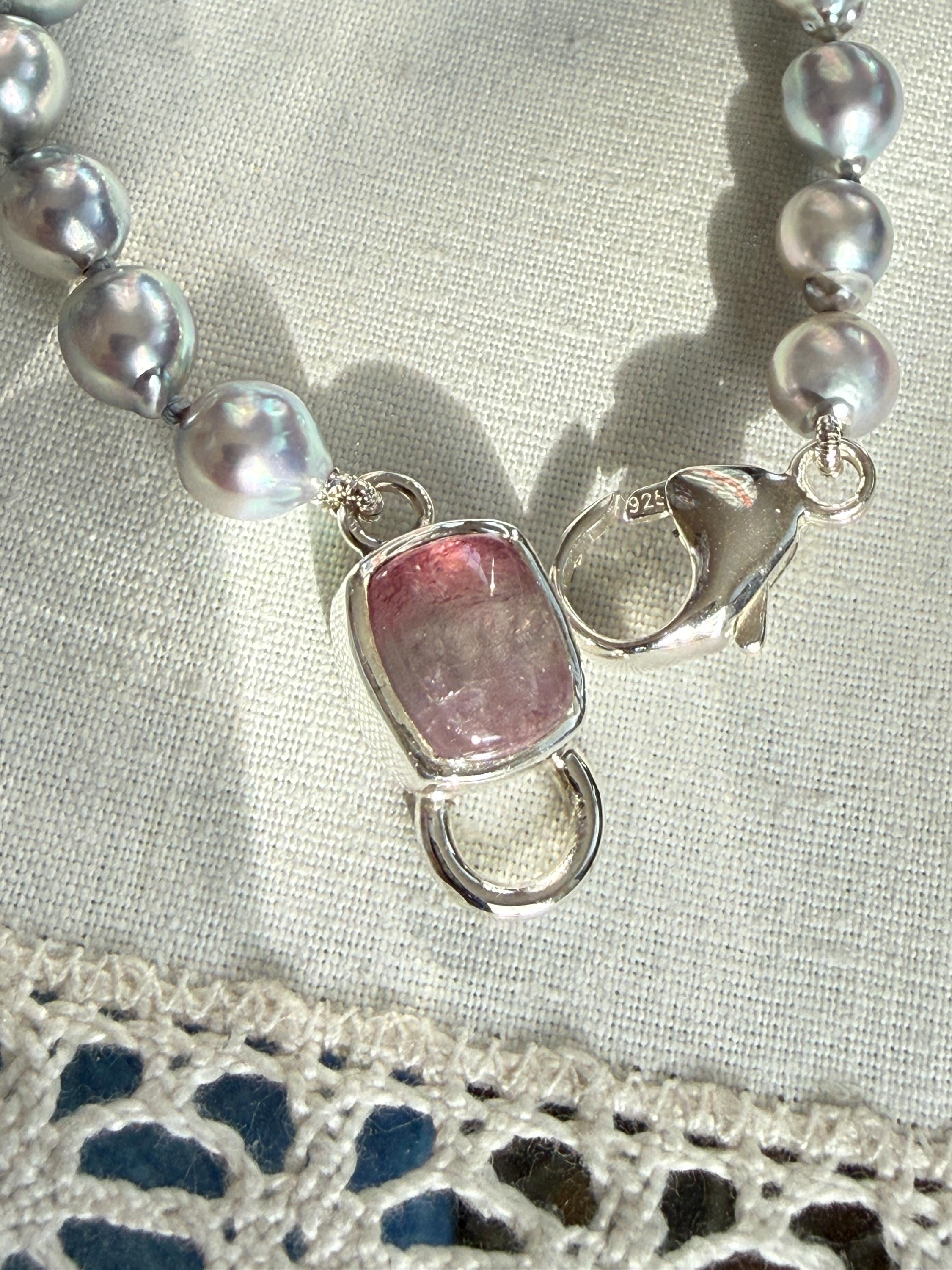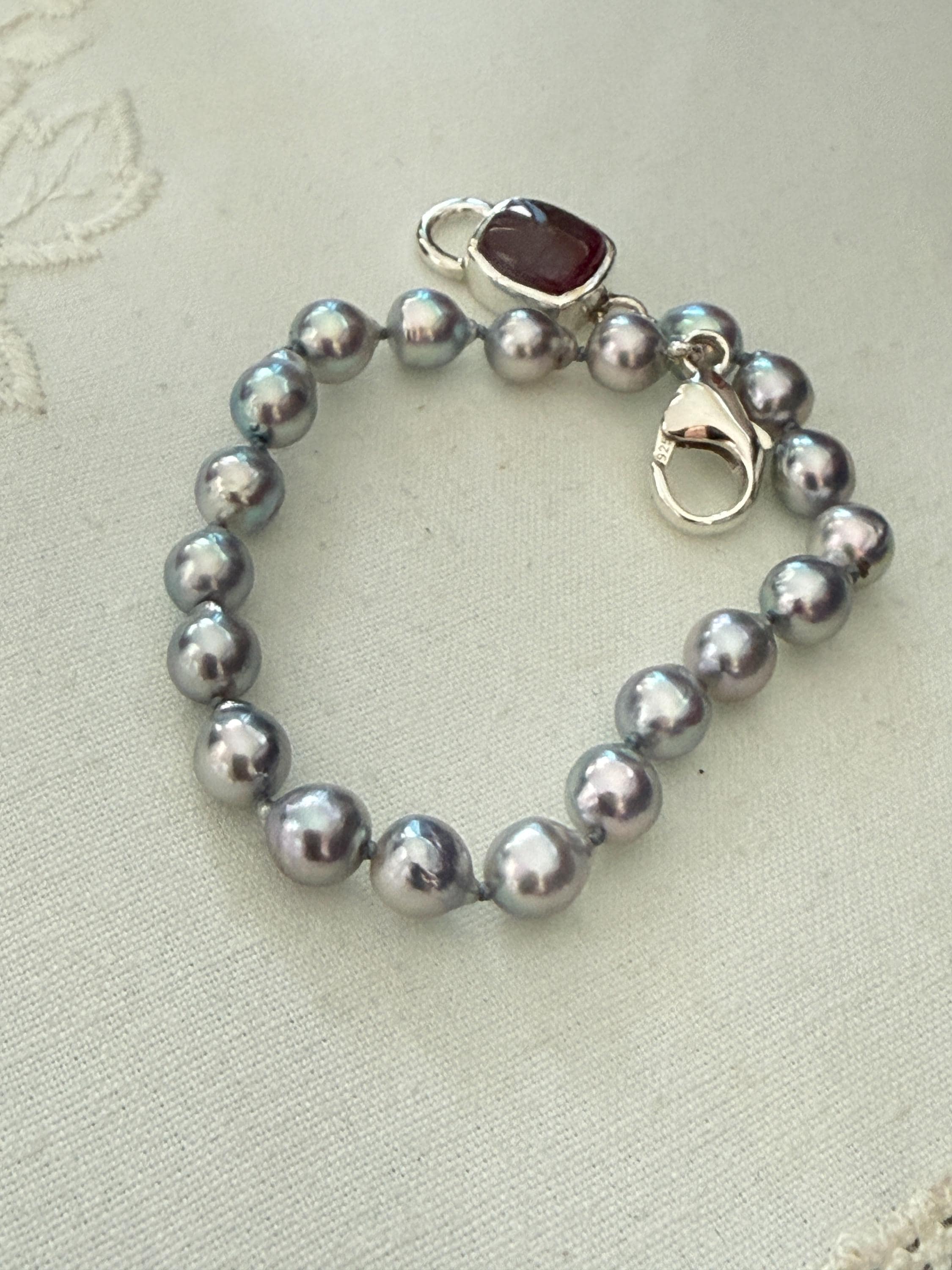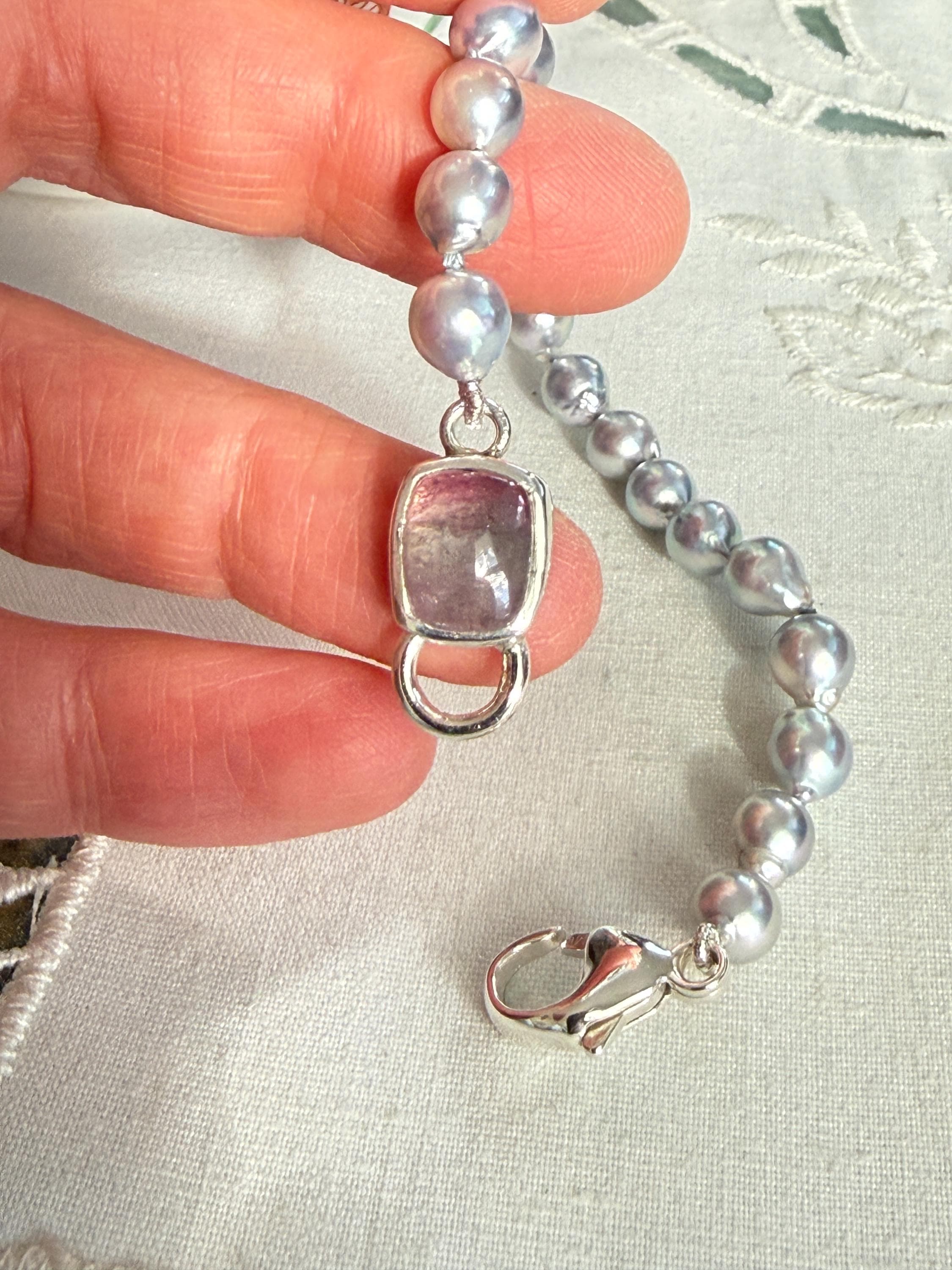 This is a bracelet for collectors! I have just this one Japanese baroque silvery blue akoya cultured pearl bracelet with amazing rose overtones and sharp luster that coordinate beautifully with the cushion shaped bi-color tourmaline cabochon. The pearls measure about 6mm and they have irregular shapes, with somewhat rippled surfaces and very very minor blemishing. The strand is a pastel silvery blue with strong pink overtones. The strand measures about 7.25 inches long and the pearls are fairly uniform in size throughout the strand. The cultured pearls are not dyed. I've set them with a stunning bezel set cabochon blue and pink bi-color tourmaline (stone is 10mmx8mm) at the lobster clasp set. There are visible inclusions in the stone, however, they do not take away from the overall beauty of this piece. I made this setting completely by hand, to fit this stone, truly making this a one of a kind bracelet. This is the actual bracelet you will receive. This bracelet measures about 7.25 inches and should fit a small/smaller-medium sized wrist. If you need more length, can make this a little bit longer for an additional fee (please reach out prior to purchasing for a price quote).