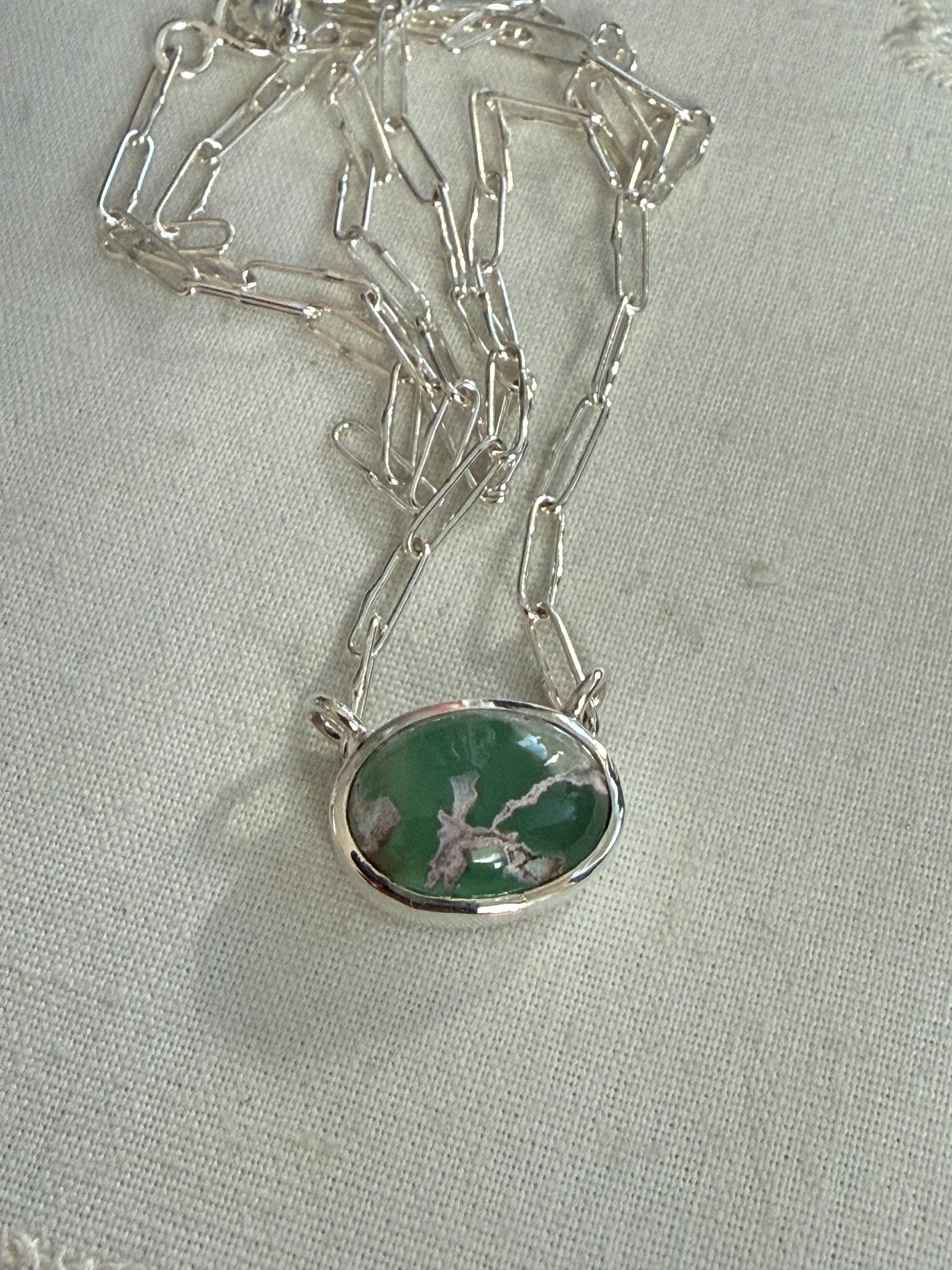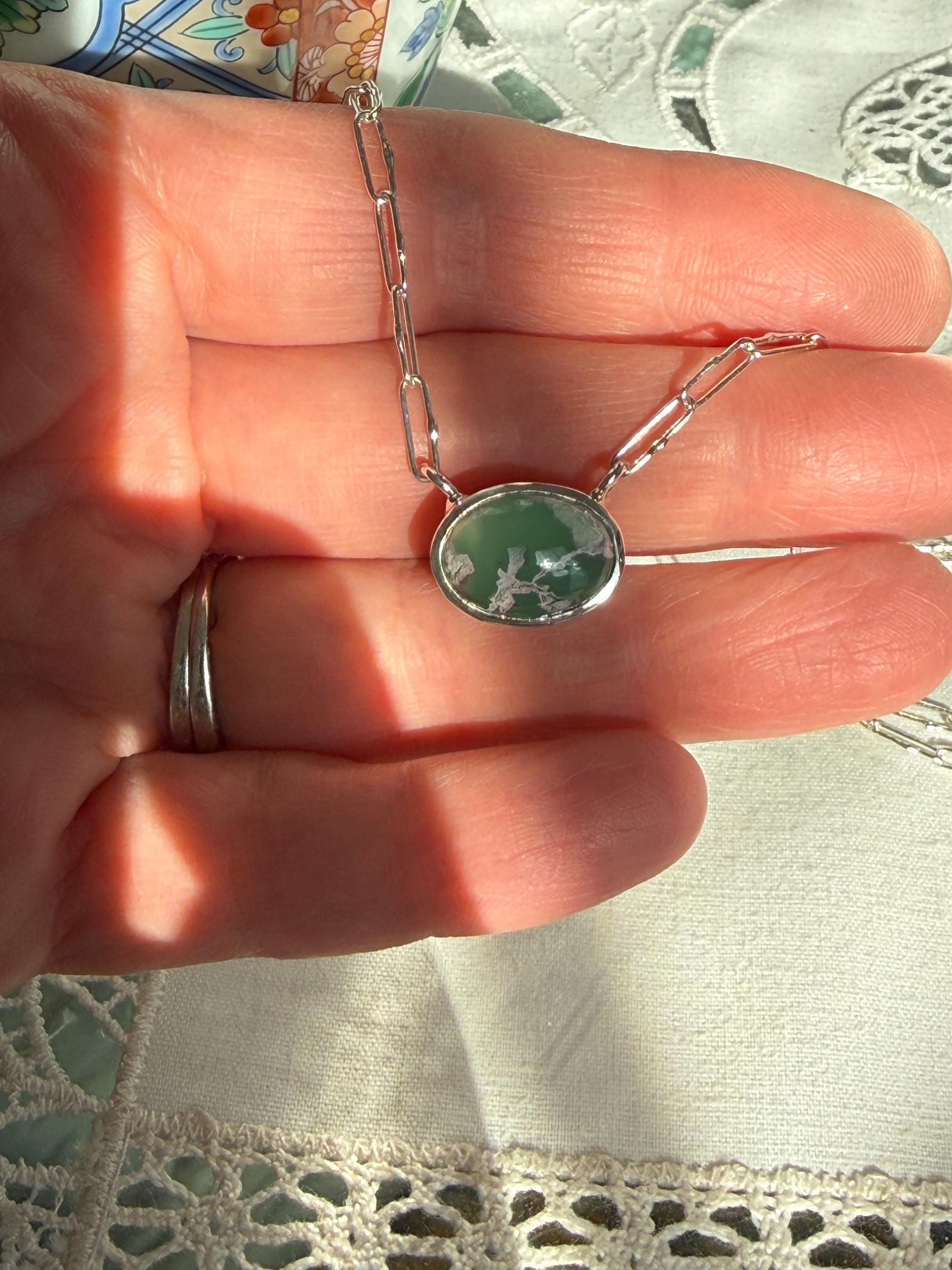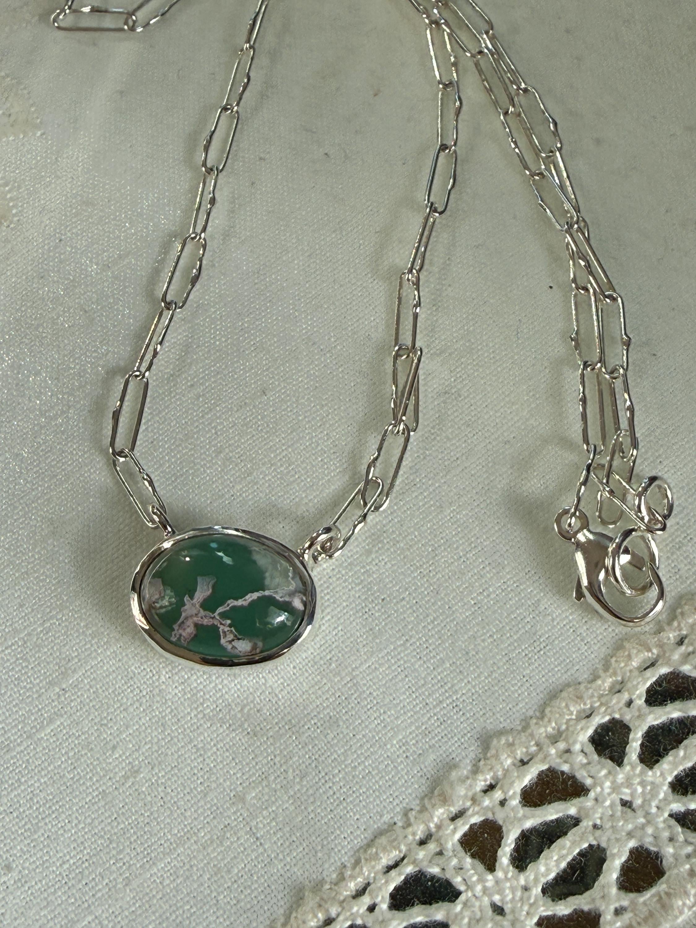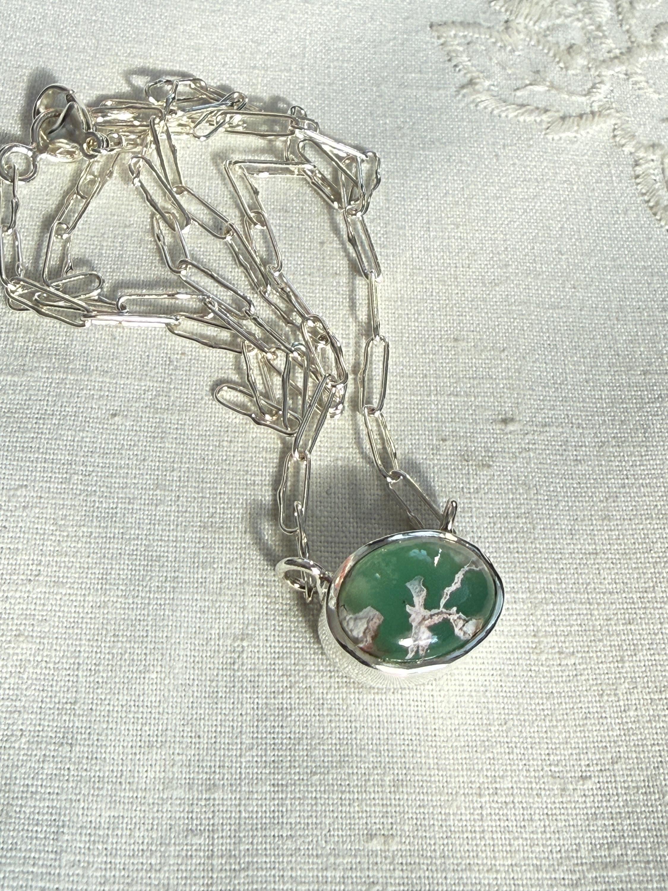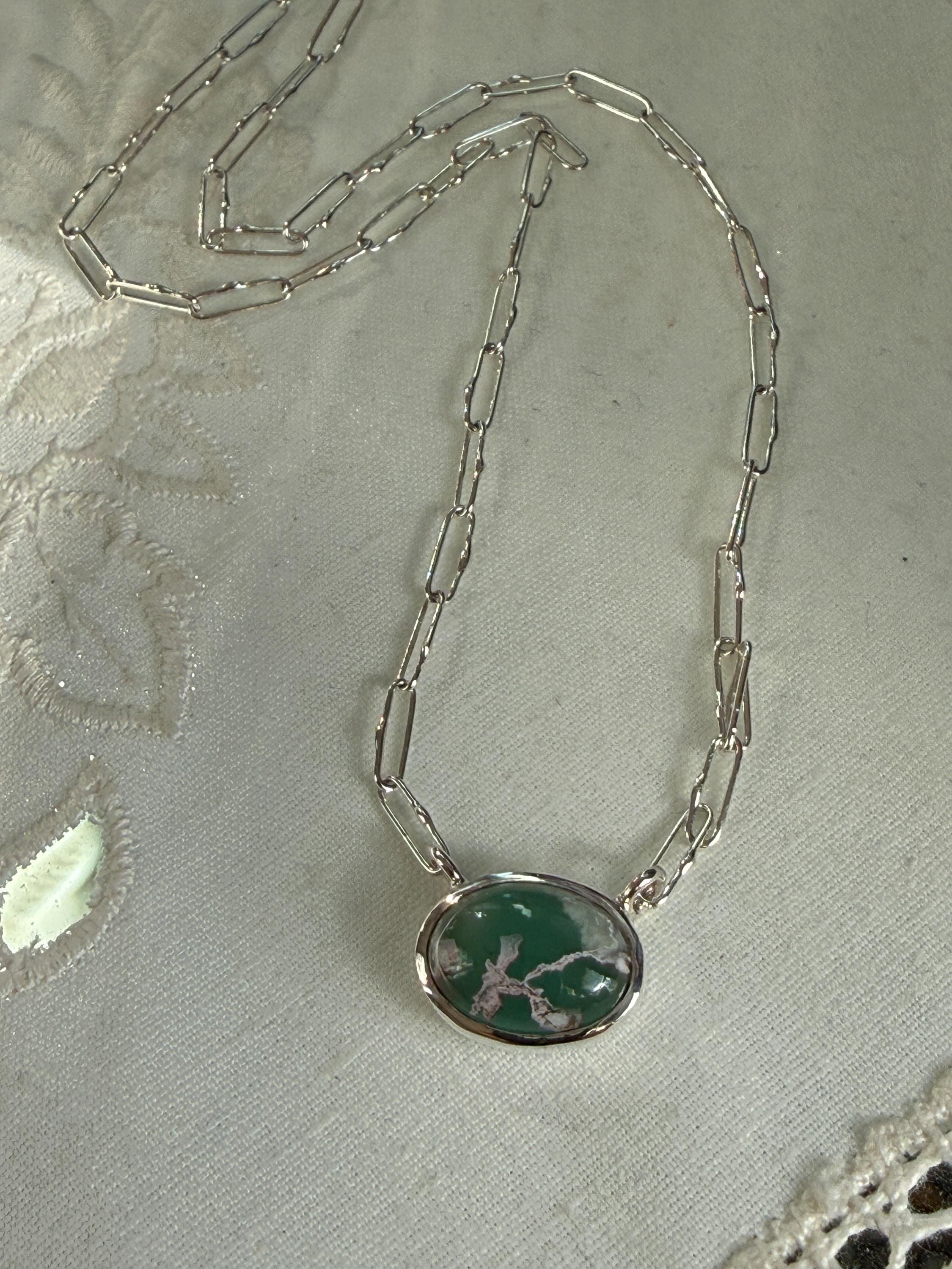 A beautiful green aquaprase with really cool matrix! This luscious oval aquaprase cabochon bezel is set in fine silver and attached to a small Funky Link chain in sterling silver. The necklace is about 18 inches long and is finished with a lobster clasp. I make these chains completely by hand, one link at a time (the lobster clasp is machine made). The cabochon cut stone measures approximately 14x10 mm, and has green coloring with distinctive white with brown matrix. To my eye, I see the letter K with a heart in the matrix. The bezel setting is made of fine silver and hand fabricated to fit the stone. The back of the setting is closed and it is permanently attached to the chain. The necklace is adjustable since the lobster clasp can be used on any of the links.