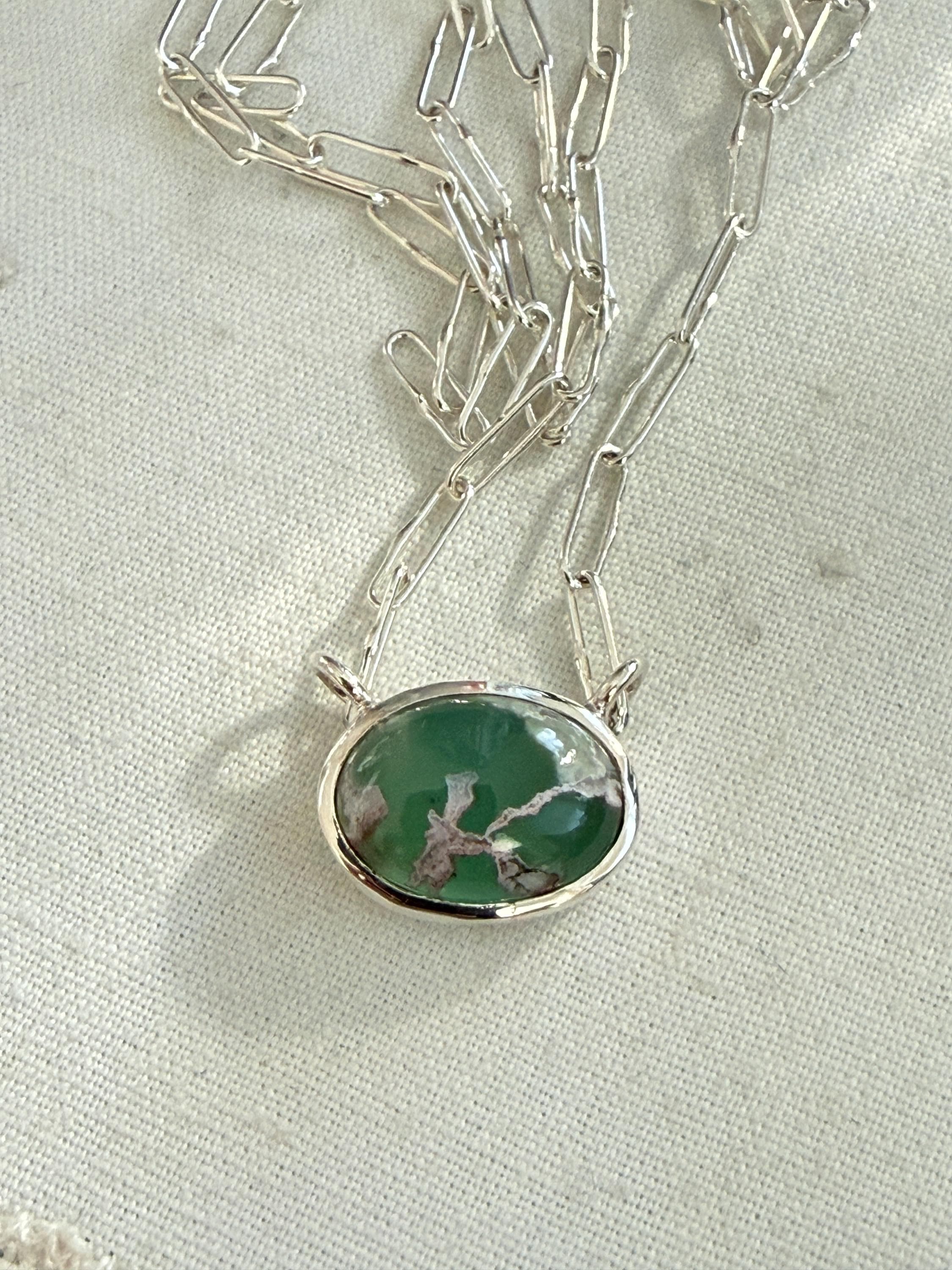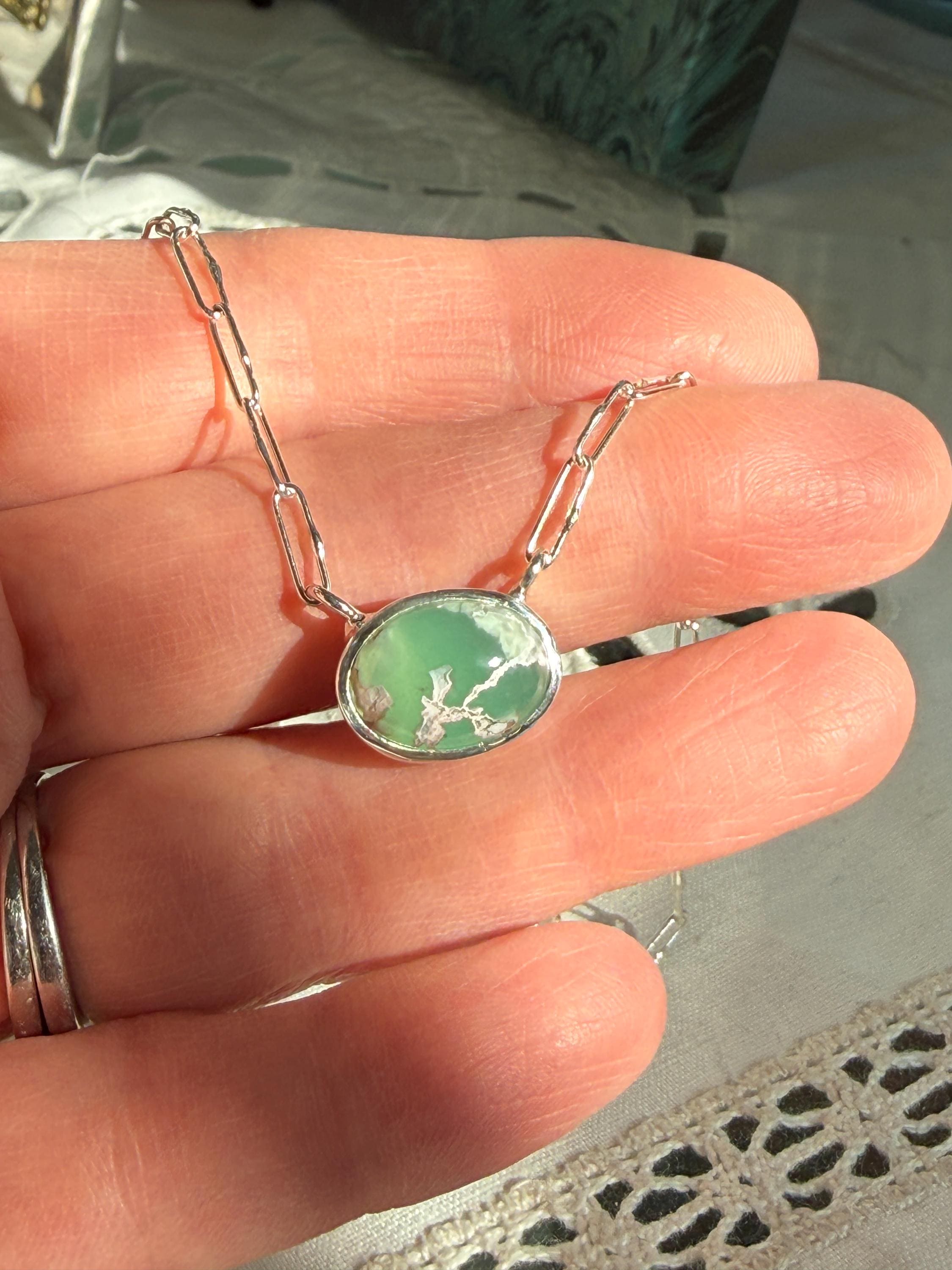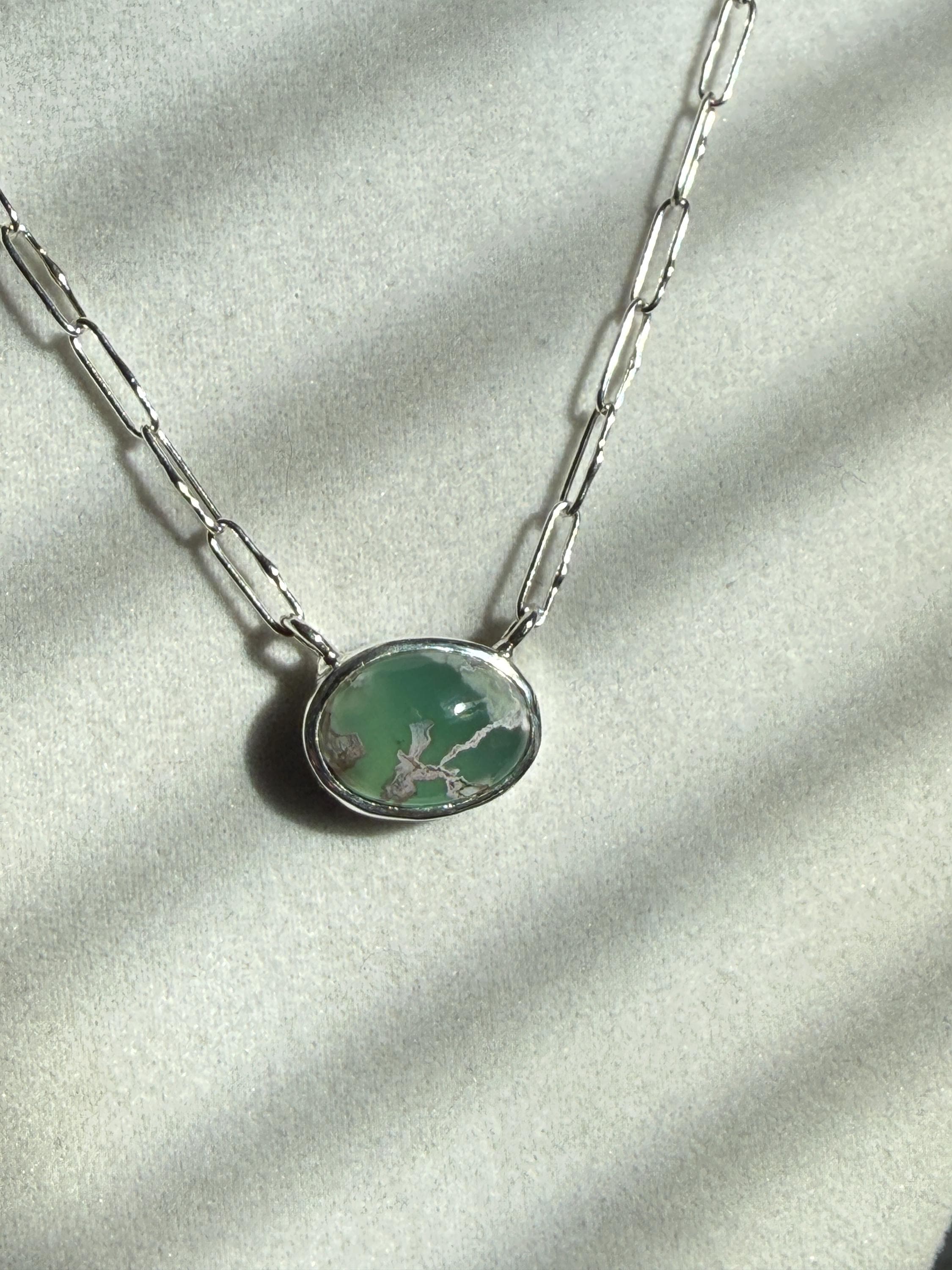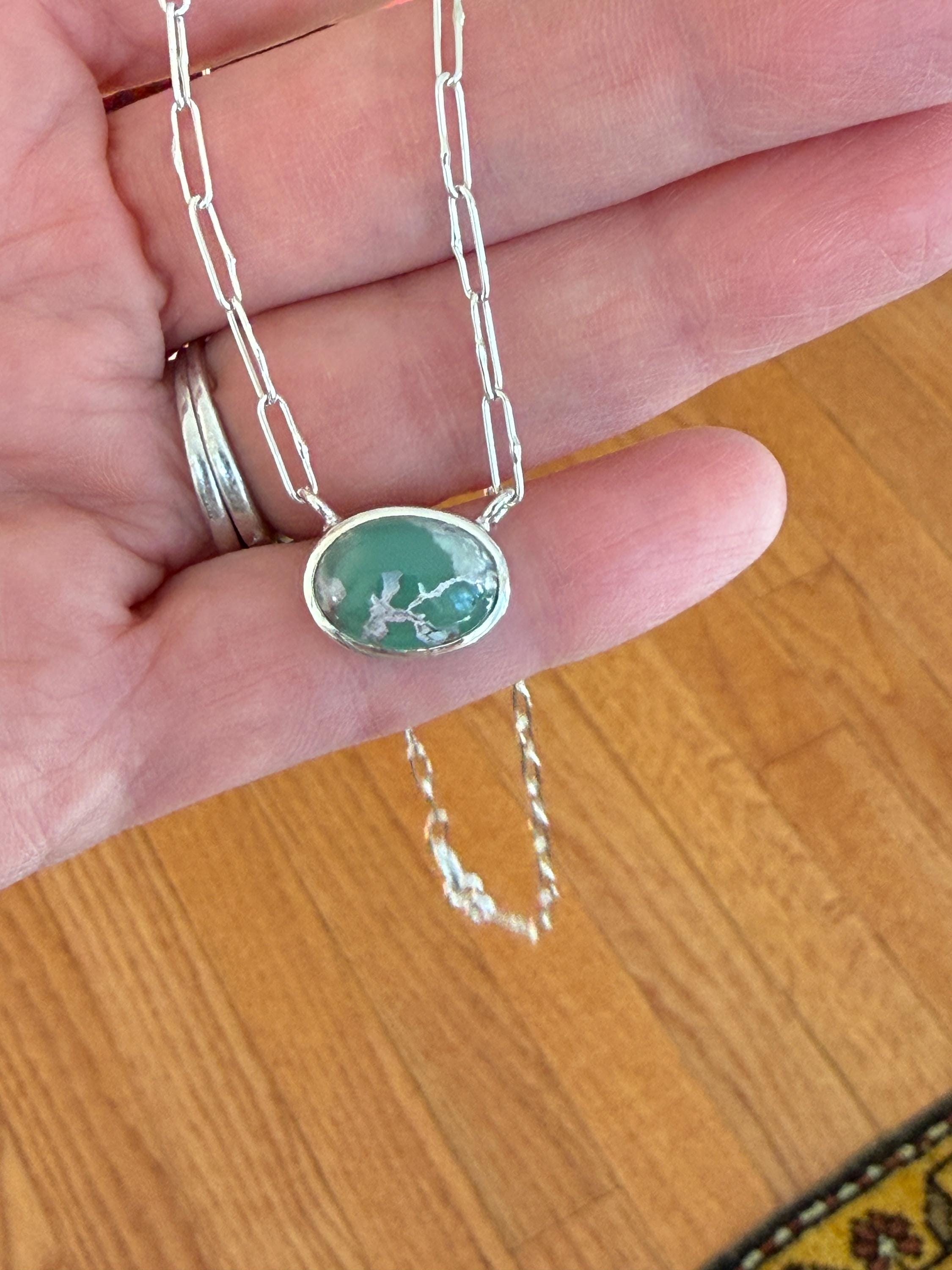 A beautiful green aquaprase with really cool matrix! This luscious oval aquaprase cabochon bezel is set in fine silver and attached to a small Funky Link chain in sterling silver. The necklace is about 18 inches long and is finished with a lobster clasp. I make these chains completely by hand, one link at a time (the lobster clasp is machine made). The cabochon cut stone measures approximately 14x10 mm, and has green coloring with distinctive white with brown matrix. To my eye, I see the letter K with a heart in the matrix. The bezel setting is made of fine silver and hand fabricated to fit the stone. The back of the setting is closed and it is permanently attached to the chain. The necklace is adjustable since the lobster clasp can be used on any of the links.