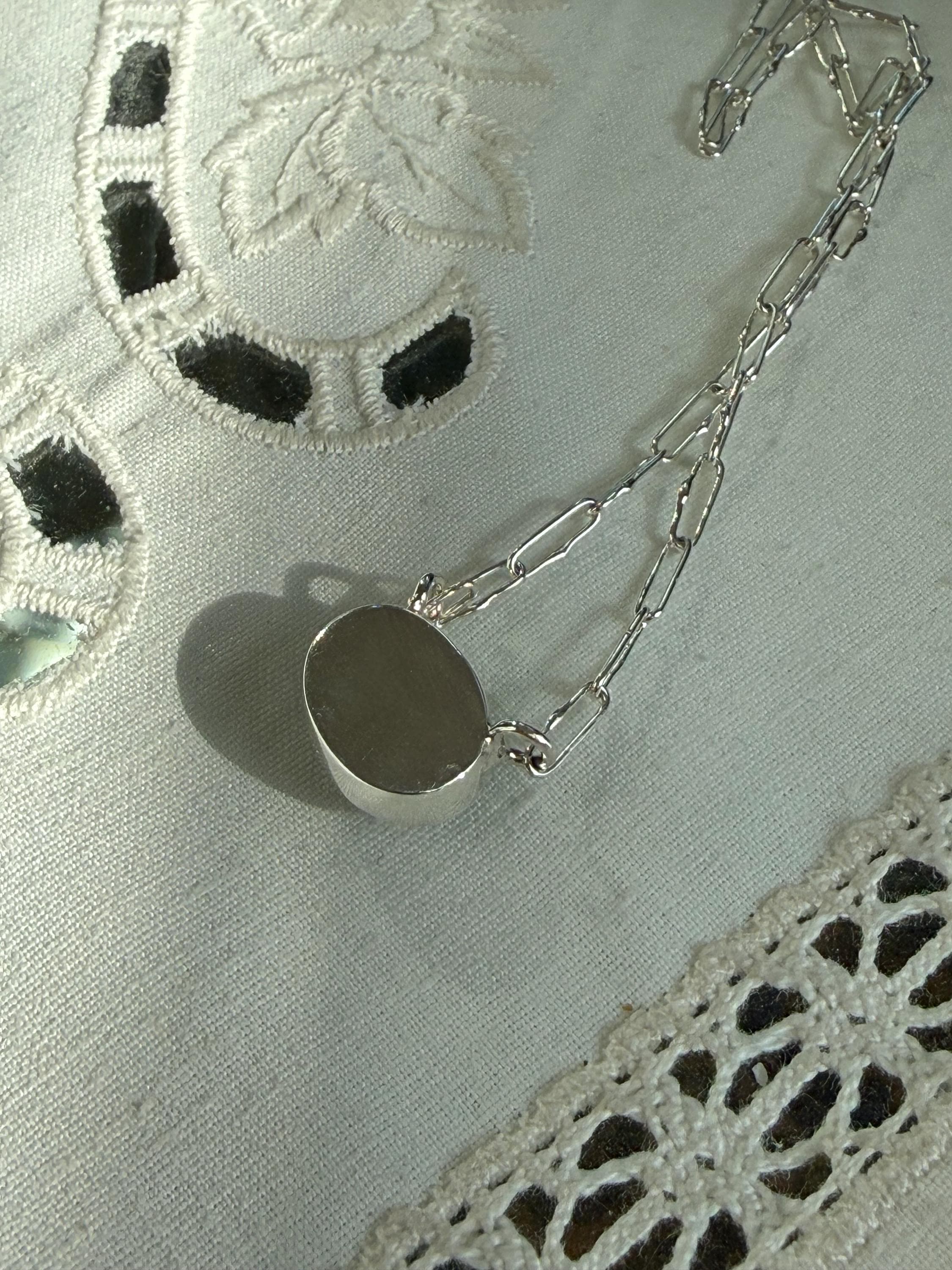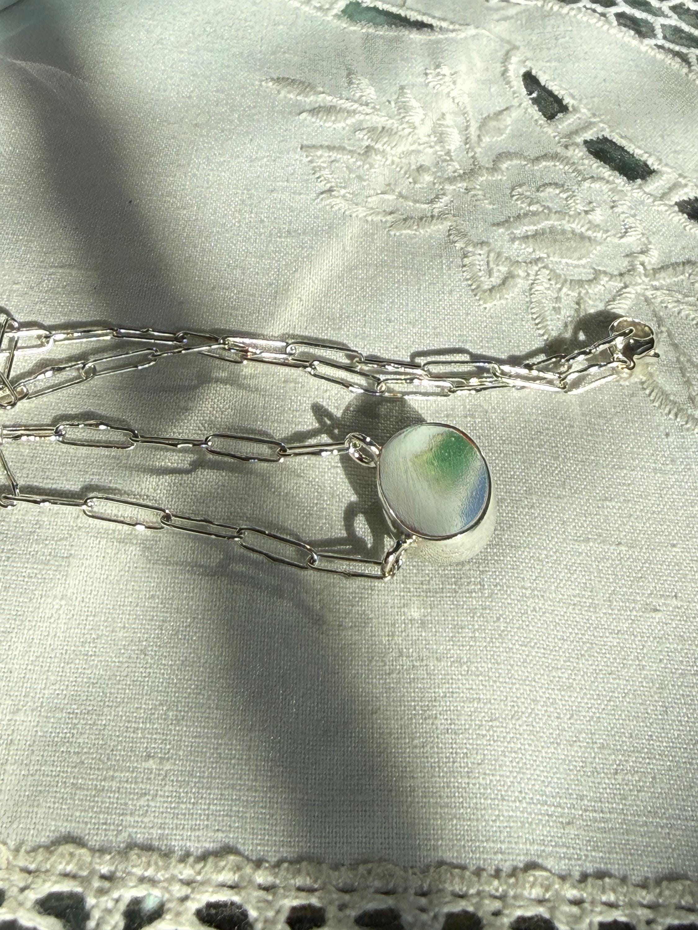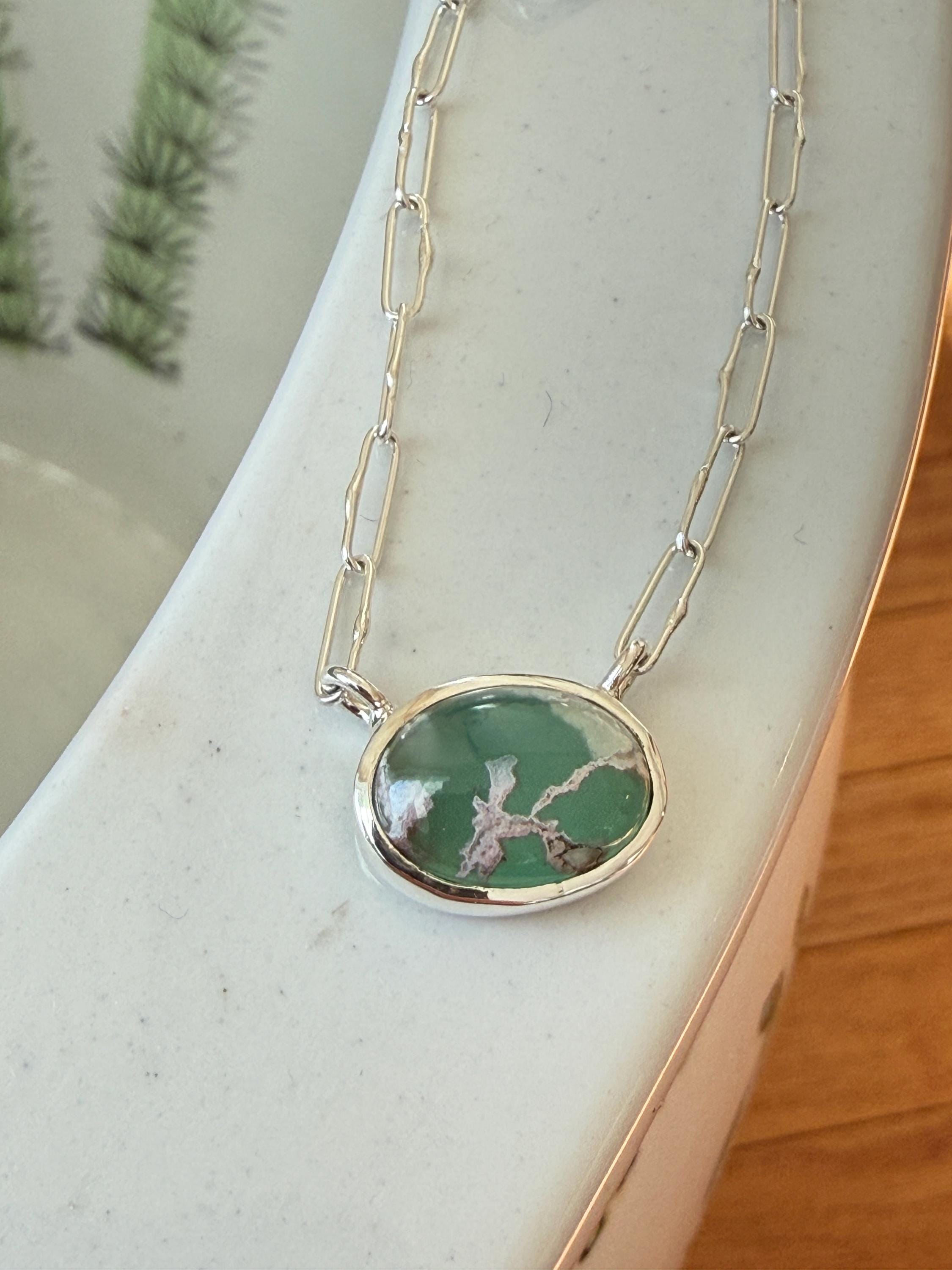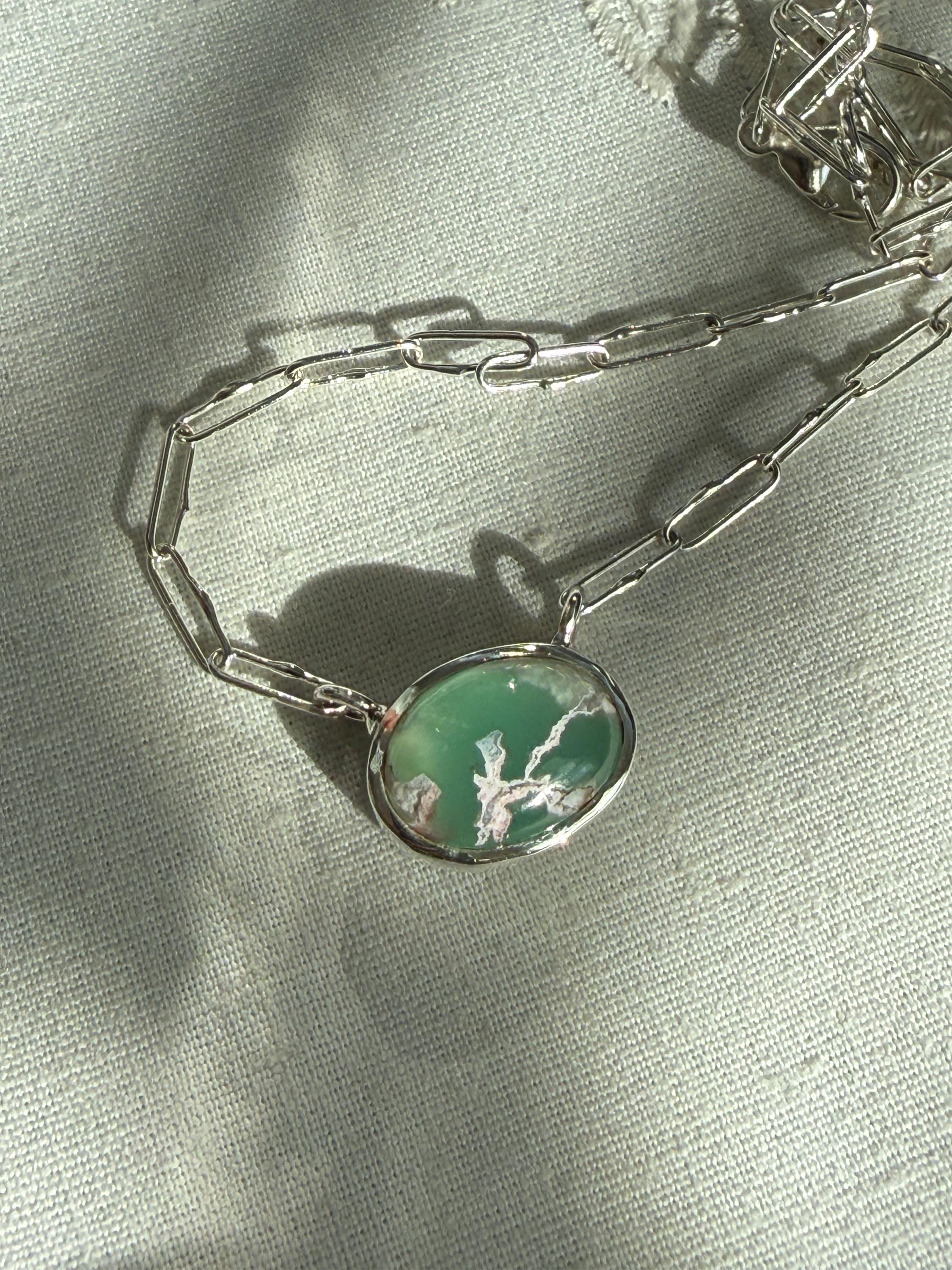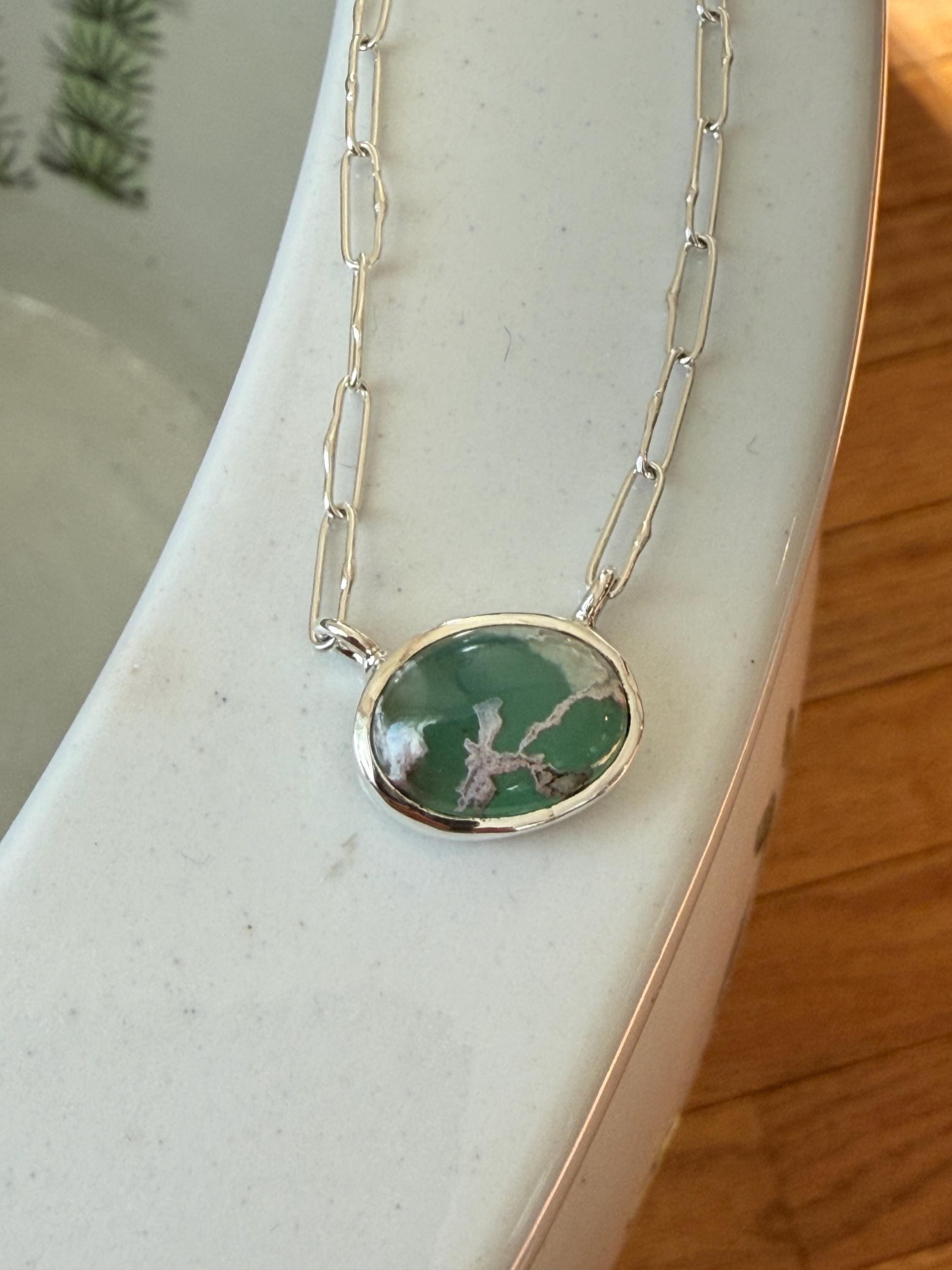 A beautiful green aquaprase with really cool matrix! This luscious oval aquaprase cabochon bezel is set in fine silver and attached to a small Funky Link chain in sterling silver. The necklace is about 18 inches long and is finished with a lobster clasp. I make these chains completely by hand, one link at a time (the lobster clasp is machine made). The cabochon cut stone measures approximately 14x10 mm, and has green coloring with distinctive white with brown matrix. To my eye, I see the letter K with a heart in the matrix. The bezel setting is made of fine silver and hand fabricated to fit the stone. The back of the setting is closed and it is permanently attached to the chain. The necklace is adjustable since the lobster clasp can be used on any of the links.