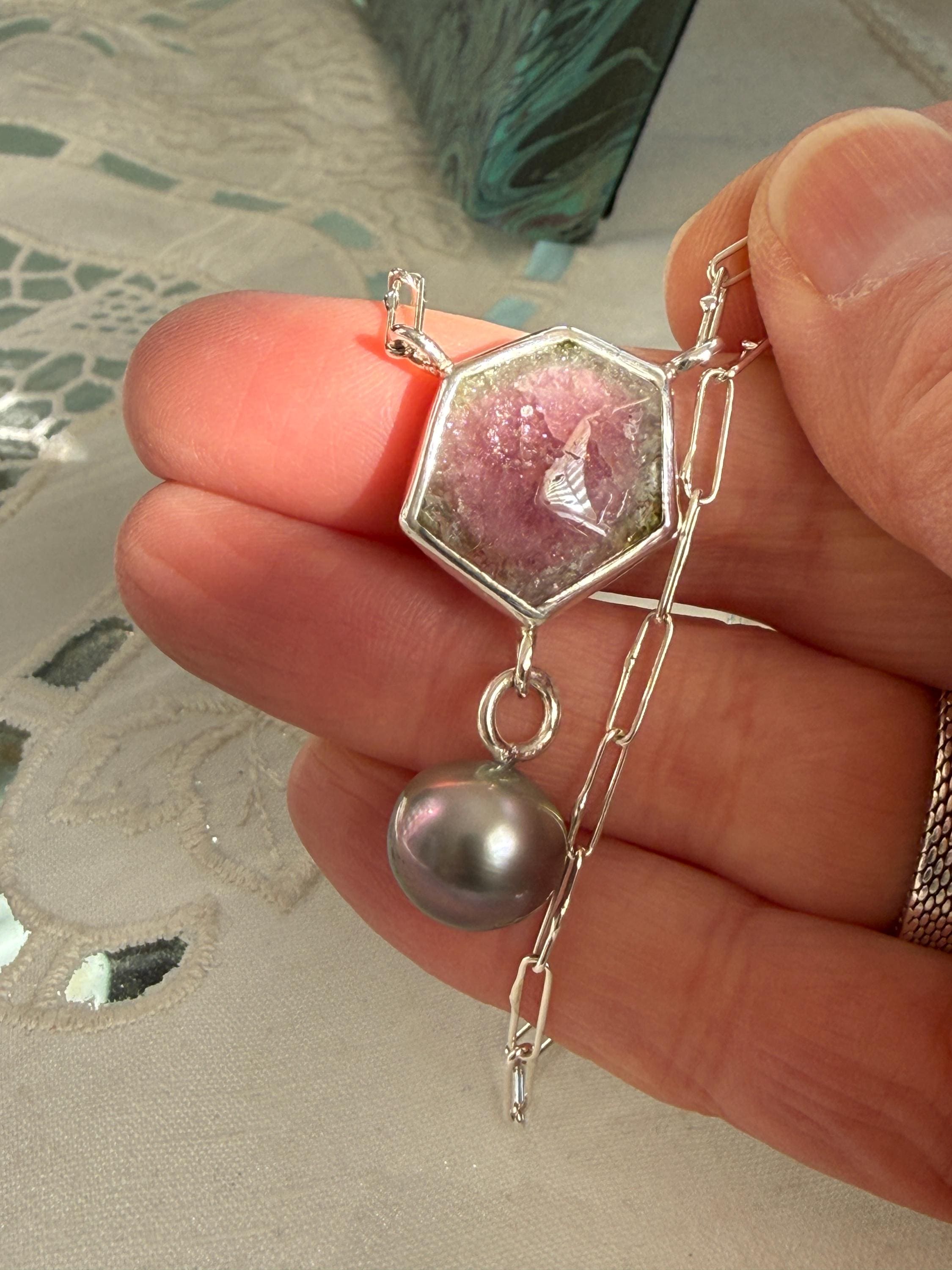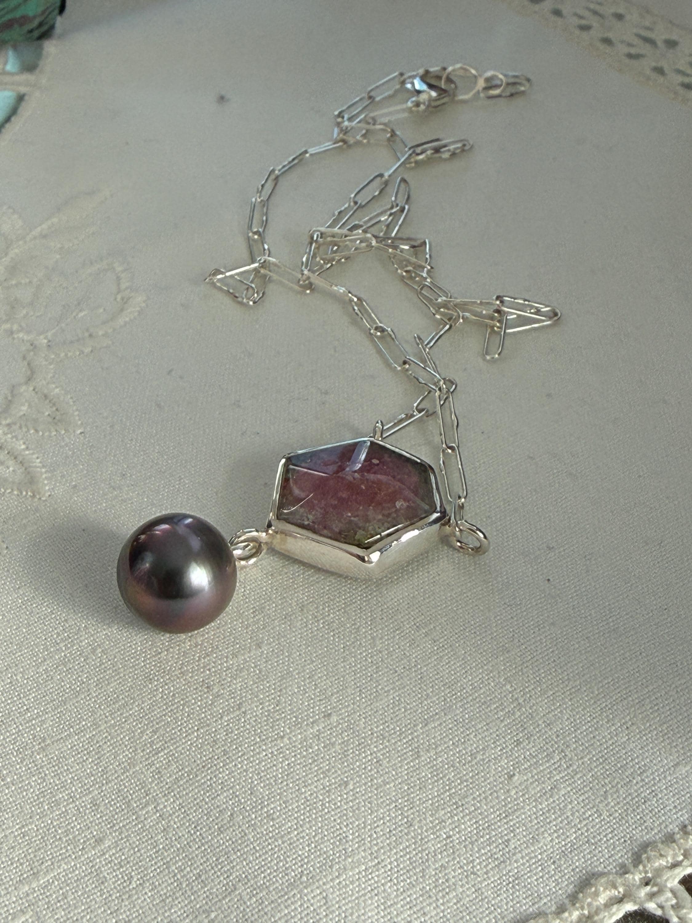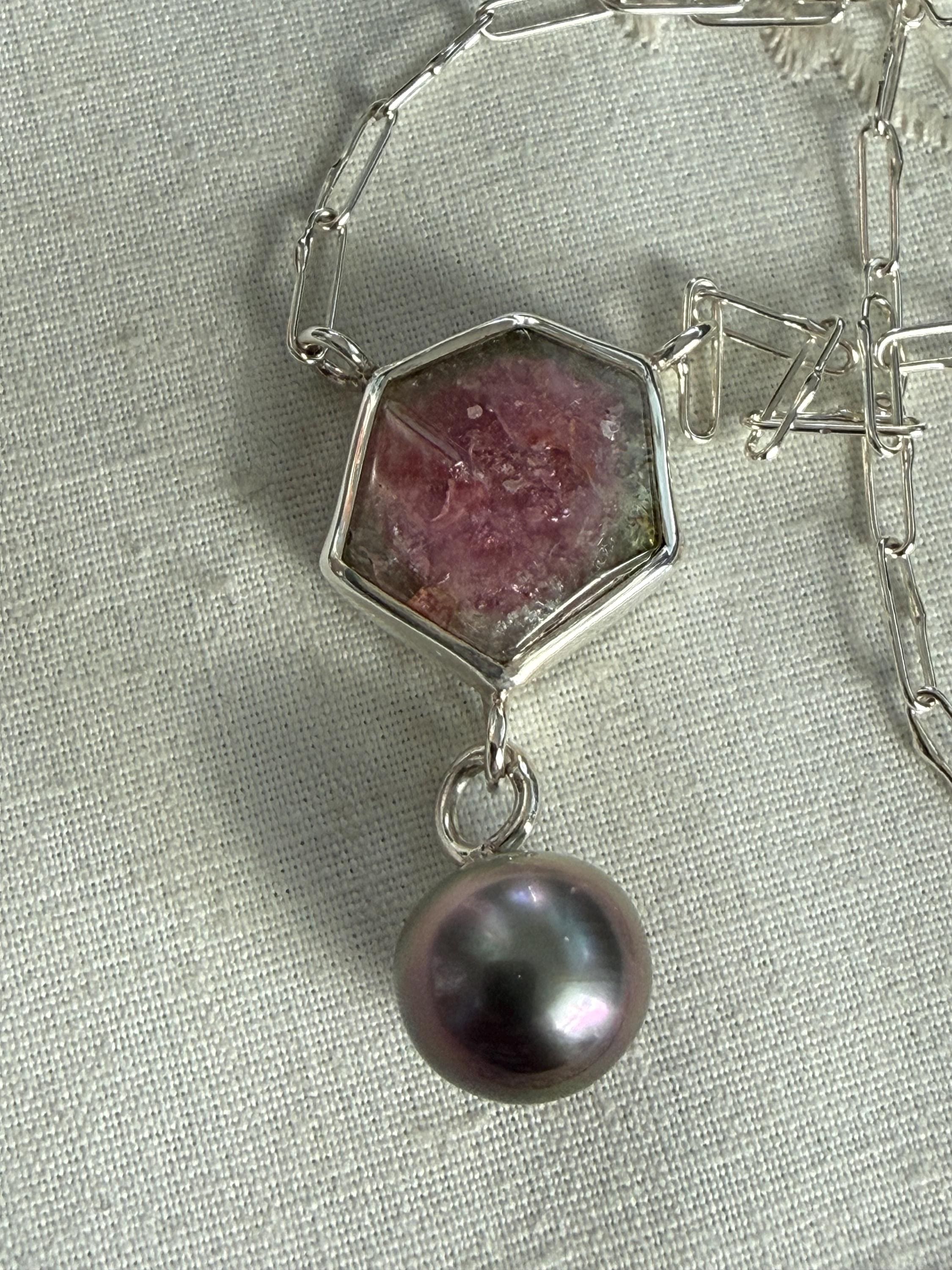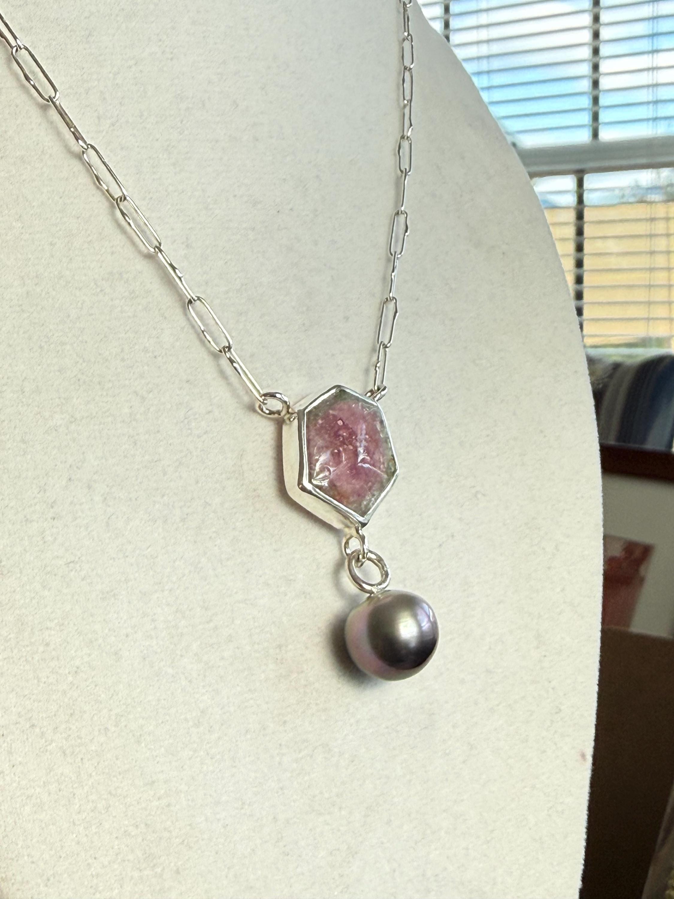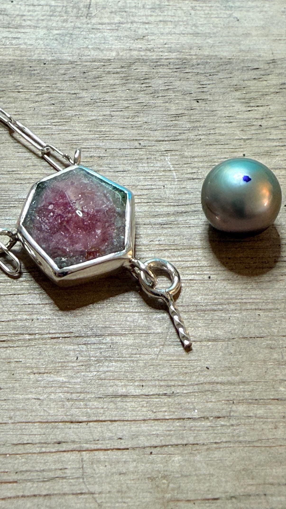 Big, bold and pink! This beautiful watermelon tourmaline and cultured Tahitian pearl "Y" style silver necklace really hits all the reasons to love this combination. The tourmaline is a six sided shaped cabochon with a rich grass green rind and center of pink. It is set in a chunky bezel of fine silver. The cultured Tahitian pearl is a short drop shape (button), with wonderful ombre from light to dark green body color (pinks really pop next to the stone). The pearl measures about 11.6mm across and has very minor surface blemishing. The luster is very sharp and did I mention the colors? The body is an ombre of light/medium/dark green with strong pinks visible on the pearl. The water melon tourmaline weighs about 11.5 cts, measures 16mm across. It has 6 sides and is slightly peaked. There are visible inclusions in the stone which reach the surface, and it is translucent (the back of the setting has been kept open). The necklace is about 18.5 inches long and is adjustable with a lobster clasp that can be attached to any link. The Funky Link chain is handmade using sterling silver (argentium) wire, and is a paperclip style link.