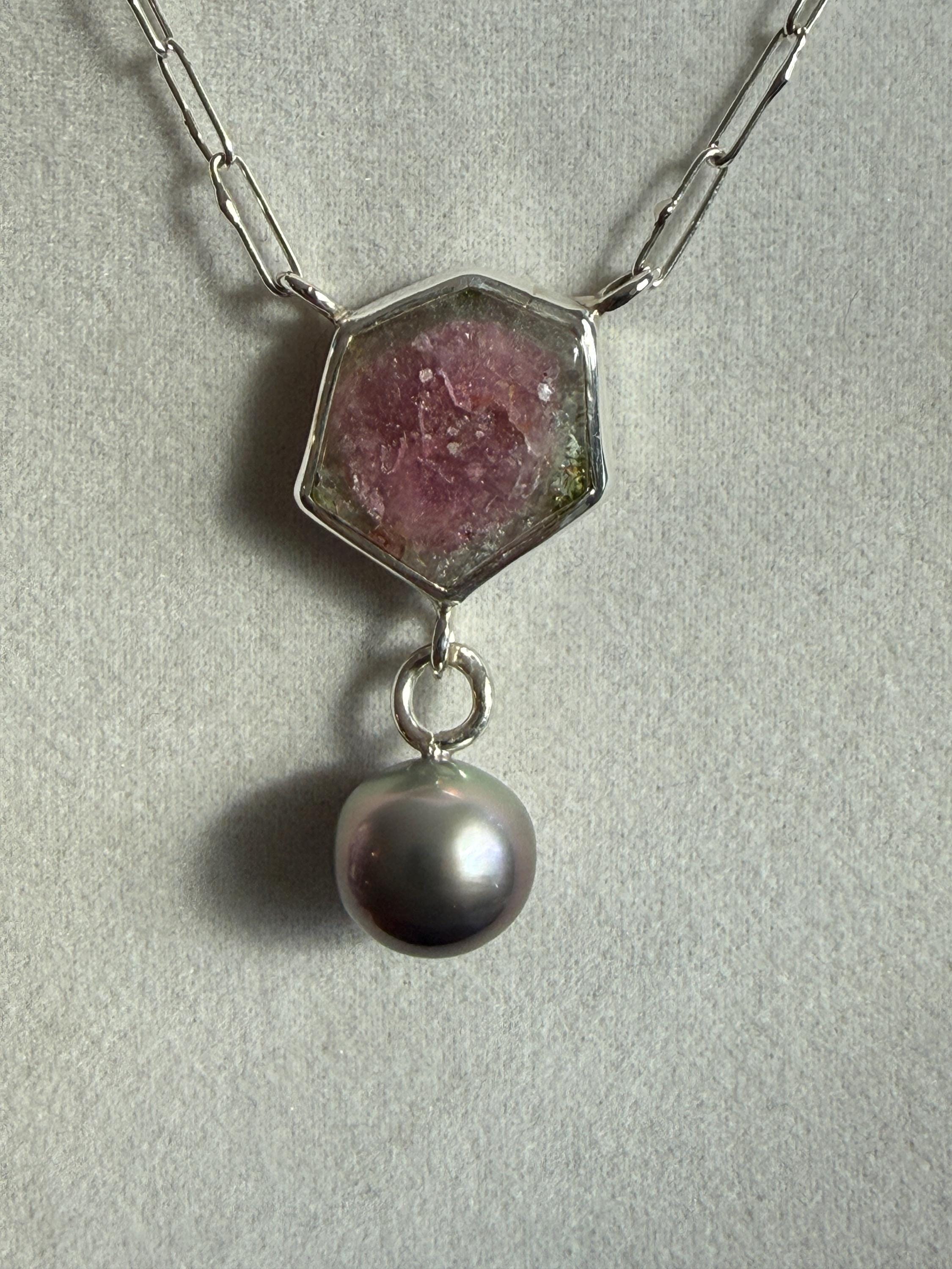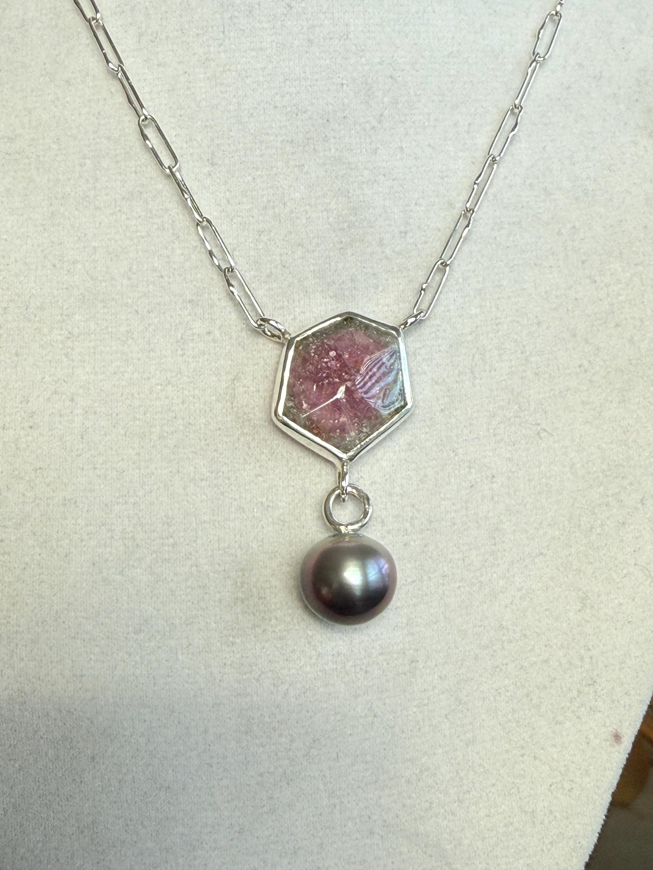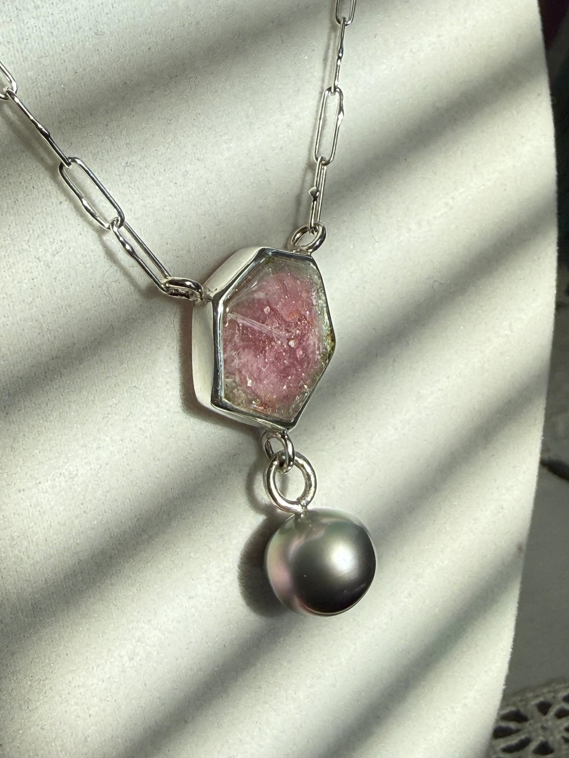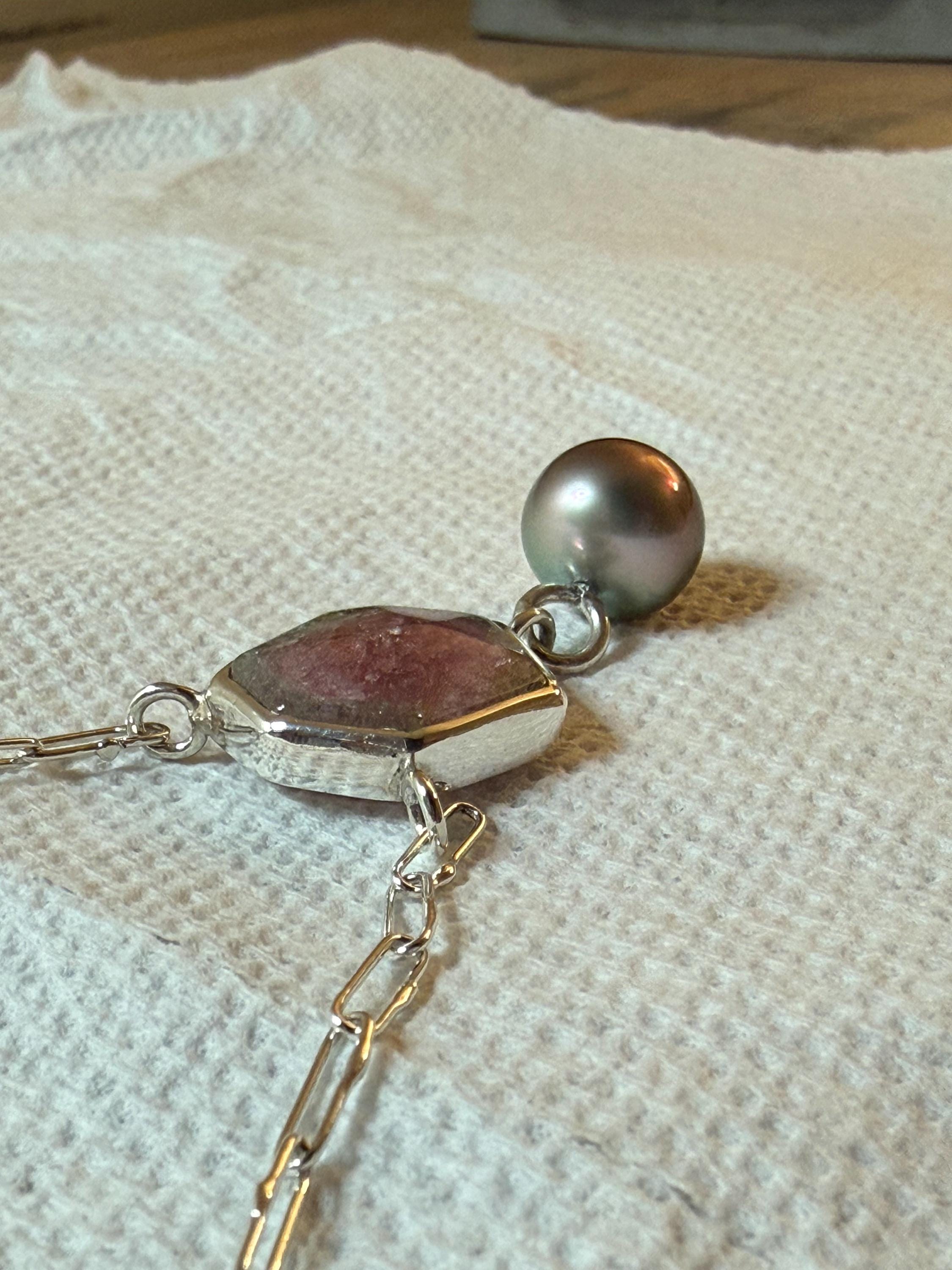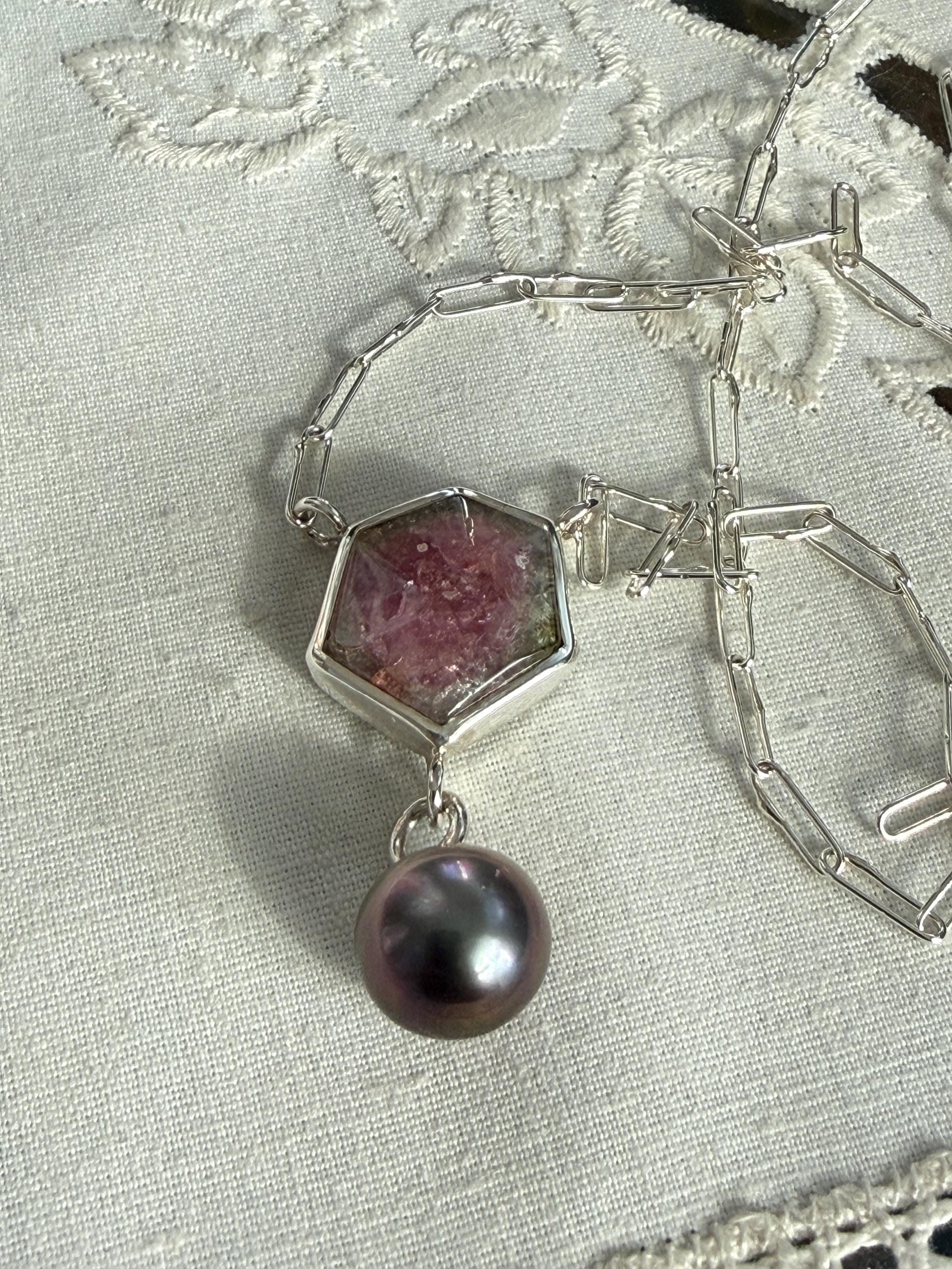 Big, bold and pink! This beautiful watermelon tourmaline and cultured Tahitian pearl "Y" style silver necklace really hits all the reasons to love this combination. The tourmaline is a six sided shaped cabochon with a rich grass green rind and center of pink. It is set in a chunky bezel of fine silver. The cultured Tahitian pearl is a short drop shape (button), with wonderful ombre from light to dark green body color (pinks really pop next to the stone). The pearl measures about 11.6mm across and has very minor surface blemishing. The luster is very sharp and did I mention the colors? The body is an ombre of light/medium/dark green with strong pinks visible on the pearl. The water melon tourmaline weighs about 11.5 cts, measures 16mm across. It has 6 sides and is slightly peaked. There are visible inclusions in the stone which reach the surface, and it is translucent (the back of the setting has been kept open). The necklace is about 18.5 inches long and is adjustable with a lobster clasp that can be attached to any link. The Funky Link chain is handmade using sterling silver (argentium) wire, and is a paperclip style link.
