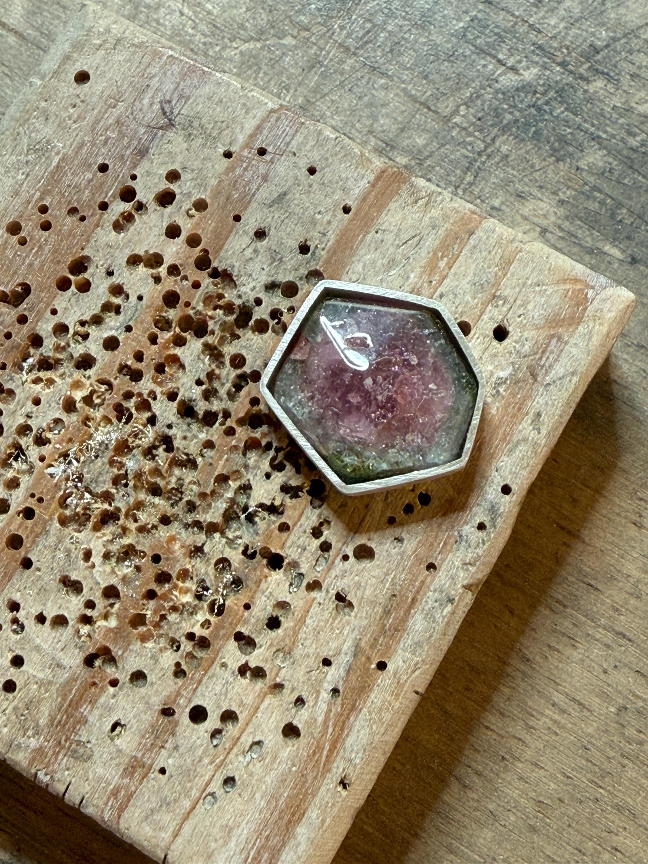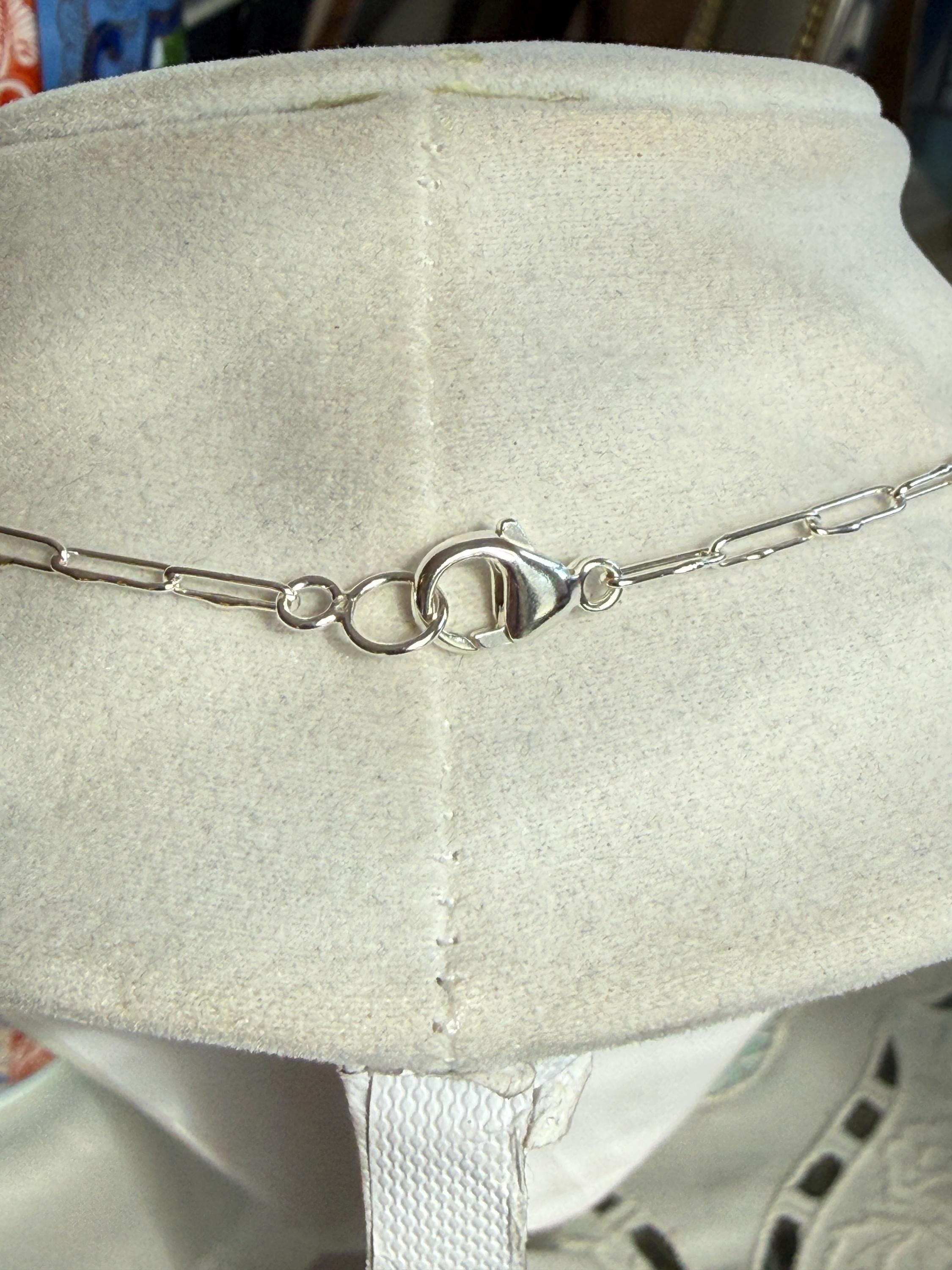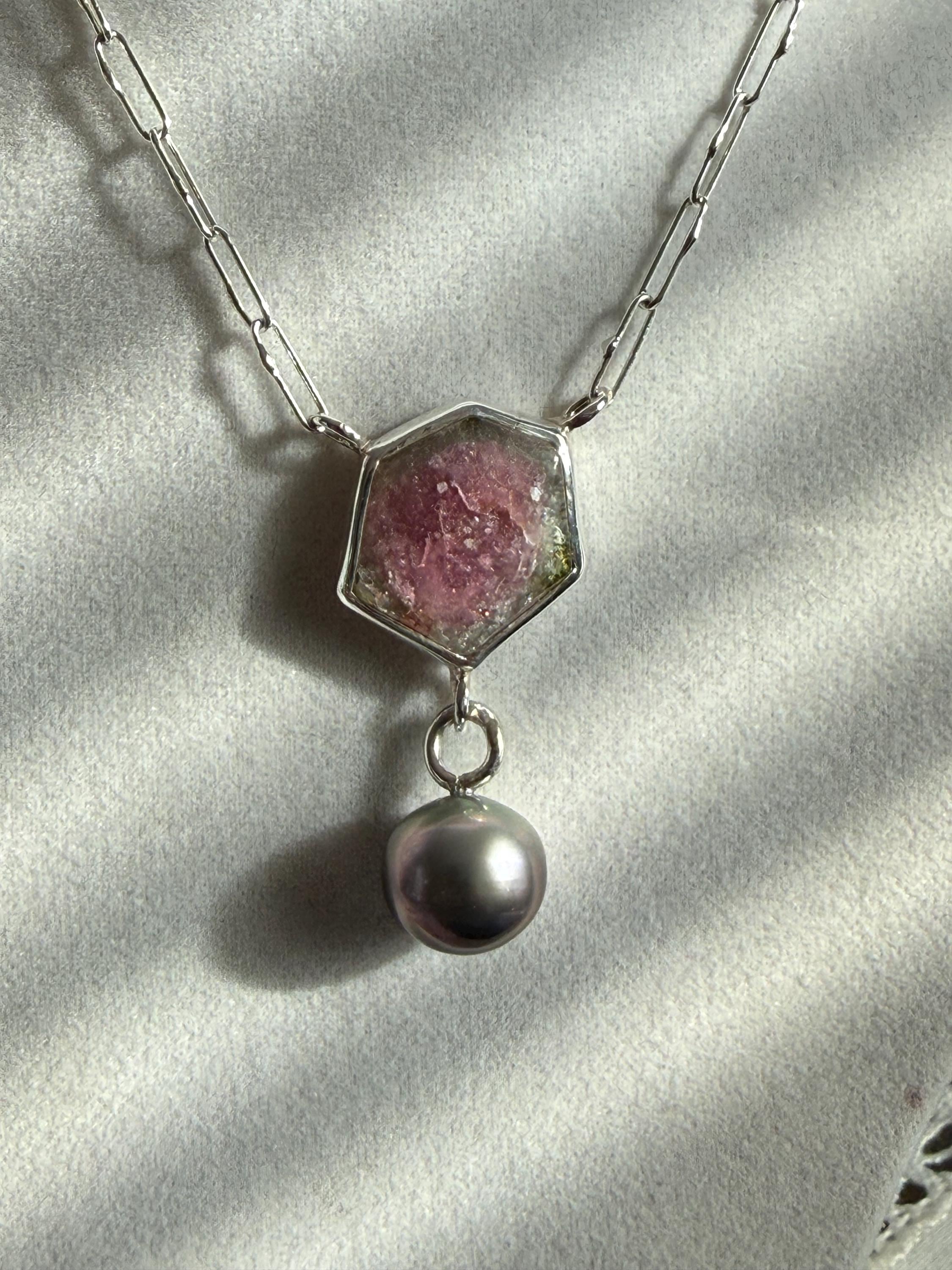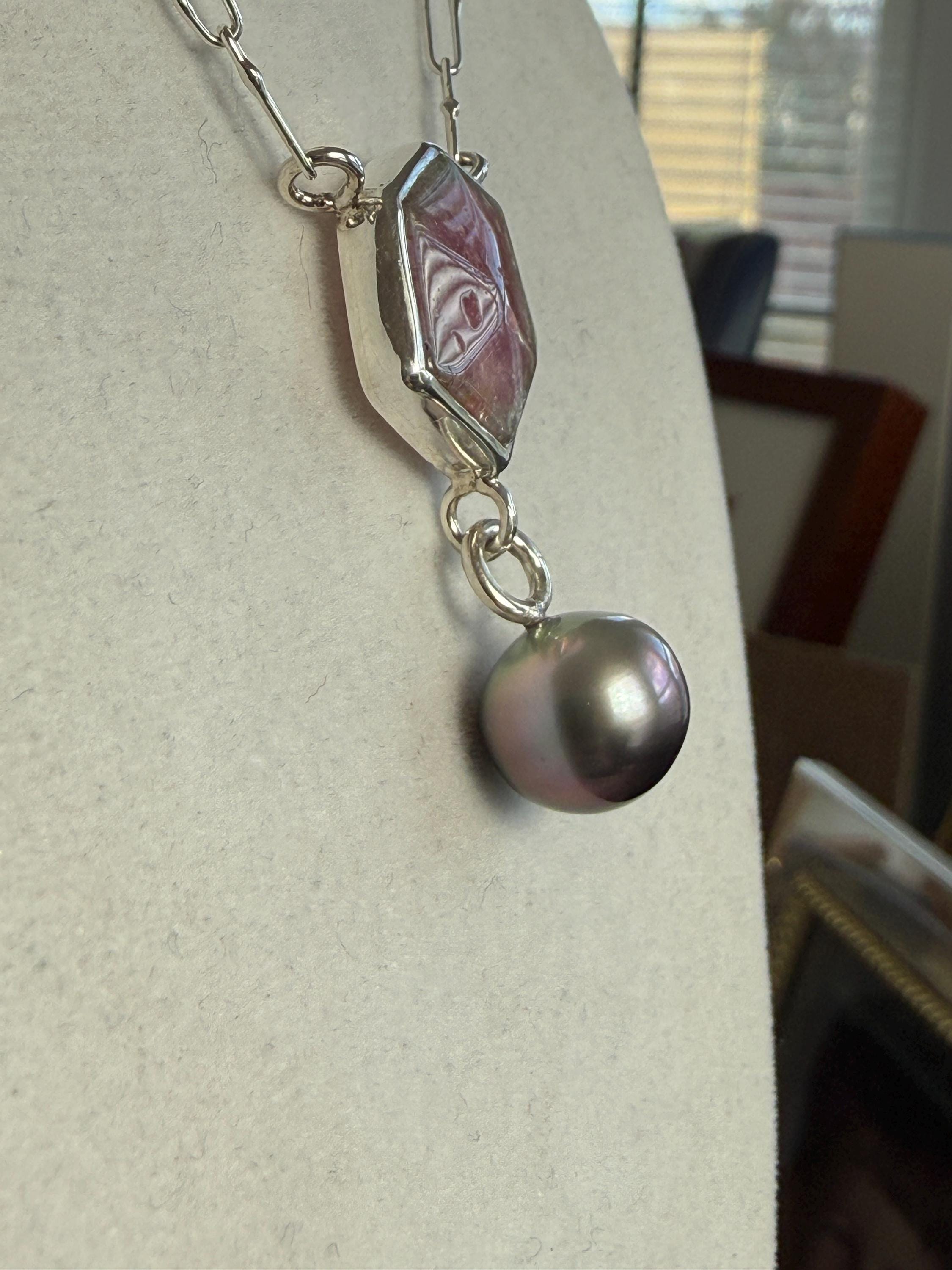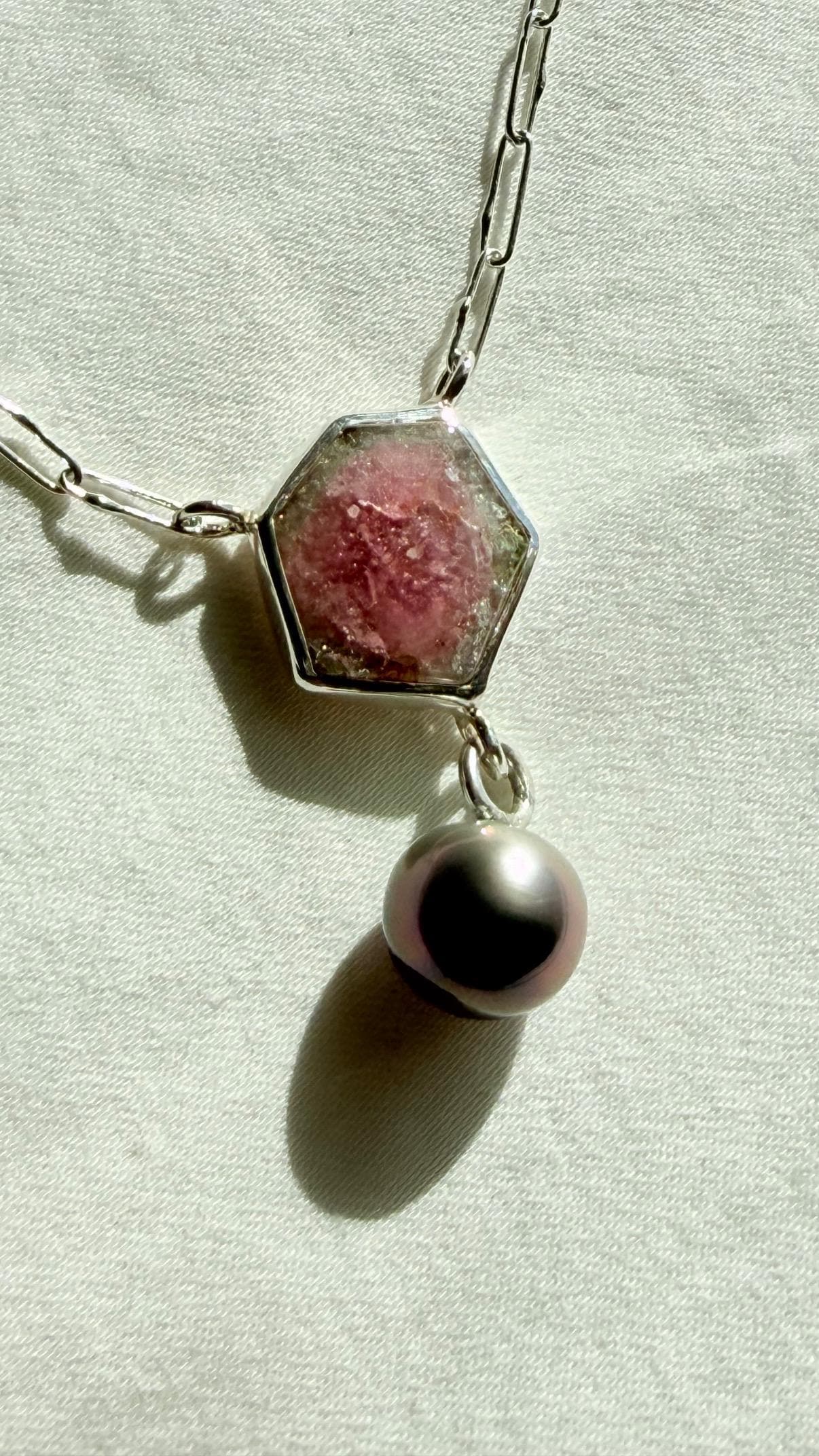 Big, bold and pink! This beautiful watermelon tourmaline and cultured Tahitian pearl "Y" style silver necklace really hits all the reasons to love this combination. The tourmaline is a six sided shaped cabochon with a rich grass green rind and center of pink. It is set in a chunky bezel of fine silver. The cultured Tahitian pearl is a short drop shape (button), with wonderful ombre from light to dark green body color (pinks really pop next to the stone). The pearl measures about 11.6mm across and has very minor surface blemishing. The luster is very sharp and did I mention the colors? The body is an ombre of light/medium/dark green with strong pinks visible on the pearl. The water melon tourmaline weighs about 11.5 cts, measures 16mm across. It has 6 sides and is slightly peaked. There are visible inclusions in the stone which reach the surface, and it is translucent (the back of the setting has been kept open). The necklace is about 18.5 inches long and is adjustable with a lobster clasp that can be attached to any link. The Funky Link chain is handmade using sterling silver (argentium) wire, and is a paperclip style link.