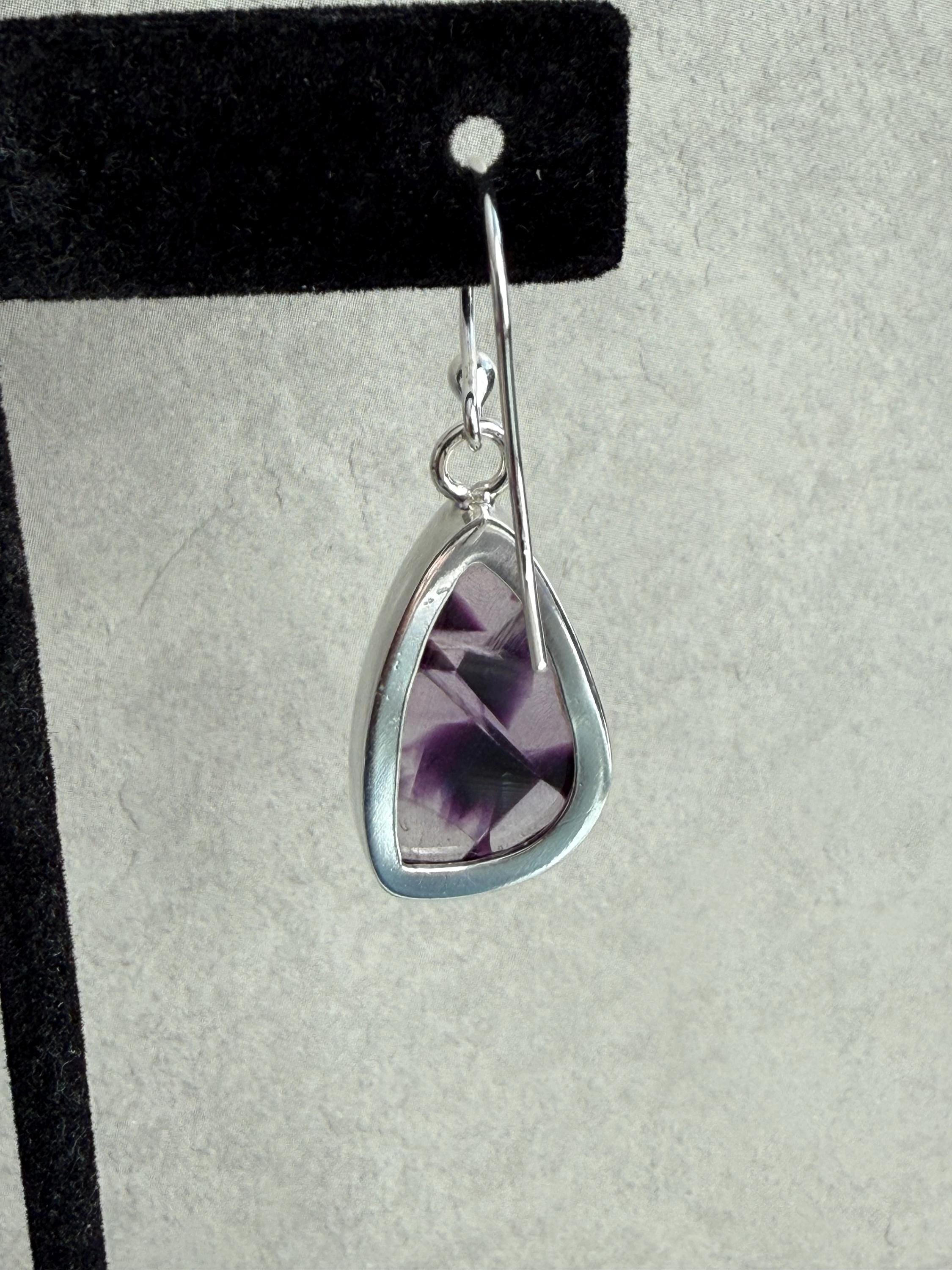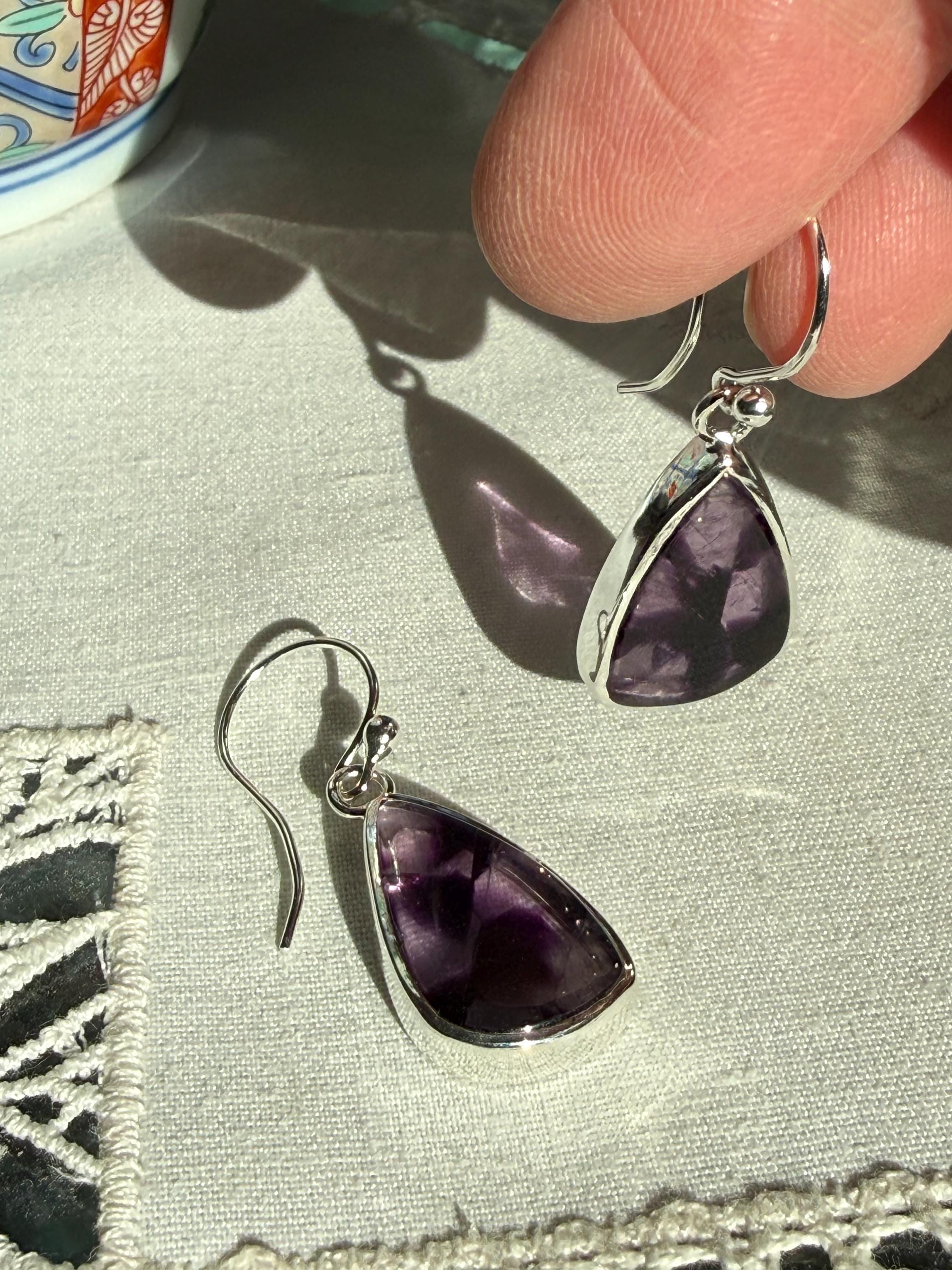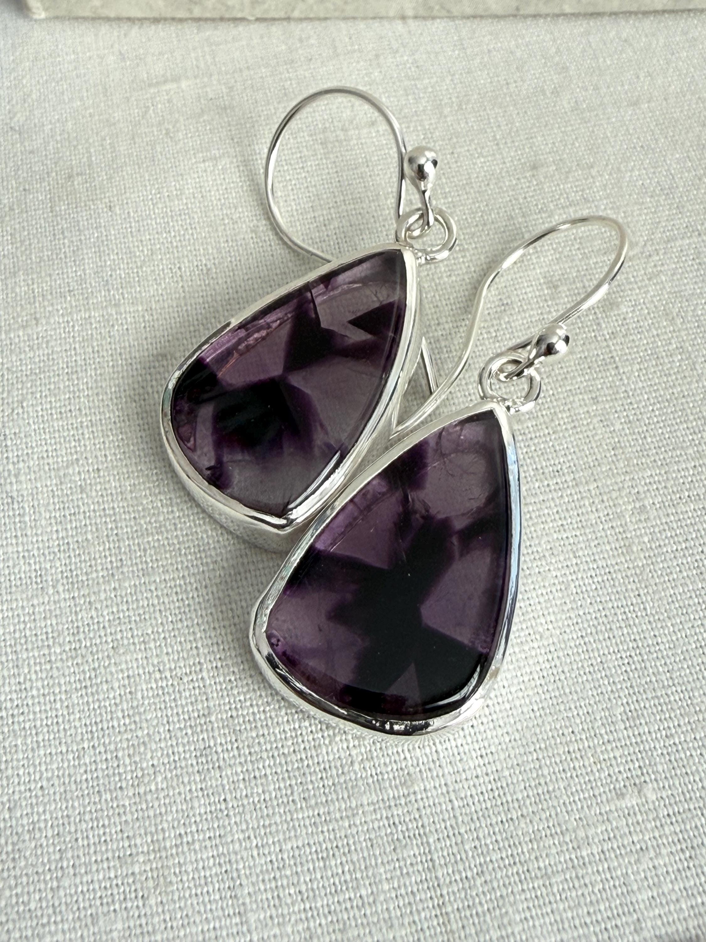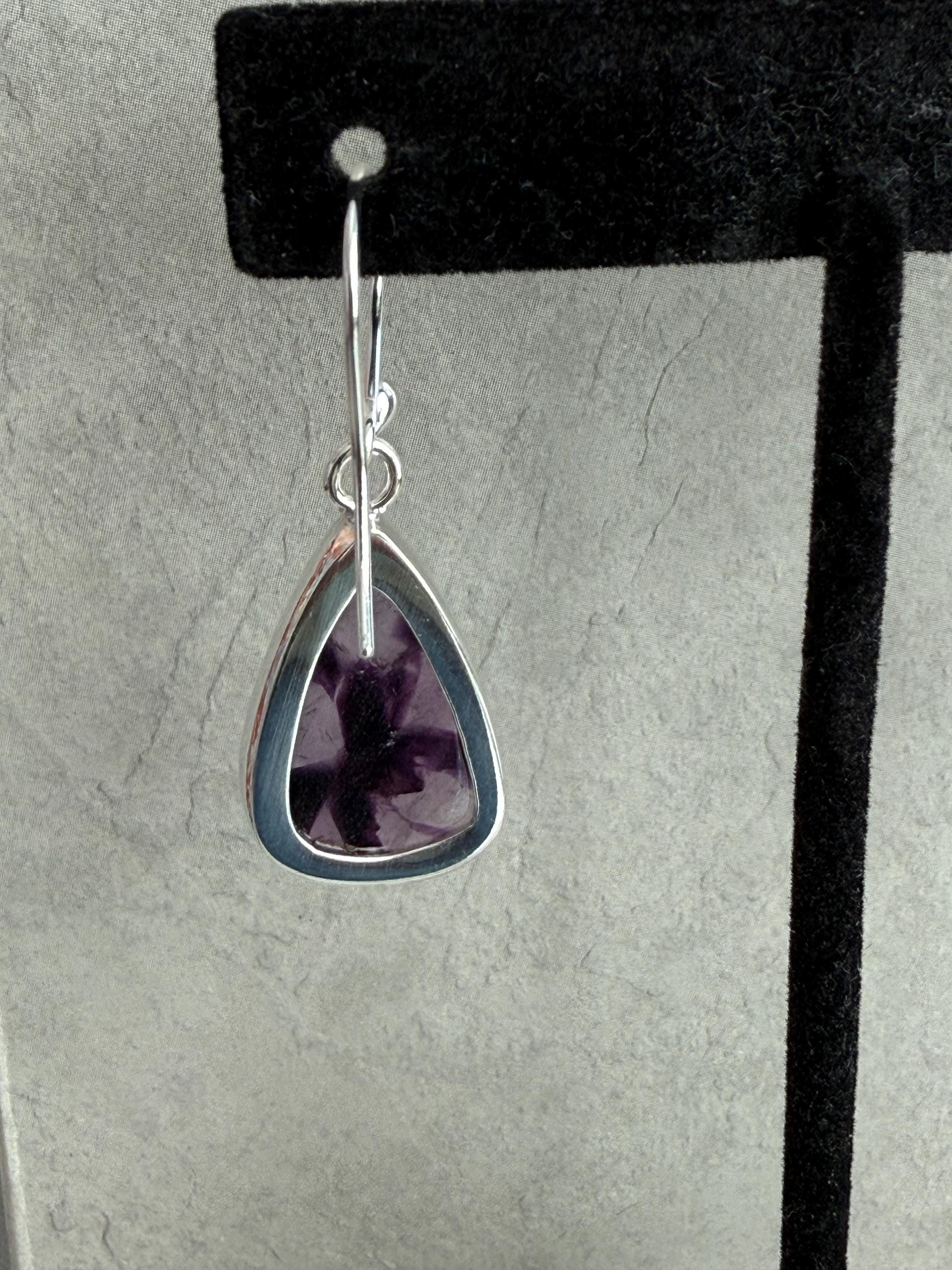 Every year I head to the gem shows in Tucson, and every year I come back with stones that are not on my bingo card! Trapiche amethyst was definitely not on my list, but I am so glad to have found them! Trapiche amethysts exhibit very distictive and unique color zoning. The rich deep velvety purples are bound by transparent faint purple fields. The stones are about 21x12.7mm each and they are set in handcrafted bezels of fine silver. They dangle from a pair of sterling silver ear wires, again, handcrafted. The backs of the bezels have been left open so that the patterns in the stones can be appreciated from both sides. The earrings measure approximately 1.5 inches from the top of the ear wire to the bottom of the dangle, and they're about half an inch at their widest point. These earrings are for pierced ears only; please note that earrings are not returnable/refundable.