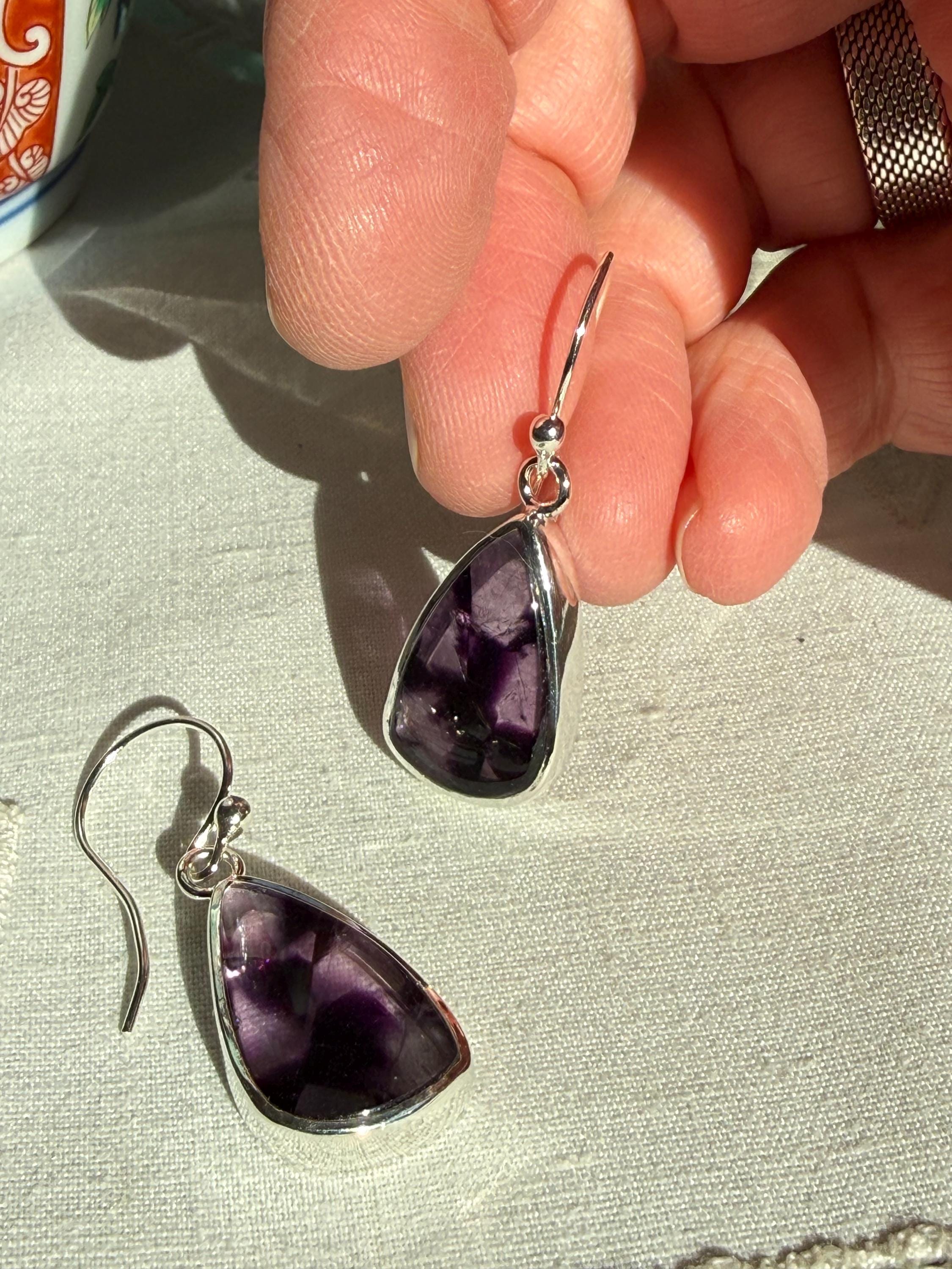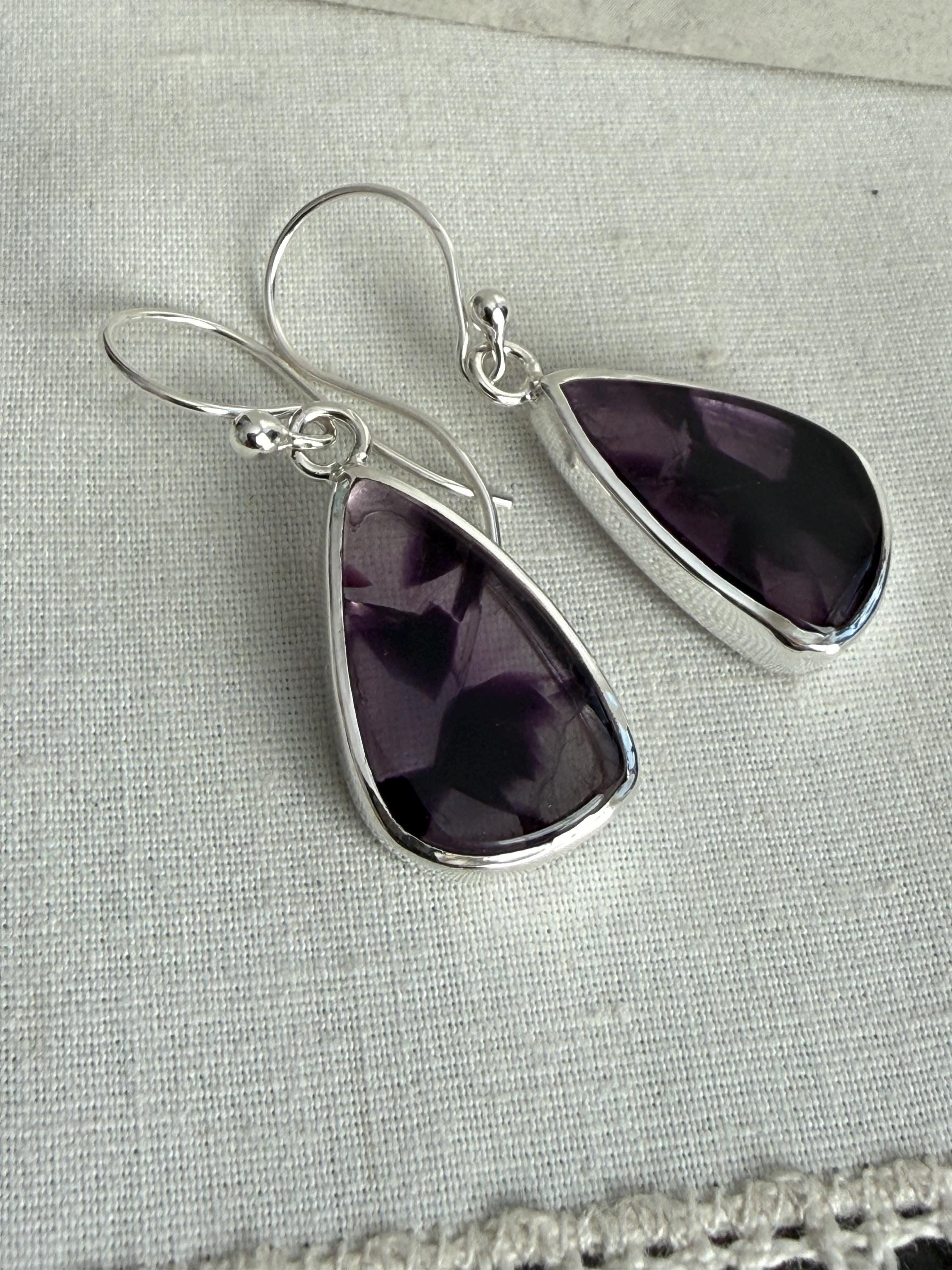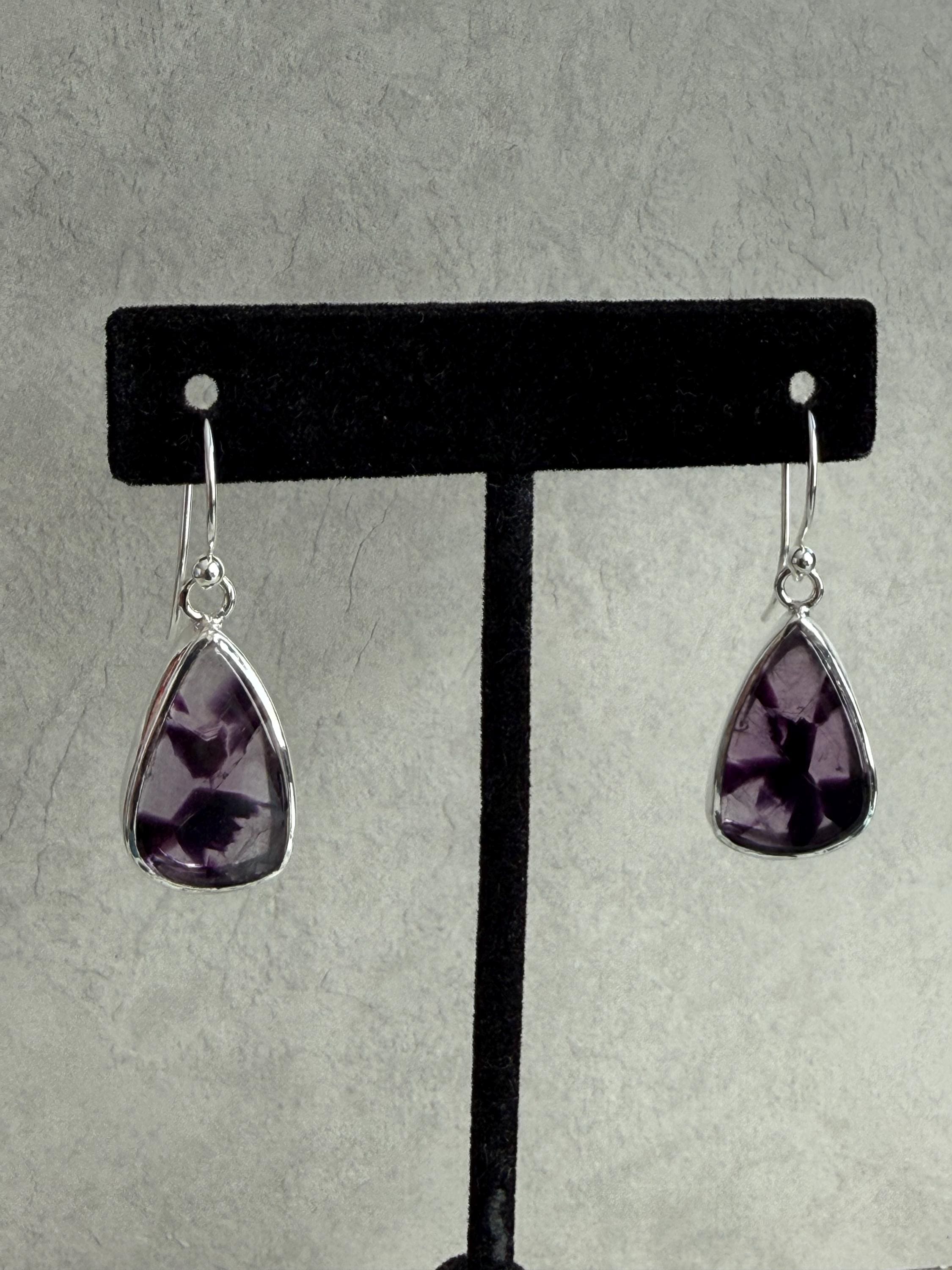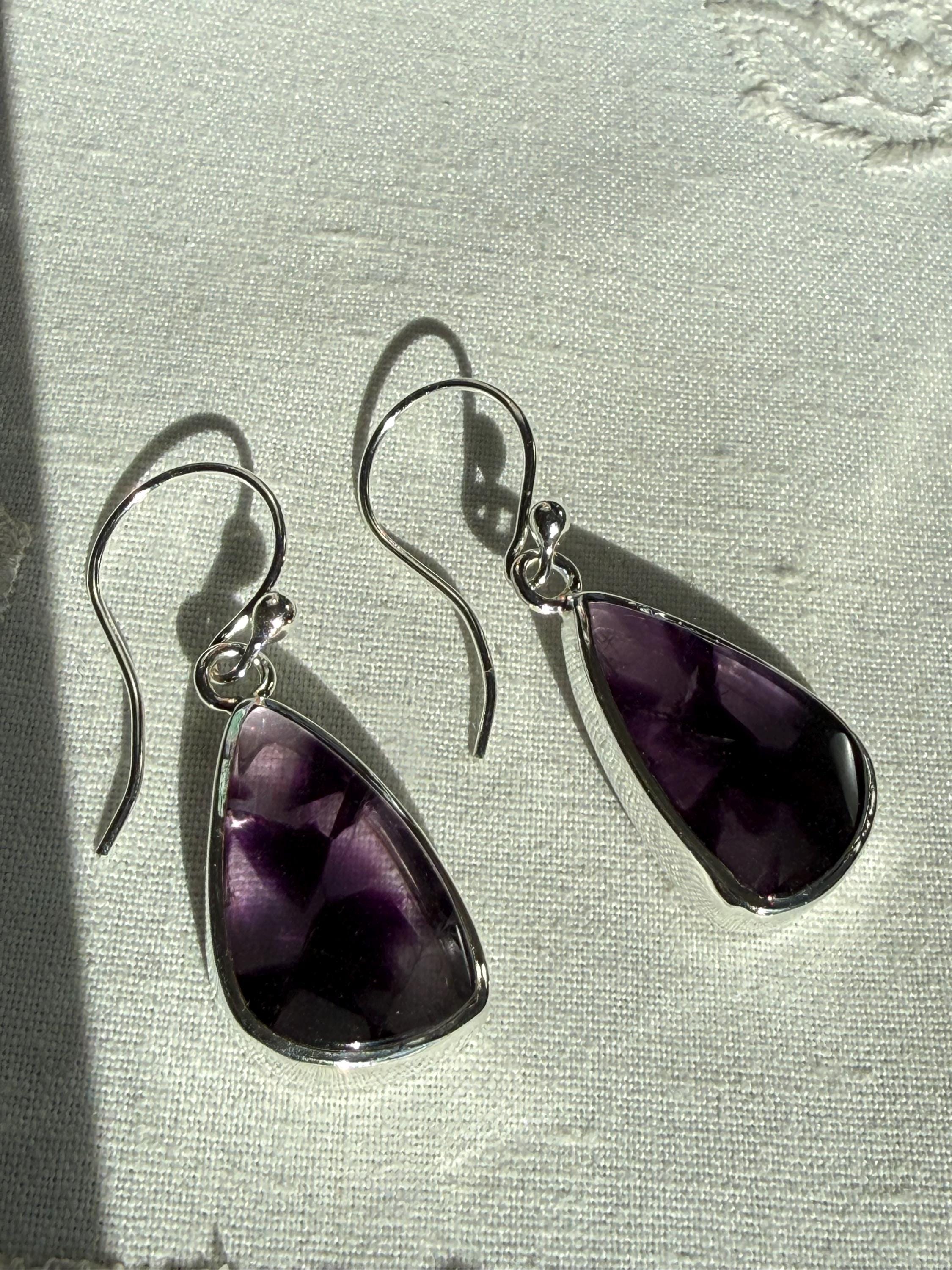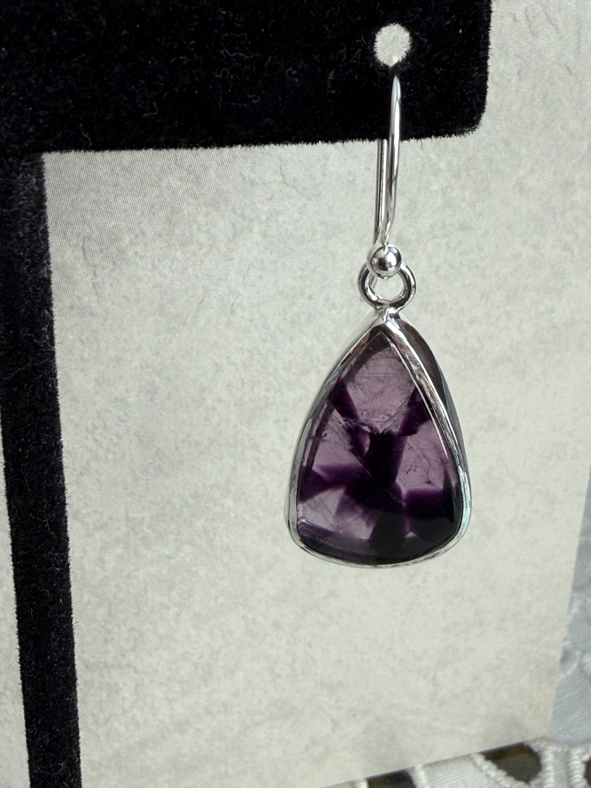 Every year I head to the gem shows in Tucson, and every year I come back with stones that are not on my bingo card! Trapiche amethyst was definitely not on my list, but I am so glad to have found them! Trapiche amethysts exhibit very distictive and unique color zoning. The rich deep velvety purples are bound by transparent faint purple fields. The stones are about 21x12.7mm each and they are set in handcrafted bezels of fine silver. They dangle from a pair of sterling silver ear wires, again, handcrafted. The backs of the bezels have been left open so that the patterns in the stones can be appreciated from both sides. The earrings measure approximately 1.5 inches from the top of the ear wire to the bottom of the dangle, and they're about half an inch at their widest point. These earrings are for pierced ears only; please note that earrings are not returnable/refundable.