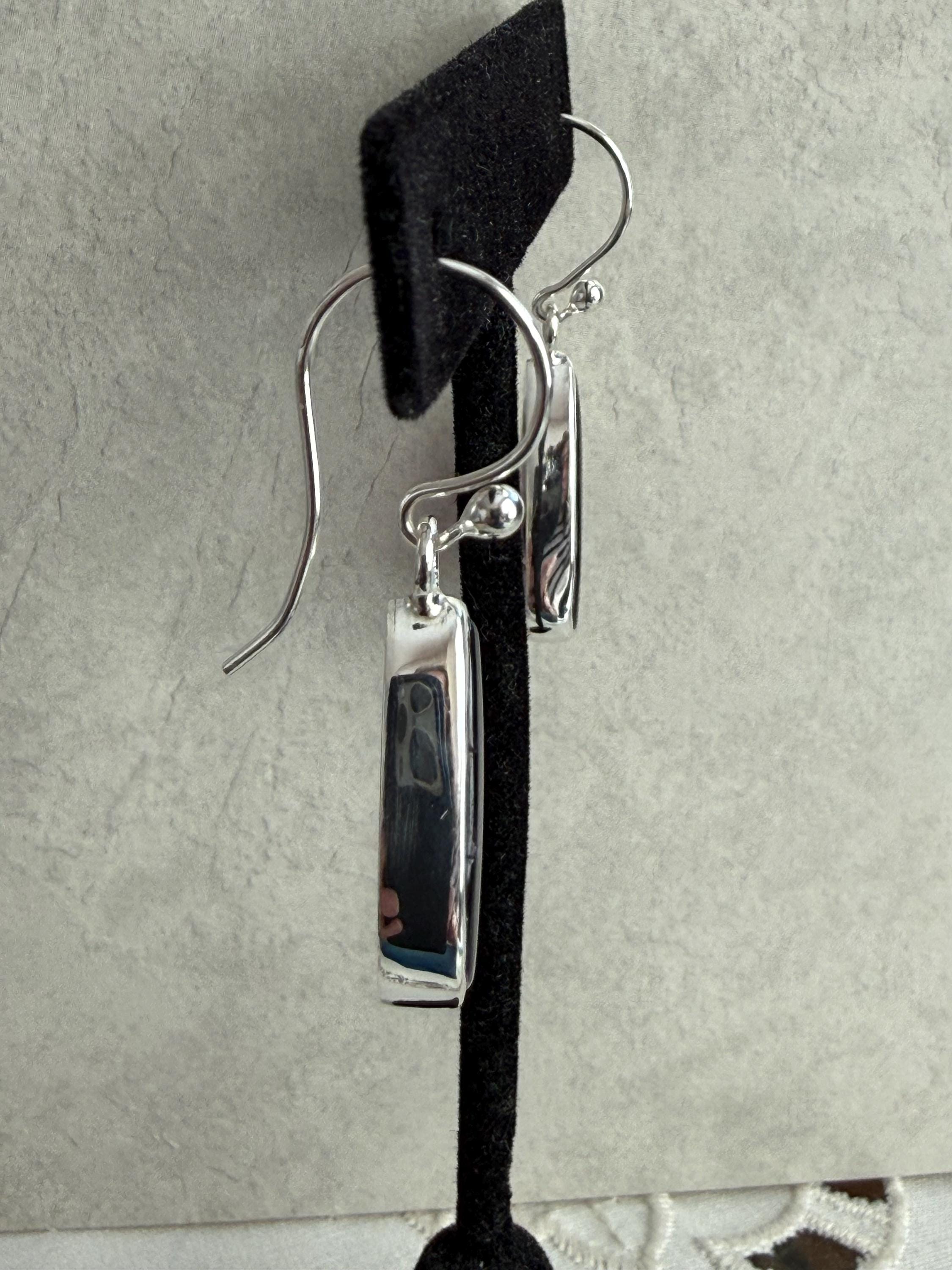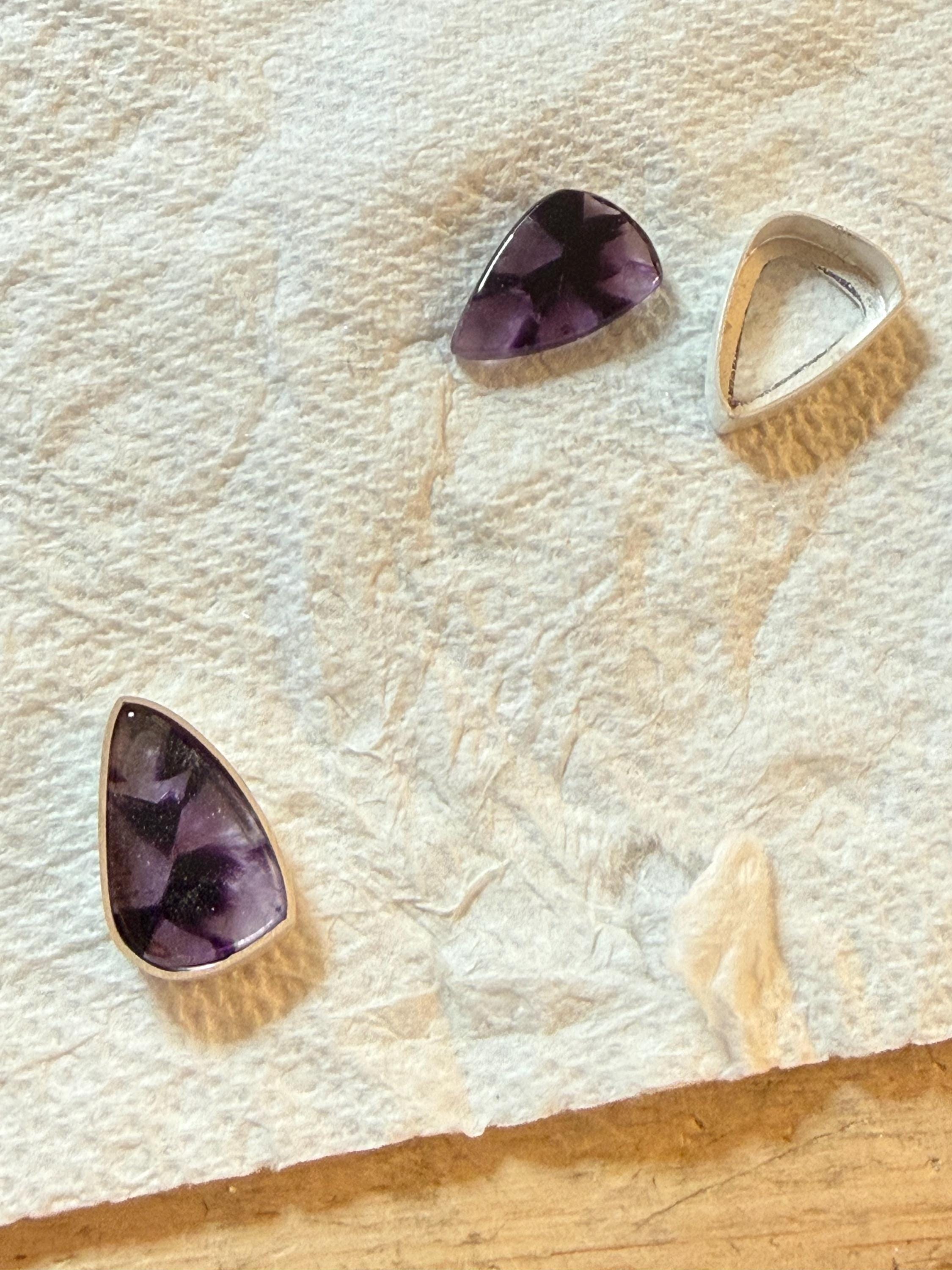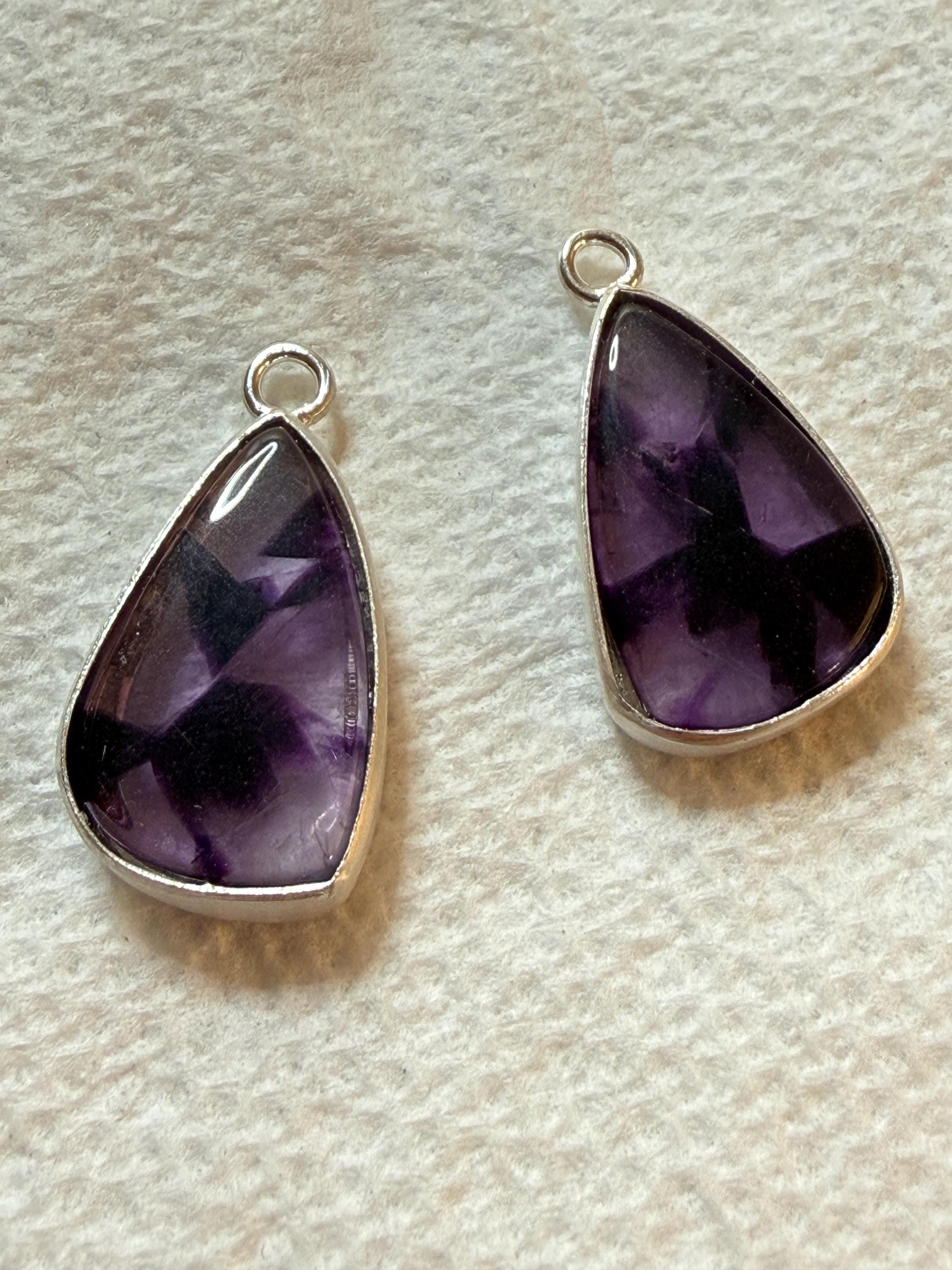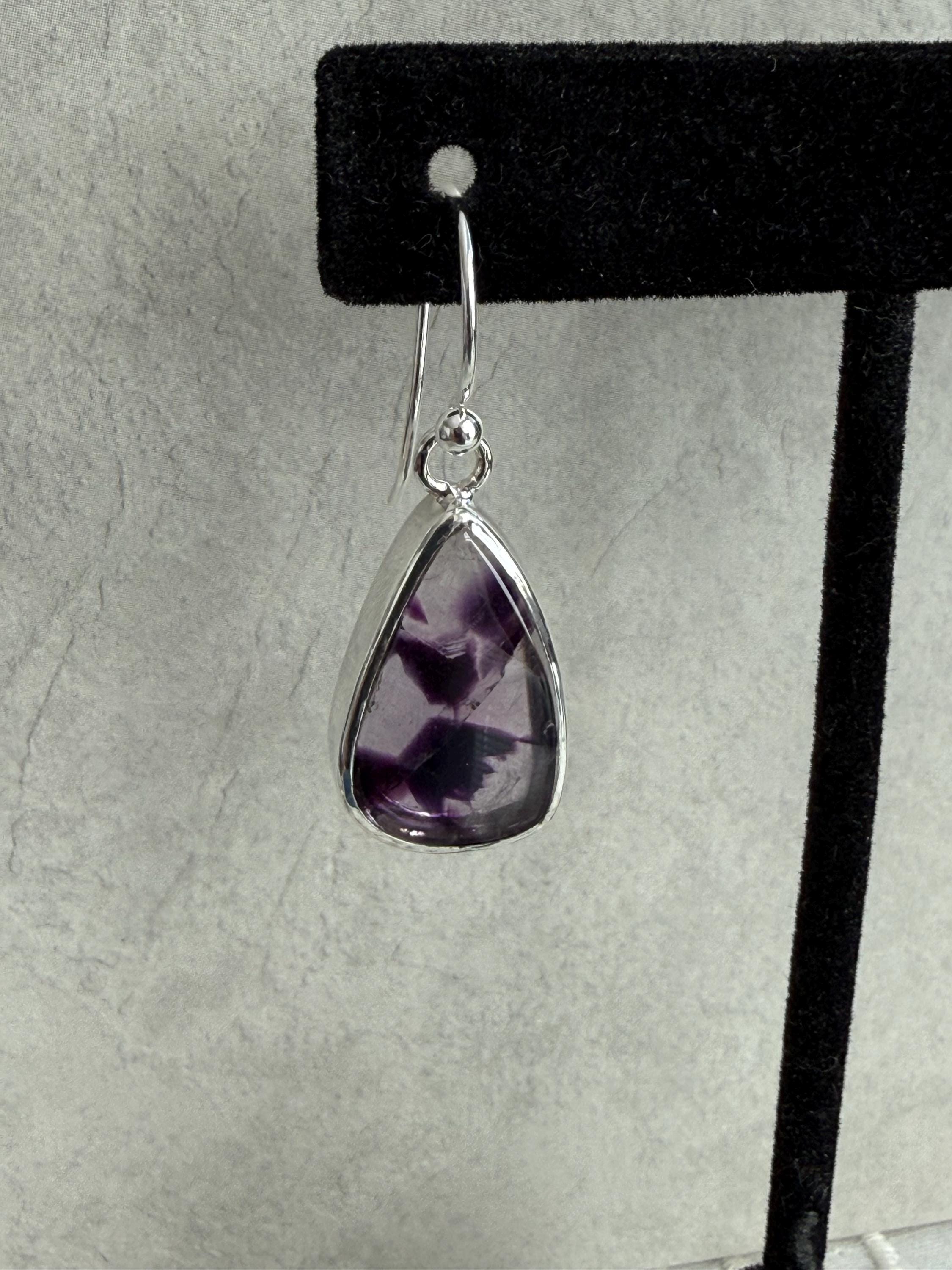 Every year I head to the gem shows in Tucson, and every year I come back with stones that are not on my bingo card! Trapiche amethyst was definitely not on my list, but I am so glad to have found them! Trapiche amethysts exhibit very distictive and unique color zoning. The rich deep velvety purples are bound by transparent faint purple fields. The stones are about 21x12.7mm each and they are set in handcrafted bezels of fine silver. They dangle from a pair of sterling silver ear wires, again, handcrafted. The backs of the bezels have been left open so that the patterns in the stones can be appreciated from both sides. The earrings measure approximately 1.5 inches from the top of the ear wire to the bottom of the dangle, and they're about half an inch at their widest point. These earrings are for pierced ears only; please note that earrings are not returnable/refundable.