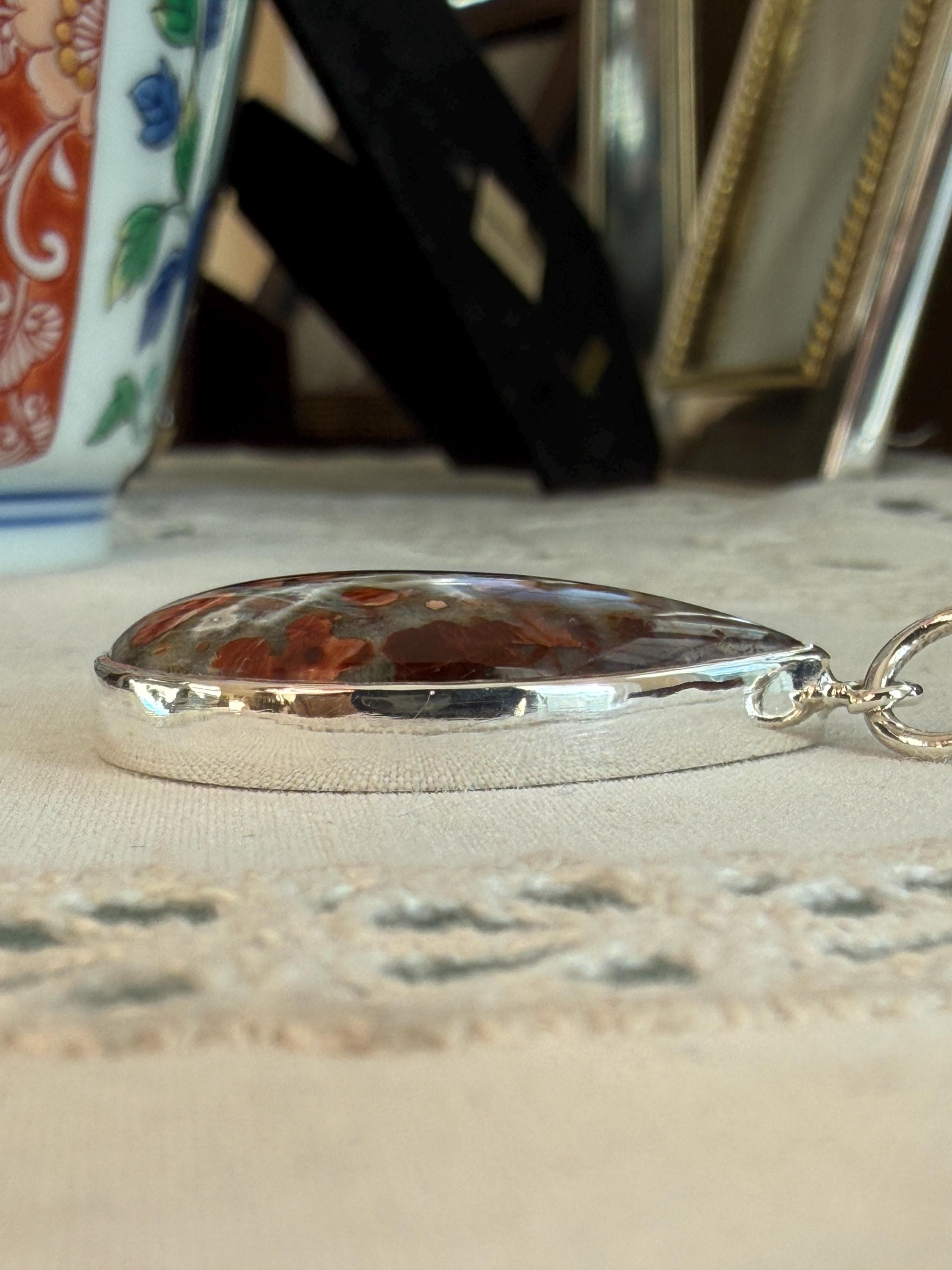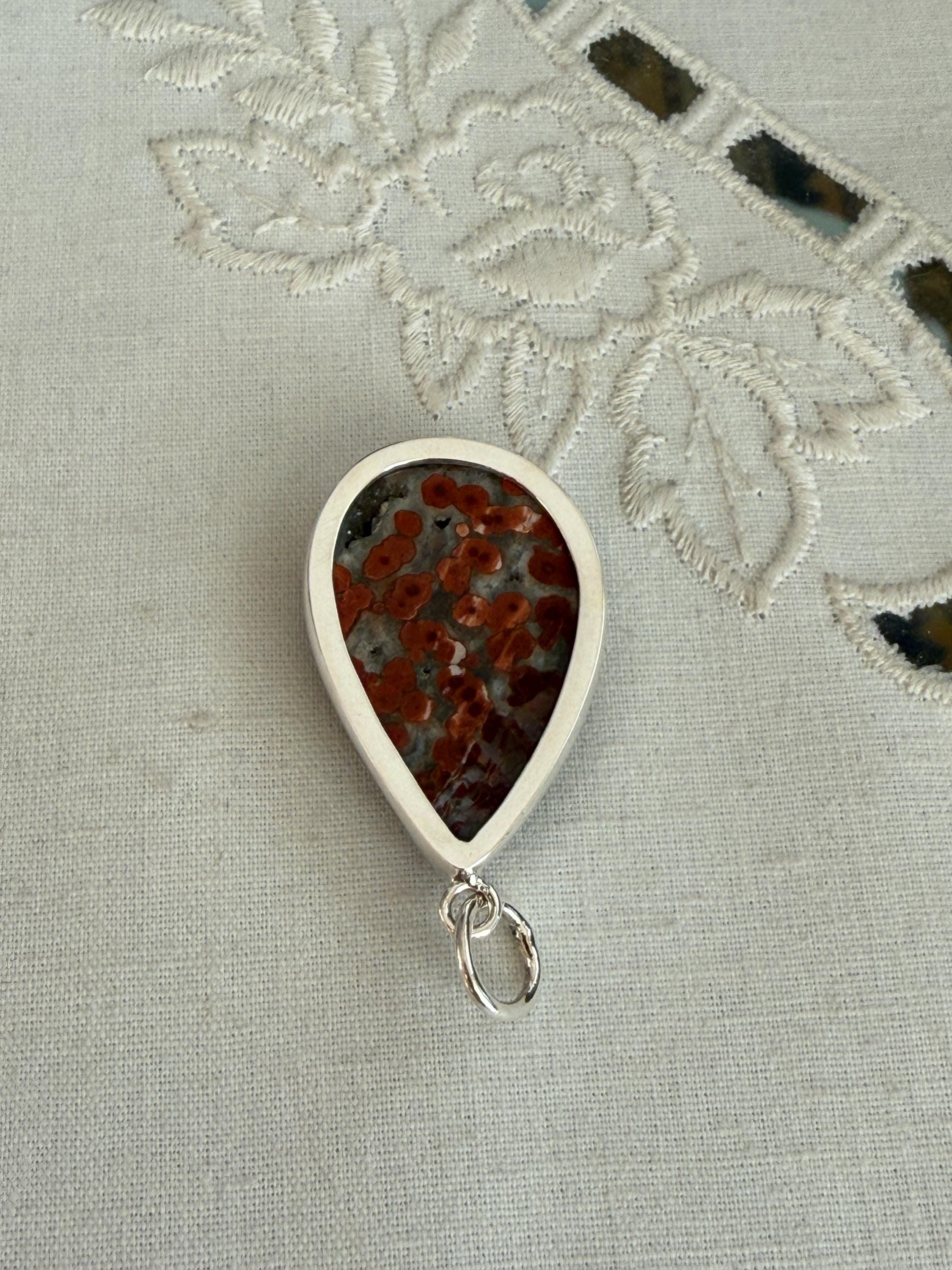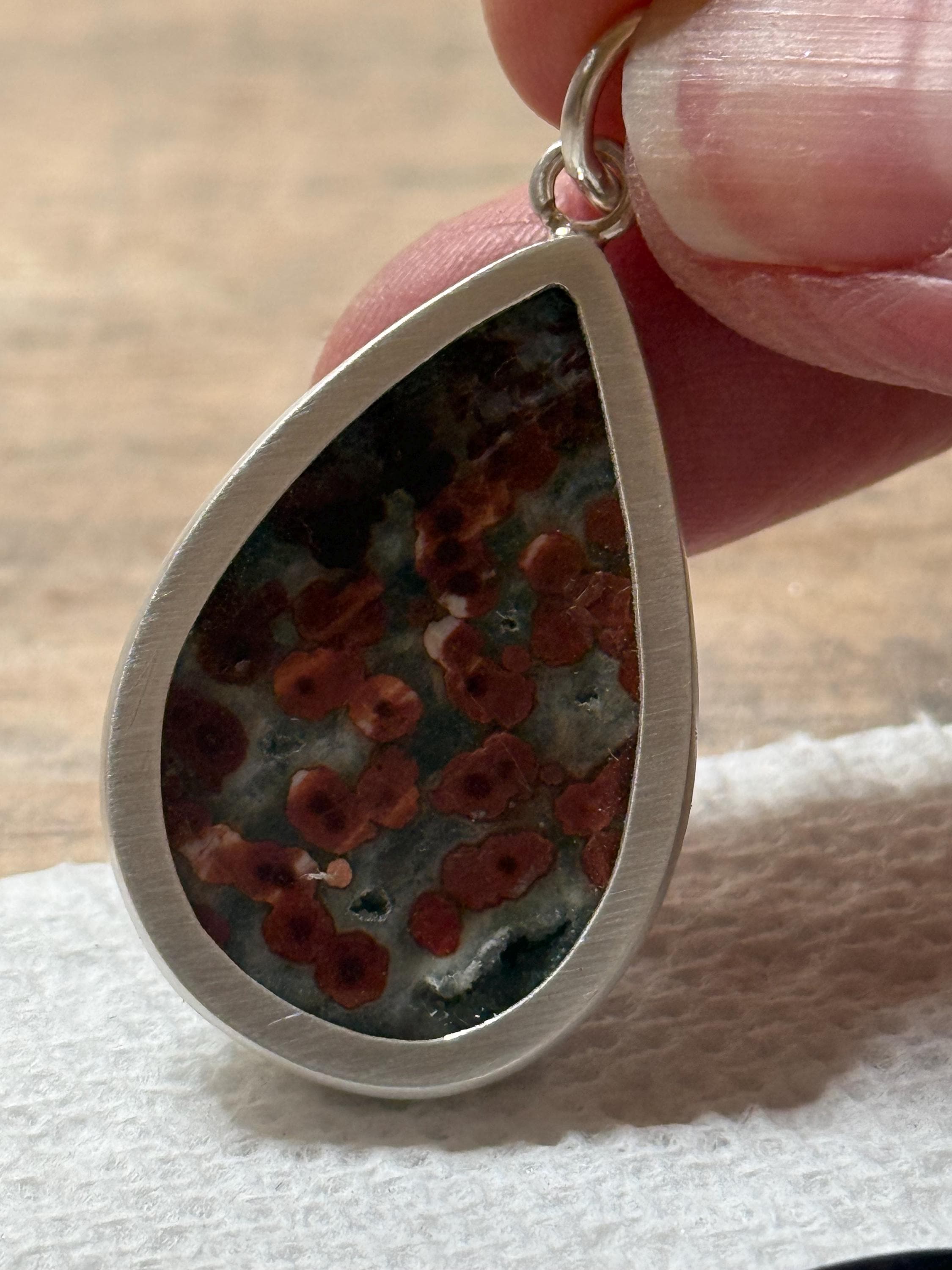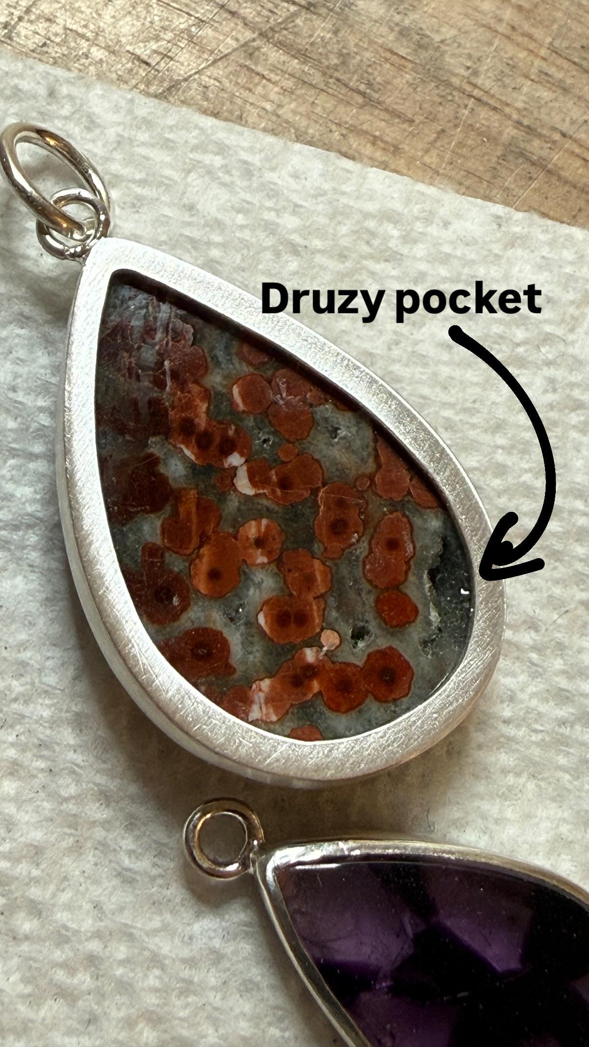 This gorgeous River Jasper pendant sits in a bezel of fine silver with a sterling silver bail. The stone was cut and polished by expert lapidary artist Greg Genovese and features pockets of drusy within the stone on the back side. The back of the setting has been left open to fully appreciate the the depth of the drusy. The colors are quite unique to this form of jasper, and include greys, brick reds, and touches of white. The stone has a very bohemian vibe to it, and has a ton of character. The setting is completely handmade by me, and the pendant measuresabout 44.8mm from the top of the bail to bottom of the pendant, and it's about 22.8mm wide. The pendant has a large bail opening, about 6.4mm wide so it will work with a variety of chain and cord sizes. This listing is for the pendant only and does not include a chain; the last photo shows this pendant on a Funky Five chain (SFF6) sold separately.
