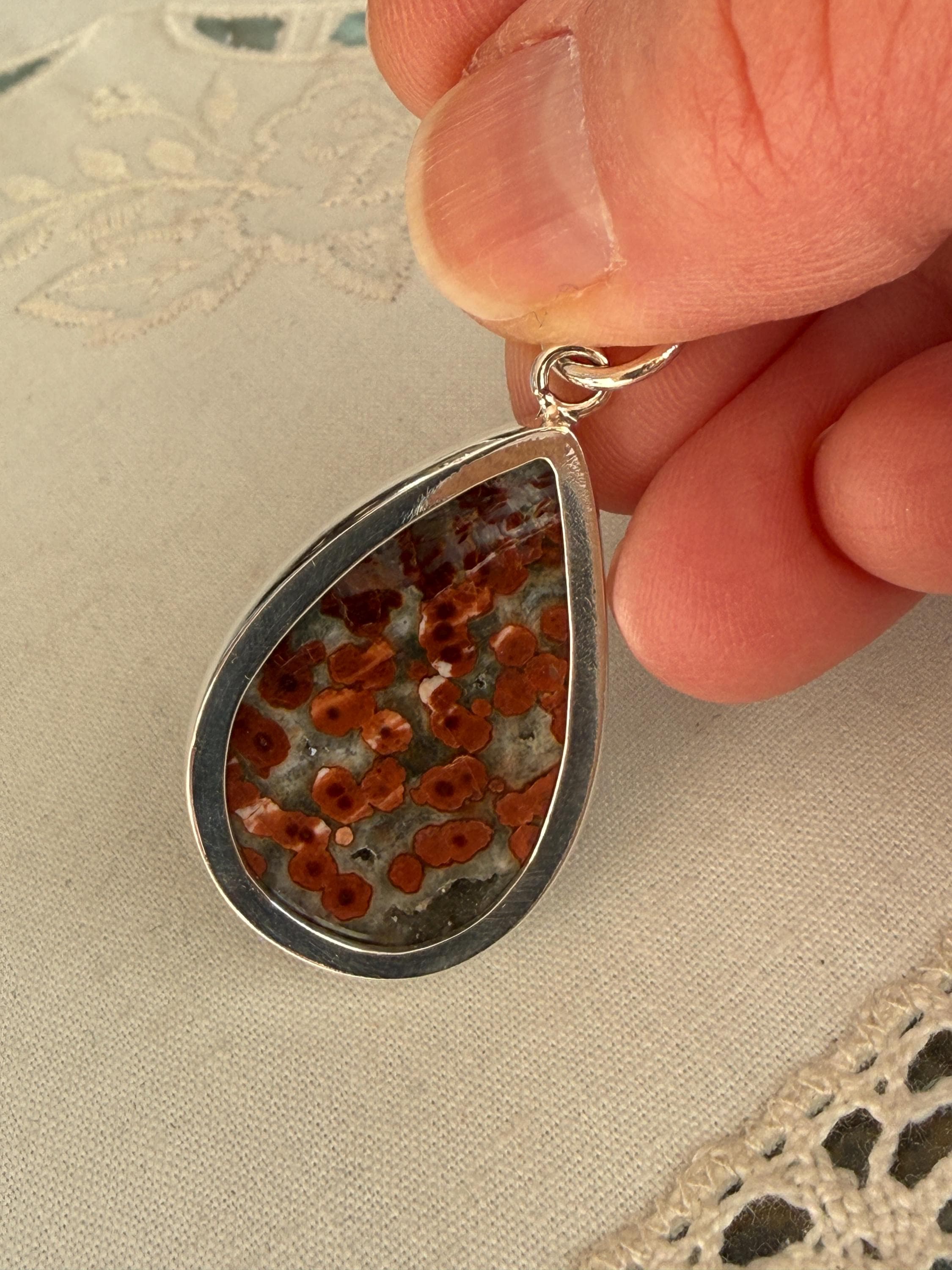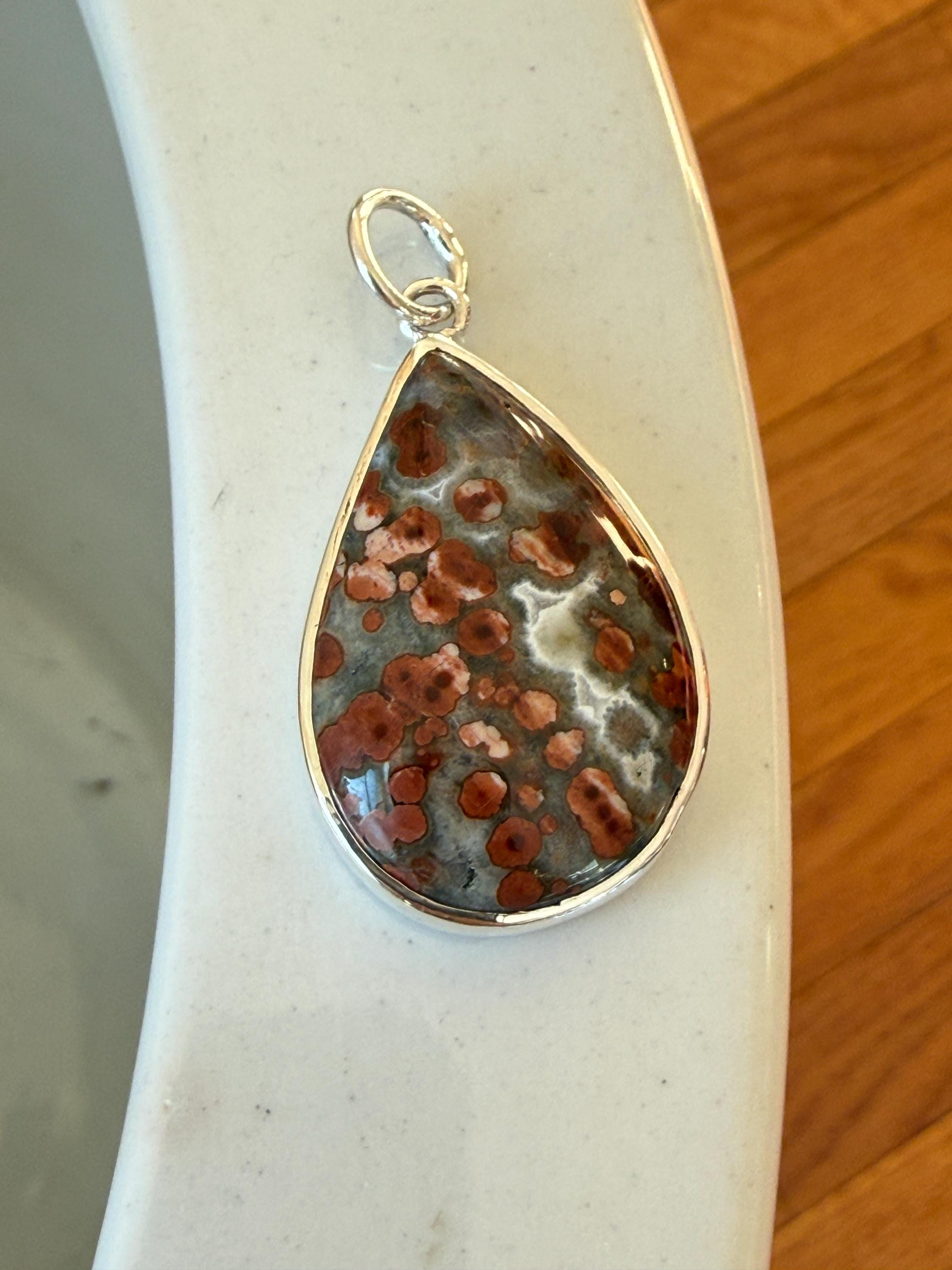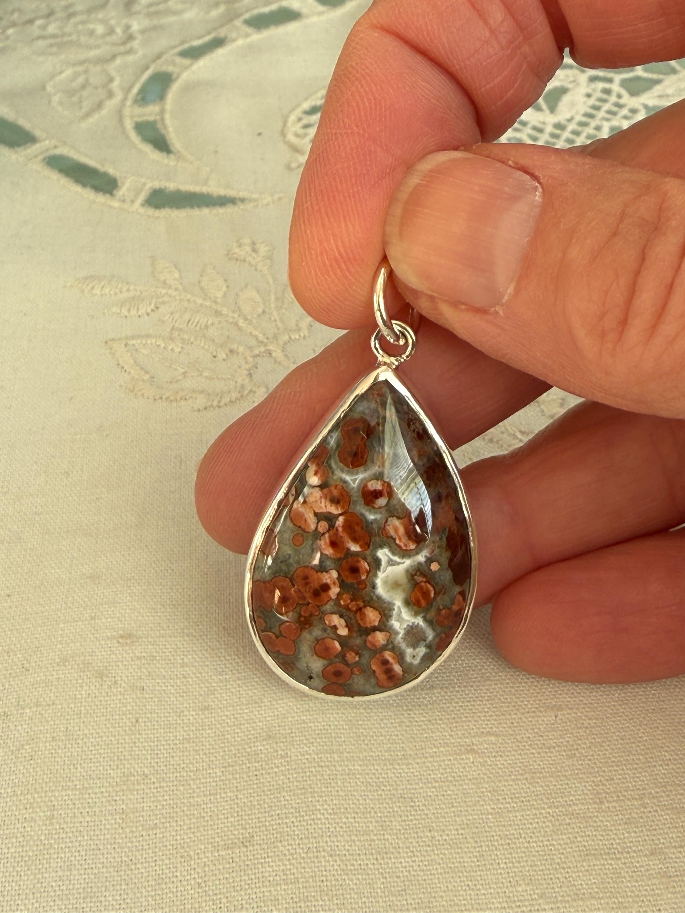 This gorgeous River Jasper pendant sits in a bezel of fine silver with a sterling silver bail. The stone was cut and polished by expert lapidary artist Greg Genovese and features pockets of drusy within the stone on the back side. The back of the setting has been left open to fully appreciate the the depth of the drusy. The colors are quite unique to this form of jasper, and include greys, brick reds, and touches of white. The stone has a very bohemian vibe to it, and has a ton of character. The setting is completely handmade by me, and the pendant measuresabout 44.8mm from the top of the bail to bottom of the pendant, and it's about 22.8mm wide. The pendant has a large bail opening, about 6.4mm wide so it will work with a variety of chain and cord sizes. This listing is for the pendant only and does not include a chain; the last photo shows this pendant on a Funky Five chain (SFF6) sold separately.