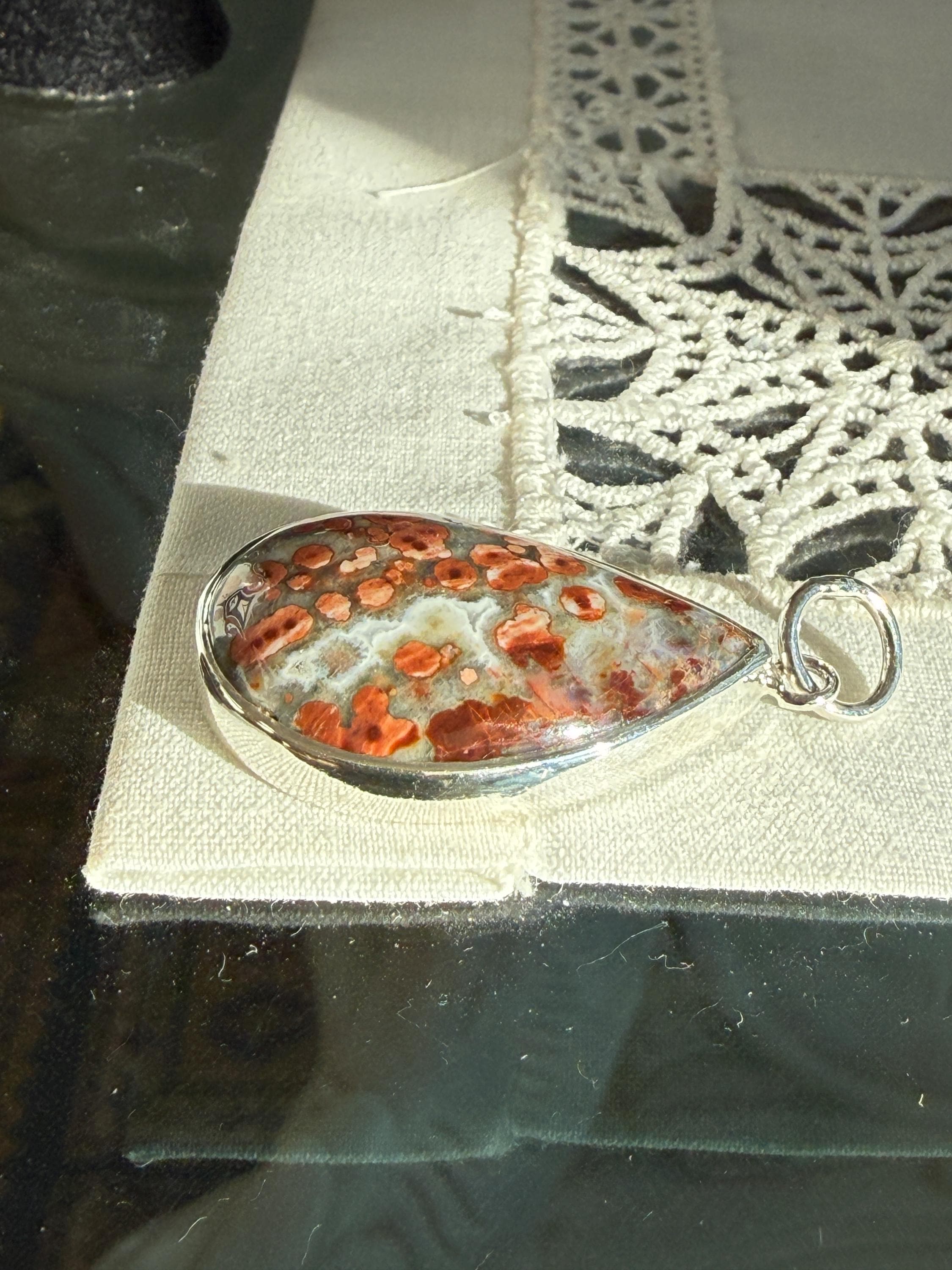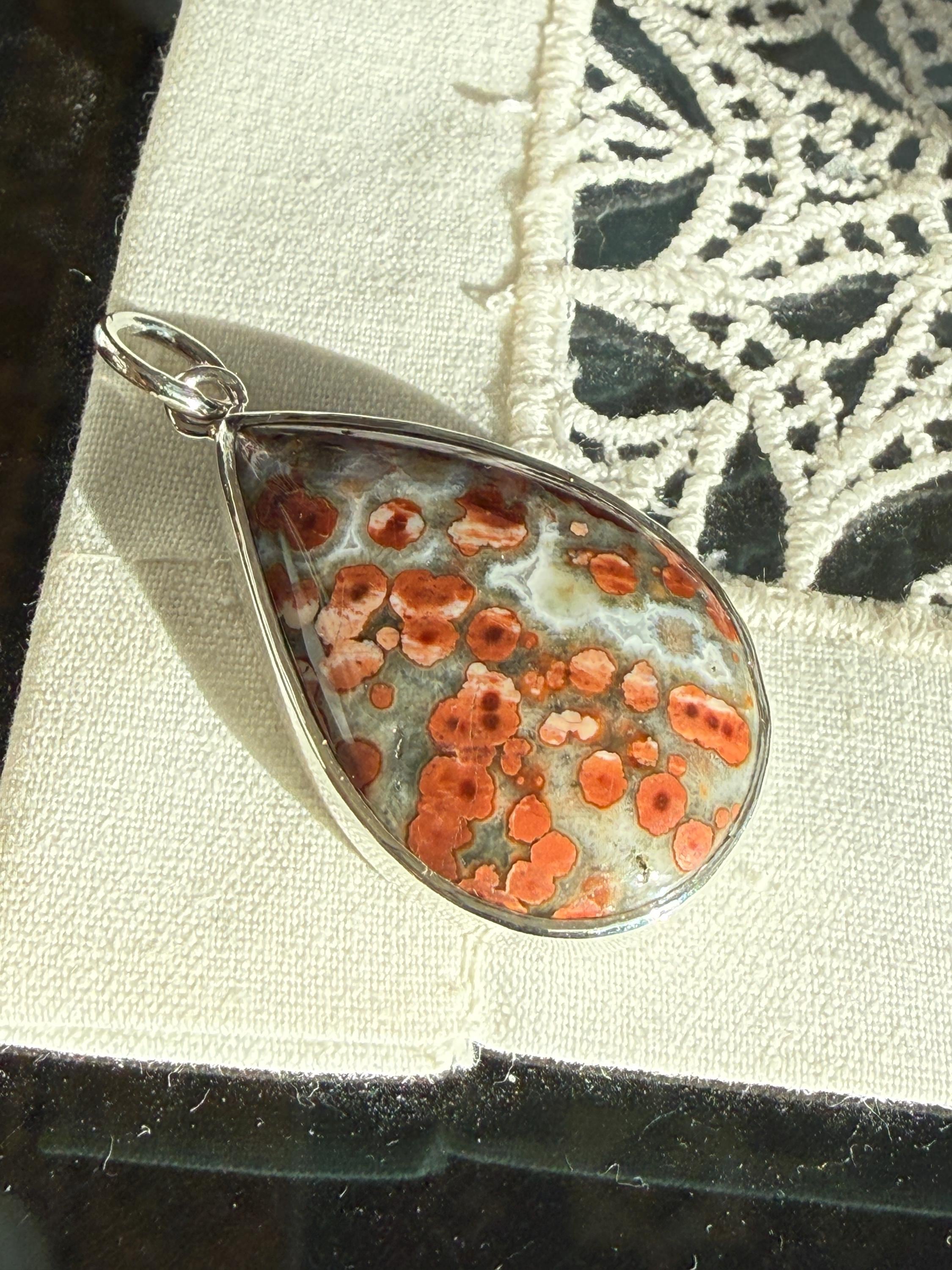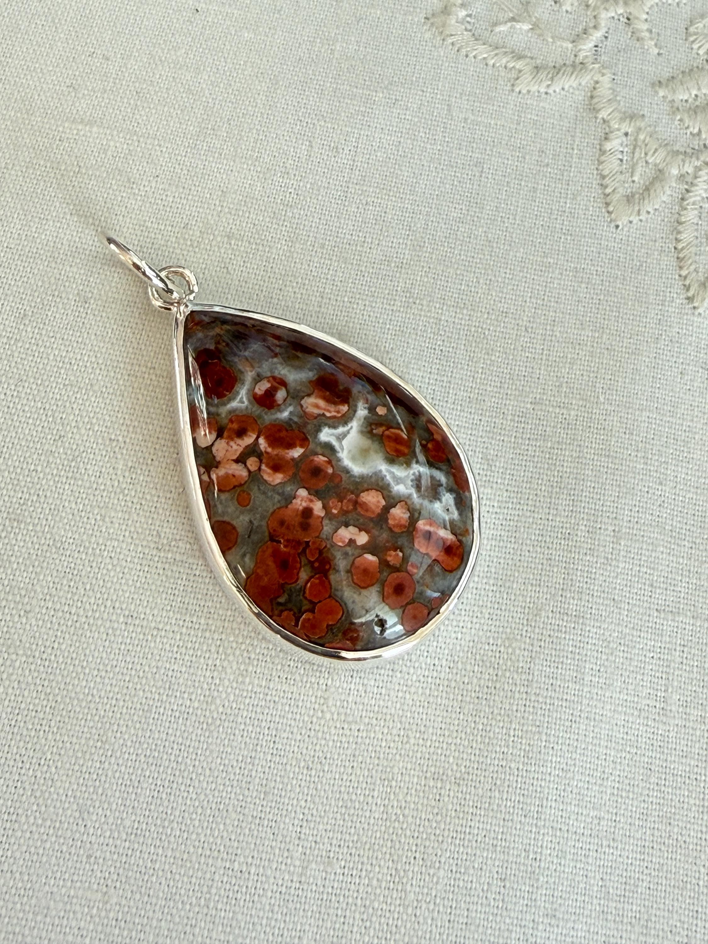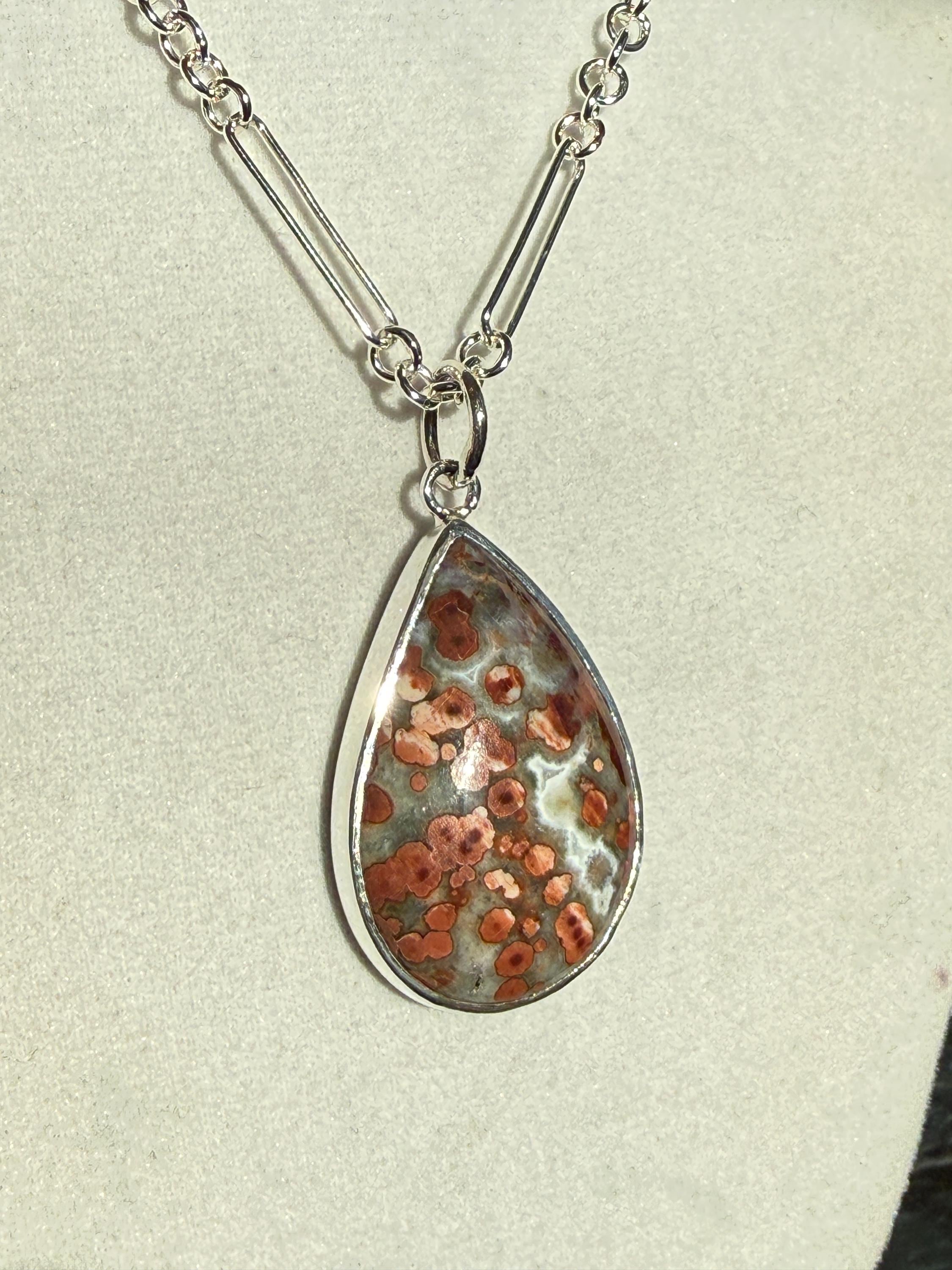 This gorgeous River Jasper pendant sits in a bezel of fine silver with a sterling silver bail. The stone was cut and polished by expert lapidary artist Greg Genovese and features pockets of drusy within the stone on the back side. The back of the setting has been left open to fully appreciate the the depth of the drusy. The colors are quite unique to this form of jasper, and include greys, brick reds, and touches of white. The stone has a very bohemian vibe to it, and has a ton of character. The setting is completely handmade by me, and the pendant measuresabout 44.8mm from the top of the bail to bottom of the pendant, and it's about 22.8mm wide. The pendant has a large bail opening, about 6.4mm wide so it will work with a variety of chain and cord sizes. This listing is for the pendant only and does not include a chain; the last photo shows this pendant on a Funky Five chain (SFF6) sold separately.
