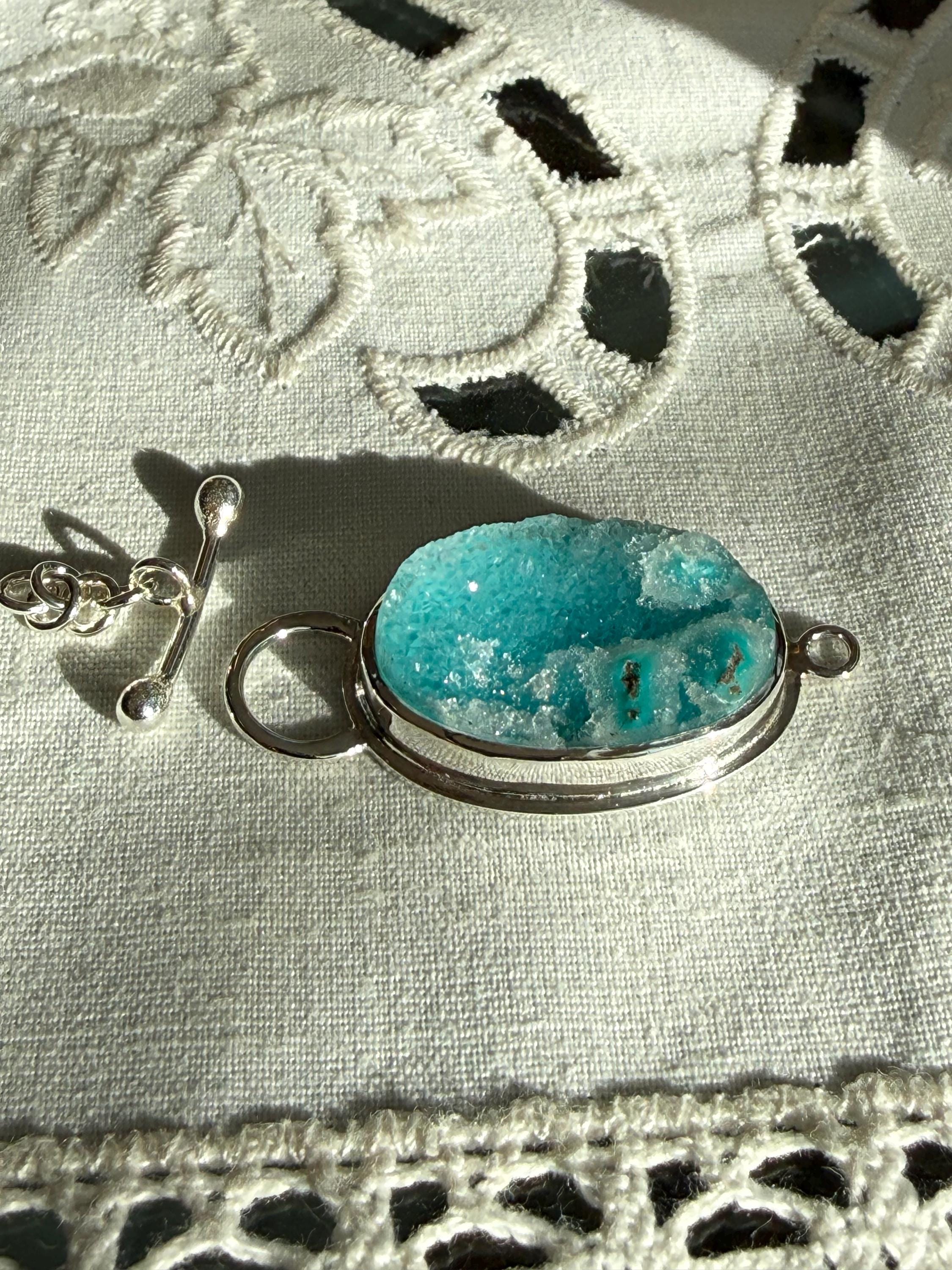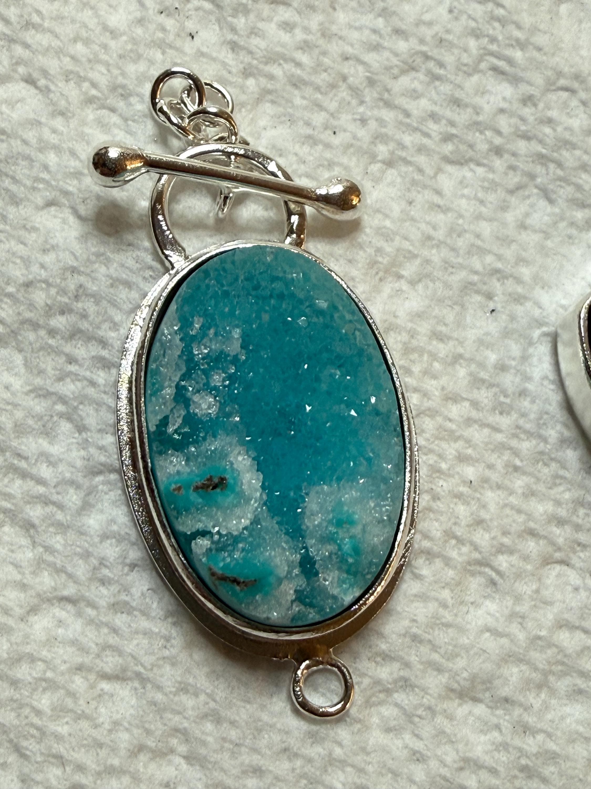 Are you searching for a unique clasp for your beads or pearls? Look no further than this fabulous drusy chrysocolla toggle clasp set in fine and sterling silver. Please note: this listing does not include a necklace, it is for the clasp alone. The piece is completely handcrafted by me in my small studio down the shore. The bezel and back plate are made of fine silver and the component rings and toggle with chain are done in sterling silver. The stone has incredible sparkling turquoise blue color with patches of white and black. The surface is very irregular which plays well against the defined oval shape. The piece measures about 38.3 x 19.3 mm and the toggle is about 1.5 inches long. The clasp will add just under two inches of length to your necklace. Please feel free to reach out with any questions about stringing with this clasp! I am happy to recommend stringing supplies and support (I don't offer supplies like needle and thread).