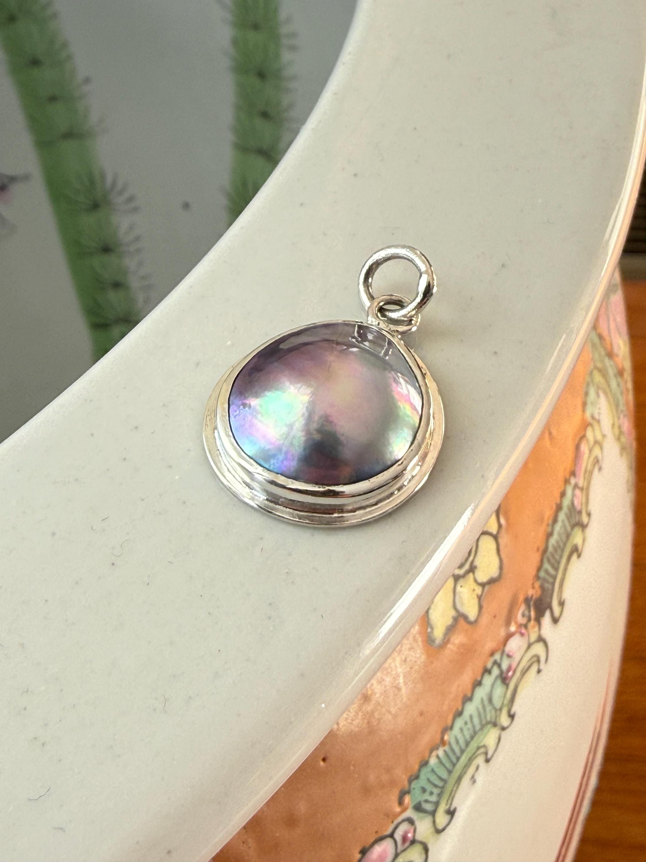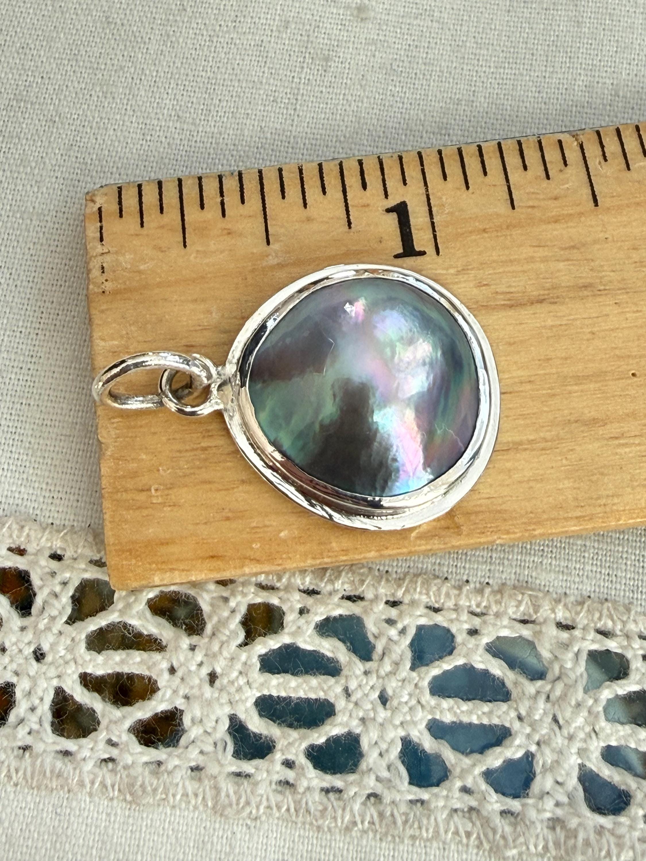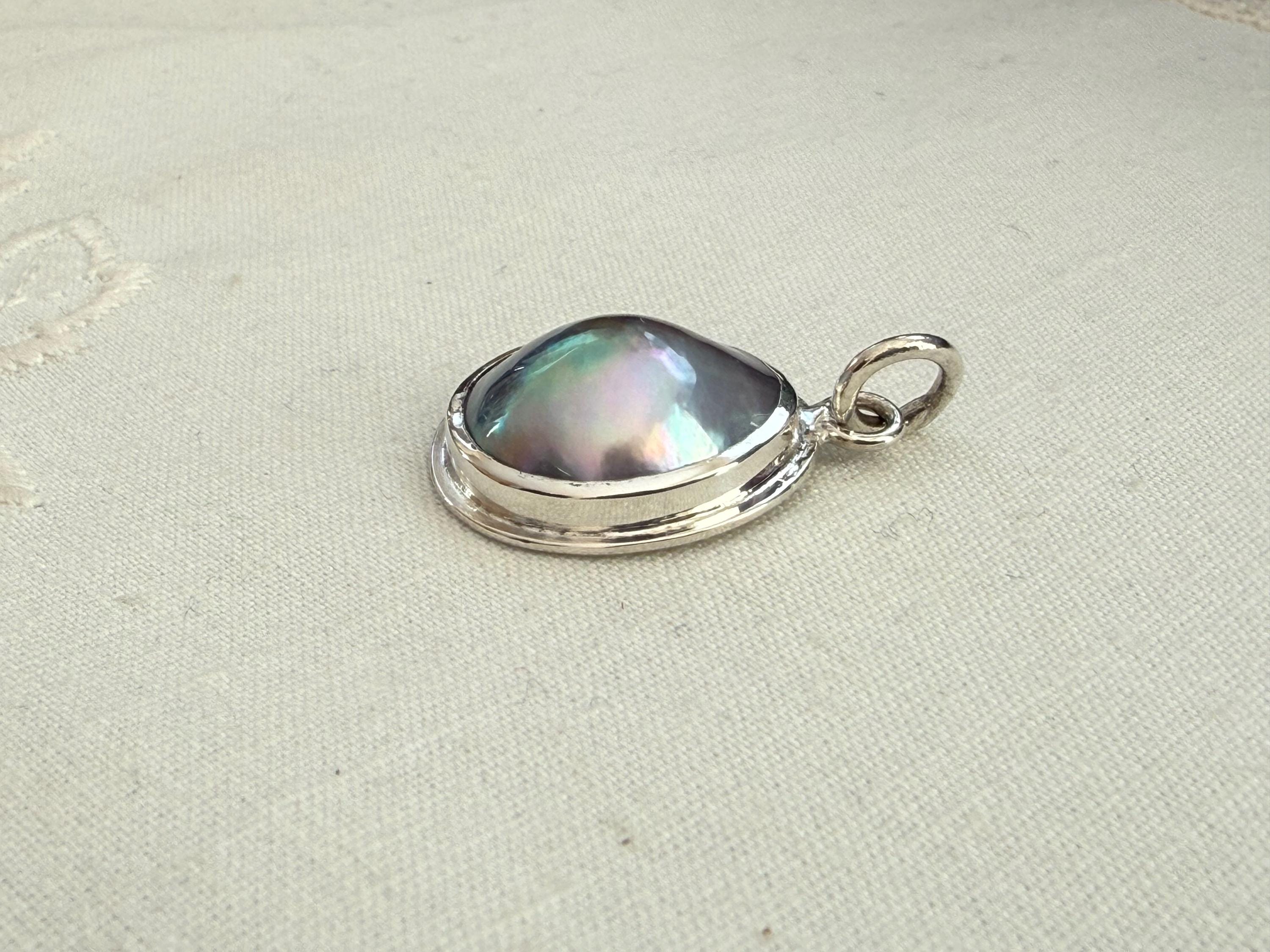 A gorgeous rainbow glow emanates from this free form oval Sea of Cortez mabe pearl (cultured) pendant set into a handmade bezel of fine silver with a bail of sterling silver. The pendant bail has a large opening (~5.4mm) to accommodate a thicker chain or cord. The mabe has some slight surface rippling and mottling, and the luster is quite nice; however, the true beauty of this pendant is the incredible color shift of the pearl. It is stunning. The color of the mabe cultured pearl is completely natural and a super example of the rainbow overtone unique to Sea of Cortez pearls, which happen to be fair trade certified. These gems are also fully traceable, grown by one farm in the Sea of Cortez, Mexico. This pendant was made using recycled fine and sterling silver. It measures about 29.9mm from top to bottom, and about 19.4mm wide. Please note this listing is for the pendant only and does not include a chain. The pendant in these photos is the exact one you will receive. Also note, the last photo shows a similar pendant, sold separately.