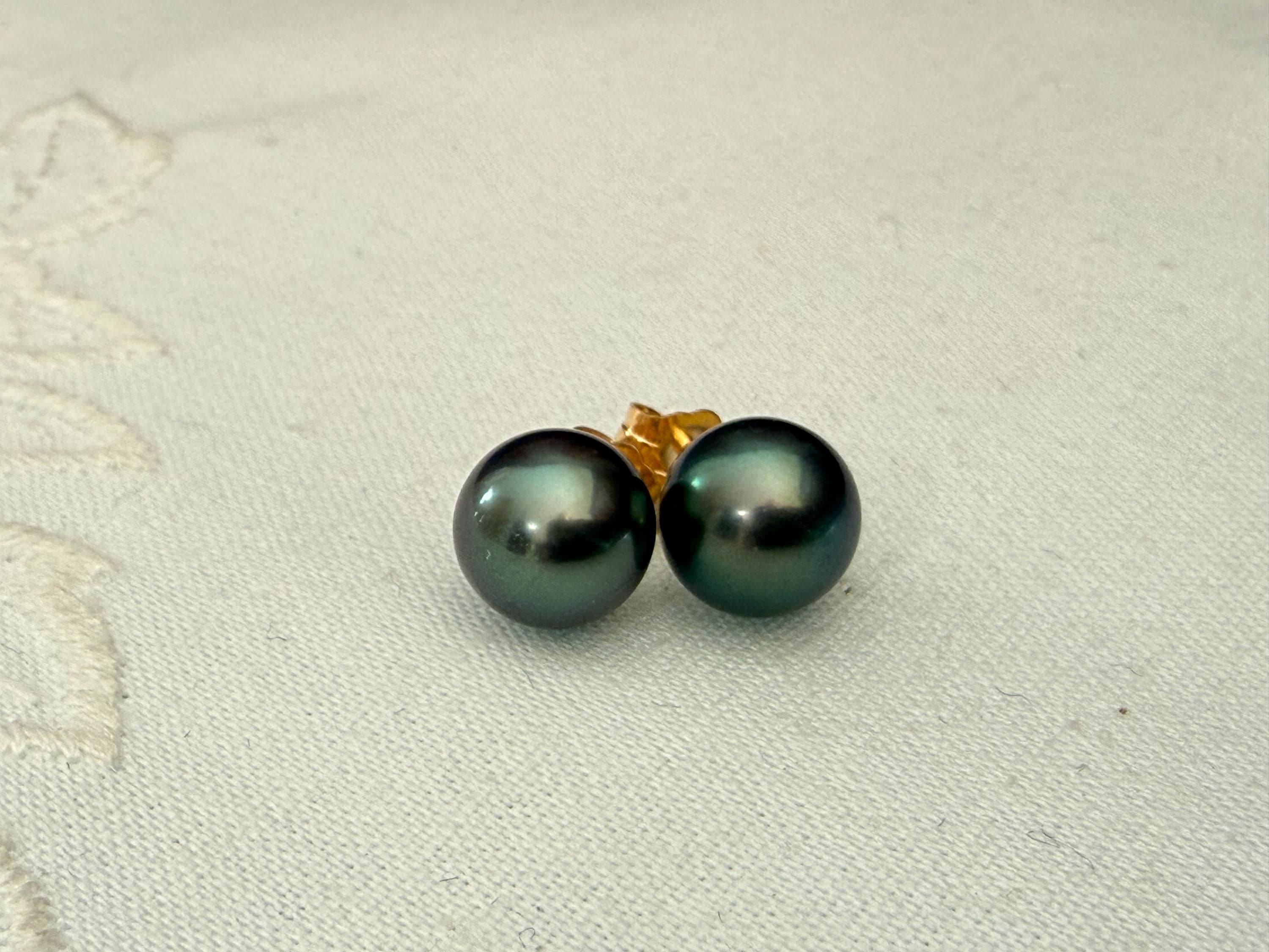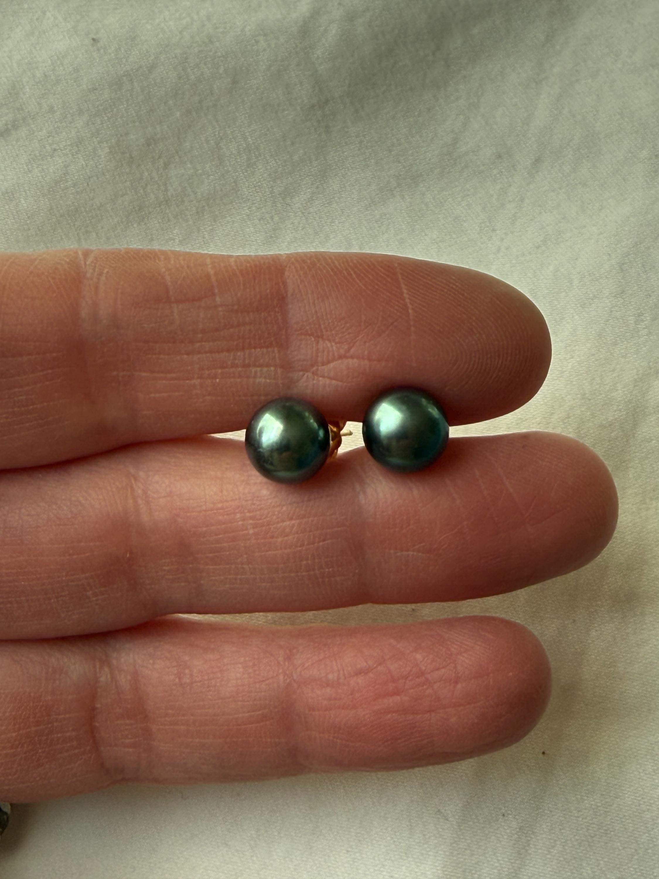 A gorgeous pair of classic teal colored cultured Tahitian pearl stud earrings set in 18k yellow gold really does need to be in everyone's jewelry wardrobe. This pair feature dark teal green cultured pearls with very subtle pink overtone and measure 8.4/8.3mm. The pearls have very very minimal blemishing, and excellent luster. The photos in this listing are of the actual pair you will receive.