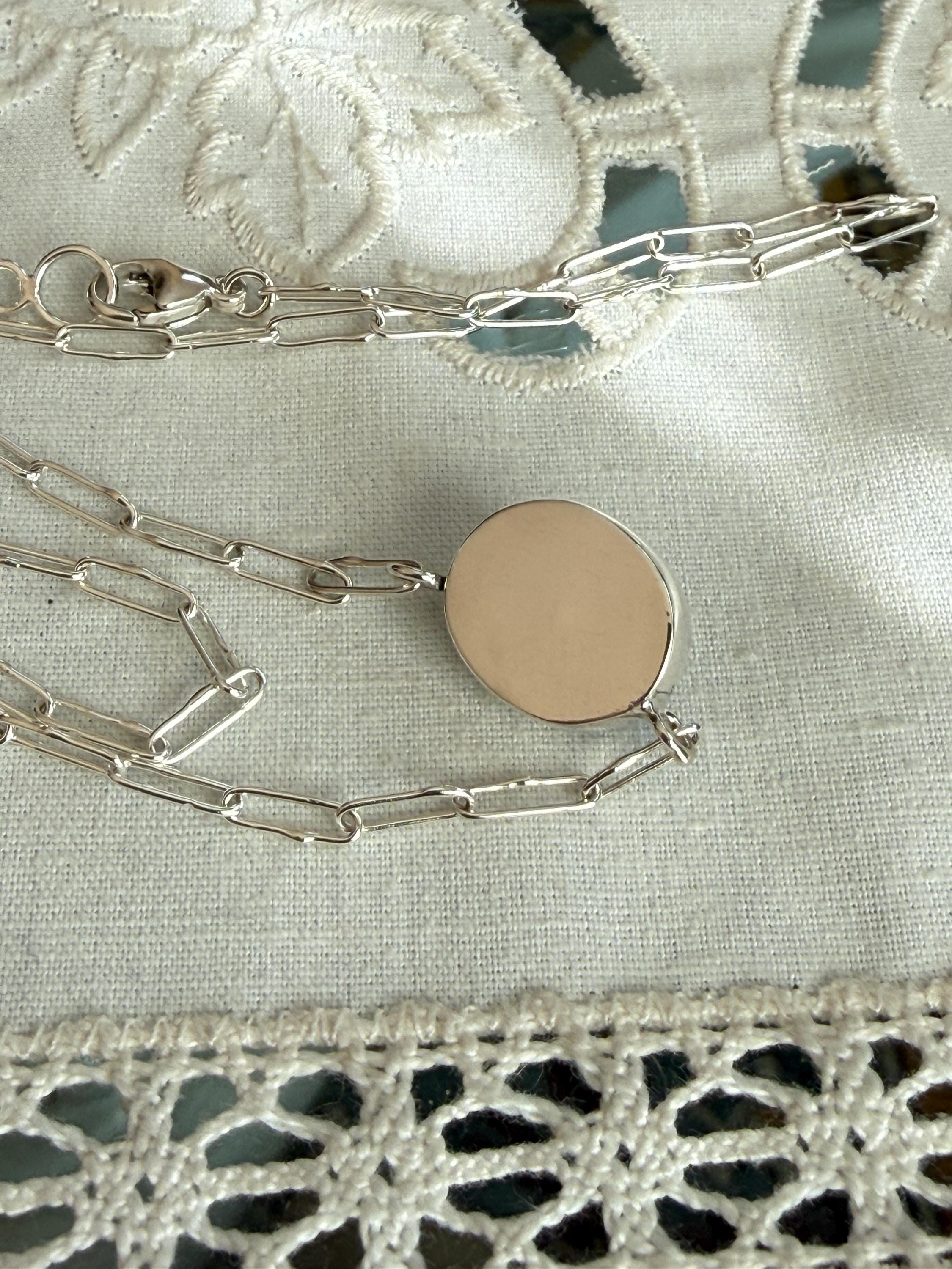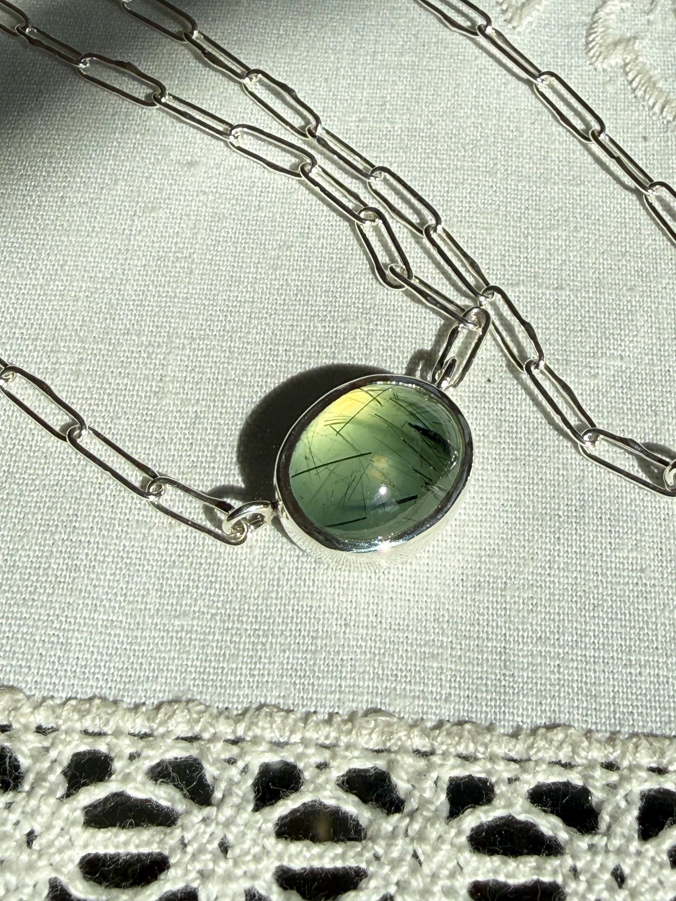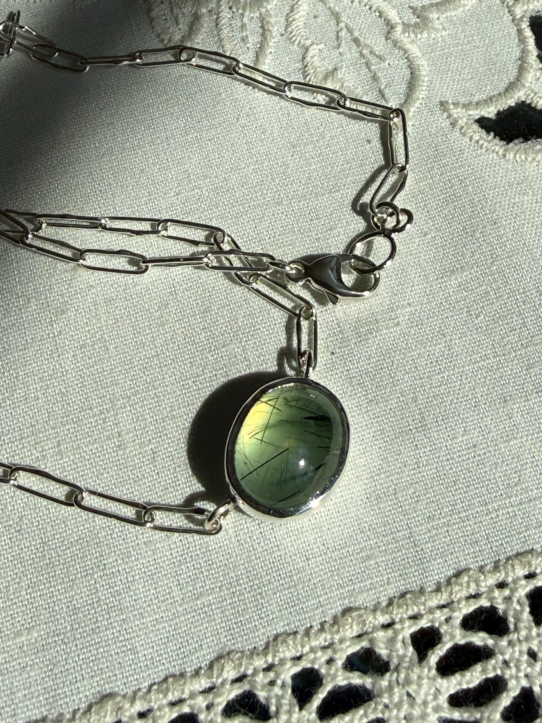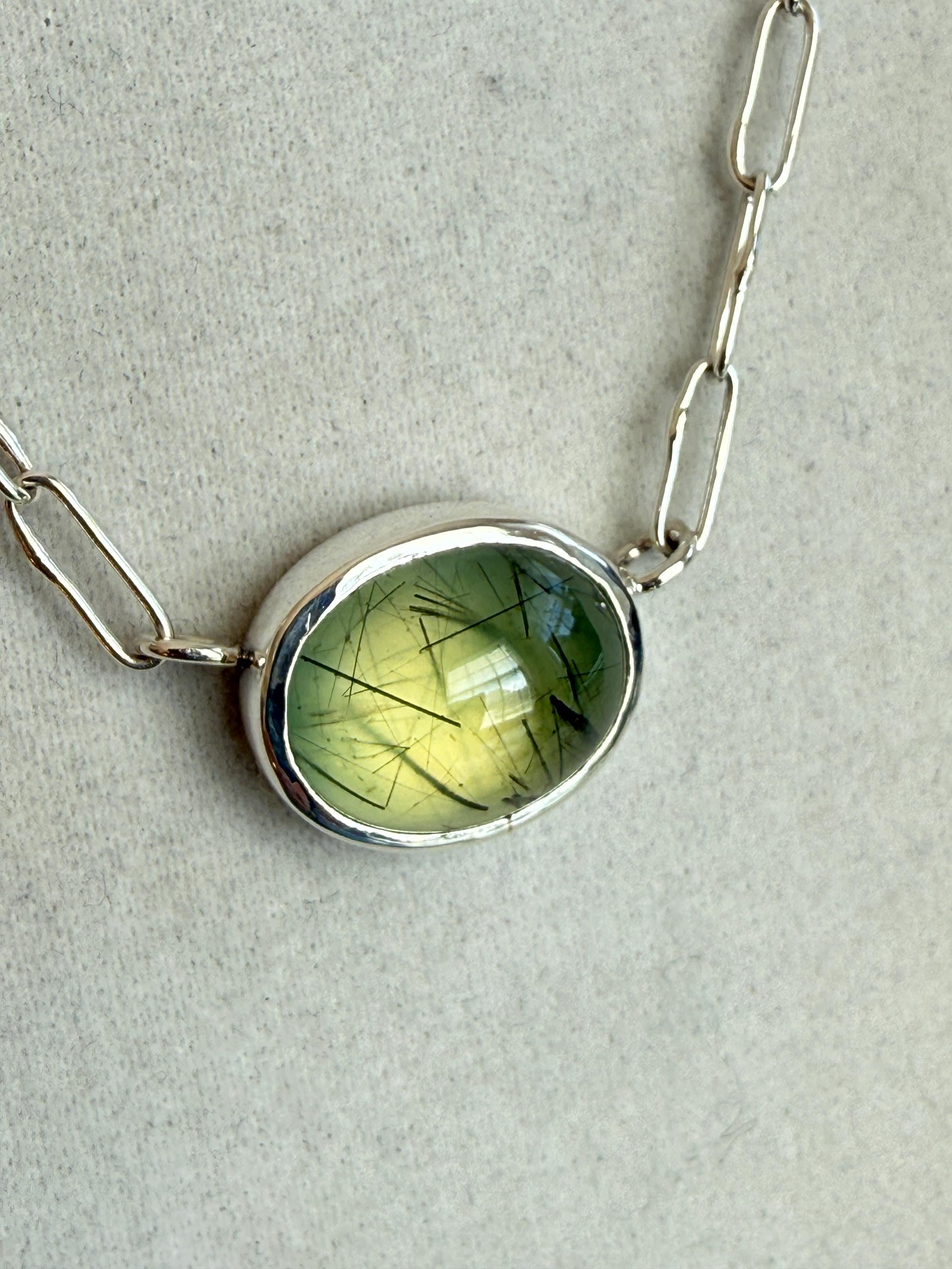 Prehnite Bella Beans necklace in silver. A beautiful soft spring green luscious oval prehnite cabochon bezel set in fine silver and attached to a small Funky Link chain in sterling silver. The necklace is about 18 inches long and is finished with a lobster clasp. I make these chains completely by hand, one link at a time (the lobster clasp is machine made). The prehnite weighs approximately 9cts, measures 11.7x14.3 mm, and has pastel green coloring with distinctive black rutile inclusions, giving the small stone very big character. The color is soft spring green with a golden glow, and there are visible inclusions in the stone. The bezel setting is made of fine silver and hand fabricated to fit the stone. The back of the setting is closed and it is permanently attached to the chain. The necklace is adjustable since the lobster clasp can be used on any of the links. Necklace length is measured end to end. Please note the last two photos and video show this necklace with a larger one (sold separately). This listing is for the smaller necklace only and does not include the second necklace.