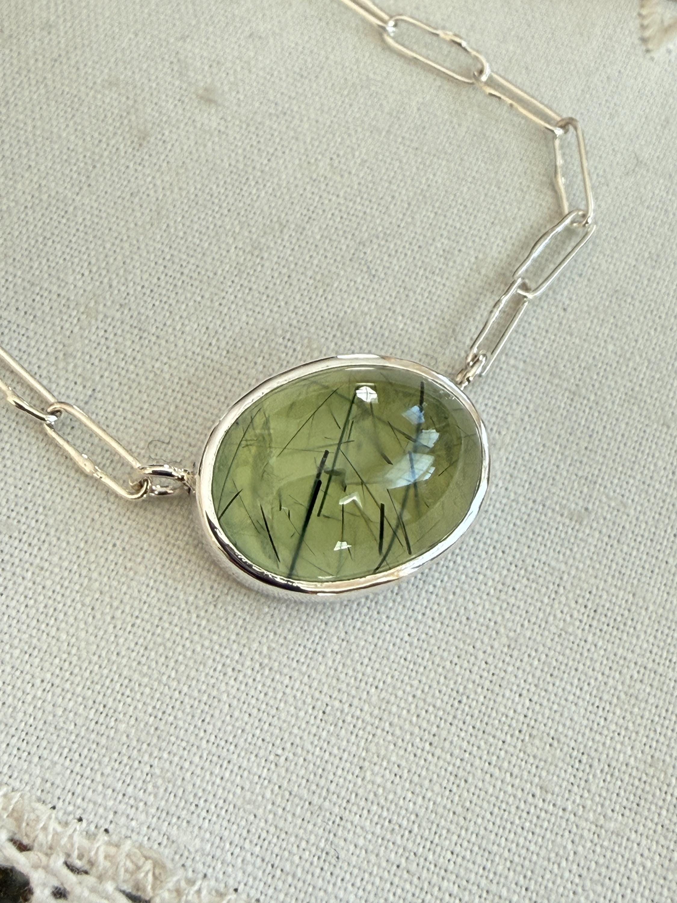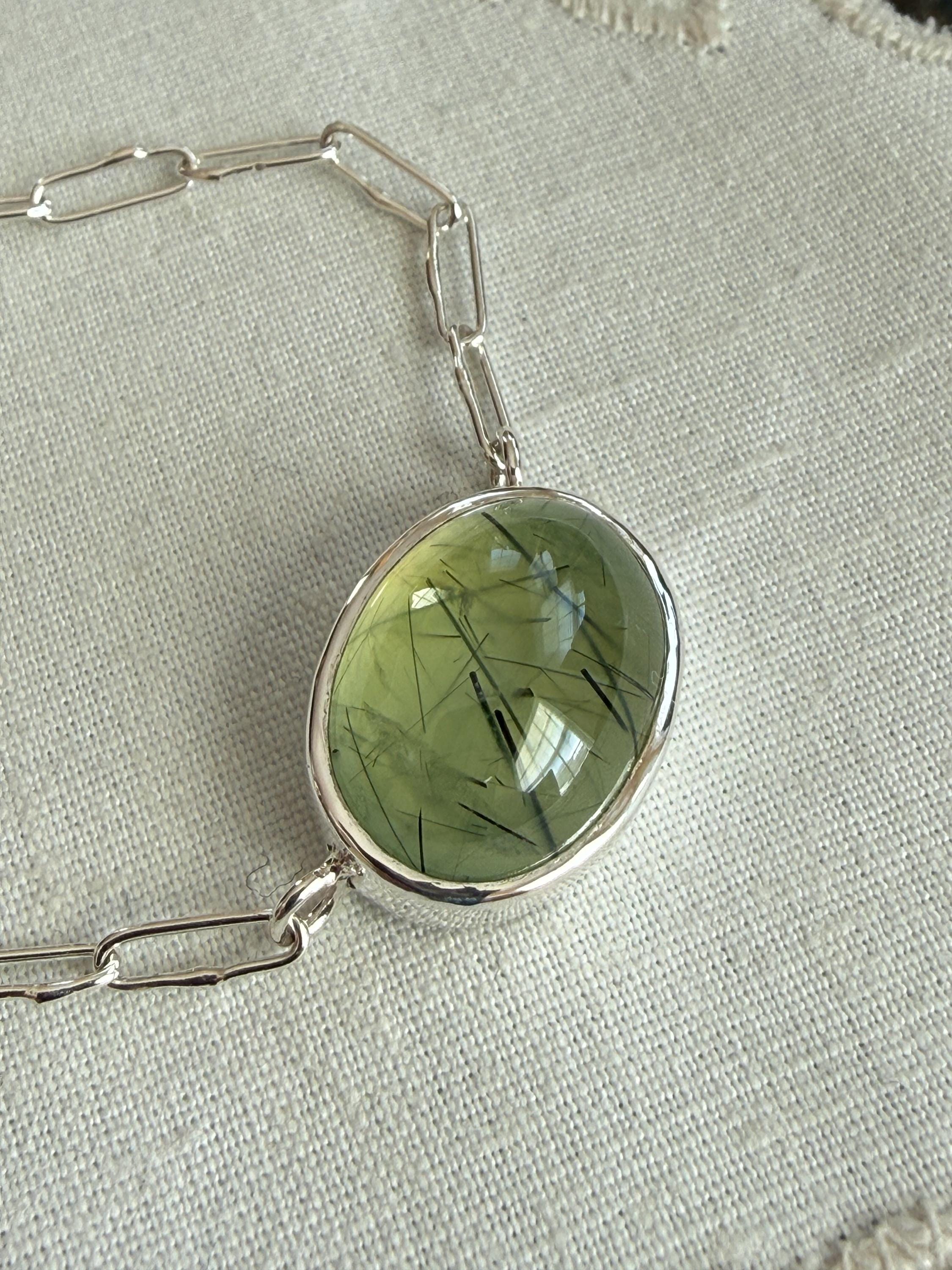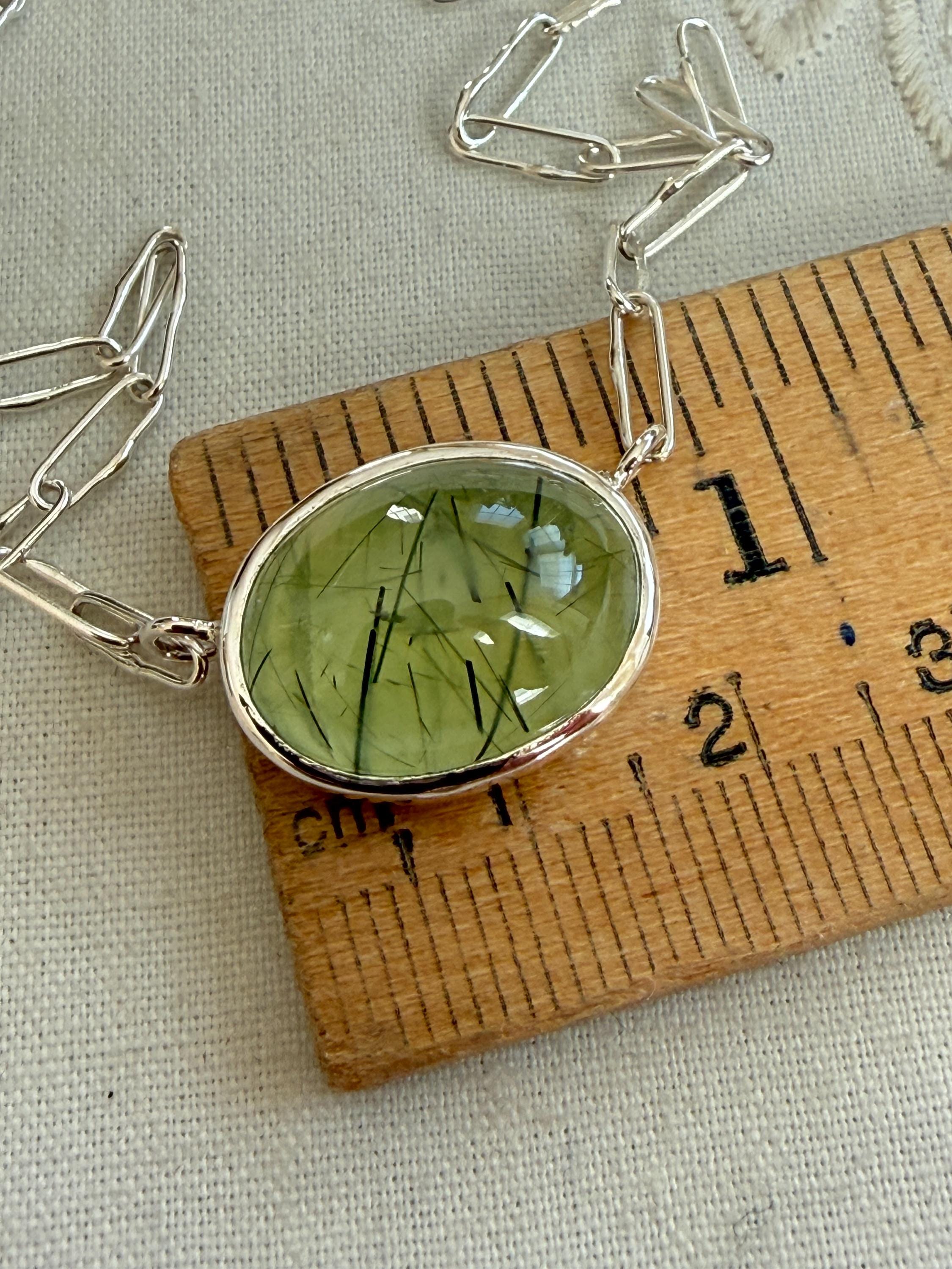 Prehnite Bella Beans necklace in silver. A beautiful soft spring green luscious oval prehnite cabochon bezel set in fine silver and attached to a small Funky Link chain in sterling silver. The necklace is about 19 inches long and is finished with a lobster clasp. I make these chains completely by hand, one link at a time (the lobster clasp is machine made). The prehnite weighs approximately 14cts, measures 12.6x16.7 mm, and has pastel green coloring with distinctive black rutile inclusions, giving the stone very big character. The color is soft spring green with a golden glow, and there are visible inclusions in the stone. The bezel setting is made of fine silver and hand fabricated to fit the stone. The back of the setting is closed and it is permanently attached to the chain. The necklace is adjustable since the lobster clasp can be used on any of the links. Necklace length is measured end to end. Please note the last two photos show this necklace with a smaller one (sold separately). This listing is for the larger necklace only and does not include the second necklace.