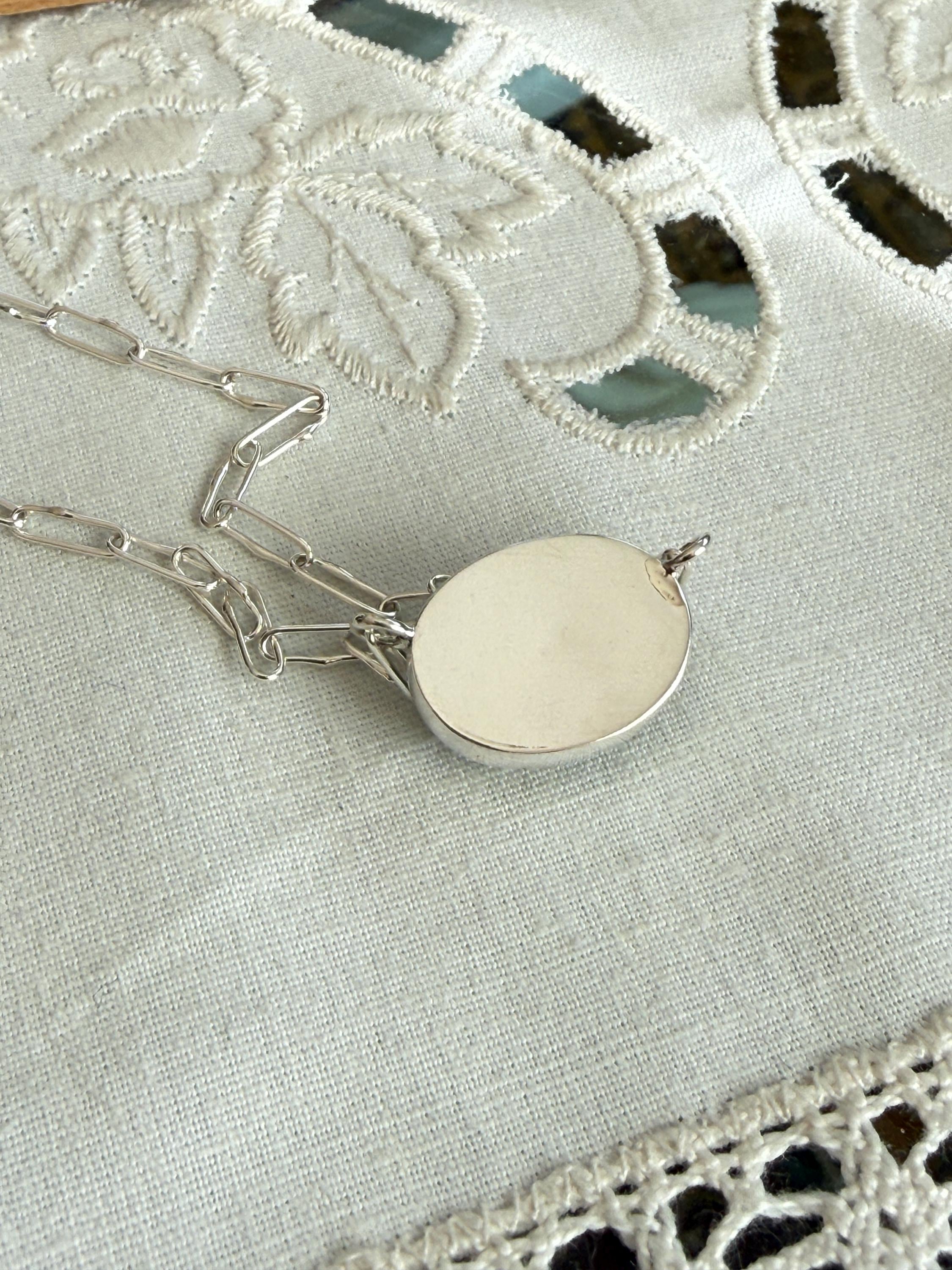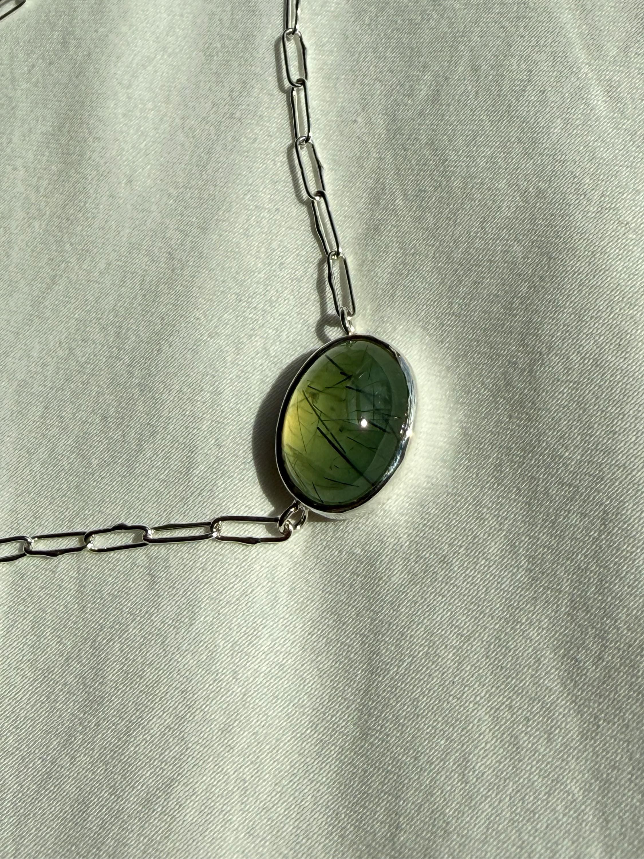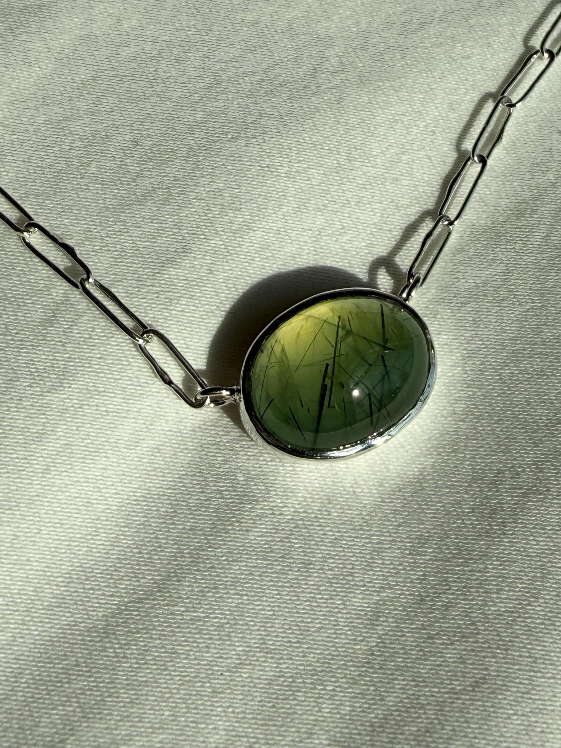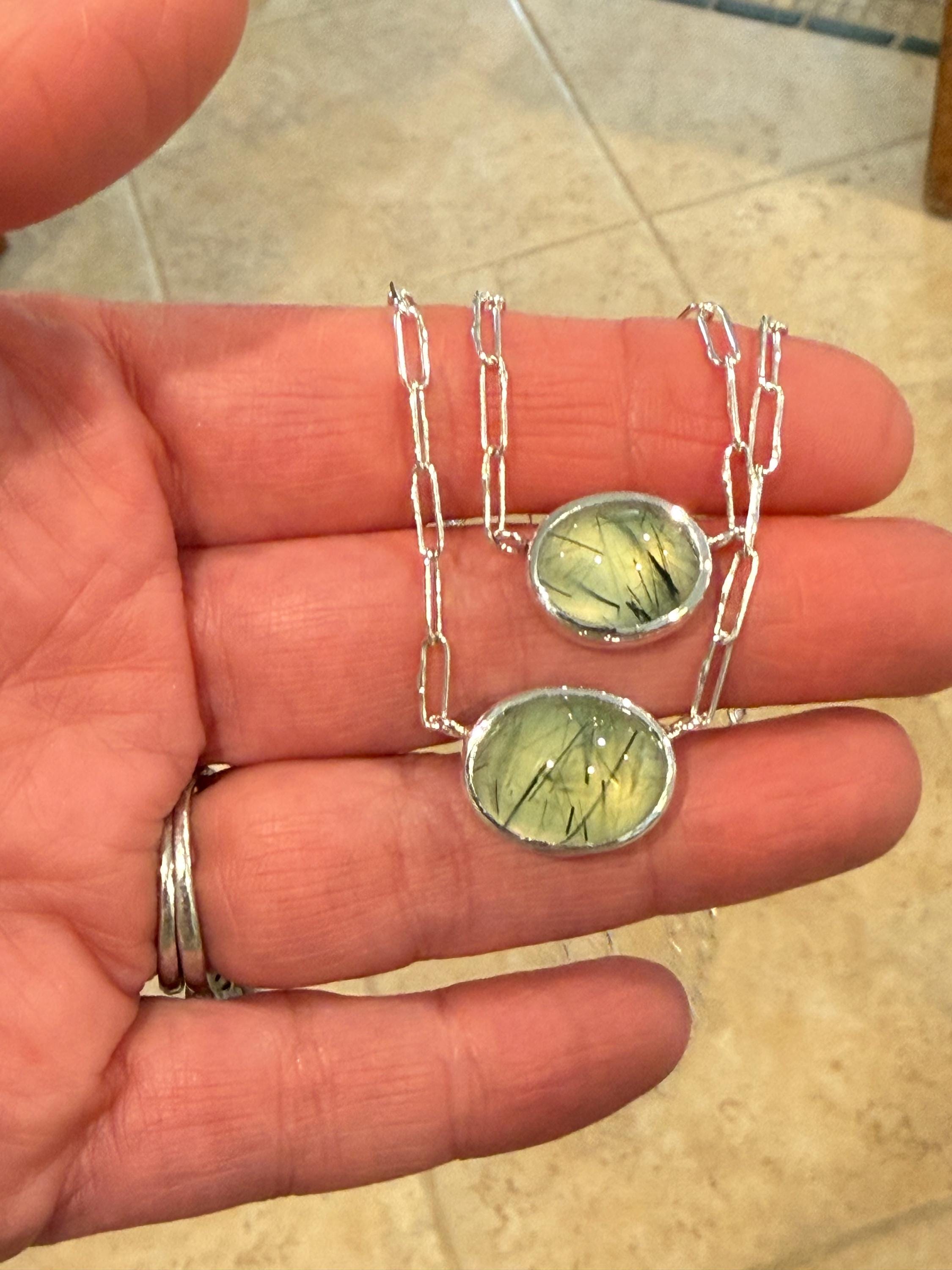 Prehnite Bella Beans necklace in silver. A beautiful soft spring green luscious oval prehnite cabochon bezel set in fine silver and attached to a small Funky Link chain in sterling silver. The necklace is about 19 inches long and is finished with a lobster clasp. I make these chains completely by hand, one link at a time (the lobster clasp is machine made). The prehnite weighs approximately 14cts, measures 12.6x16.7 mm, and has pastel green coloring with distinctive black rutile inclusions, giving the stone very big character. The color is soft spring green with a golden glow, and there are visible inclusions in the stone. The bezel setting is made of fine silver and hand fabricated to fit the stone. The back of the setting is closed and it is permanently attached to the chain. The necklace is adjustable since the lobster clasp can be used on any of the links. Necklace length is measured end to end. Please note the last two photos show this necklace with a smaller one (sold separately). This listing is for the larger necklace only and does not include the second necklace.