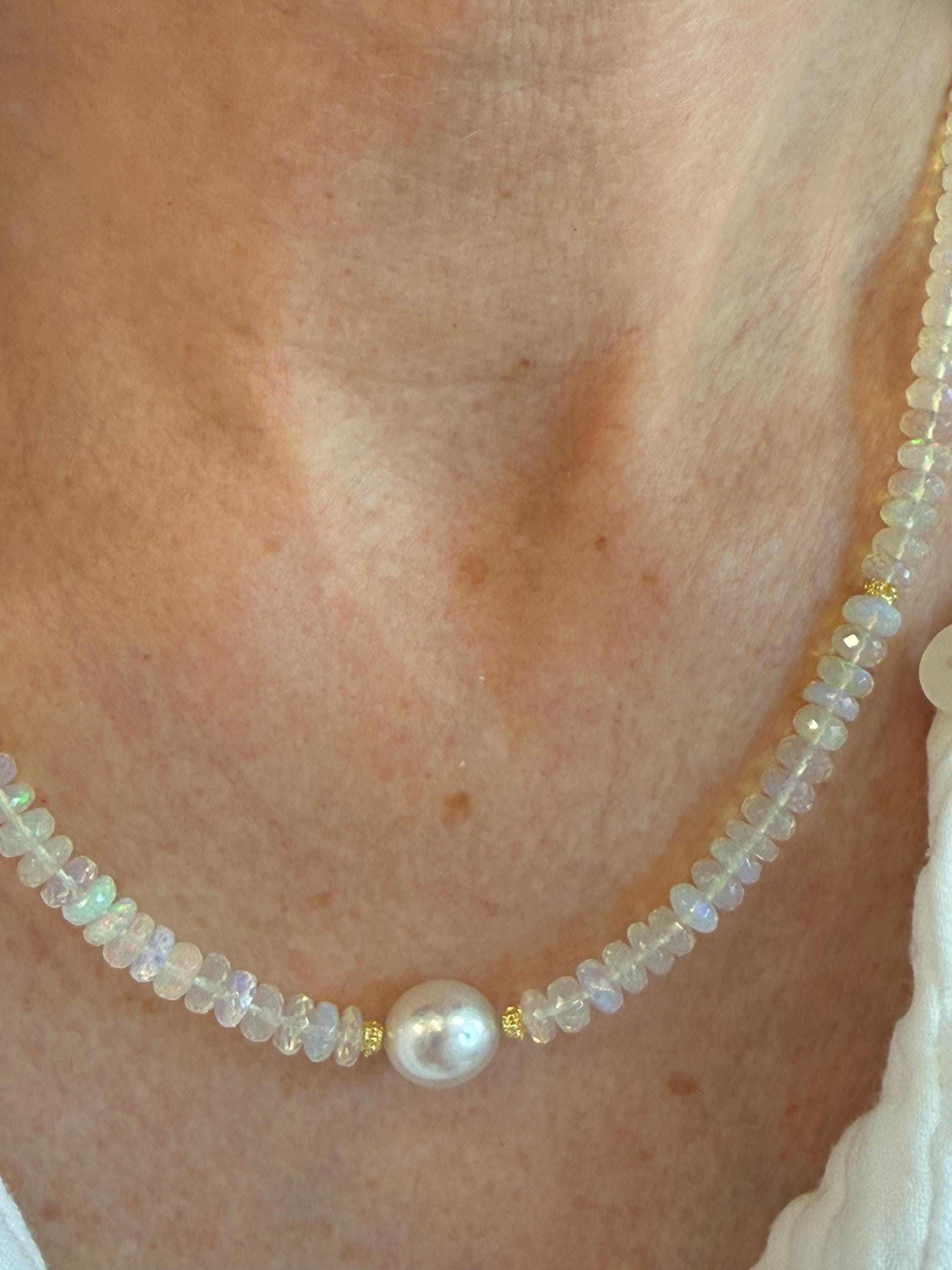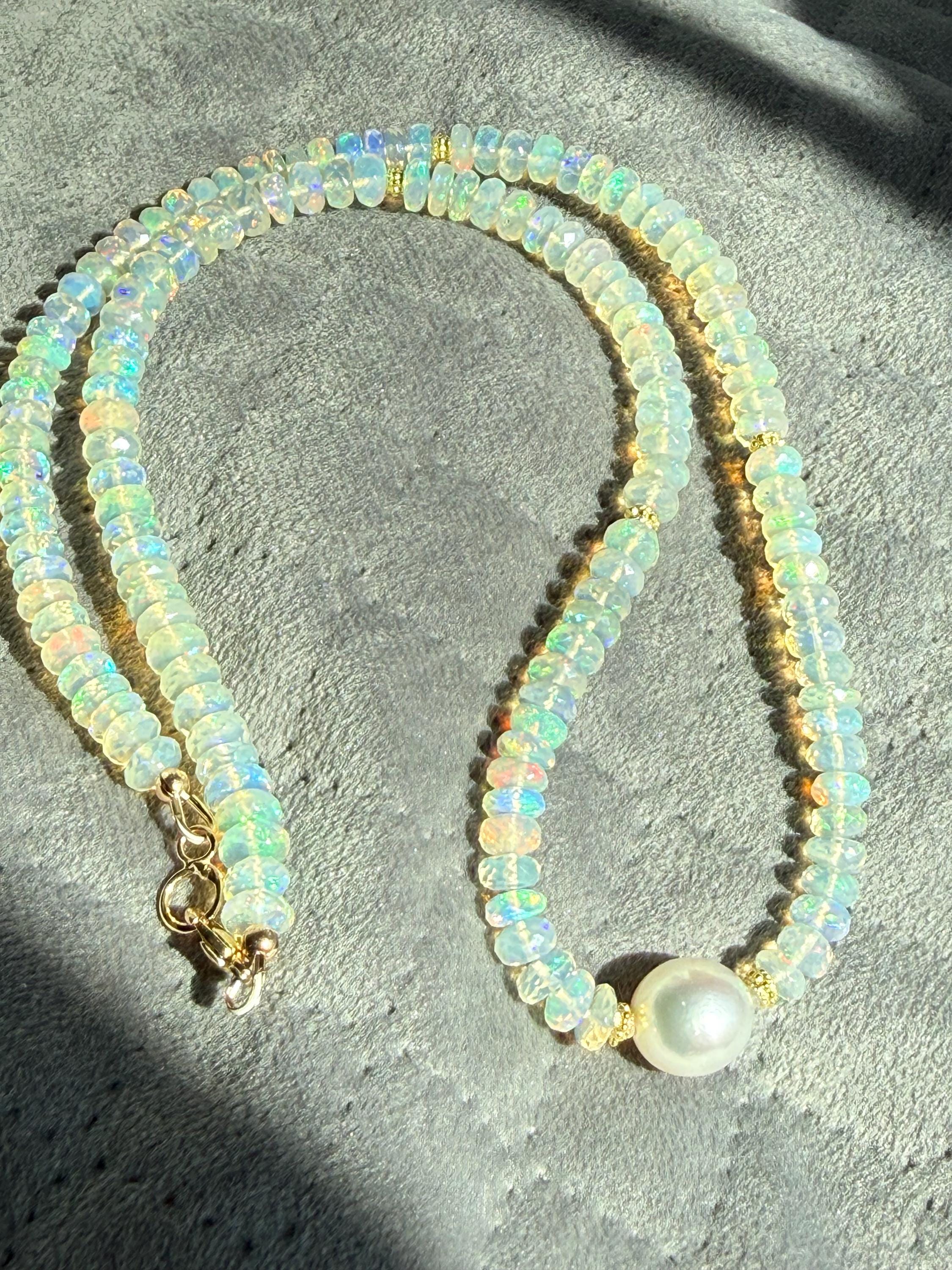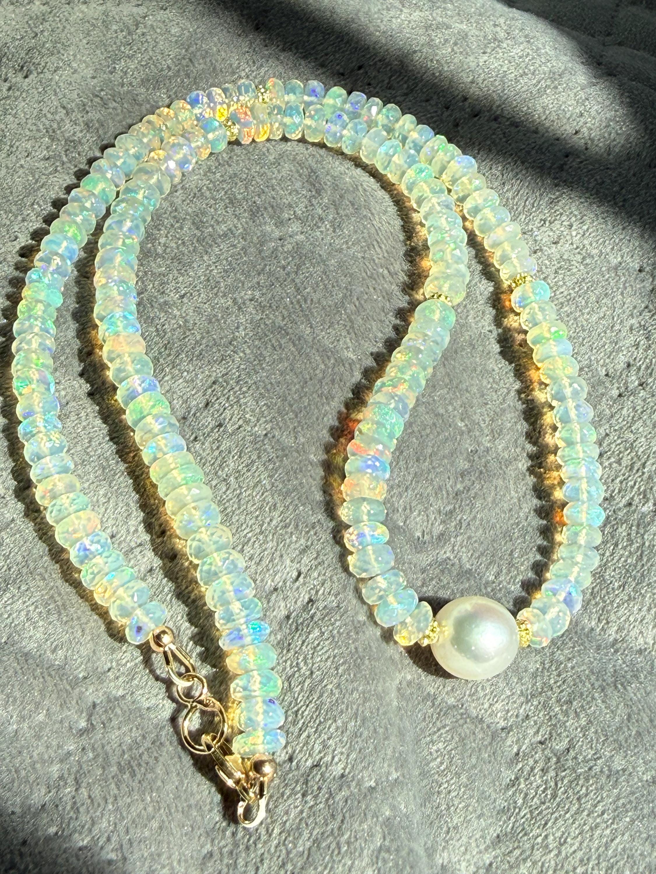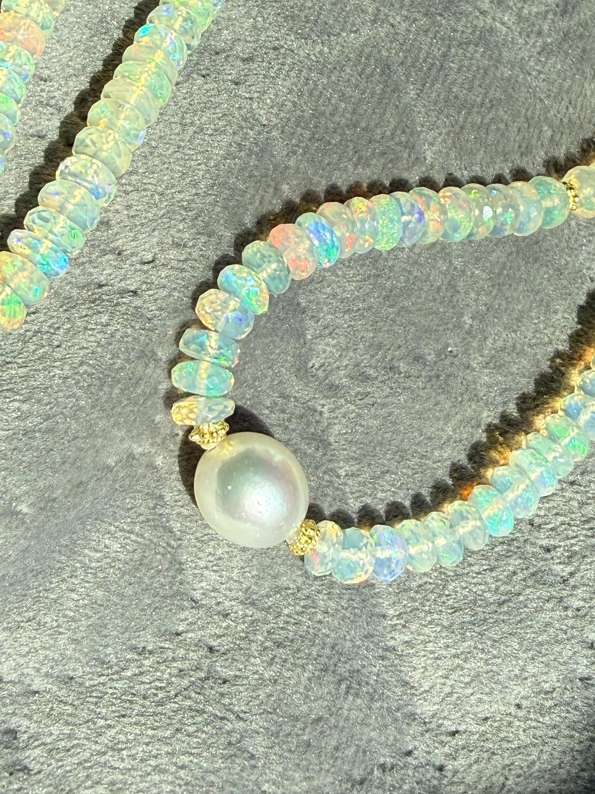 A stunning 10mm cultured south sea pearl sits mid point along a strand of faceted Ethopian opals with accents of 14k yellow gold. The pearl has some minor blemishing, with sharp luster and beautiful oval shape. There are 14k yellow gold accent beads nestled beside the pearl and alone the sides (6 total). The Ethopian opals are about 5-5.5mm, strung on jewelers nylon coated cable and finished with a 14k yellow gold clasp set. The photos do not do the stones justice! They are very flashy especially in direct sunlight. The necklace measures approximately 18.75 inches end to end.