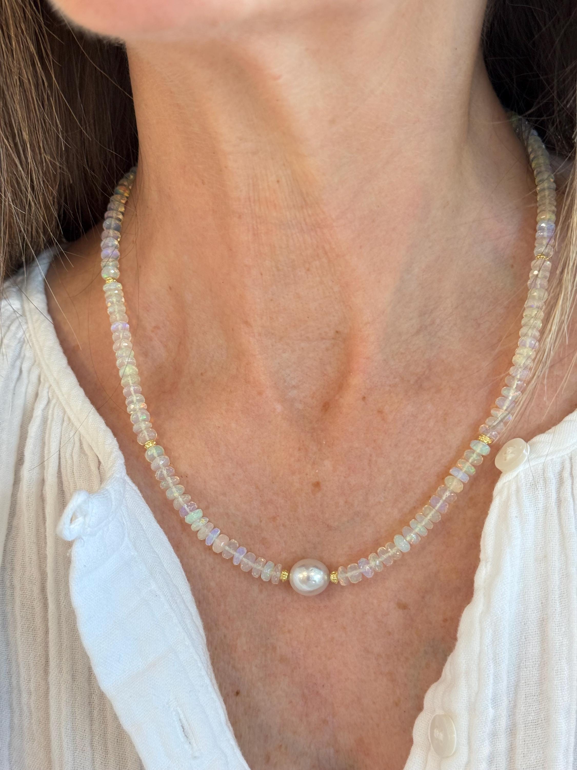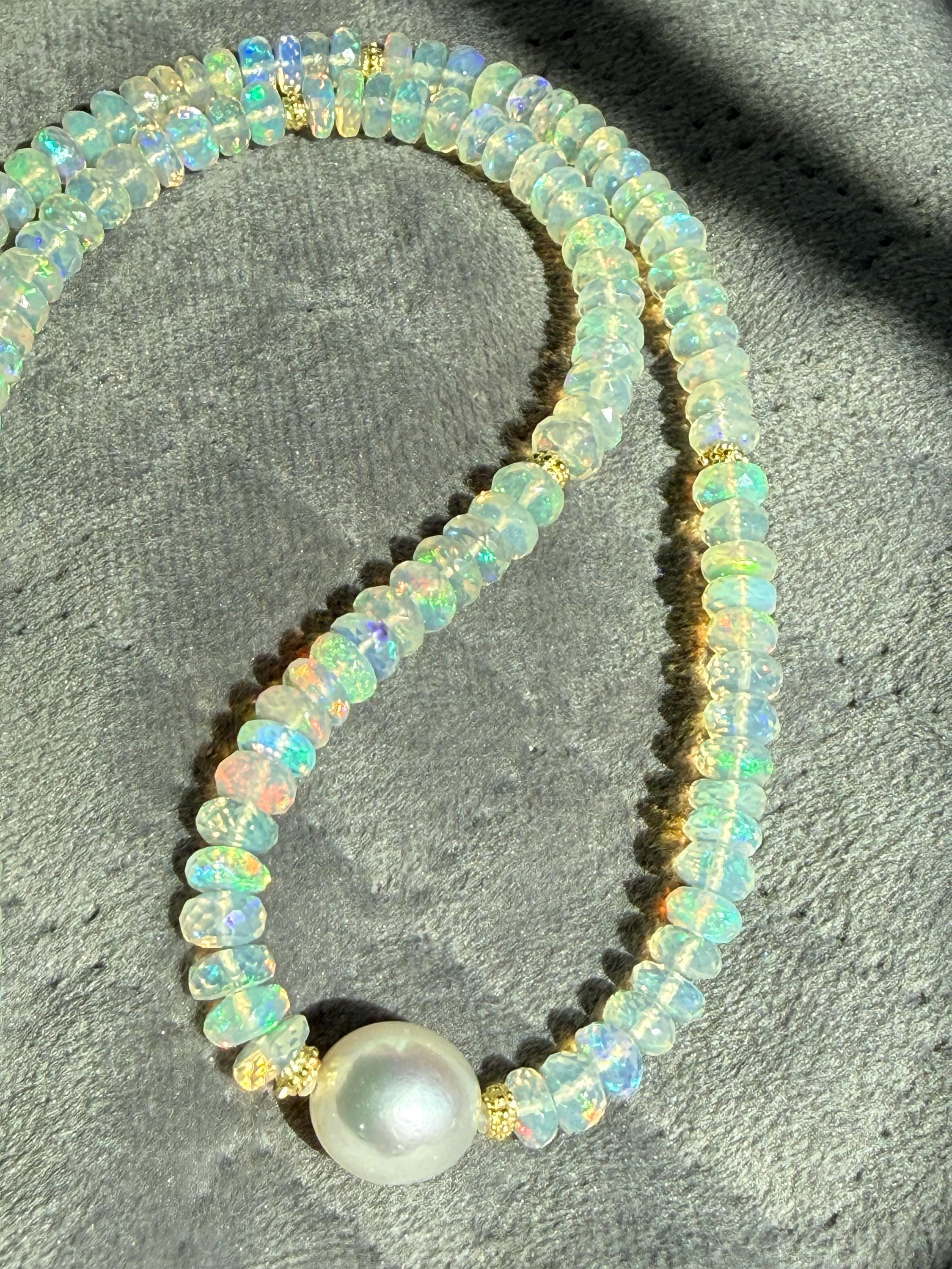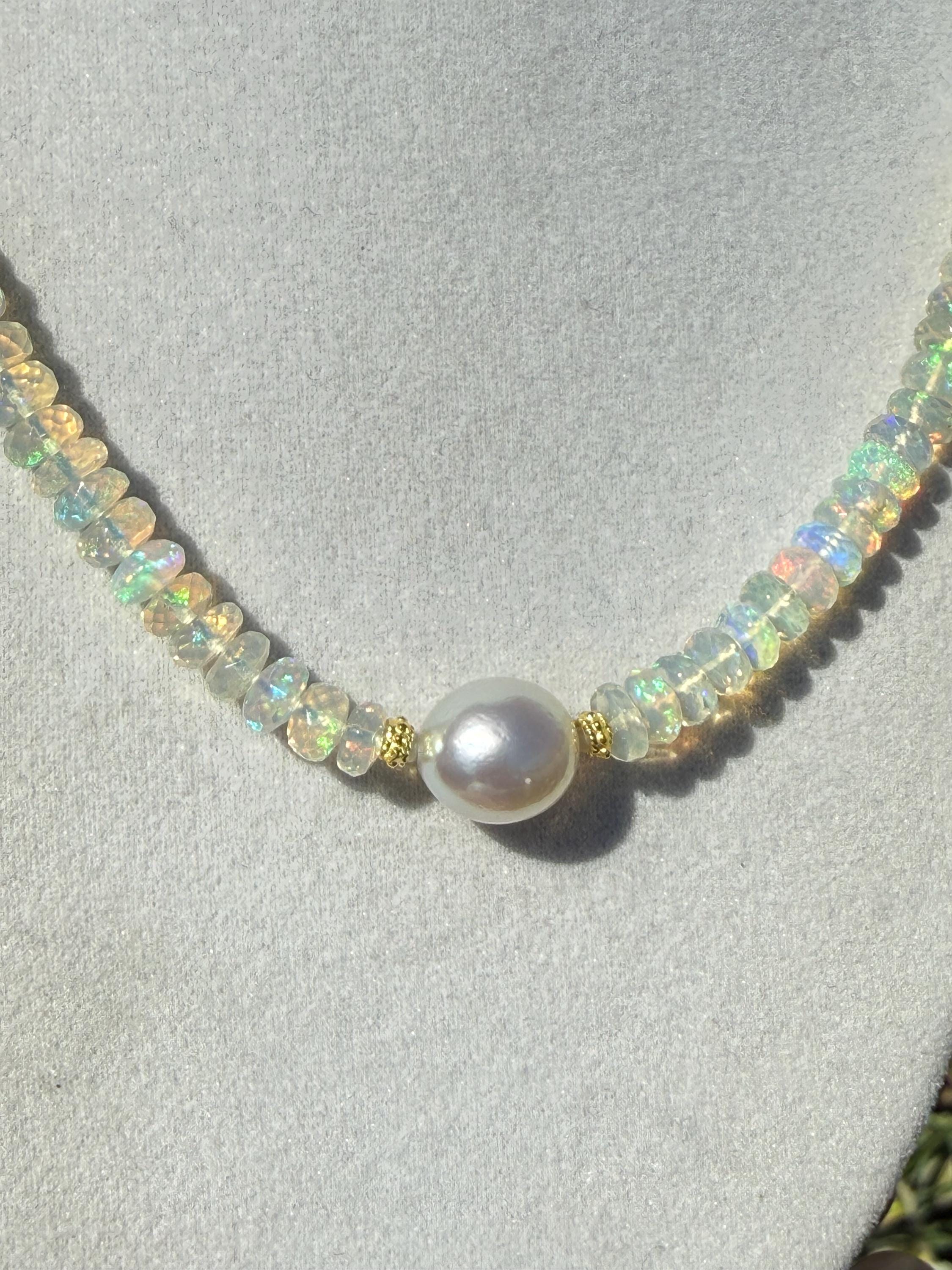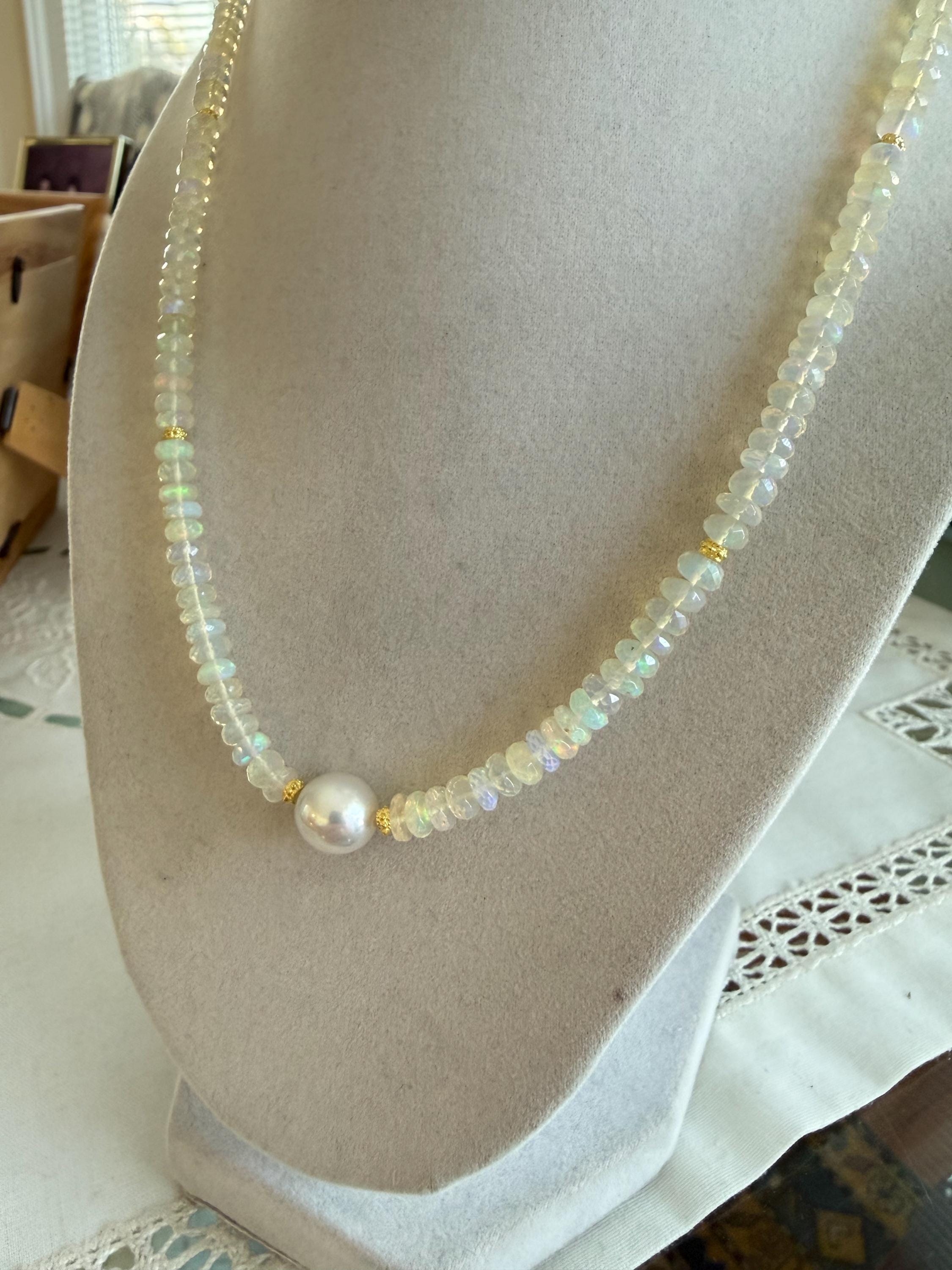 A stunning 10mm cultured south sea pearl sits mid point along a strand of faceted Ethopian opals with accents of 14k yellow gold. The pearl has some minor blemishing, with sharp luster and beautiful oval shape. There are 14k yellow gold accent beads nestled beside the pearl and alone the sides (6 total). The Ethopian opals are about 5-5.5mm, strung on jewelers nylon coated cable and finished with a 14k yellow gold clasp set. The photos do not do the stones justice! They are very flashy especially in direct sunlight. The necklace measures approximately 18.75 inches end to end.