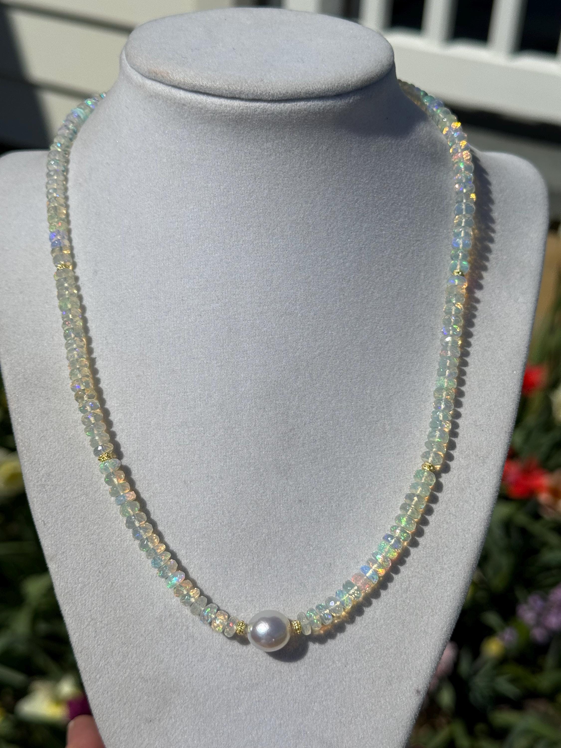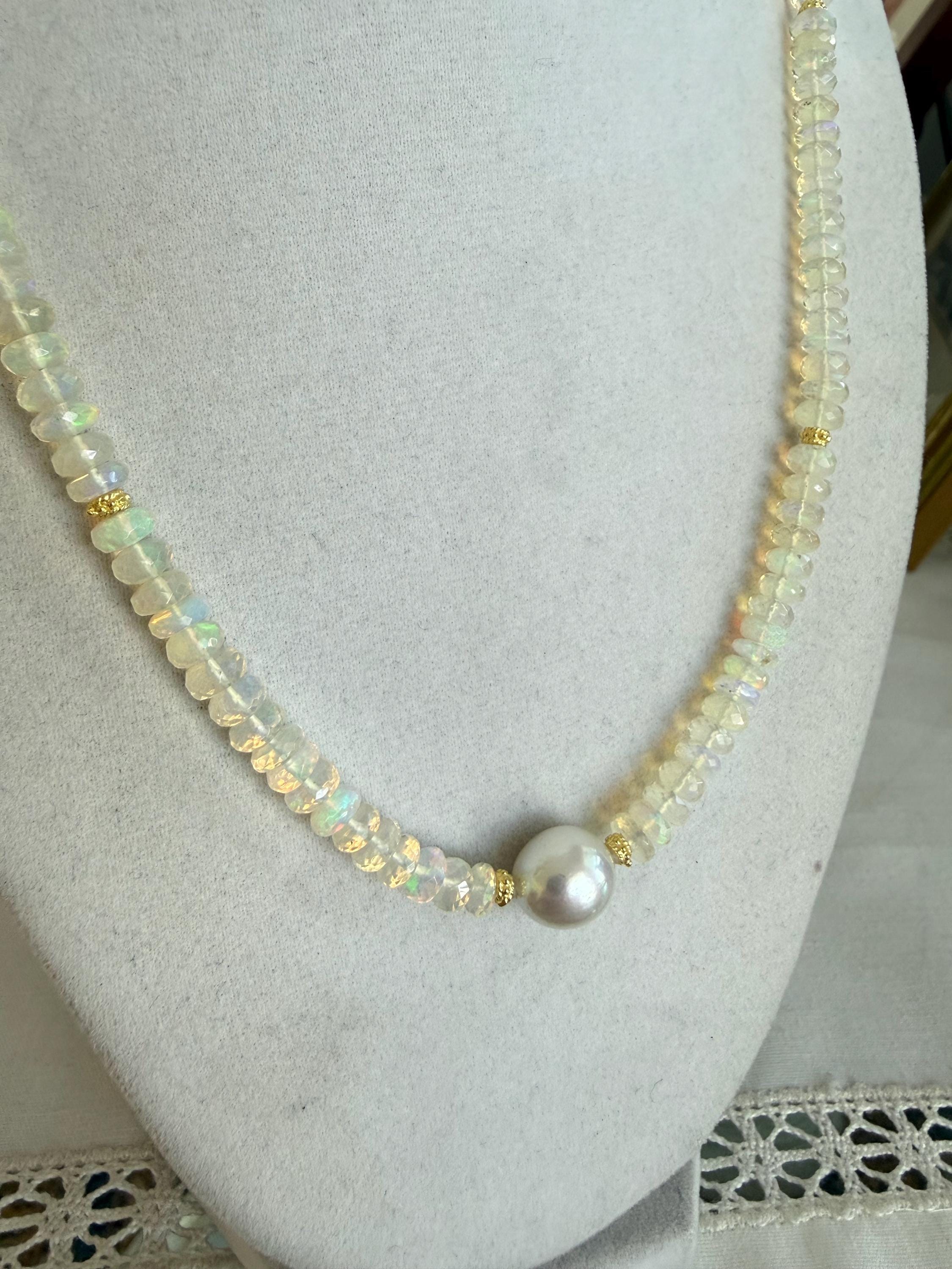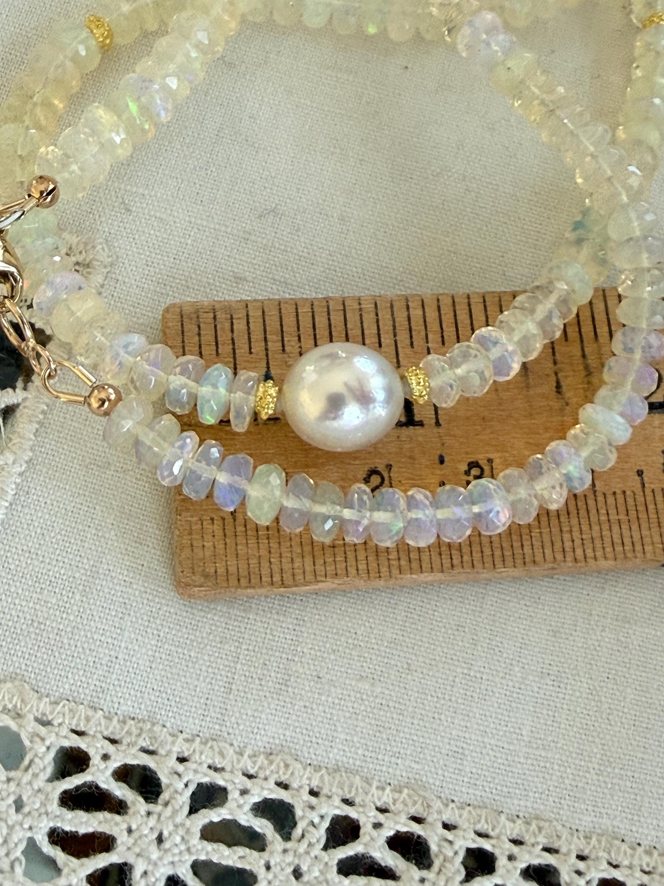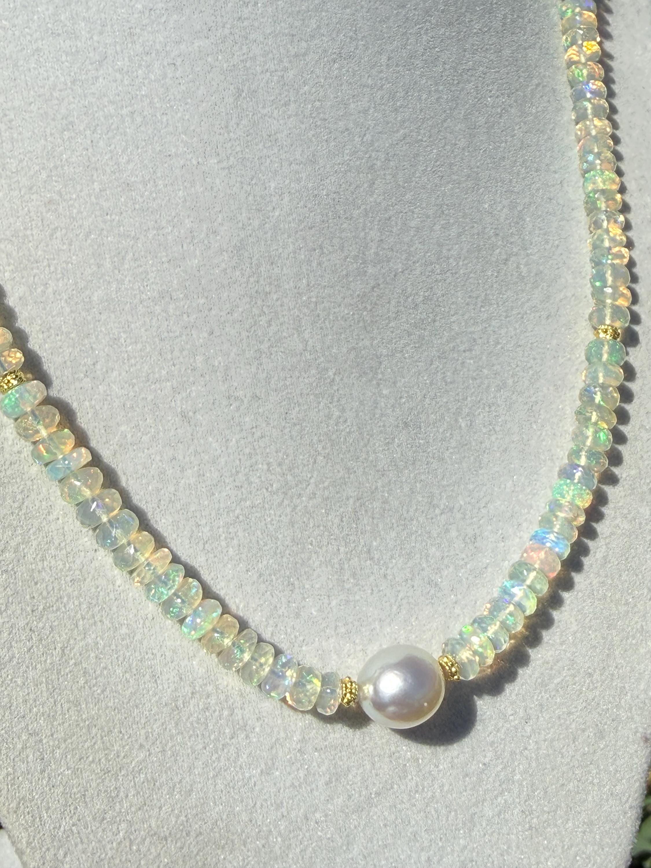 A stunning 10mm cultured south sea pearl sits mid point along a strand of faceted Ethopian opals with accents of 14k yellow gold. The pearl has some minor blemishing, with sharp luster and beautiful oval shape. There are 14k yellow gold accent beads nestled beside the pearl and alone the sides (6 total). The Ethopian opals are about 5-5.5mm, strung on jewelers nylon coated cable and finished with a 14k yellow gold clasp set. The photos do not do the stones justice! They are very flashy especially in direct sunlight. The necklace measures approximately 18.75 inches end to end.