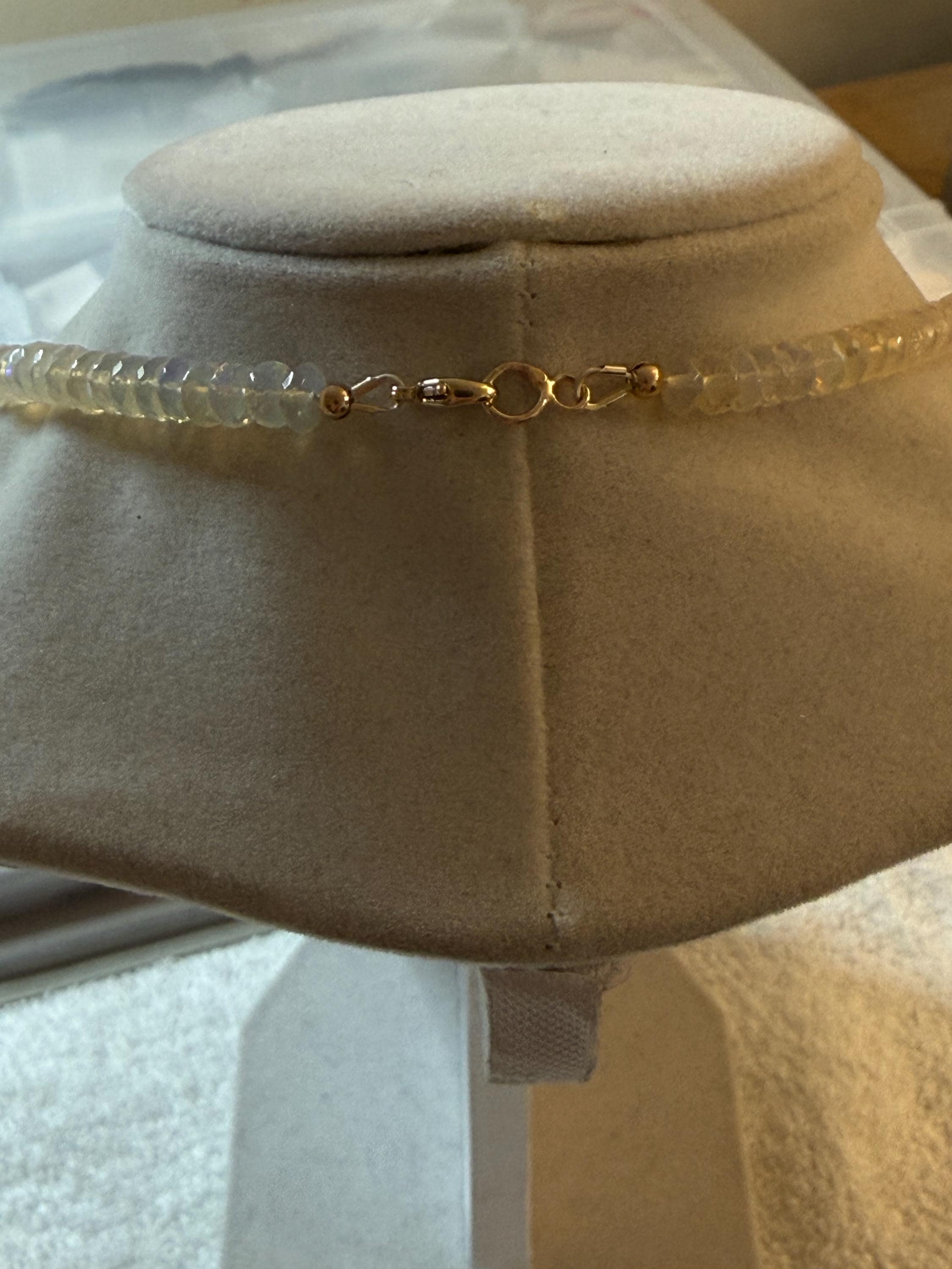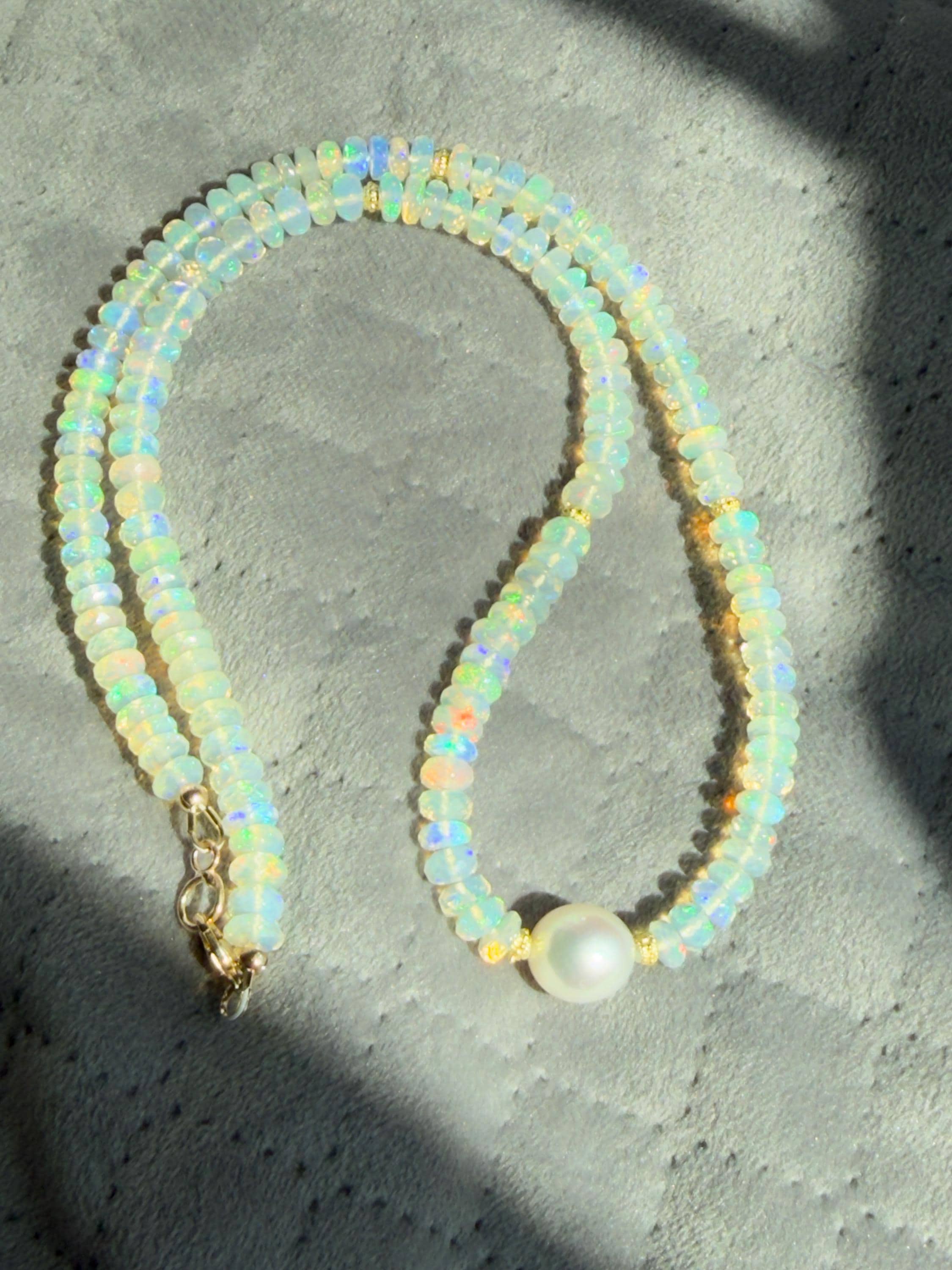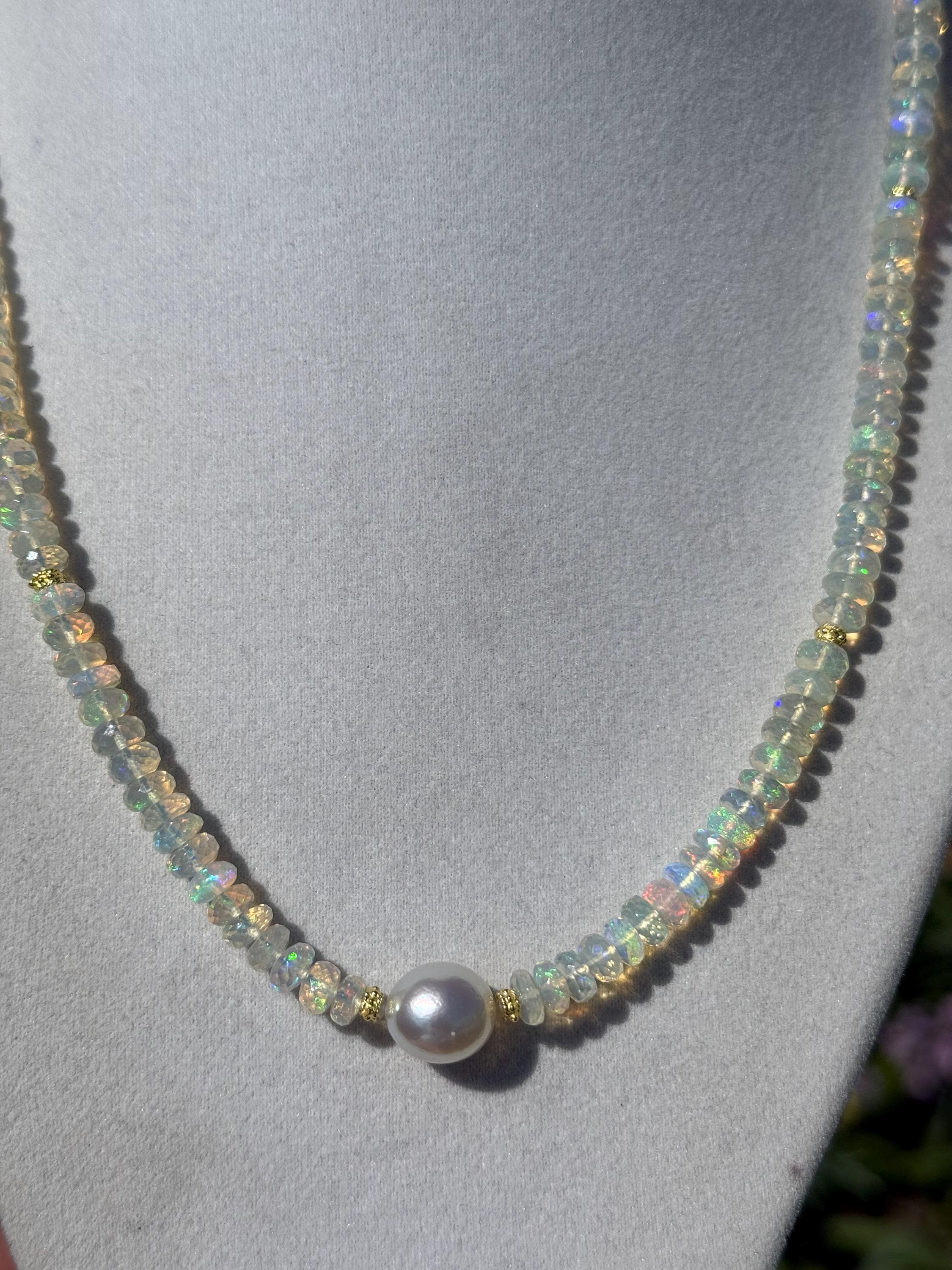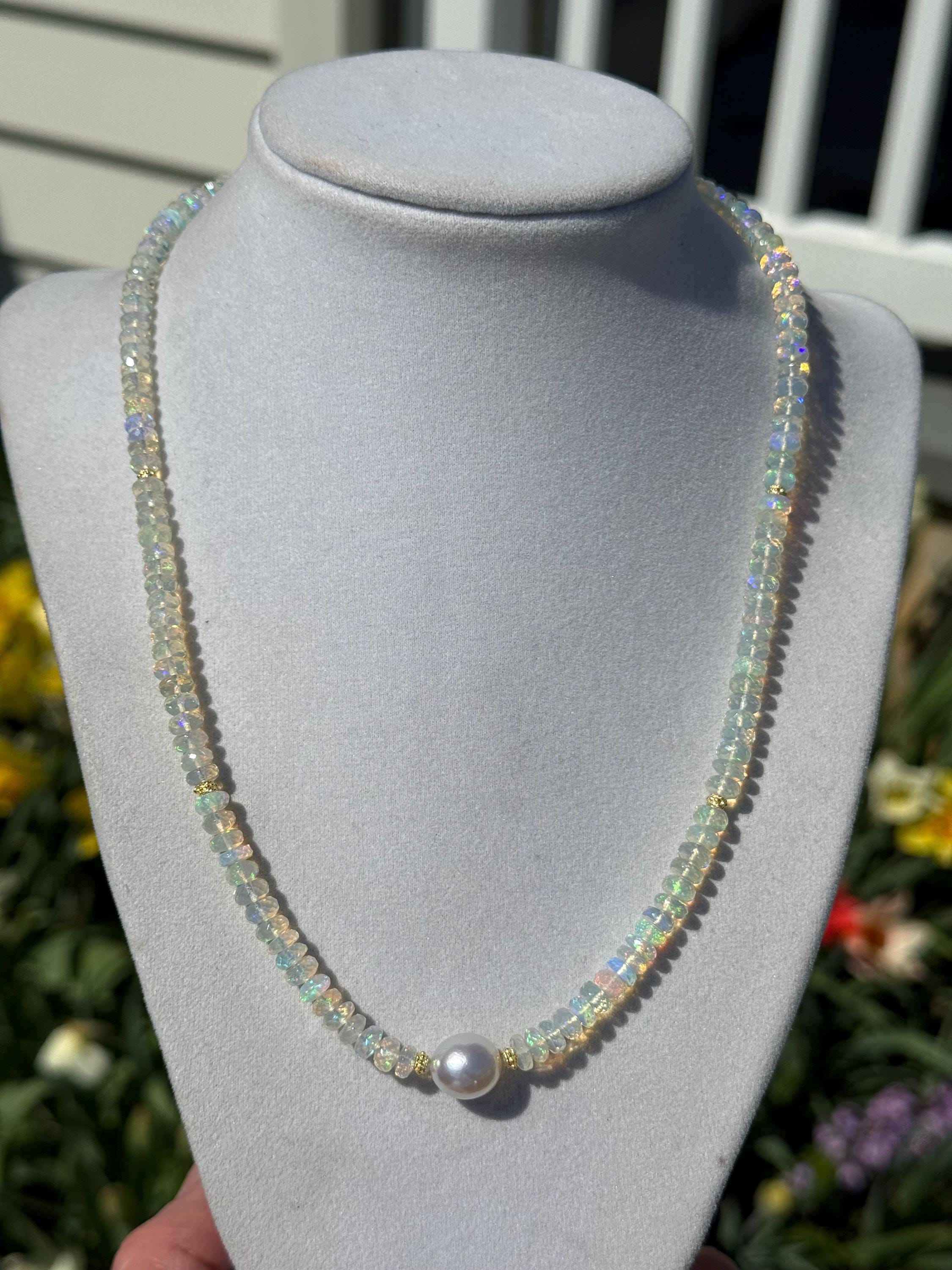 A stunning 10mm cultured south sea pearl sits mid point along a strand of faceted Ethopian opals with accents of 14k yellow gold. The pearl has some minor blemishing, with sharp luster and beautiful oval shape. There are 14k yellow gold accent beads nestled beside the pearl and alone the sides (6 total). The Ethopian opals are about 5-5.5mm, strung on jewelers nylon coated cable and finished with a 14k yellow gold clasp set. The photos do not do the stones justice! They are very flashy especially in direct sunlight. The necklace measures approximately 18.75 inches end to end.