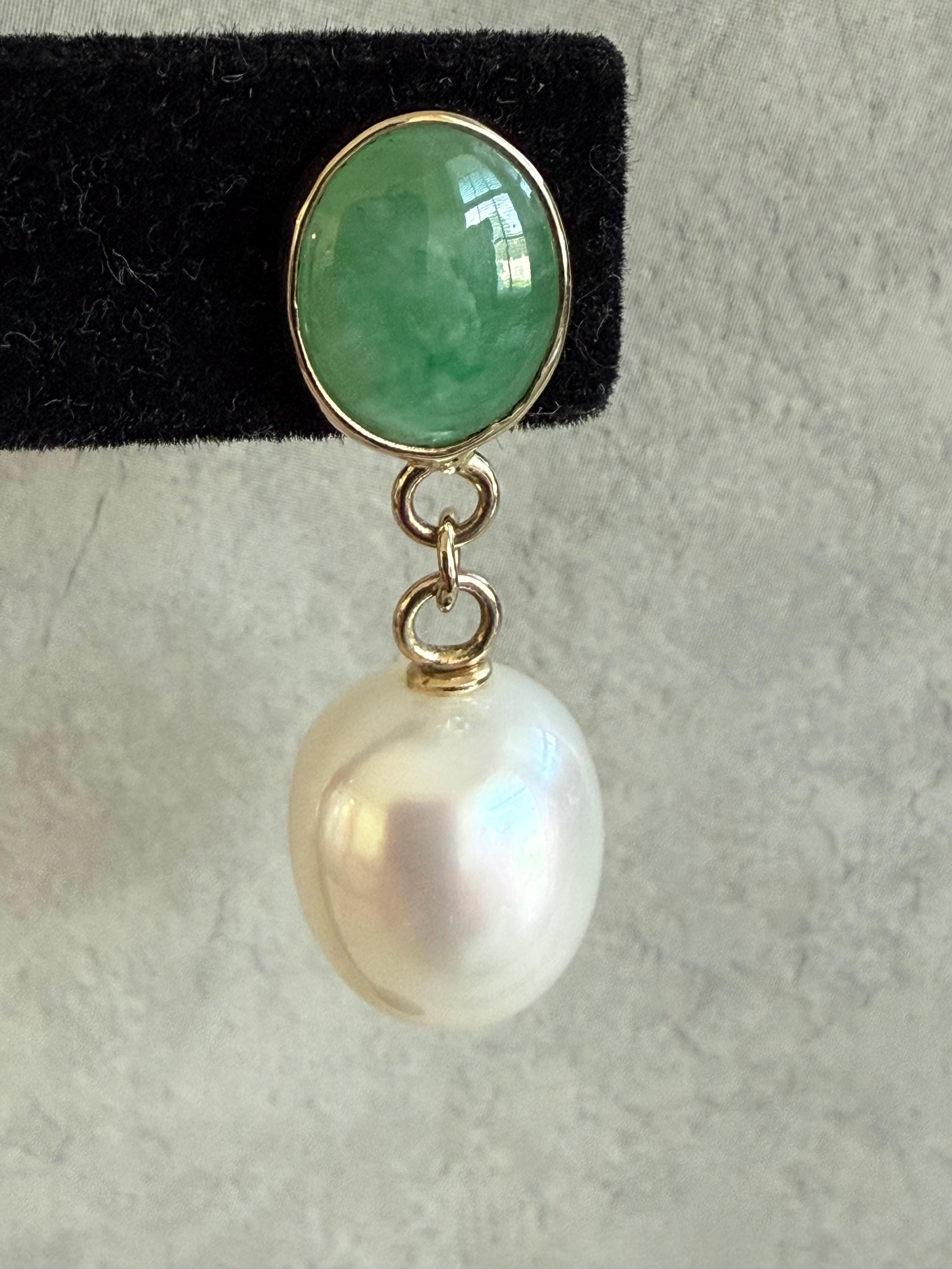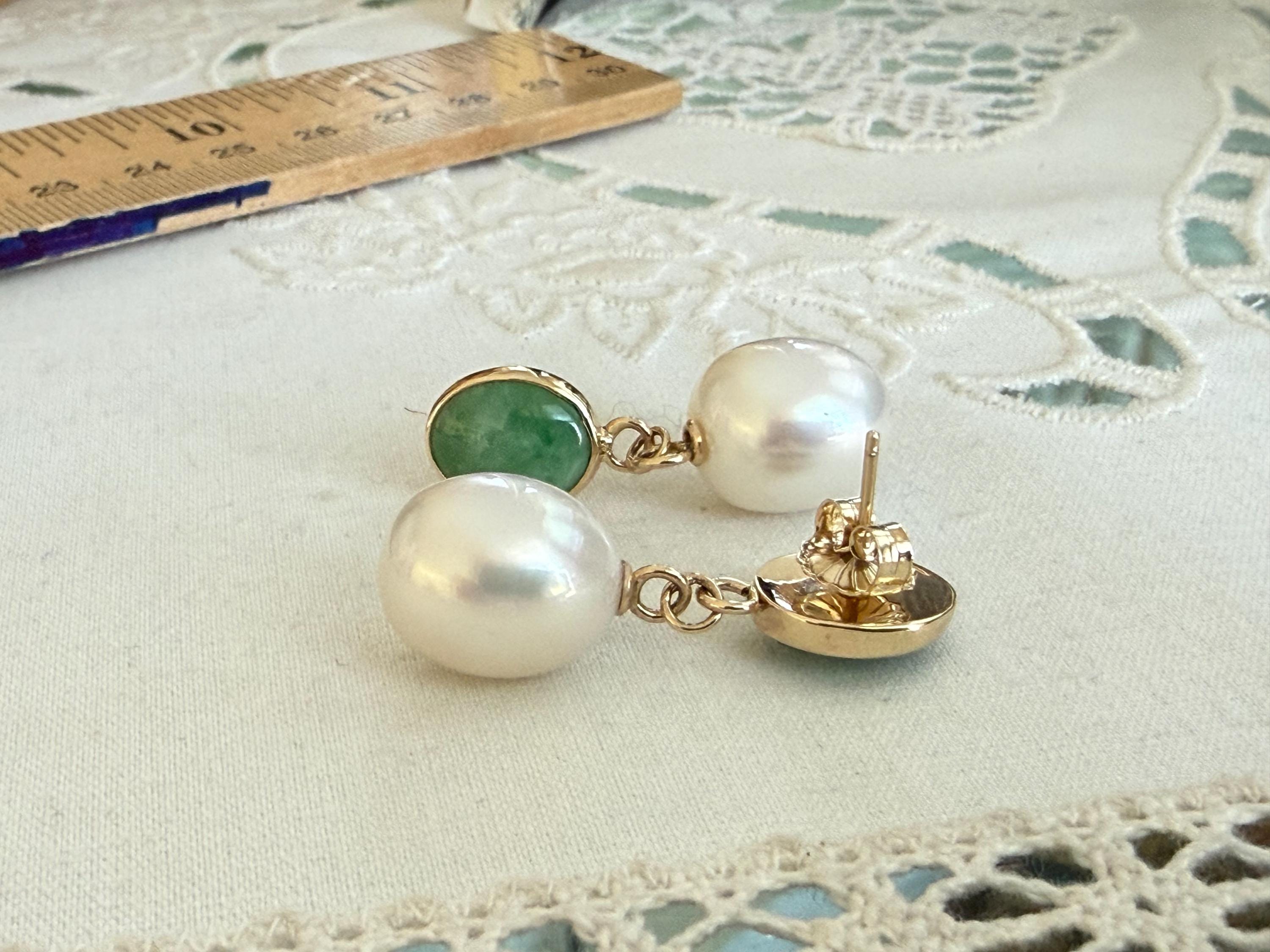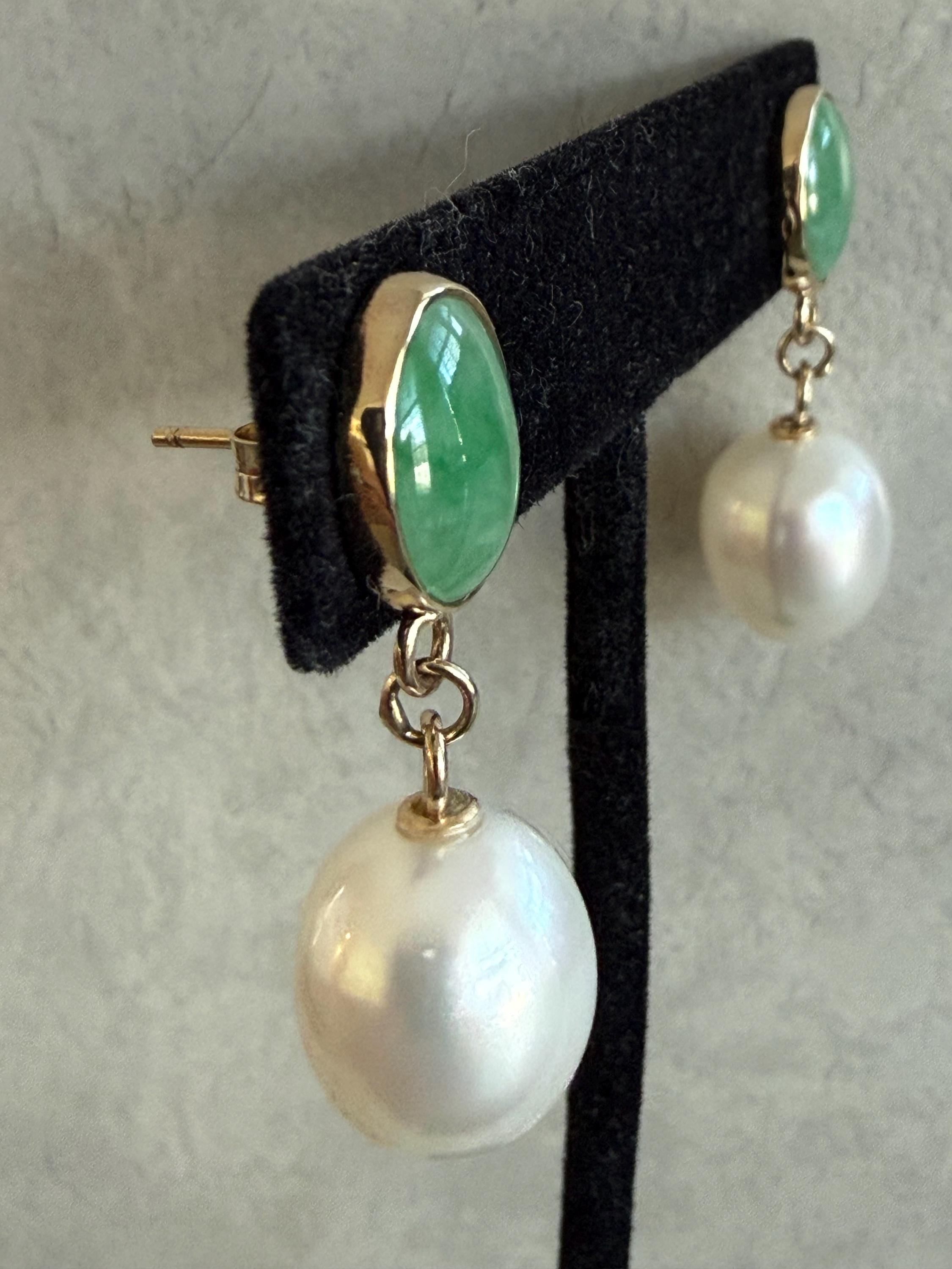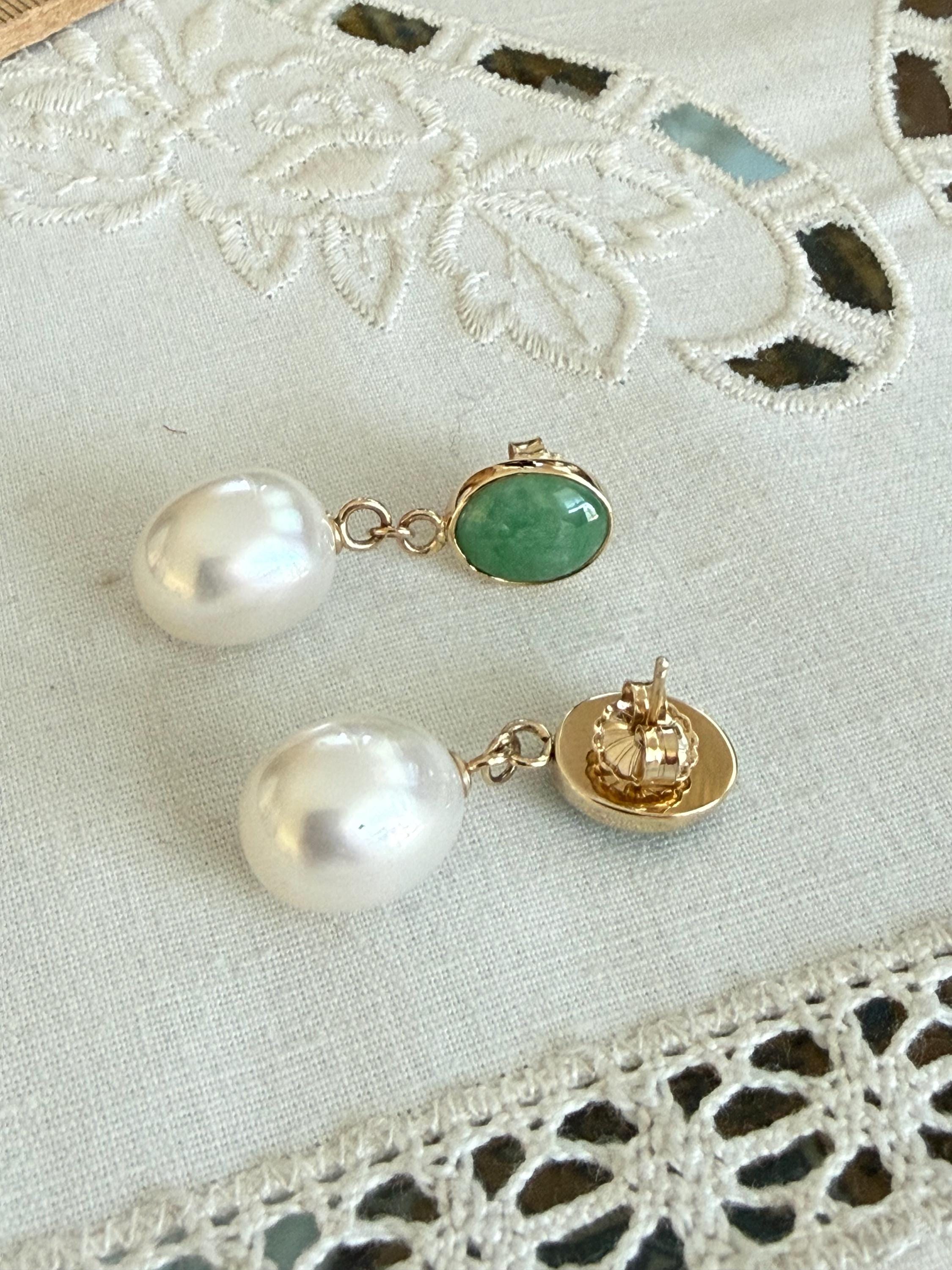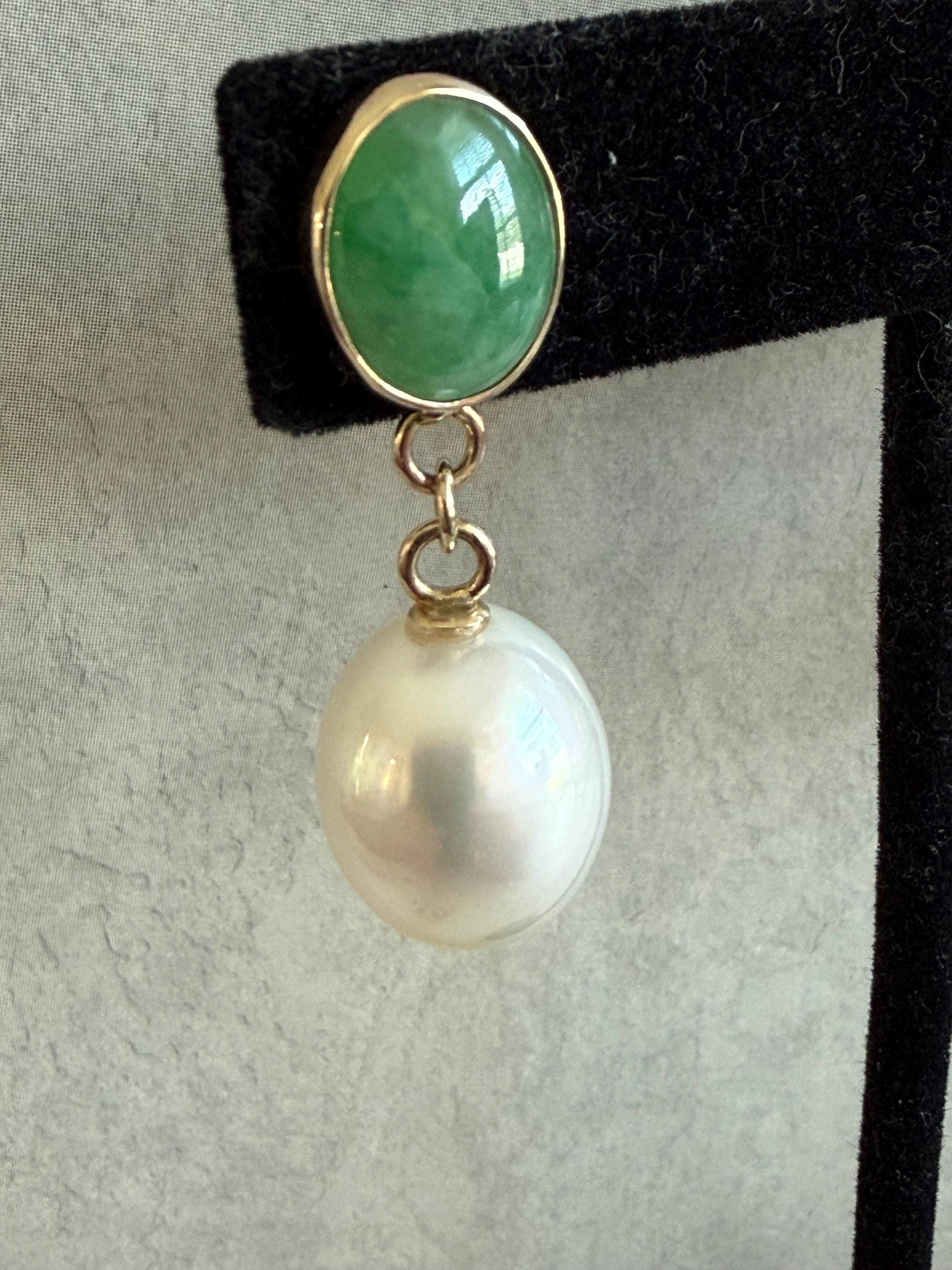 Cultured South Sea pearls and green jadeite jade are the perfect combination of color and luster! These drop earrings are handcrafted in 14k yellow gold with large butterfly backs. South Sea cultured pearls are known as "the queen of pearls" and these certainly live up to their title! Measuring about 12mm across, both pearls have elongated oval drop shapes and very very minimal blemishing. The luster is quite nice with an ever so satin like quality. The bezel set jadeite jade is Type A, meaning it has not been treated and has a beautiful mottled green color. I sourced the stones from my friends at Mason-Kay Jade, during the AGTA Tuscon Gem Fair. Please note, the photos make the stones appear slightly less bright than they are in person. The jadeite stones are completely natural and measure about 9 x 11.5 mm each. These earrings are completely handcradted (except for the butterfly backs) making them a one of a kind treasure. Please note, these earrings are for pierced ears only; earrings cannot be returned and are final sale only. The last two photos show this pair of earrings with another pair, sold separately; this listing is for the green pair only.