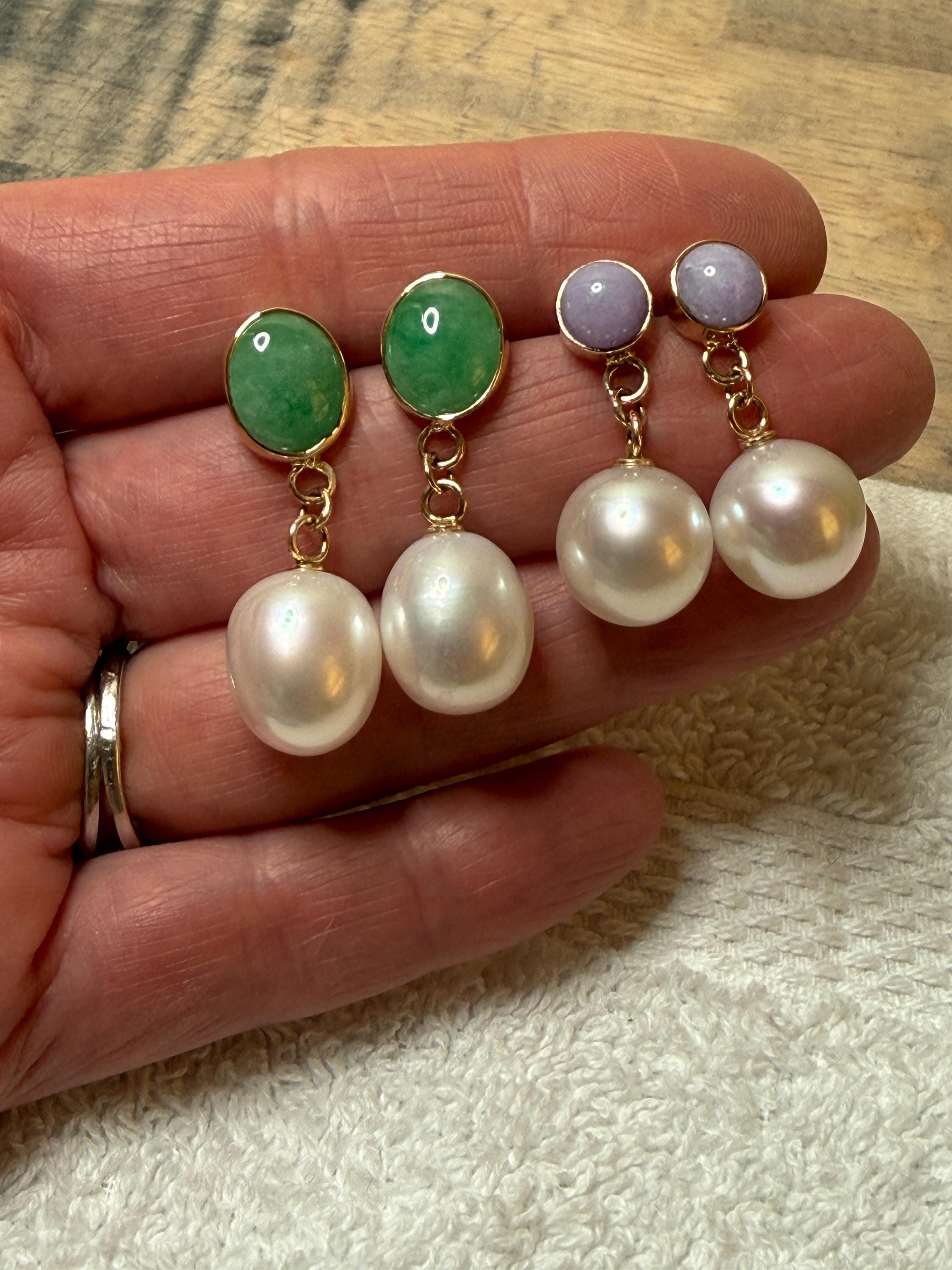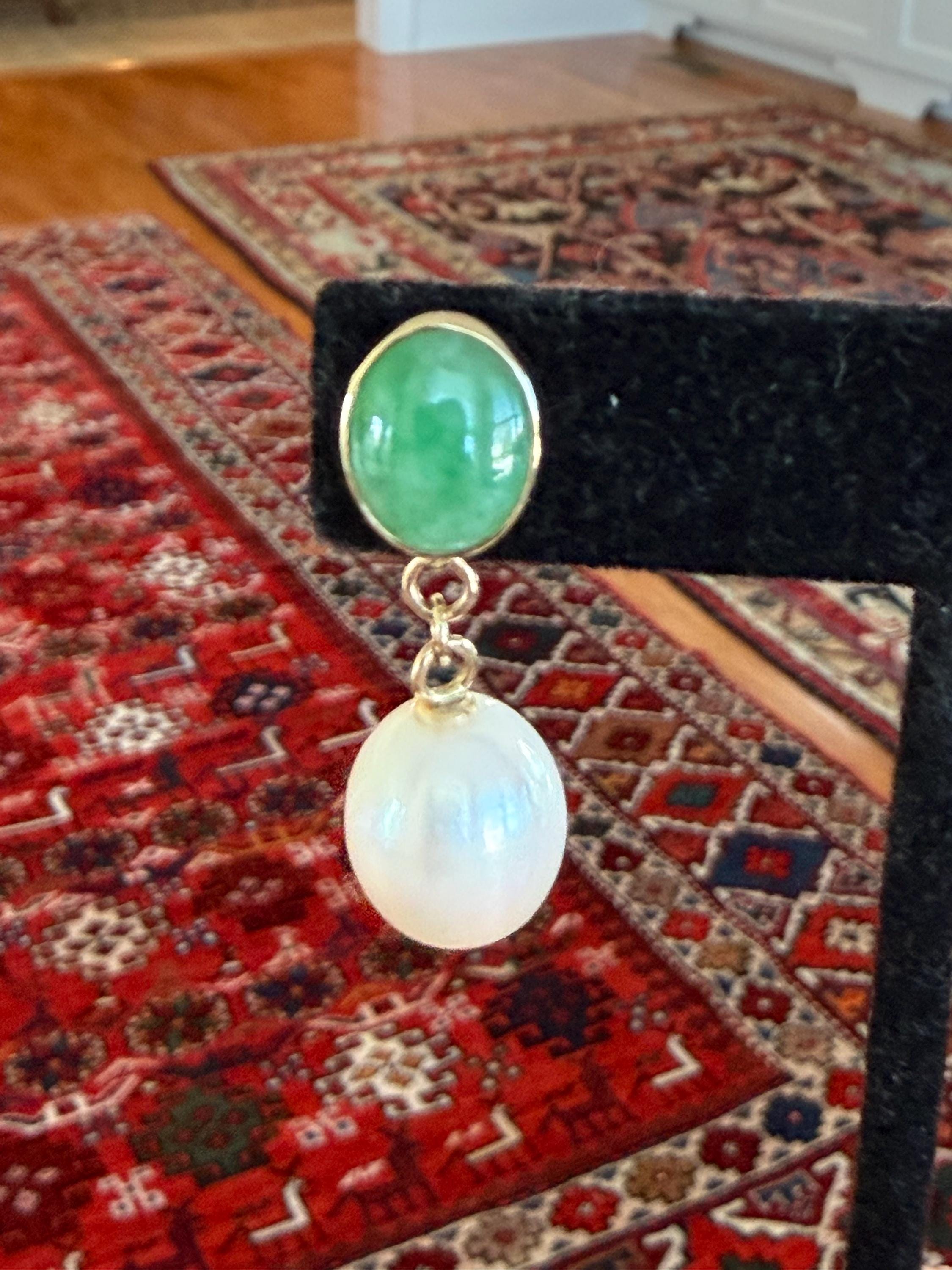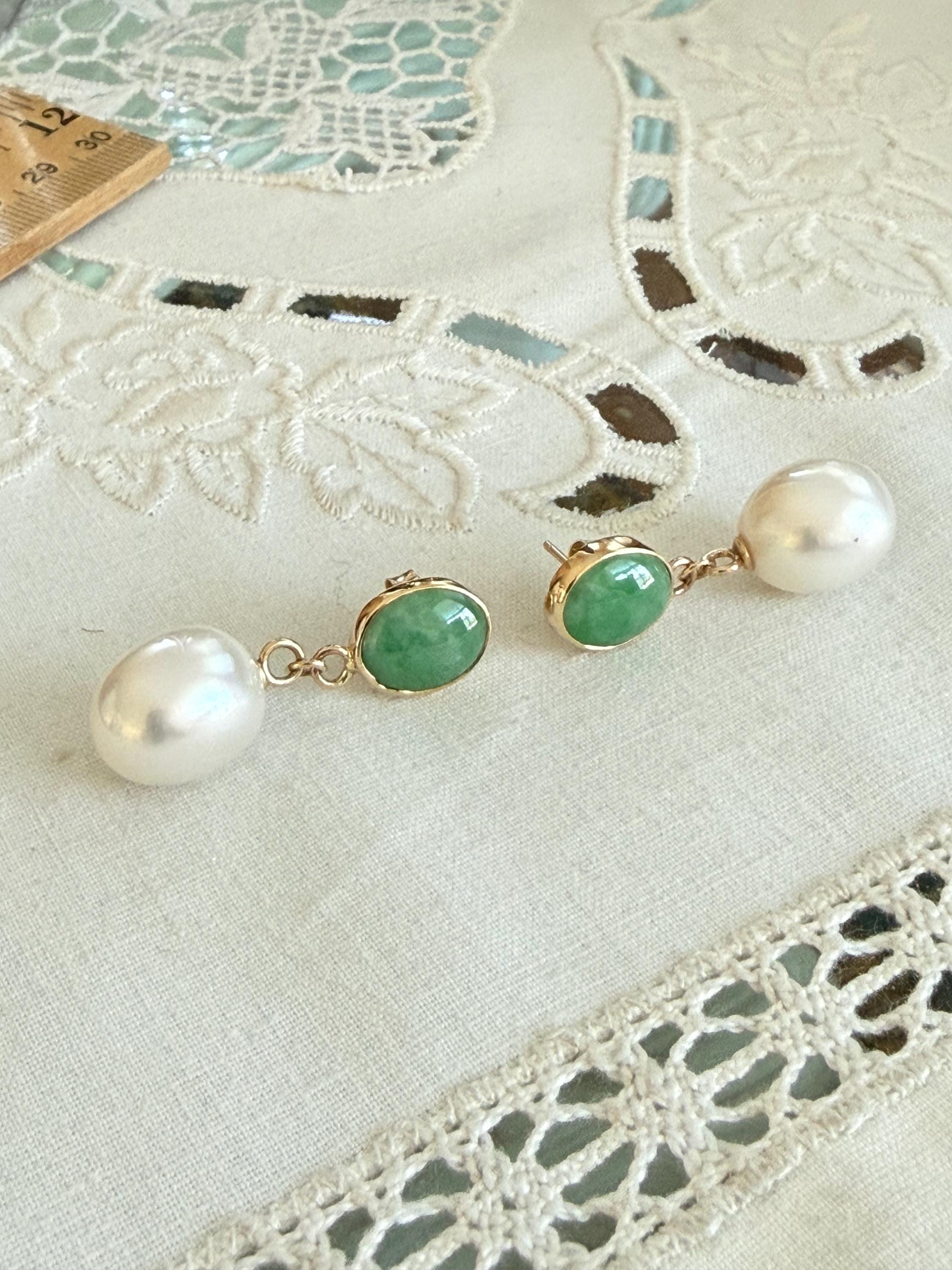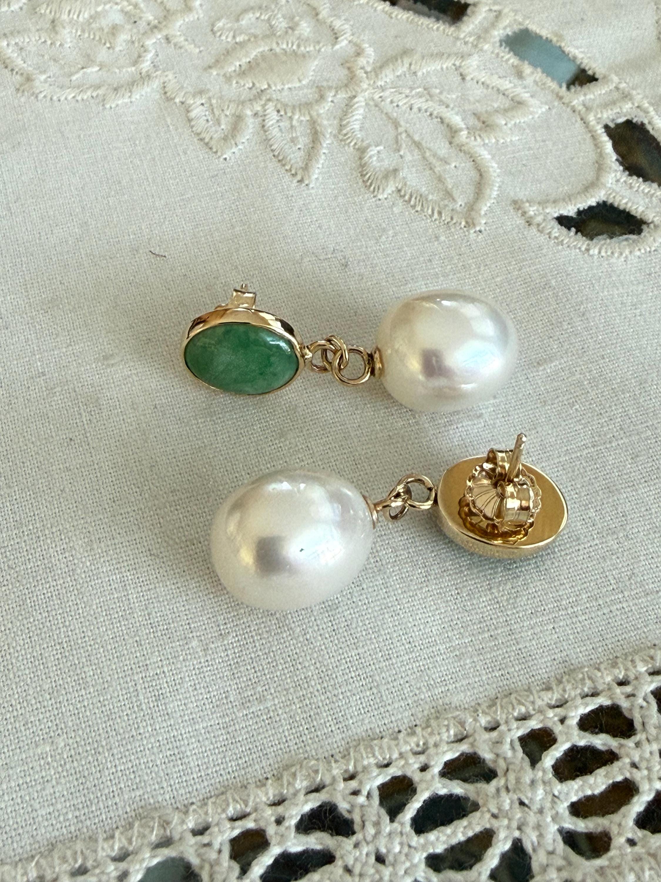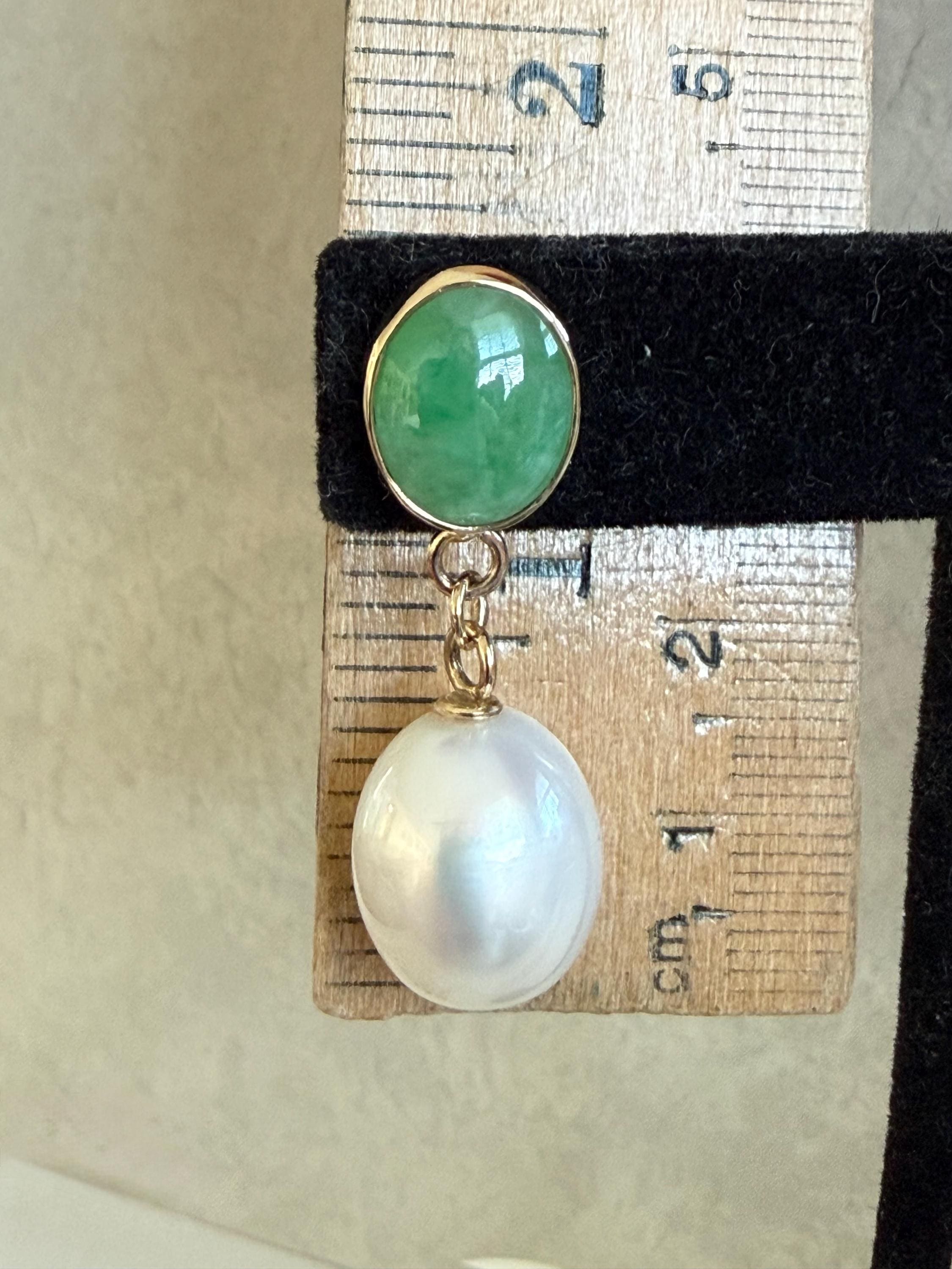 Cultured South Sea pearls and green jadeite jade are the perfect combination of color and luster! These drop earrings are handcrafted in 14k yellow gold with large butterfly backs. South Sea cultured pearls are known as "the queen of pearls" and these certainly live up to their title! Measuring about 12mm across, both pearls have elongated oval drop shapes and very very minimal blemishing. The luster is quite nice with an ever so satin like quality. The bezel set jadeite jade is Type A, meaning it has not been treated and has a beautiful mottled green color. I sourced the stones from my friends at Mason-Kay Jade, during the AGTA Tuscon Gem Fair. Please note, the photos make the stones appear slightly less bright than they are in person. The jadeite stones are completely natural and measure about 9 x 11.5 mm each. These earrings are completely handcradted (except for the butterfly backs) making them a one of a kind treasure. Please note, these earrings are for pierced ears only; earrings cannot be returned and are final sale only. The last two photos show this pair of earrings with another pair, sold separately; this listing is for the green pair only.