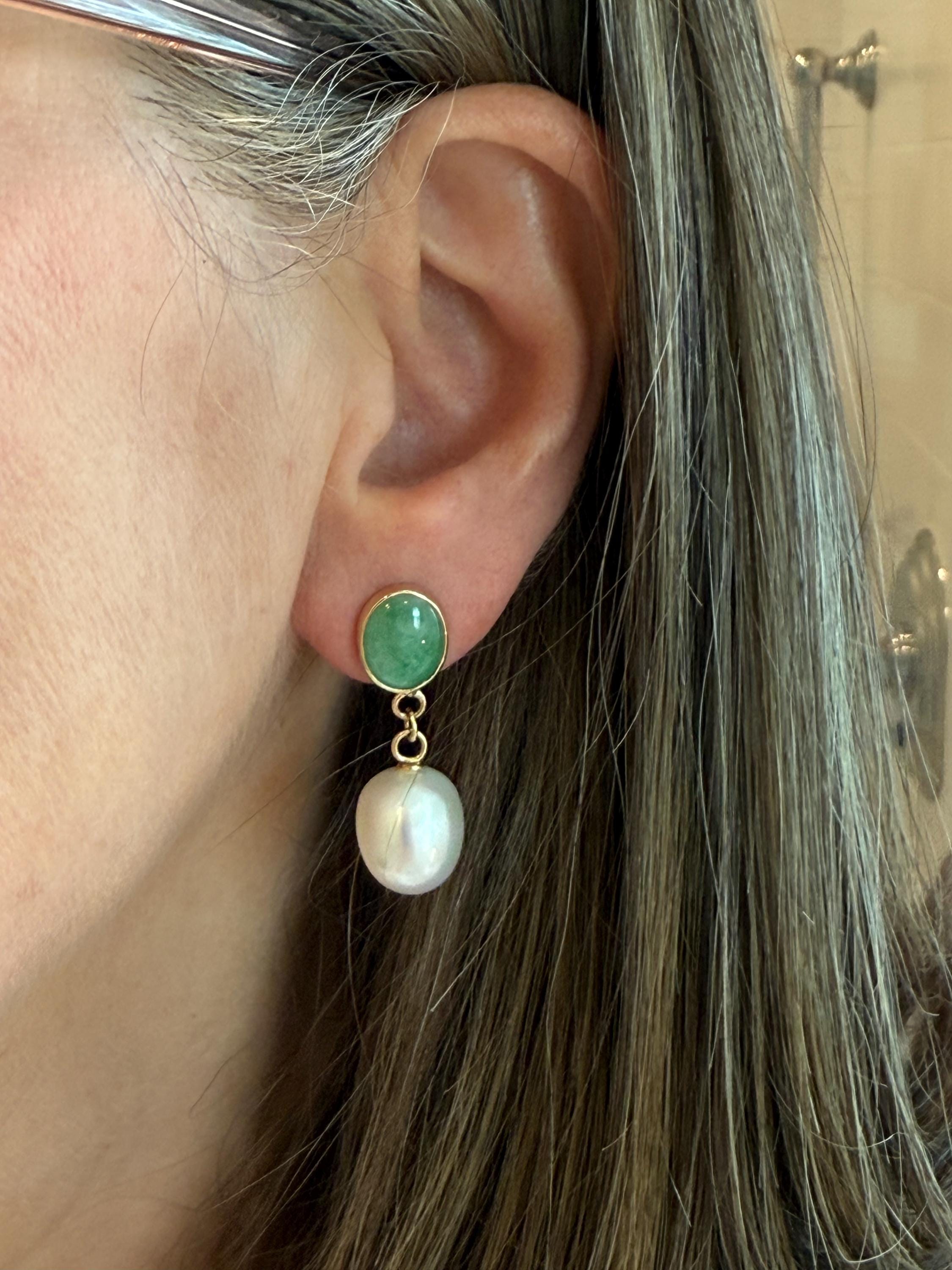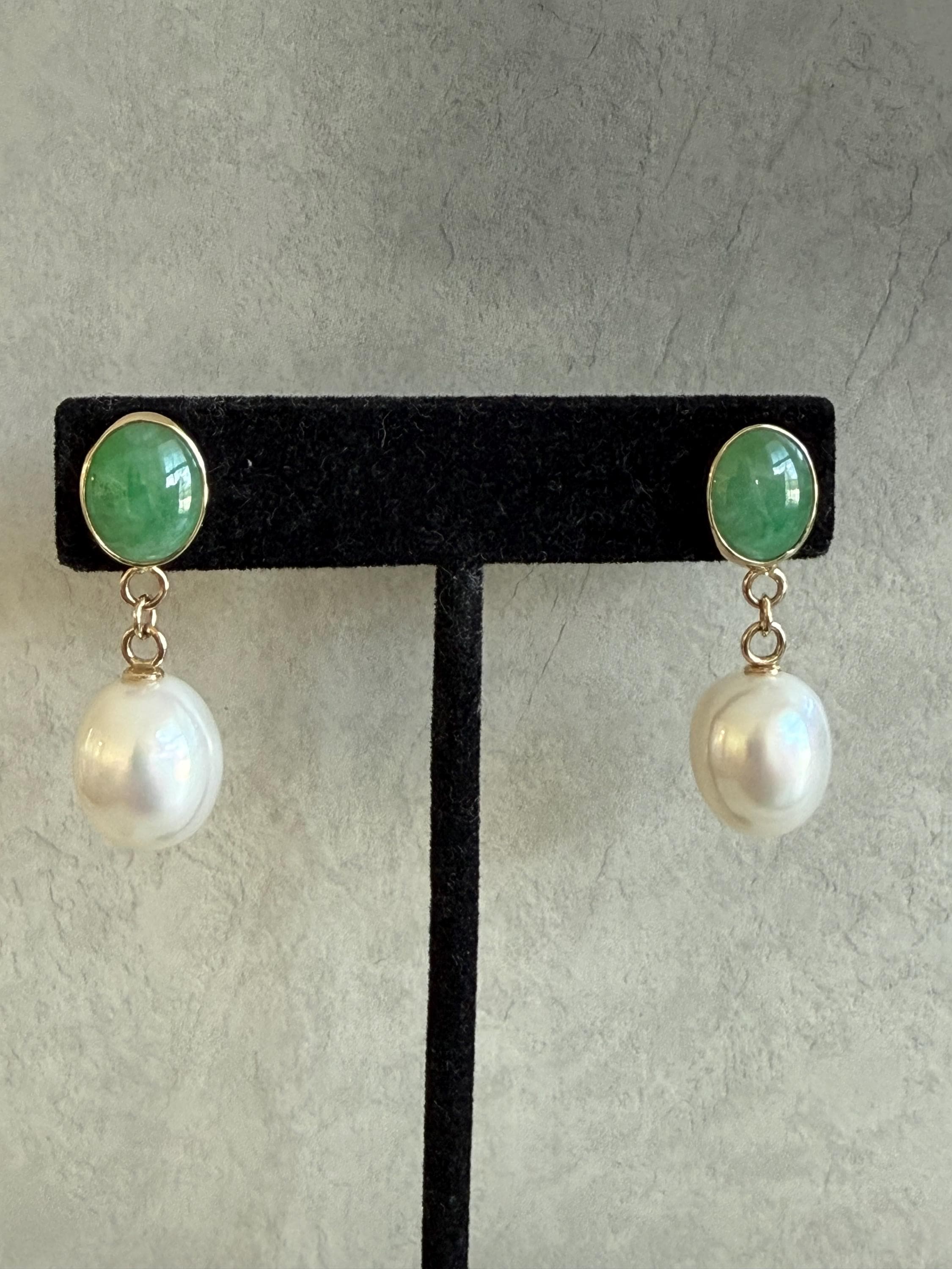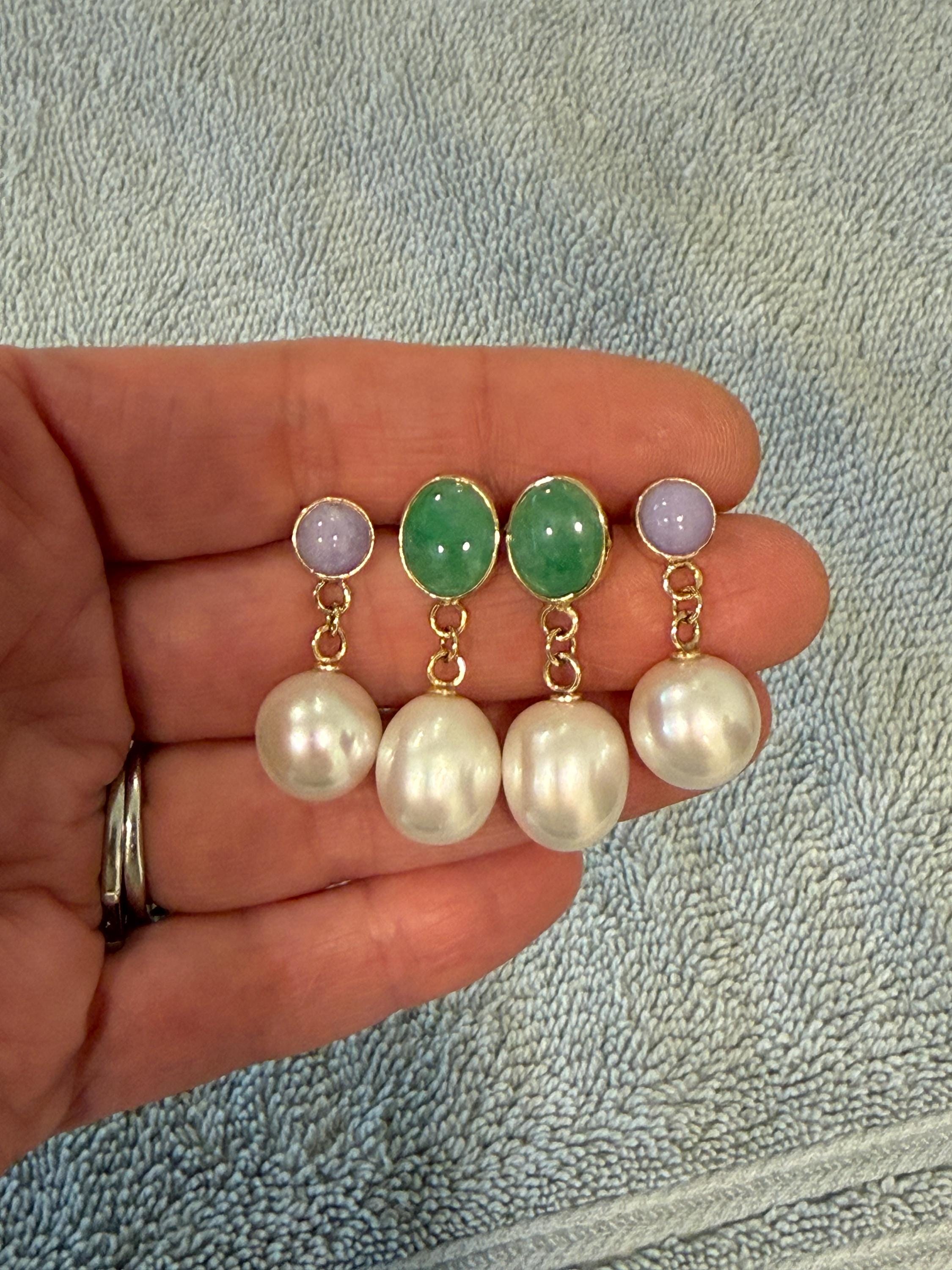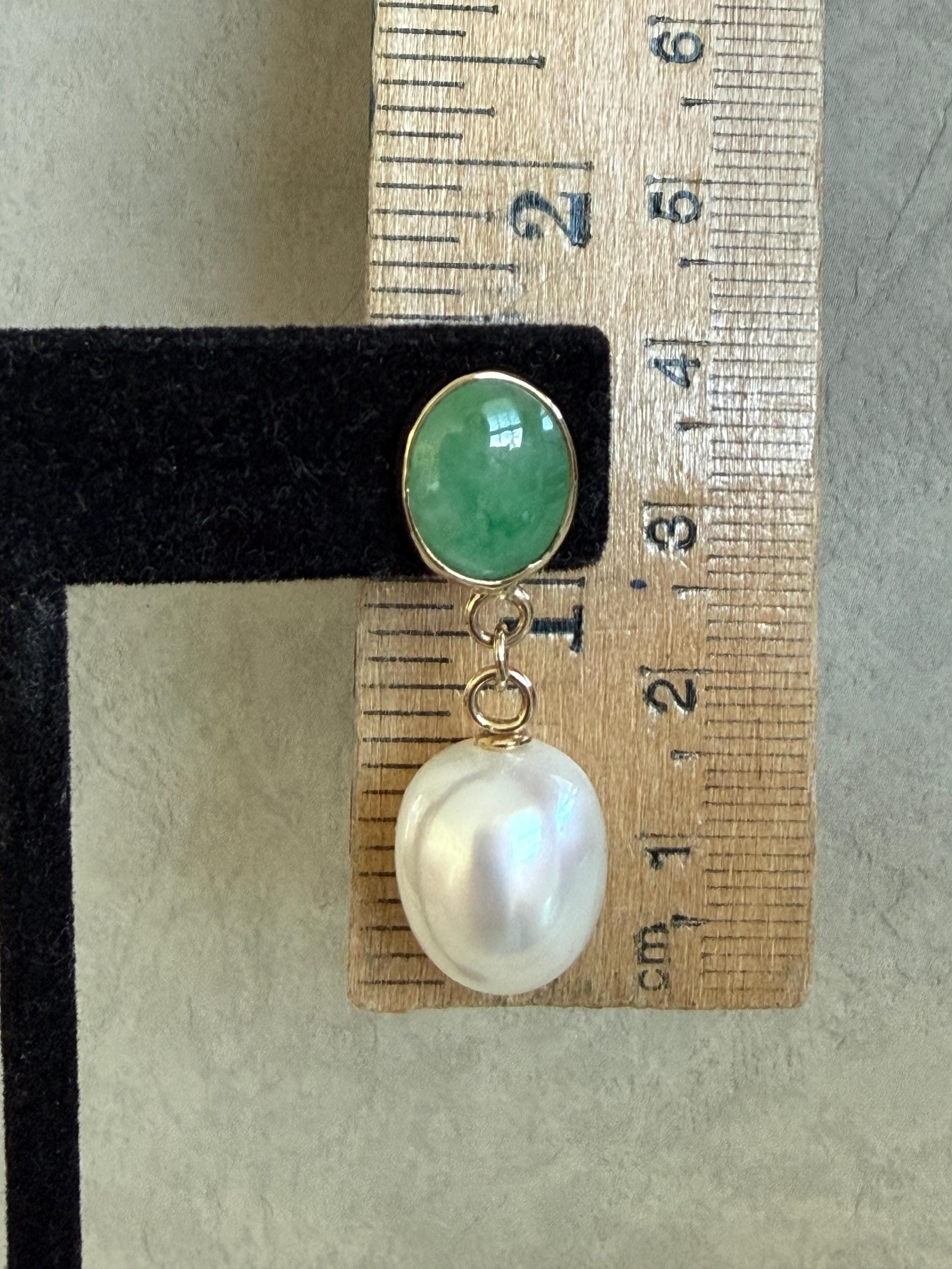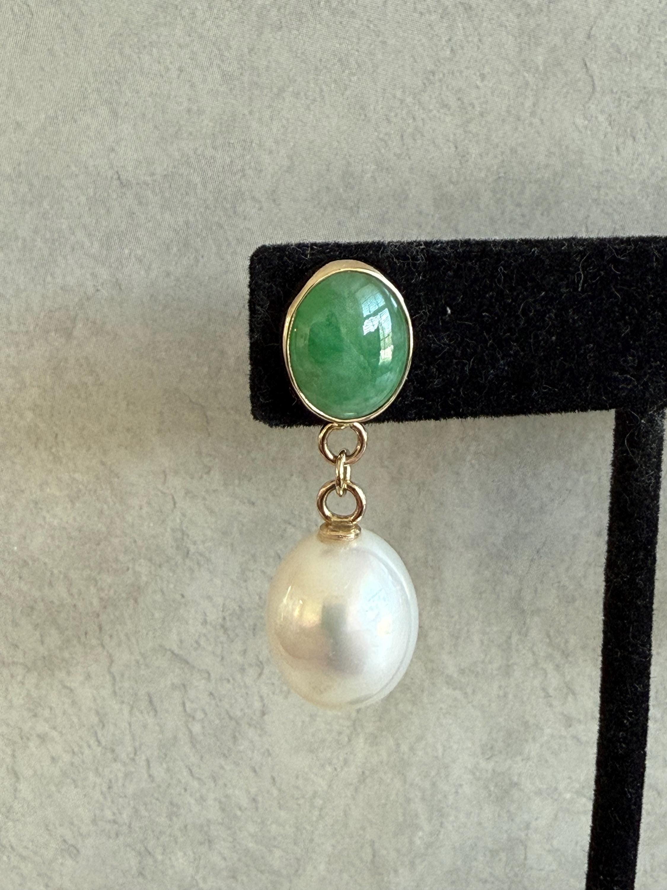 Cultured South Sea pearls and green jadeite jade are the perfect combination of color and luster! These drop earrings are handcrafted in 14k yellow gold with large butterfly backs. South Sea cultured pearls are known as "the queen of pearls" and these certainly live up to their title! Measuring about 12mm across, both pearls have elongated oval drop shapes and very very minimal blemishing. The luster is quite nice with an ever so satin like quality. The bezel set jadeite jade is Type A, meaning it has not been treated and has a beautiful mottled green color. I sourced the stones from my friends at Mason-Kay Jade, during the AGTA Tuscon Gem Fair. Please note, the photos make the stones appear slightly less bright than they are in person. The jadeite stones are completely natural and measure about 9 x 11.5 mm each. These earrings are completely handcradted (except for the butterfly backs) making them a one of a kind treasure. Please note, these earrings are for pierced ears only; earrings cannot be returned and are final sale only. The last two photos show this pair of earrings with another pair, sold separately; this listing is for the green pair only.