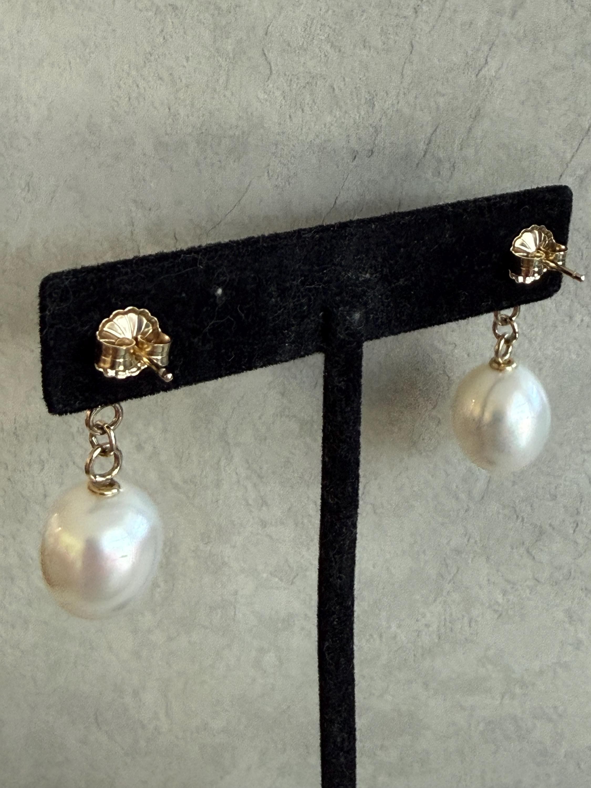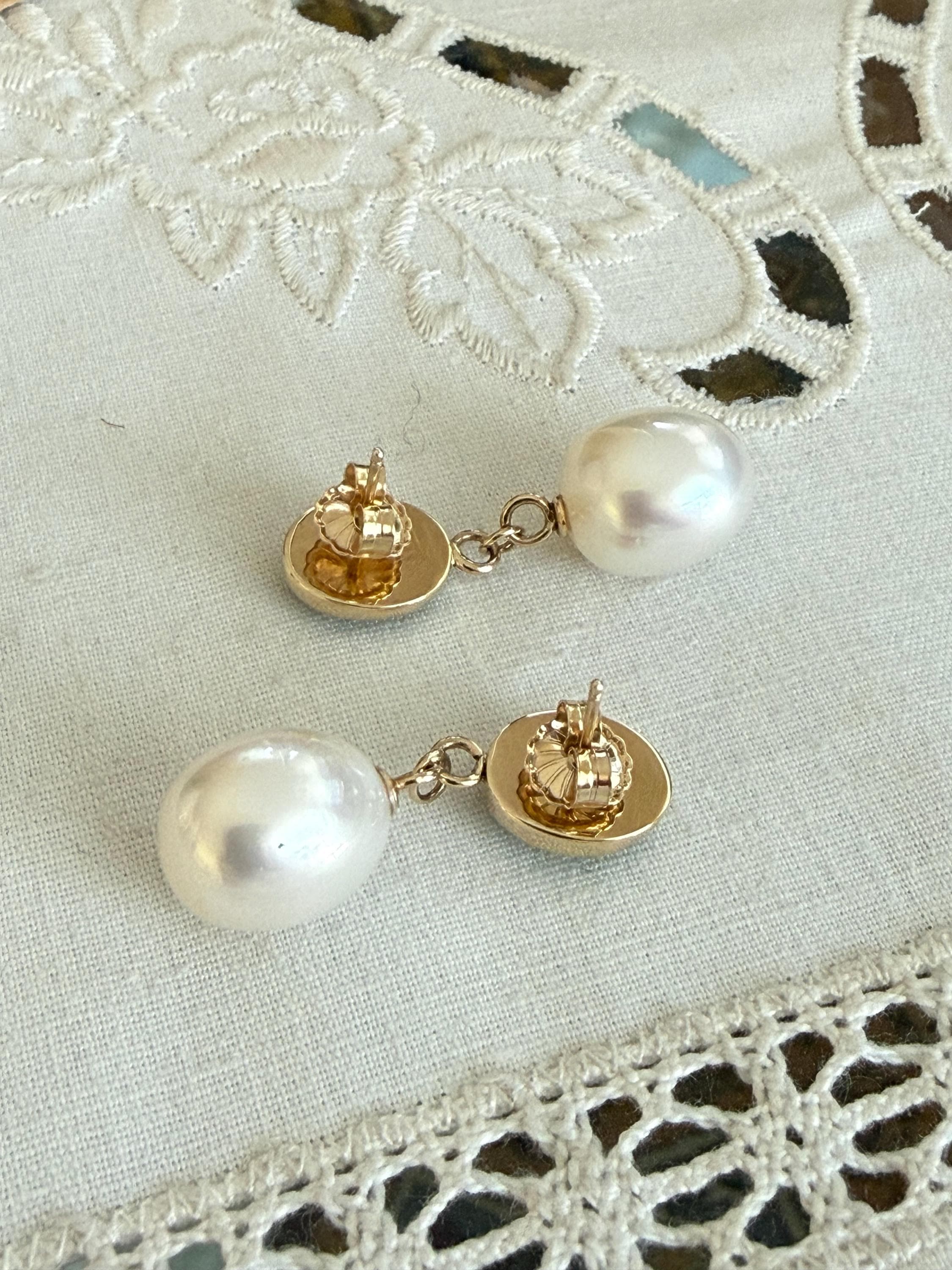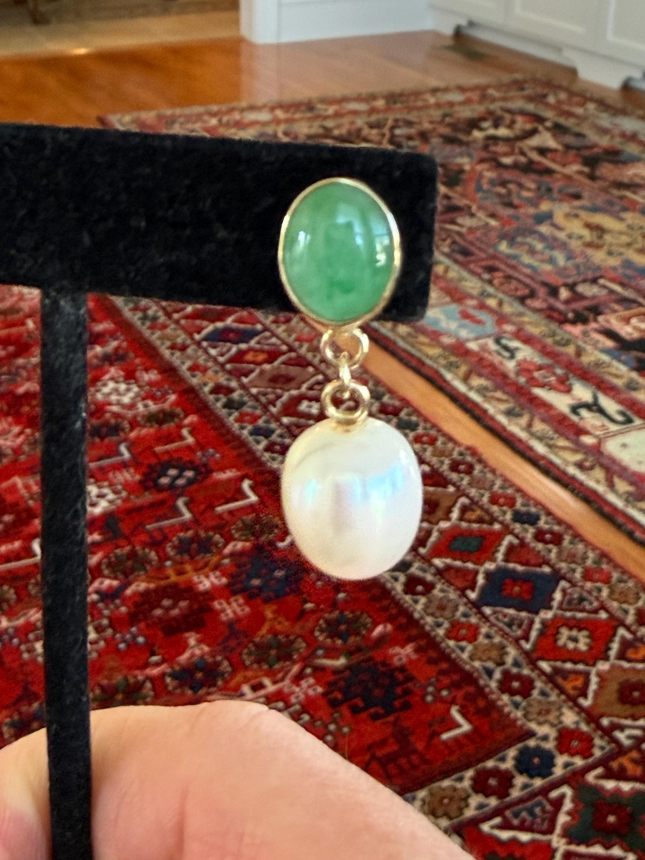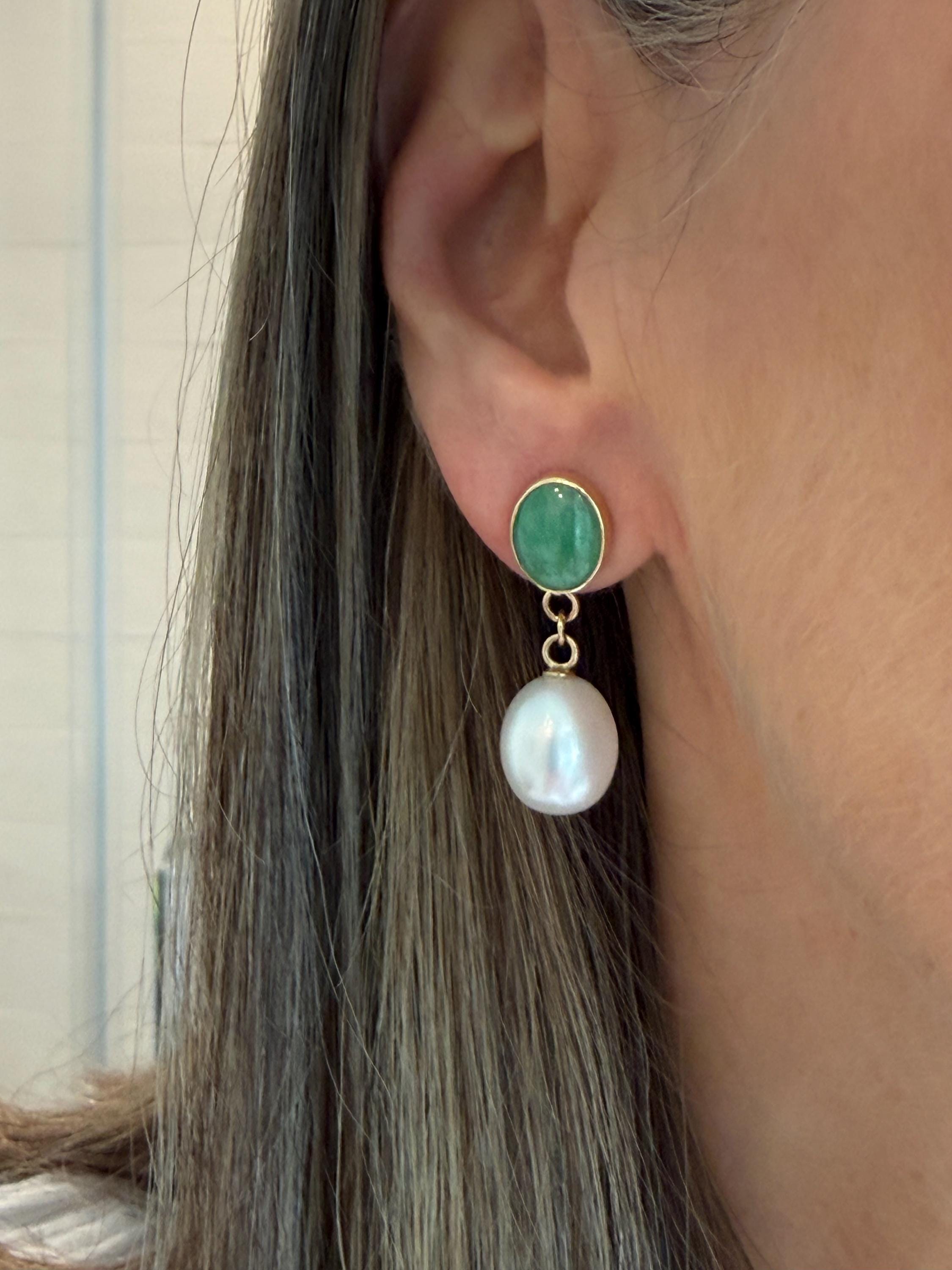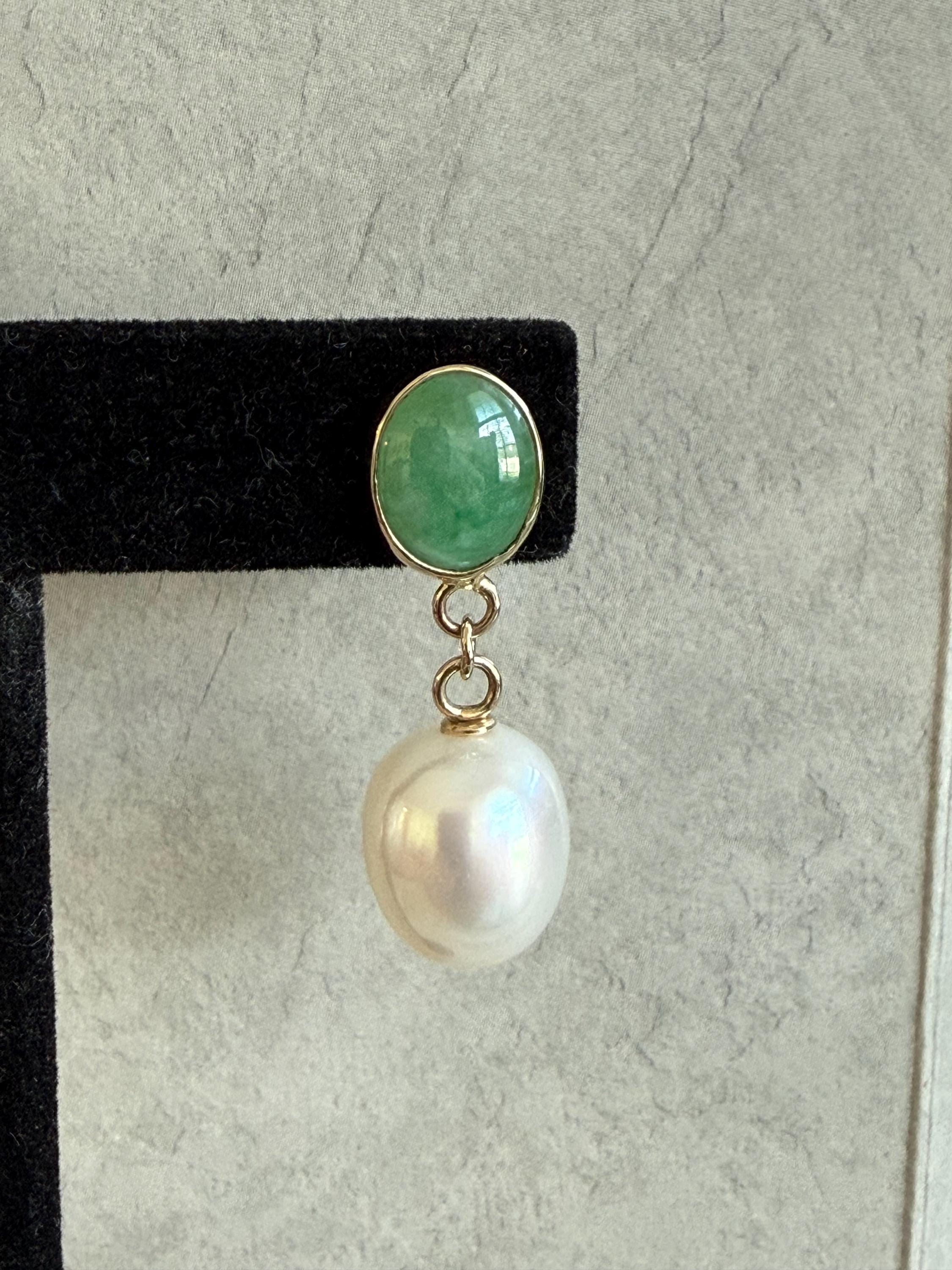 Cultured South Sea pearls and green jadeite jade are the perfect combination of color and luster! These drop earrings are handcrafted in 14k yellow gold with large butterfly backs. South Sea cultured pearls are known as "the queen of pearls" and these certainly live up to their title! Measuring about 12mm across, both pearls have elongated oval drop shapes and very very minimal blemishing. The luster is quite nice with an ever so satin like quality. The bezel set jadeite jade is Type A, meaning it has not been treated and has a beautiful mottled green color. I sourced the stones from my friends at Mason-Kay Jade, during the AGTA Tuscon Gem Fair. Please note, the photos make the stones appear slightly less bright than they are in person. The jadeite stones are completely natural and measure about 9 x 11.5 mm each. These earrings are completely handcradted (except for the butterfly backs) making them a one of a kind treasure. Please note, these earrings are for pierced ears only; earrings cannot be returned and are final sale only. The last two photos show this pair of earrings with another pair, sold separately; this listing is for the green pair only.