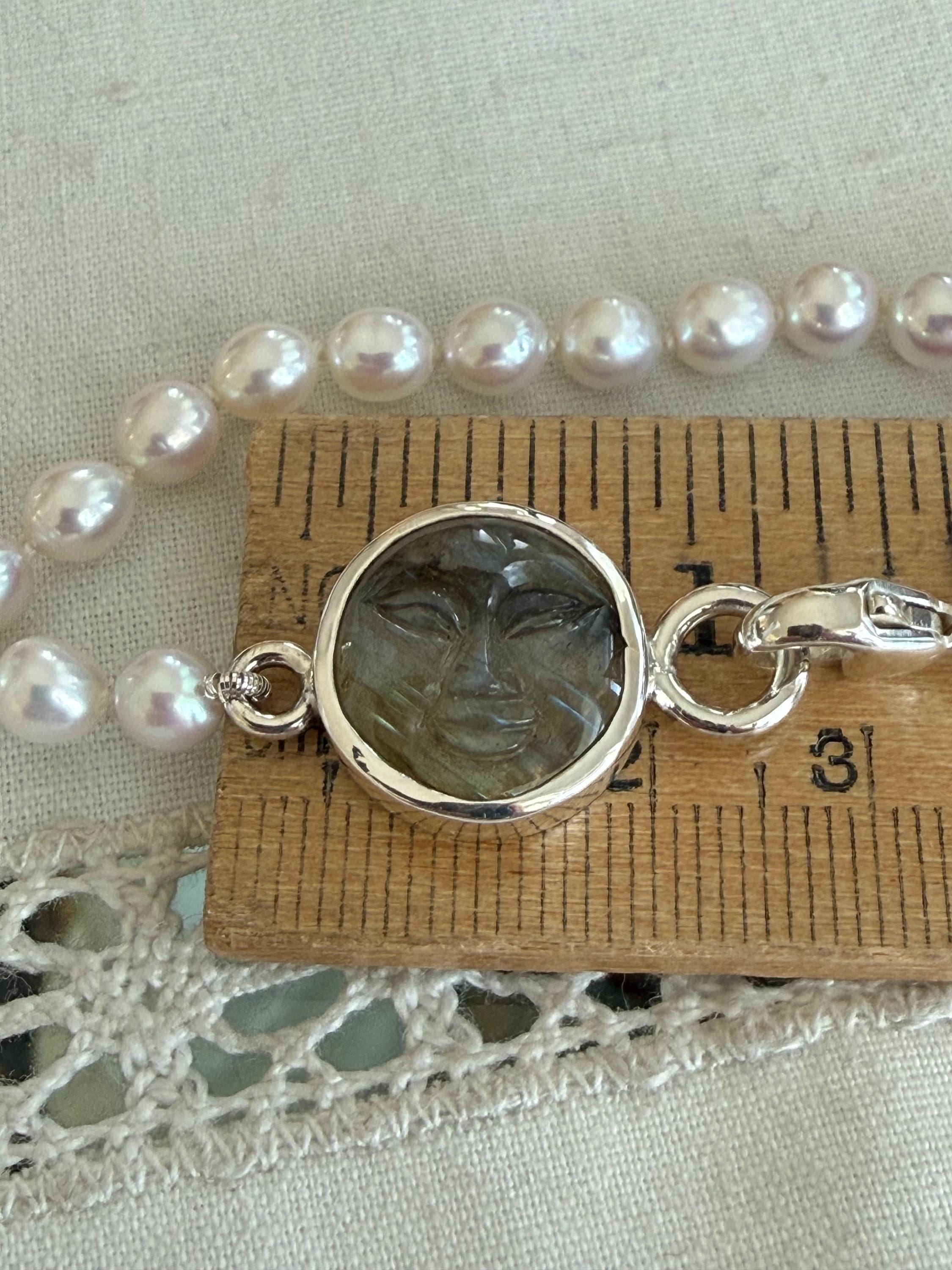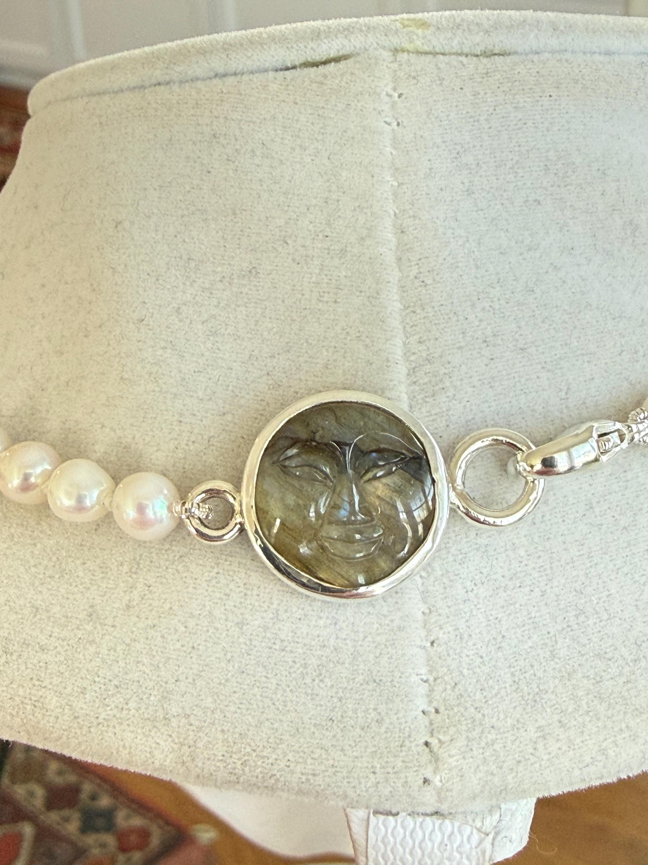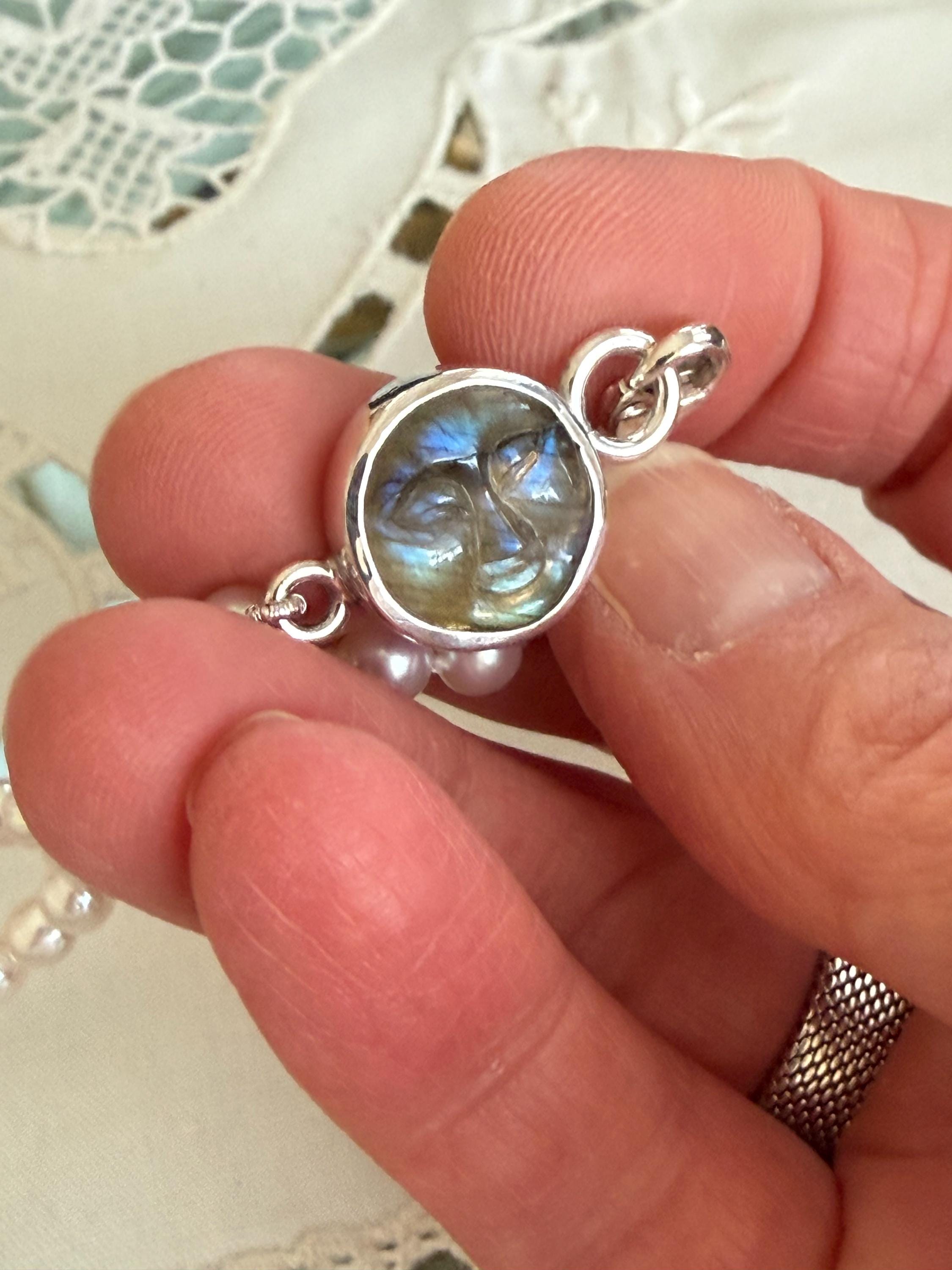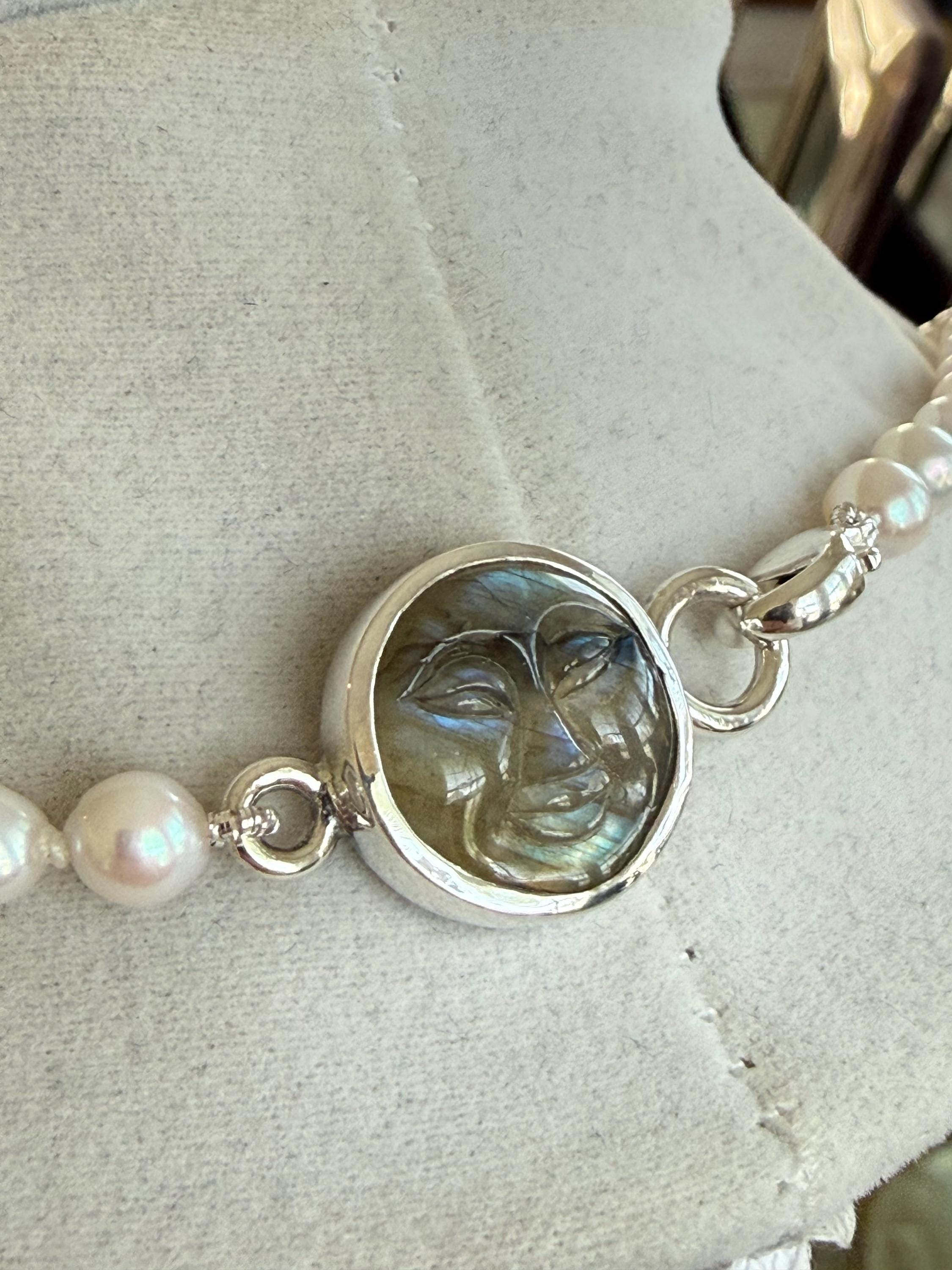 Classic with a twist! A beautiful cultured freshwater baroque pearl strand hand knotted on white thread and featuring a bezel set carved labradorite moon face at the lobster clasp set. The pearls measure approximately 5mm with very minor blemishes and sharp luster, and the labradorite is about 14mm across. The necklace is about 18 inches long measured end to end. The labradorite moon face was carved by my good friends at Columbia Gem House, known as an industry leader in ethical gem supply. The handcrafted bezel setting for the stone is done in fine silver and the lobster clasp and jump rings are done in sterling. The photos show the actual strand you will receive.