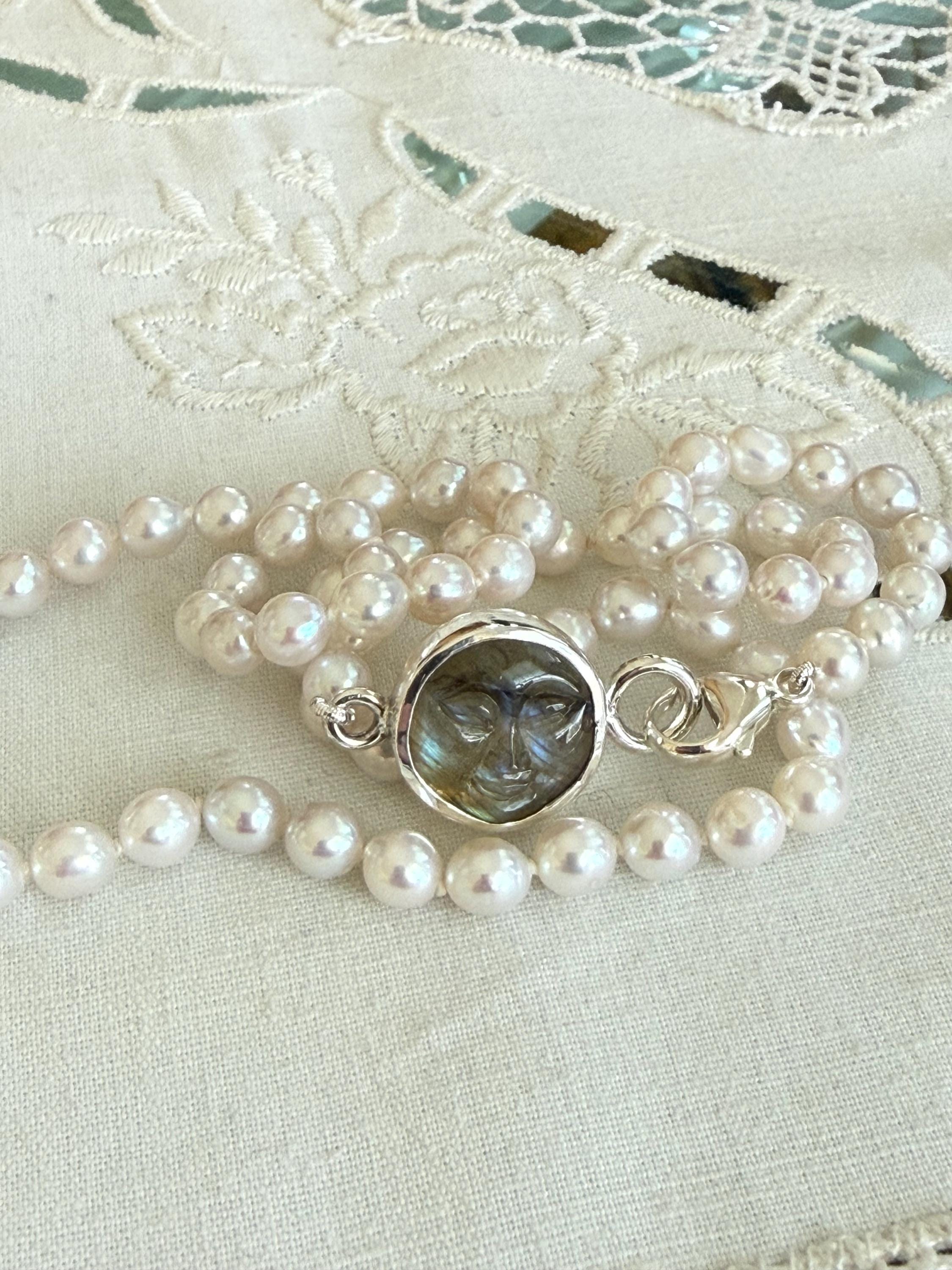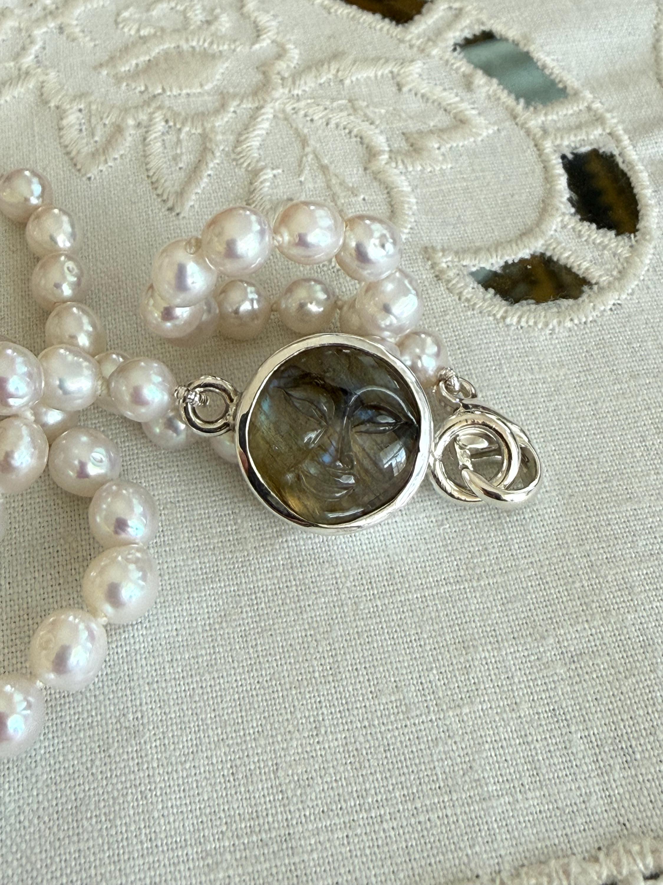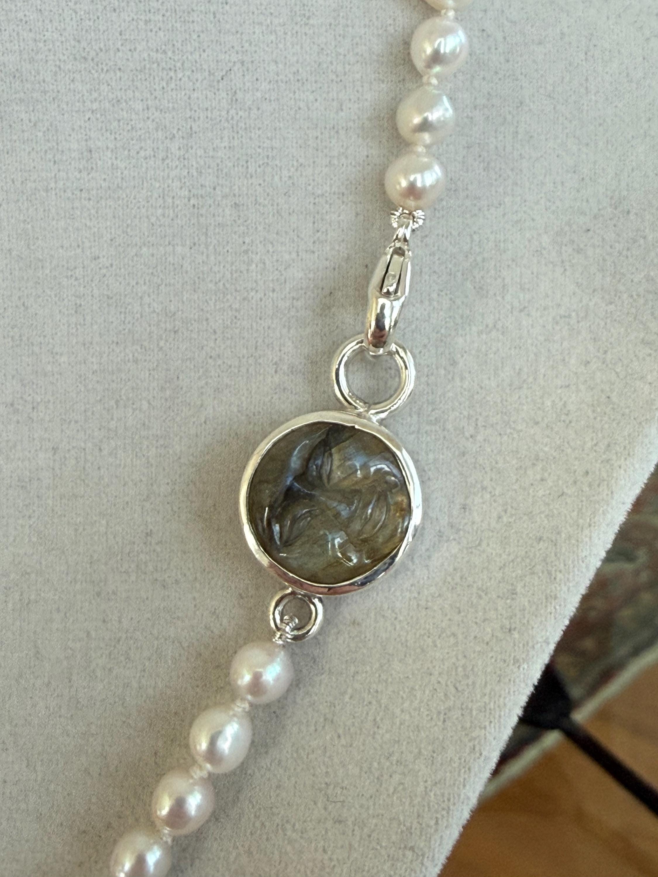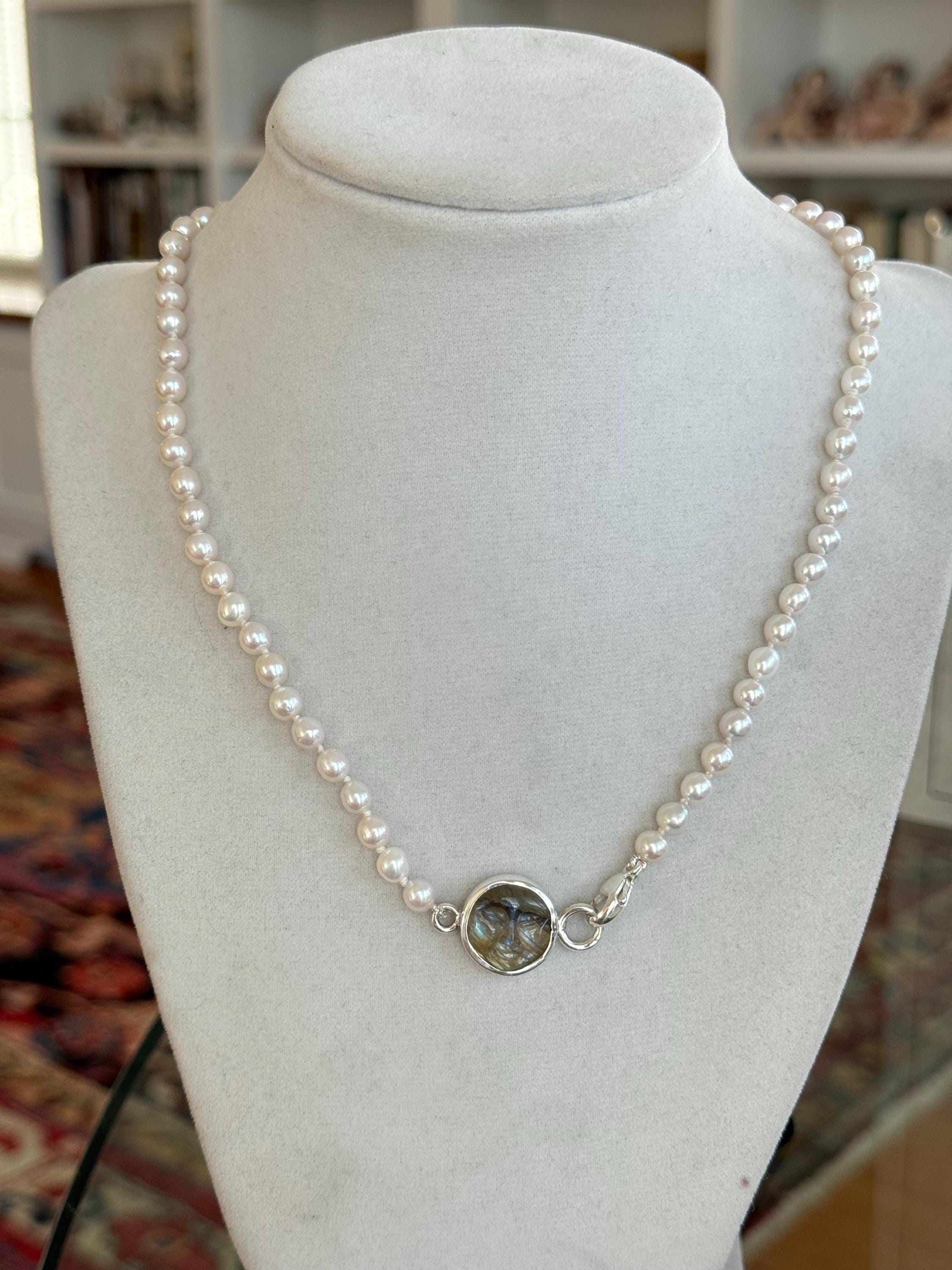 Classic with a twist! A beautiful cultured freshwater baroque pearl strand hand knotted on white thread and featuring a bezel set carved labradorite moon face at the lobster clasp set. The pearls measure approximately 5mm with very minor blemishes and sharp luster, and the labradorite is about 14mm across. The necklace is about 18 inches long measured end to end. The labradorite moon face was carved by my good friends at Columbia Gem House, known as an industry leader in ethical gem supply. The handcrafted bezel setting for the stone is done in fine silver and the lobster clasp and jump rings are done in sterling. The photos show the actual strand you will receive.