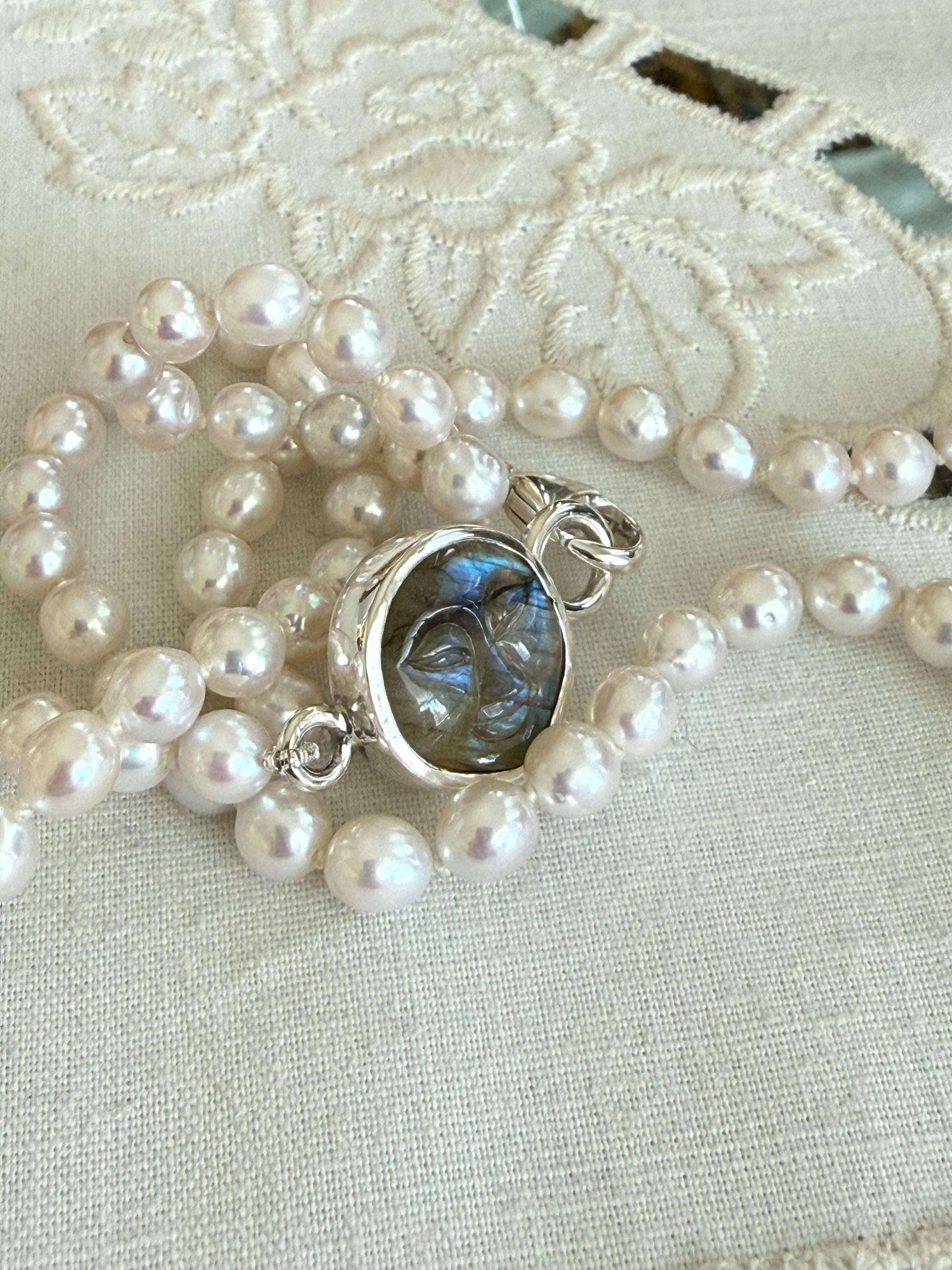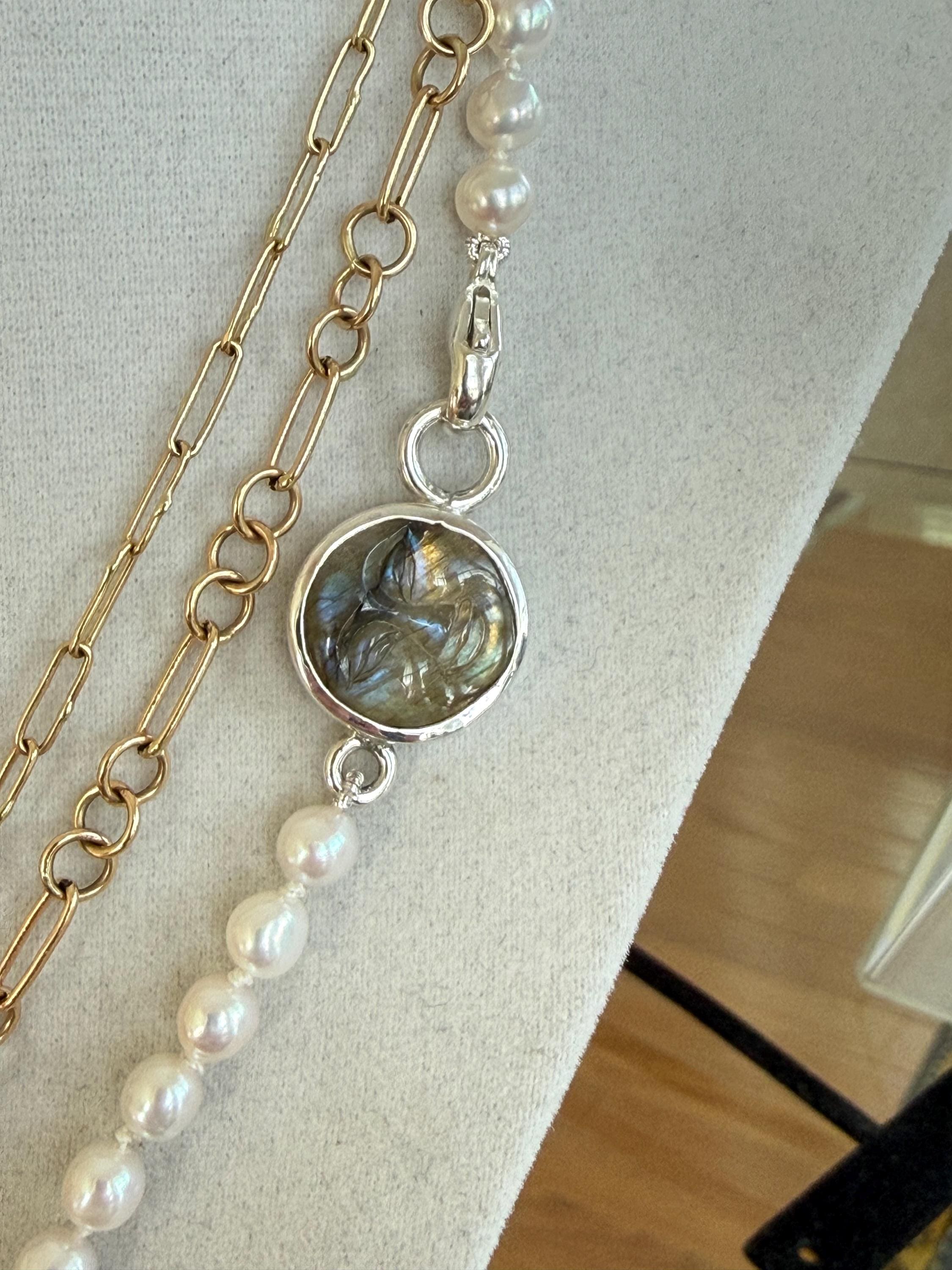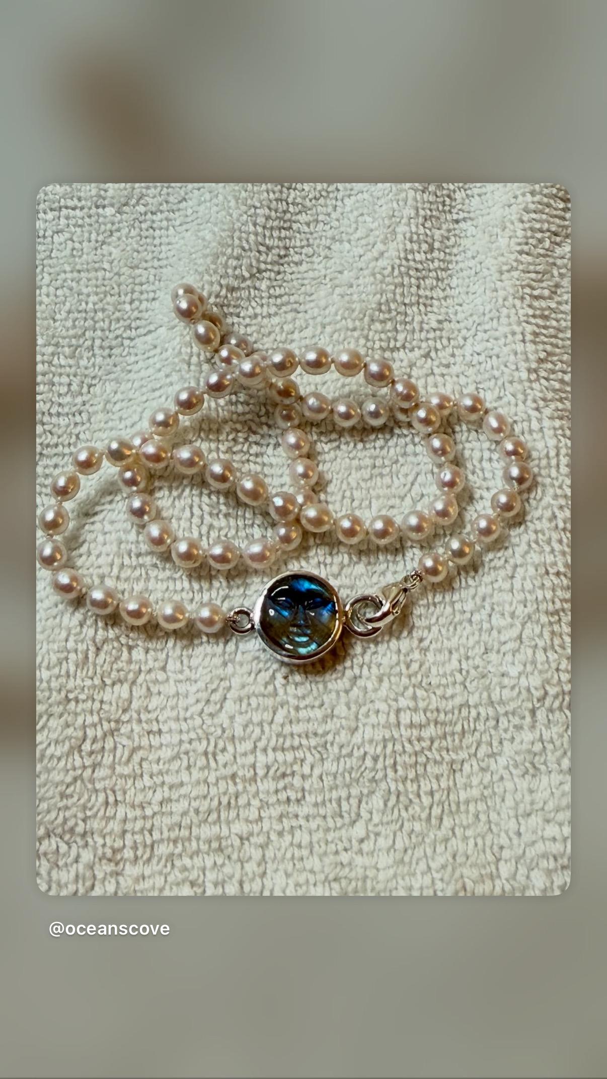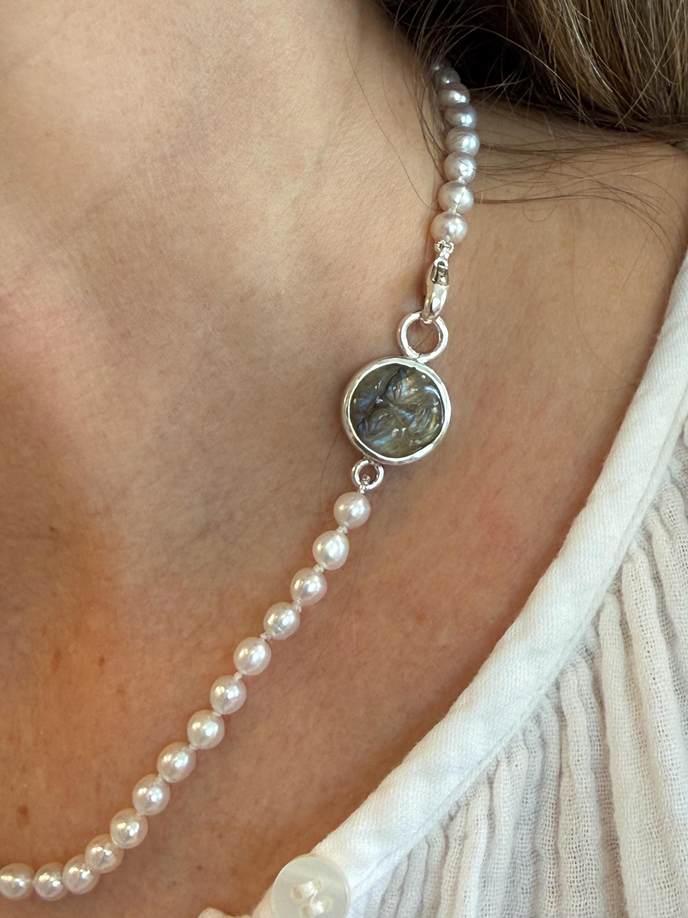 Classic with a twist! A beautiful cultured freshwater baroque pearl strand hand knotted on white thread and featuring a bezel set carved labradorite moon face at the lobster clasp set. The pearls measure approximately 5mm with very minor blemishes and sharp luster, and the labradorite is about 14mm across. The necklace is about 18 inches long measured end to end. The labradorite moon face was carved by my good friends at Columbia Gem House, known as an industry leader in ethical gem supply. The handcrafted bezel setting for the stone is done in fine silver and the lobster clasp and jump rings are done in sterling. The photos show the actual strand you will receive.